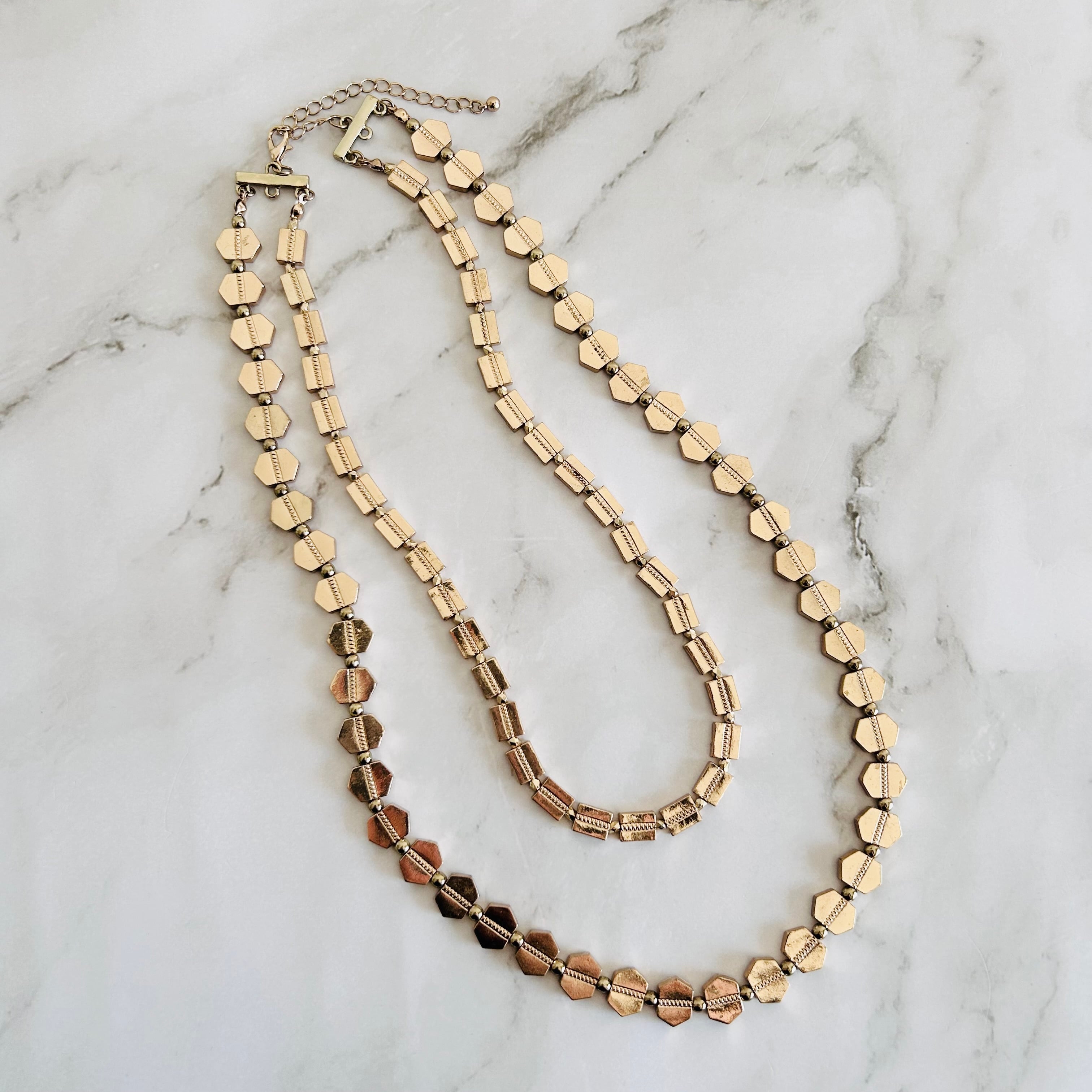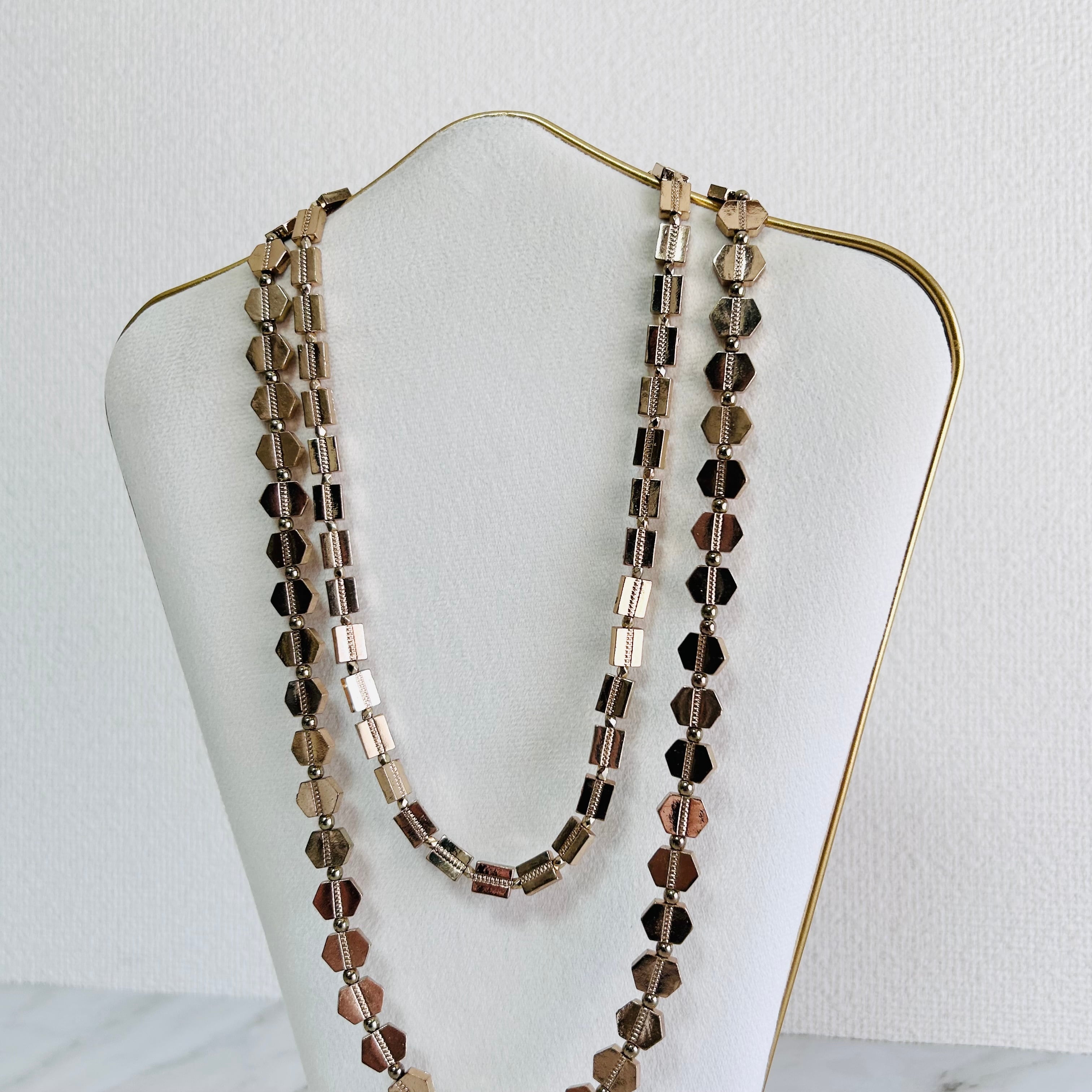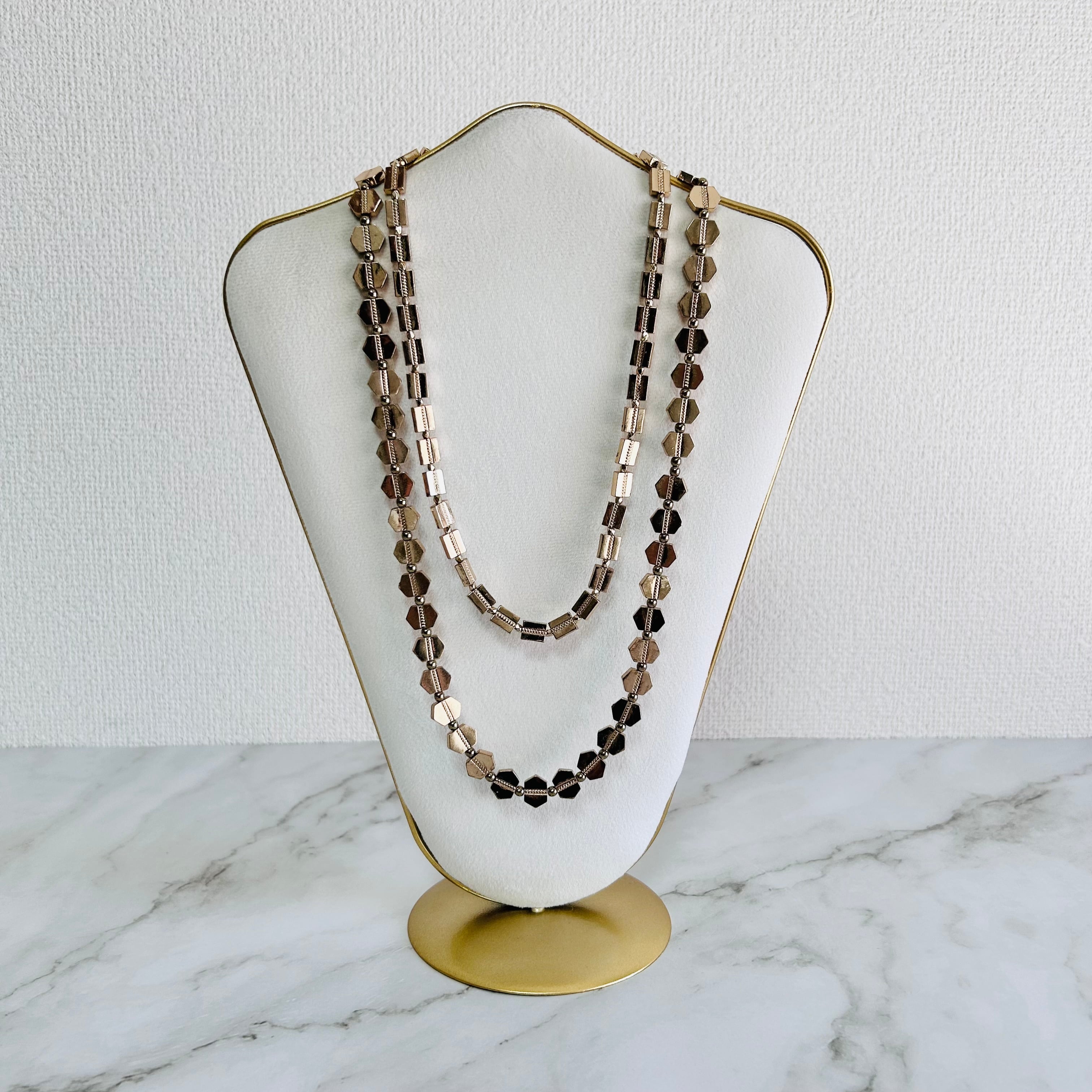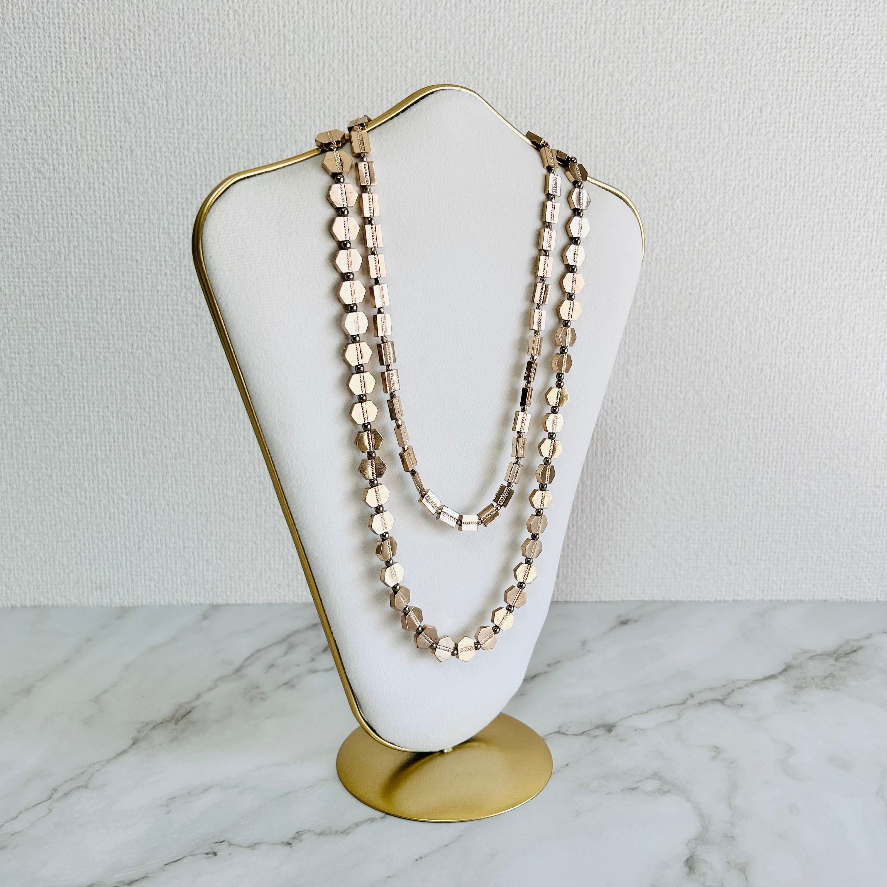 華やかに輝く2種類のゴールドパーツを連ねた、ロングタイプのレイヤードデザインネックレス。