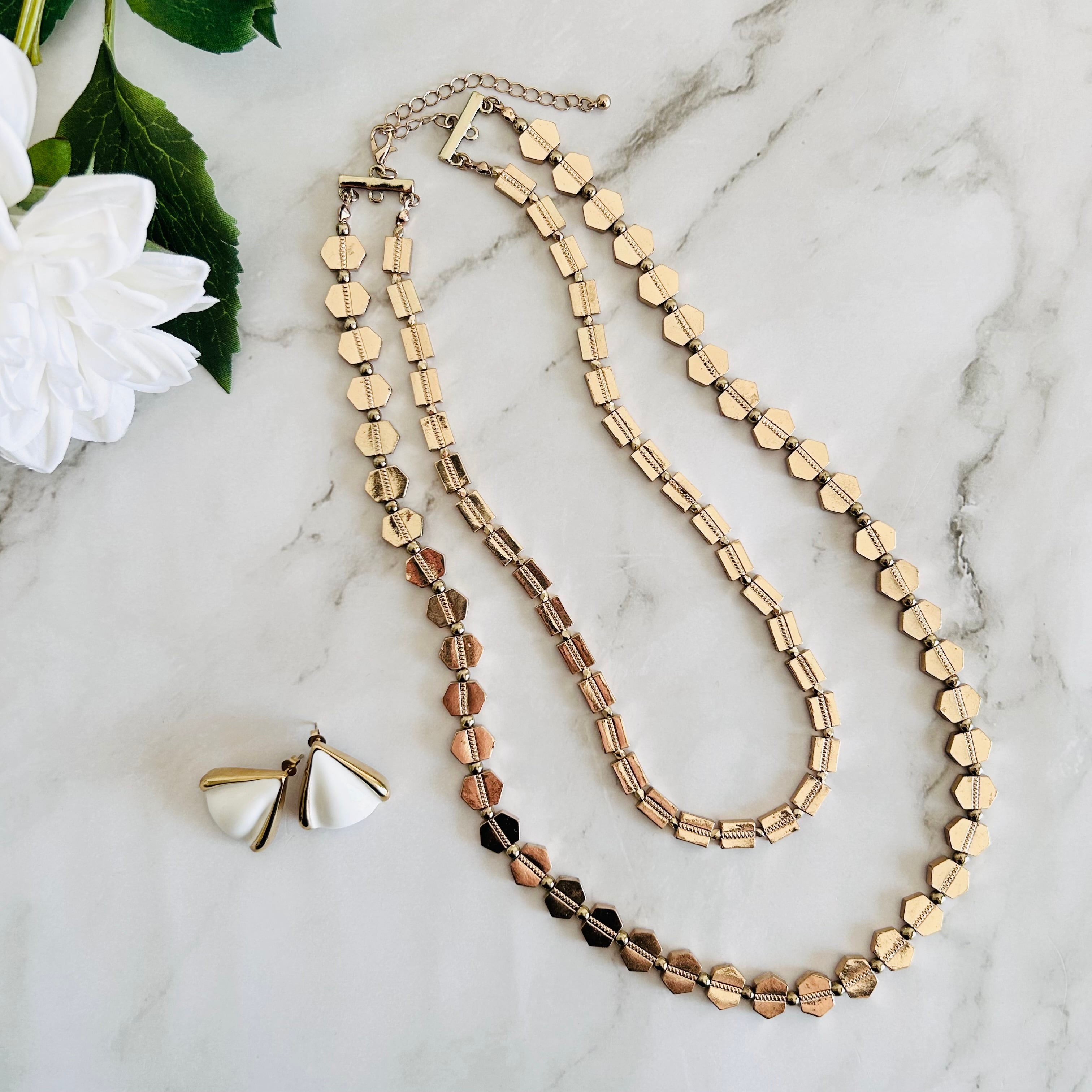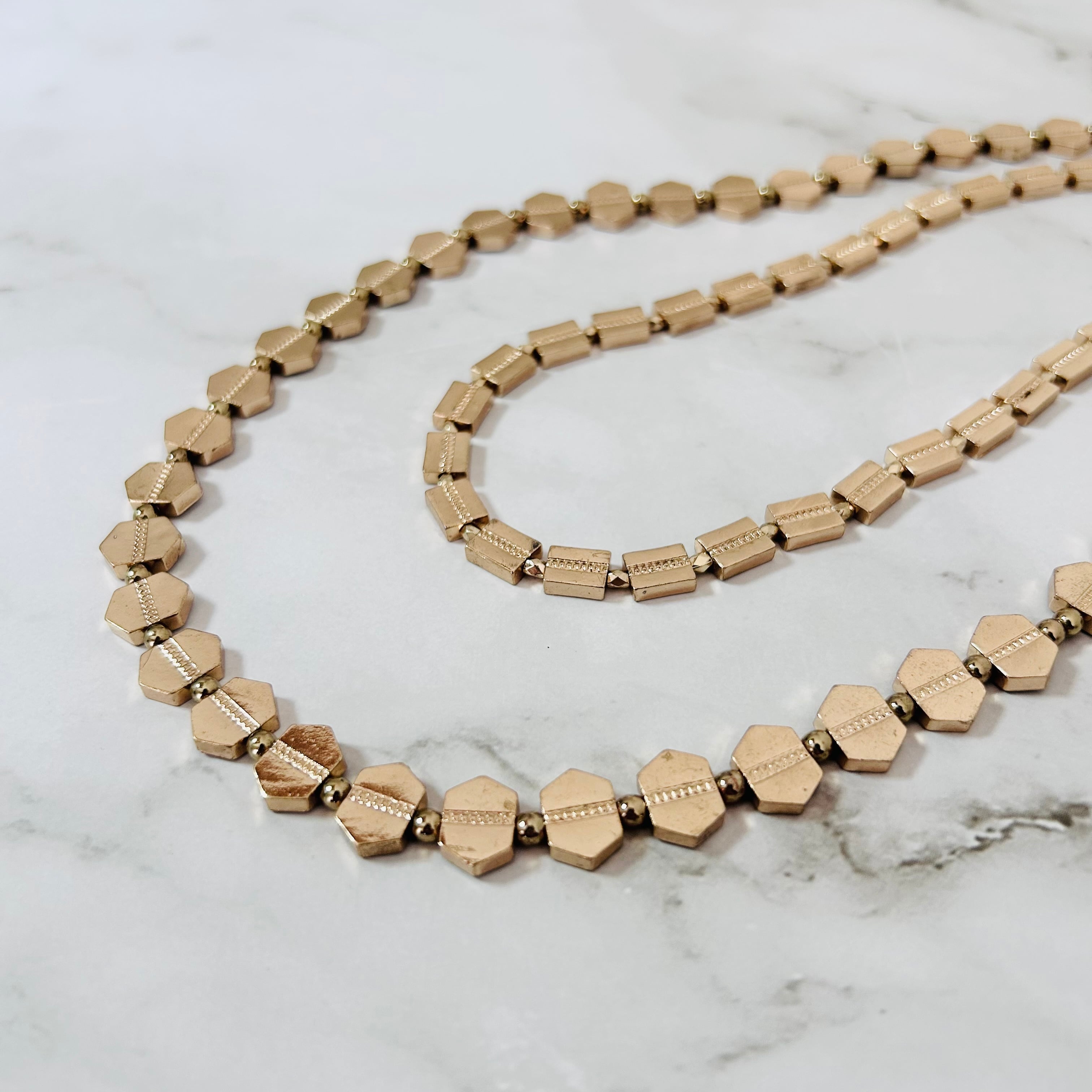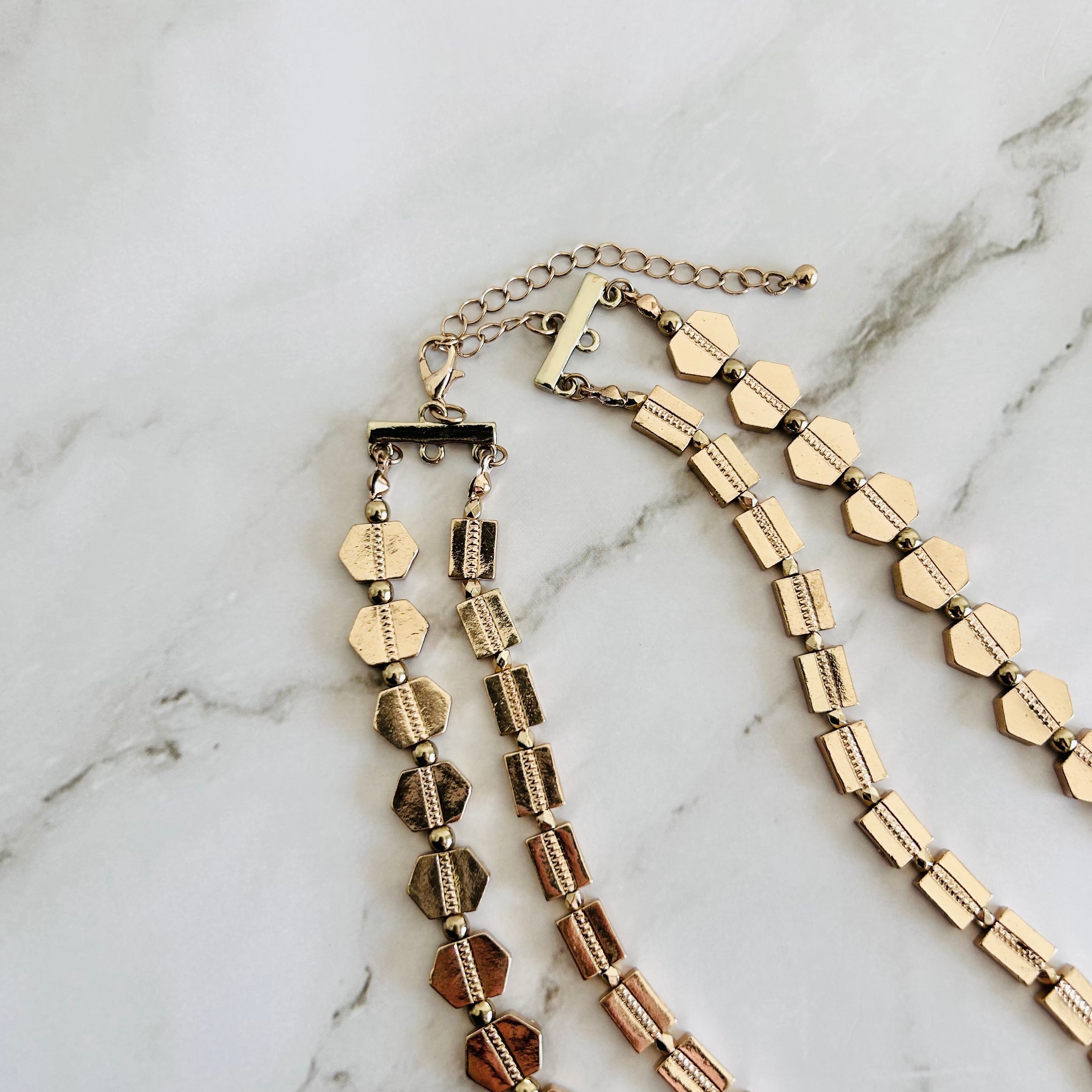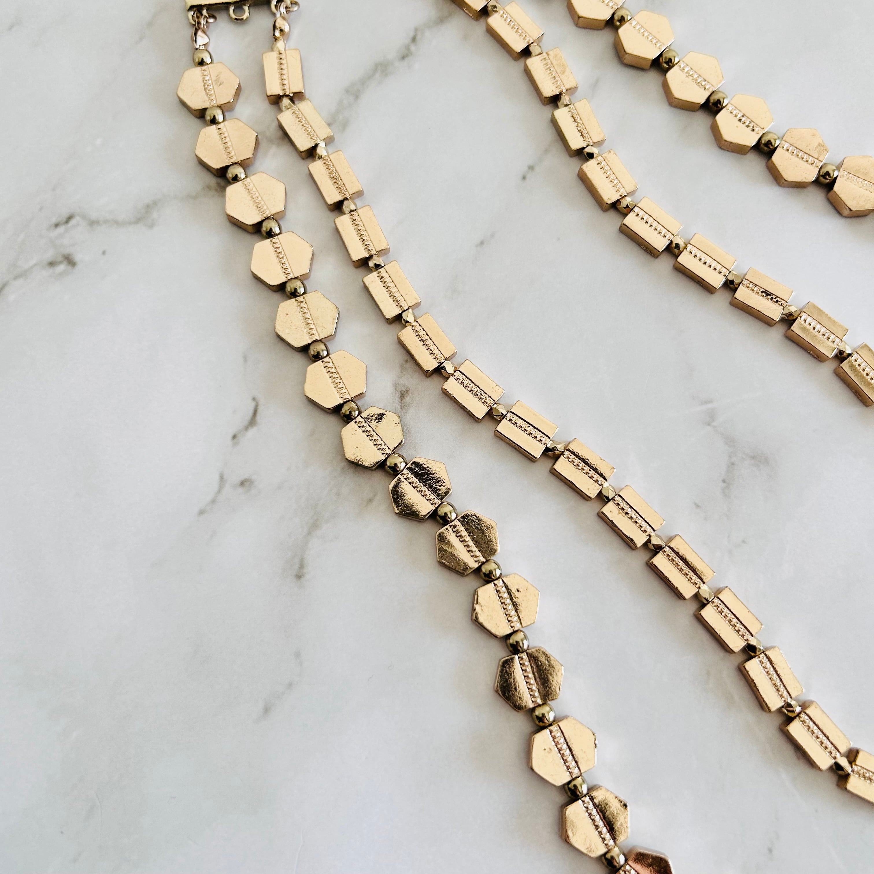 華やかに輝く2種類のゴールドパーツを連ねた、ロングタイプのレイヤードデザインネックレス。