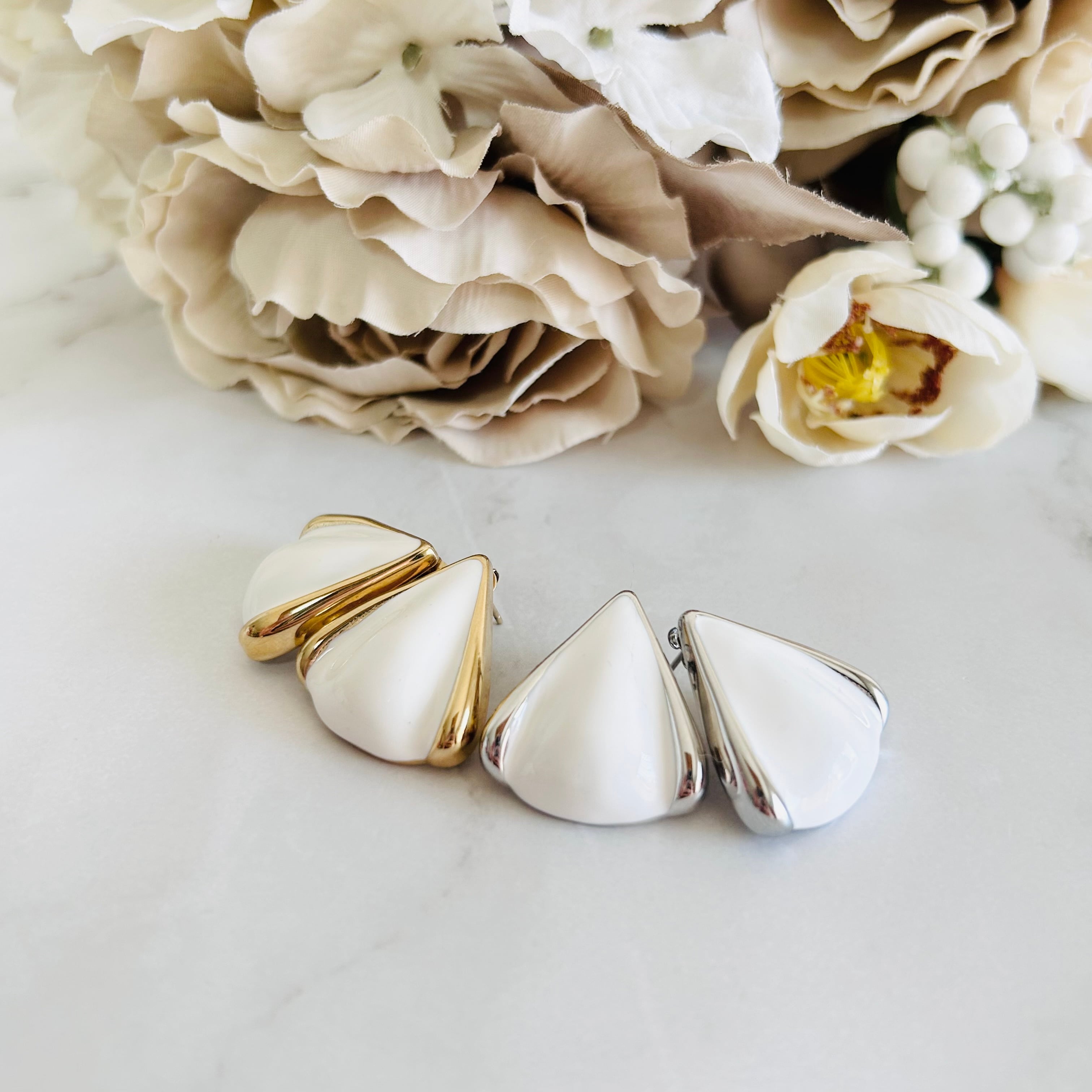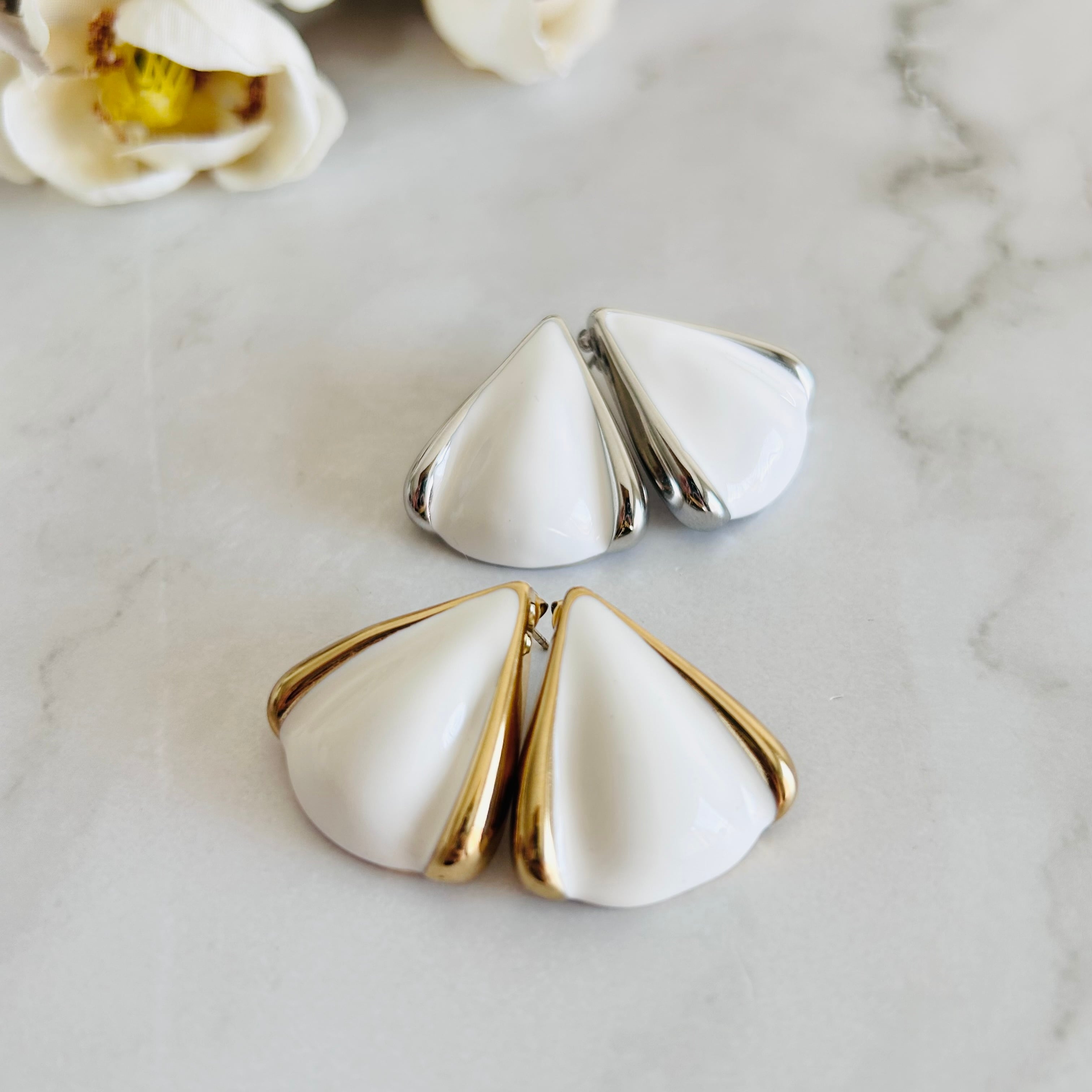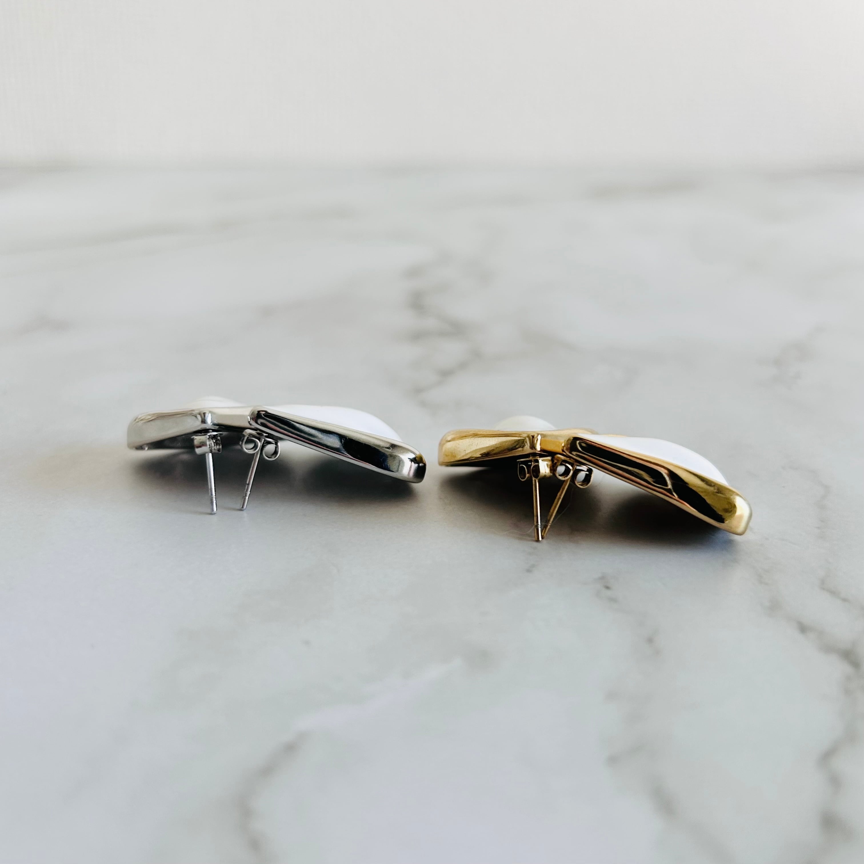 なめらかなエナメルトーンのホワイトに、ゴールドとシルバーのフレームを組み合わせた、上品なデザインピアス・イヤリング。