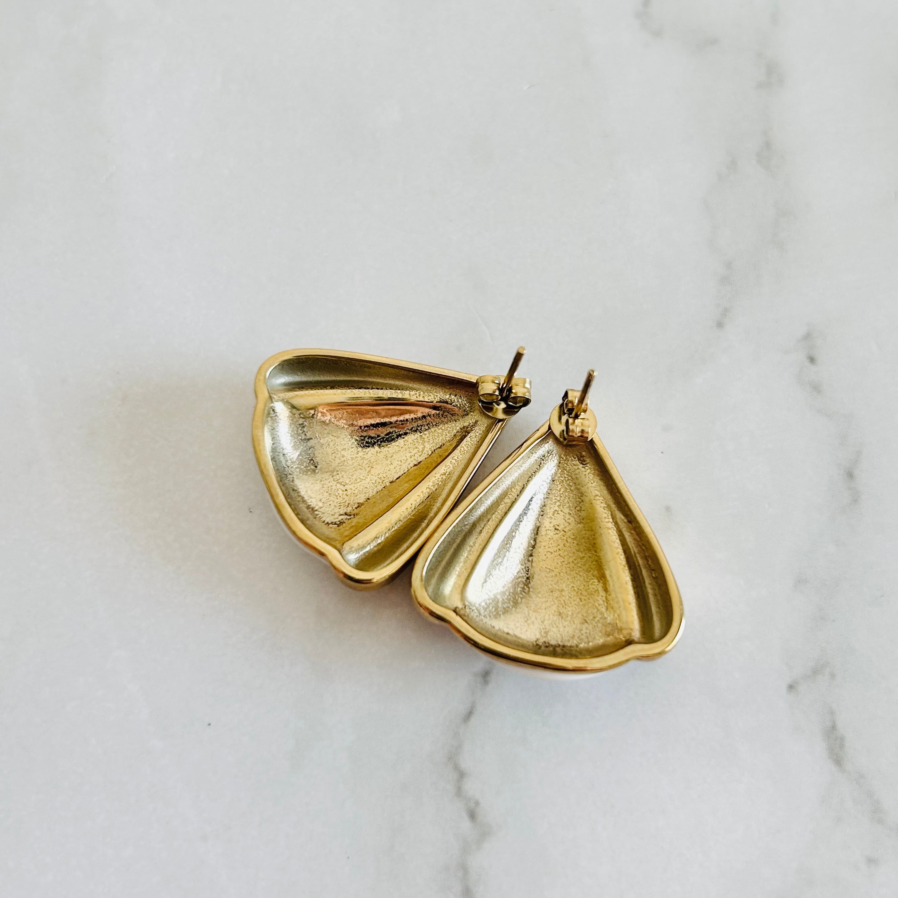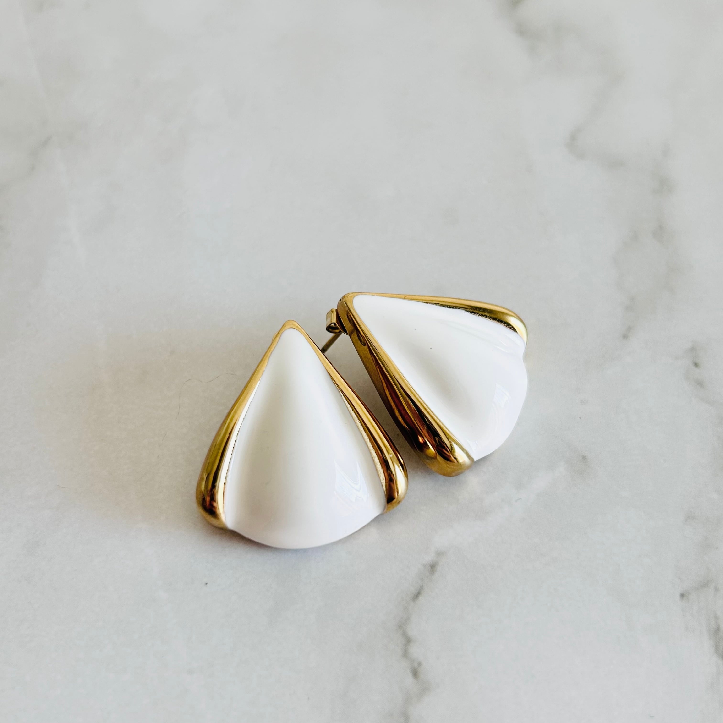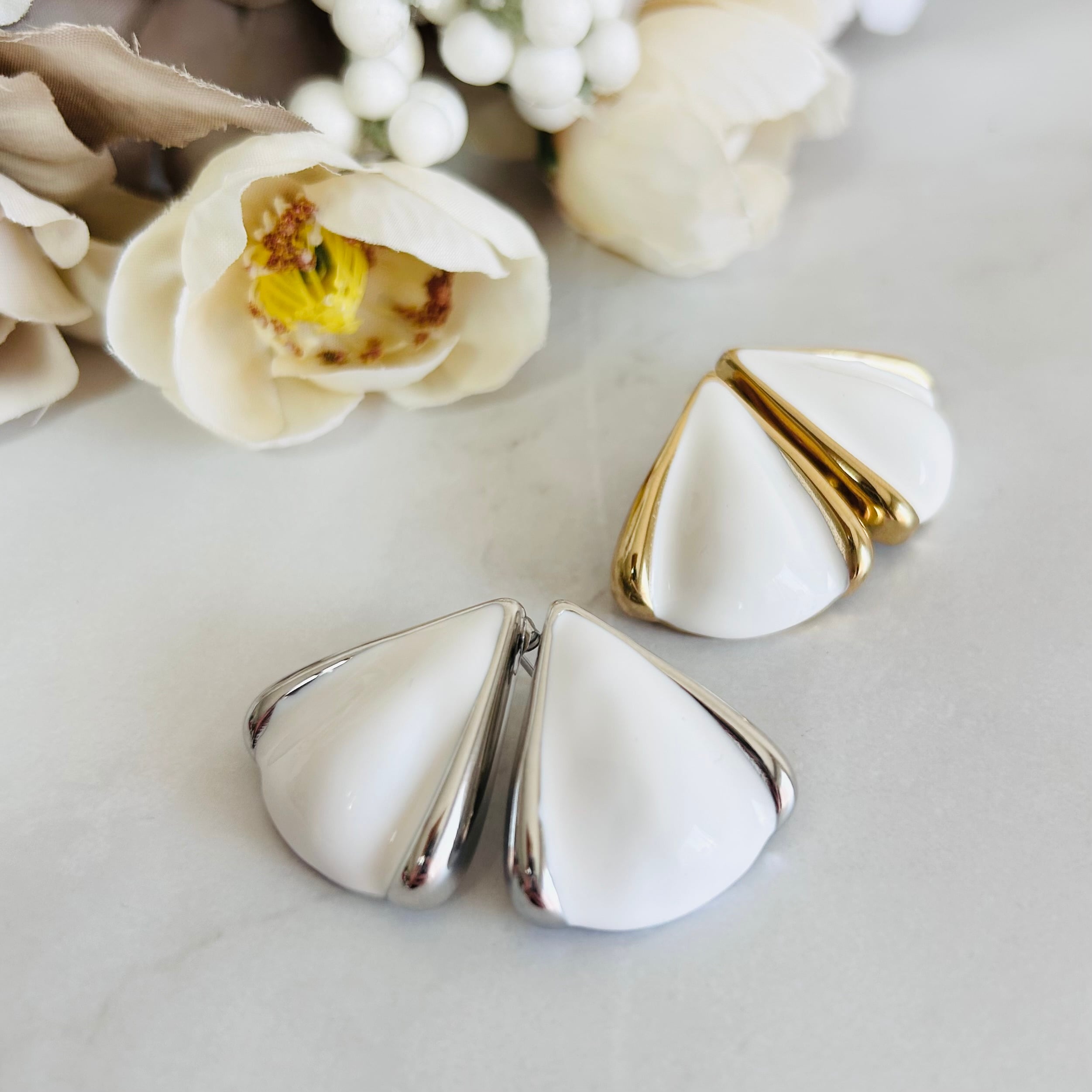 なめらかなエナメルトーンのホワイトに、ゴールドとシルバーのフレームを組み合わせた、上品なデザインピアス・イヤリング。