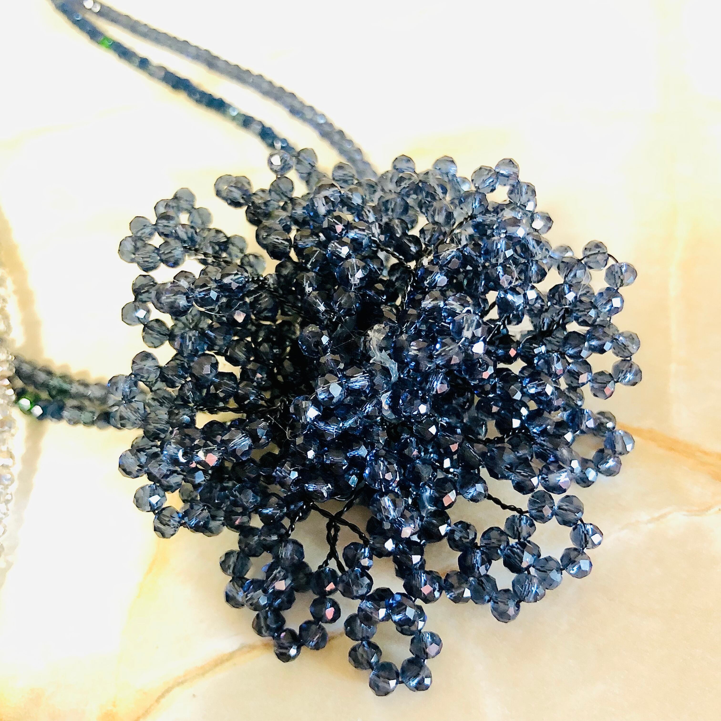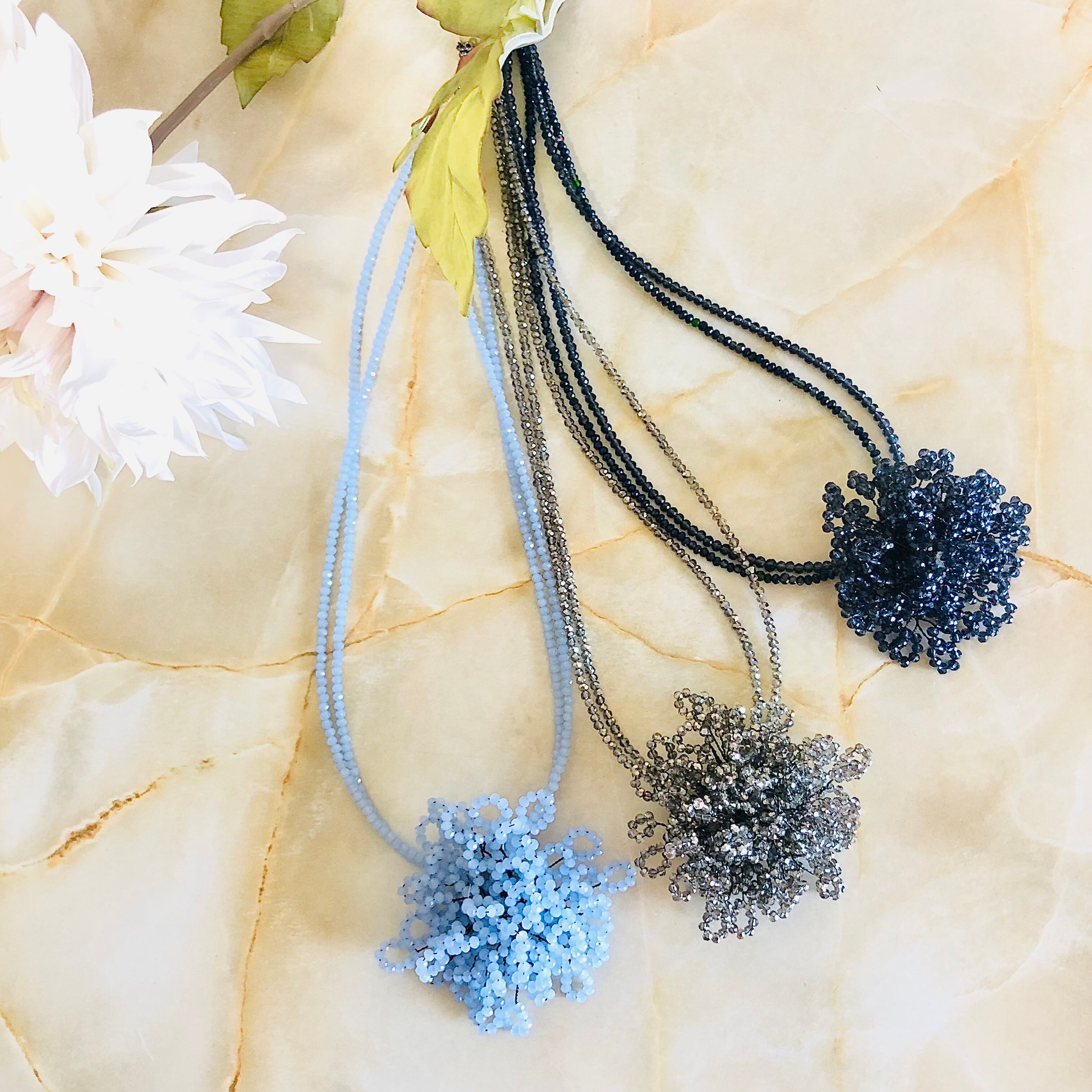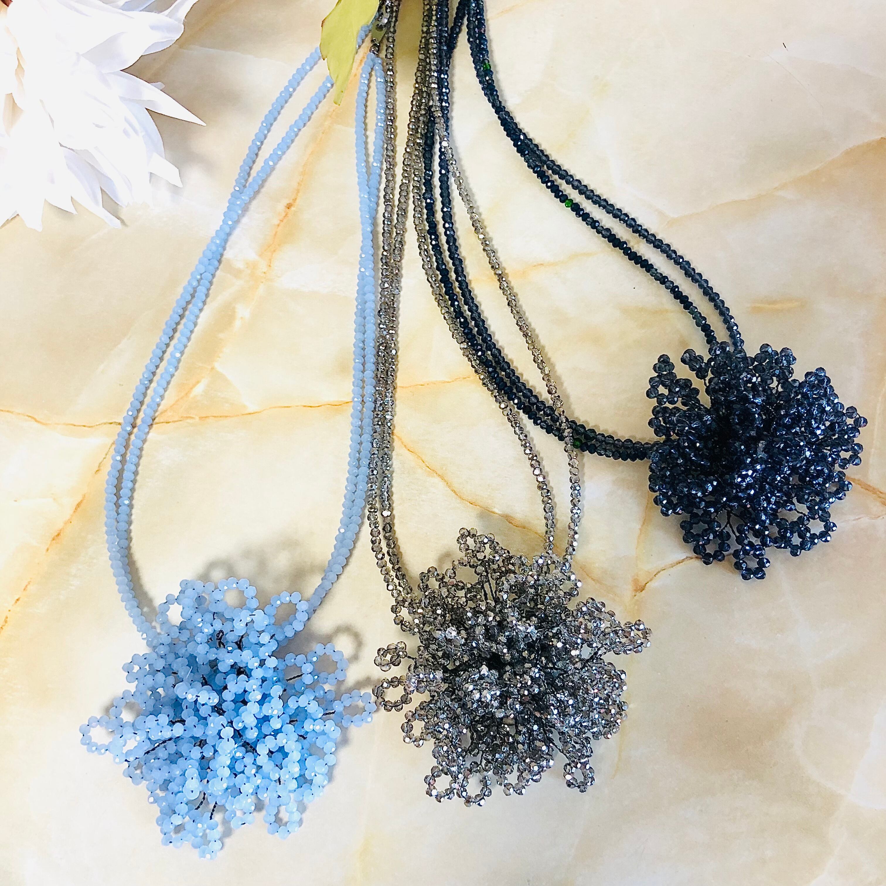 ワンランク上のガラスビーズの輝きで作ったフラワーモチーフが特徴的なネックレスです。