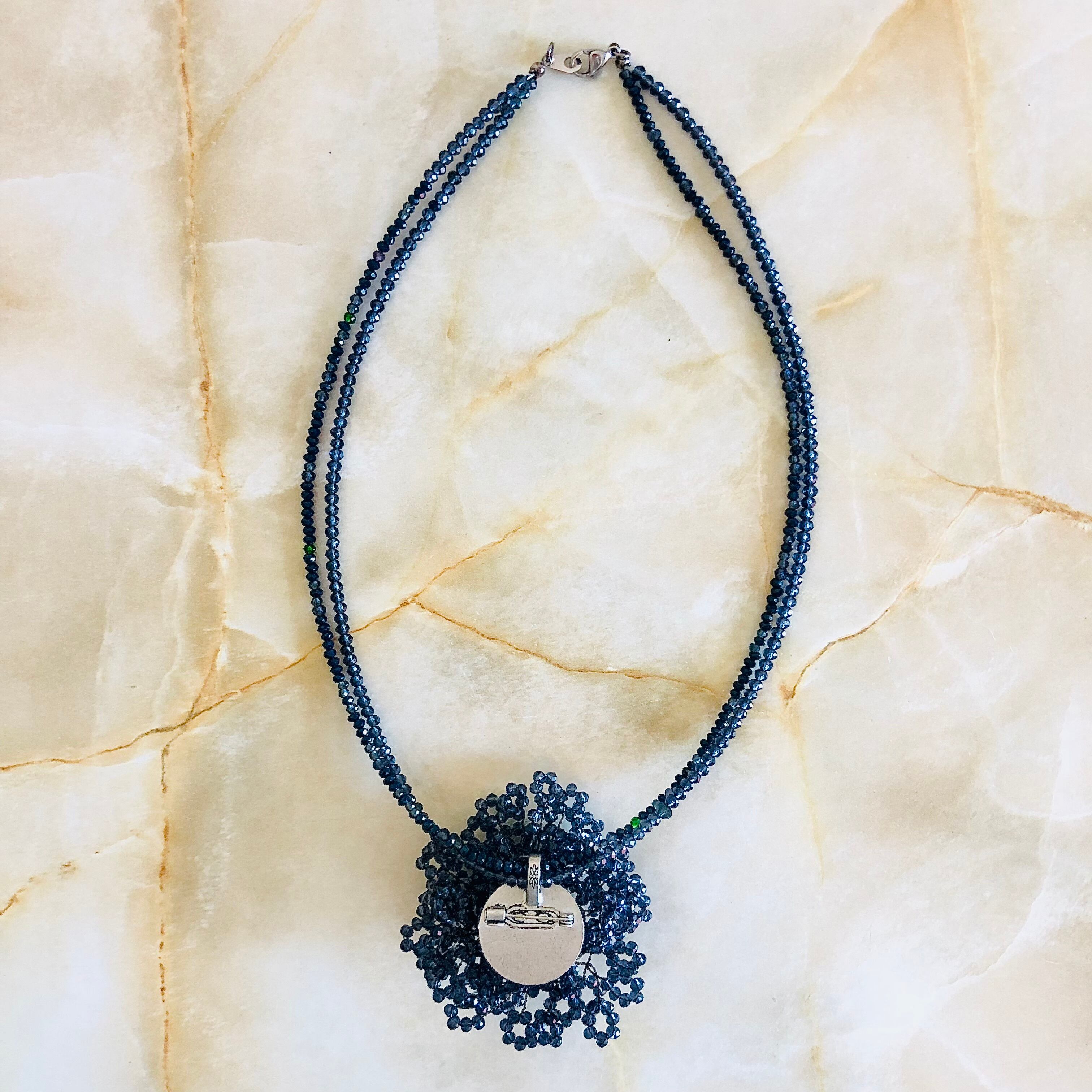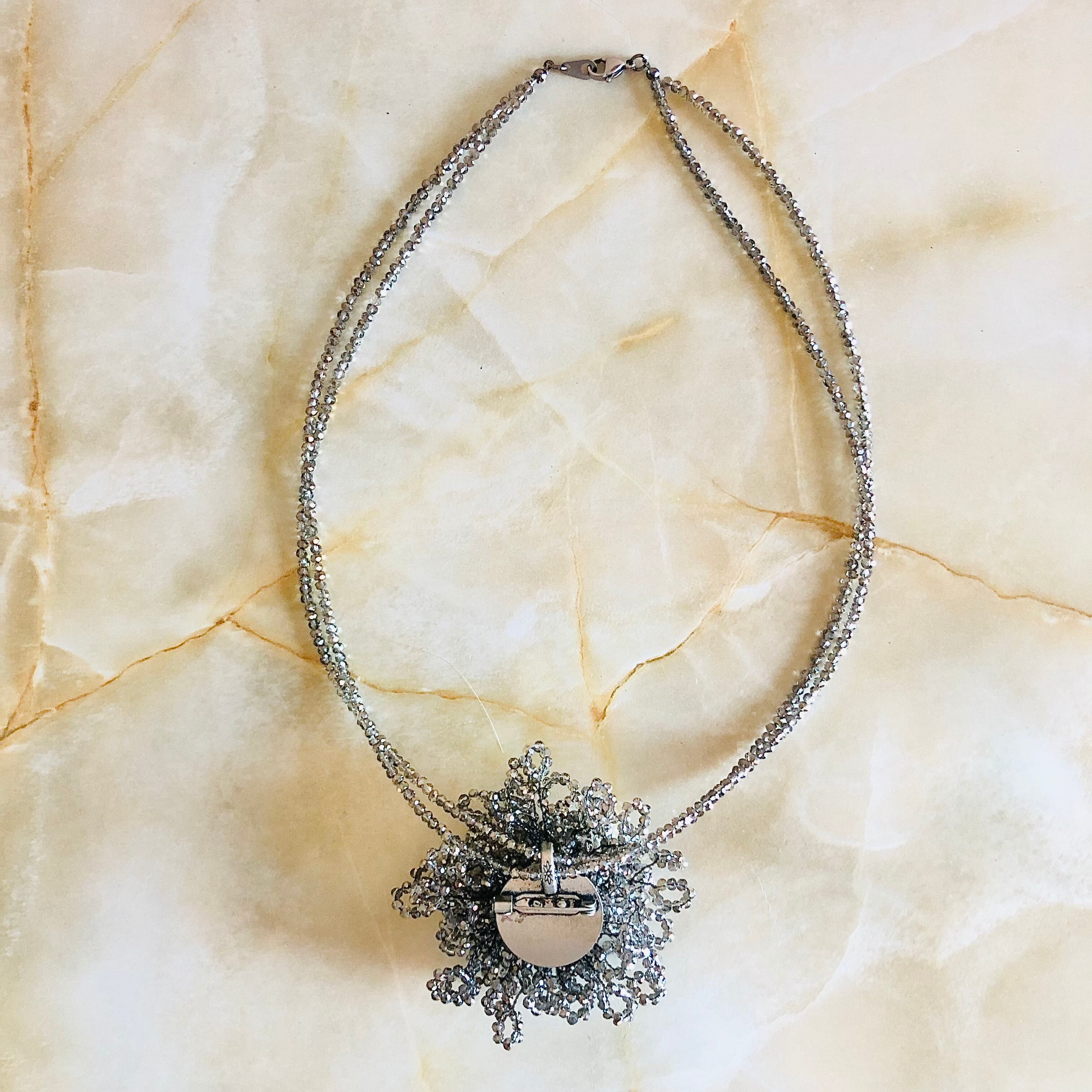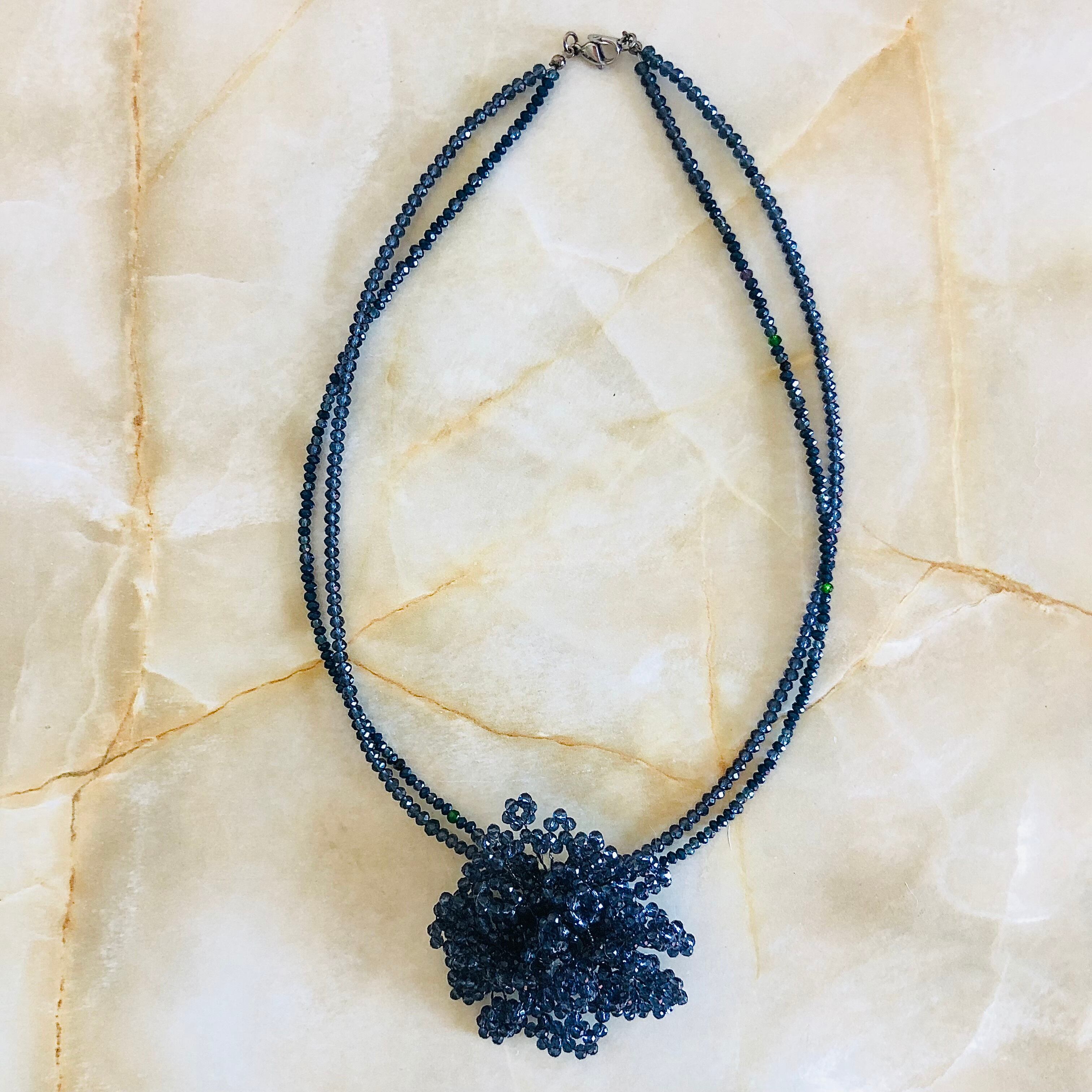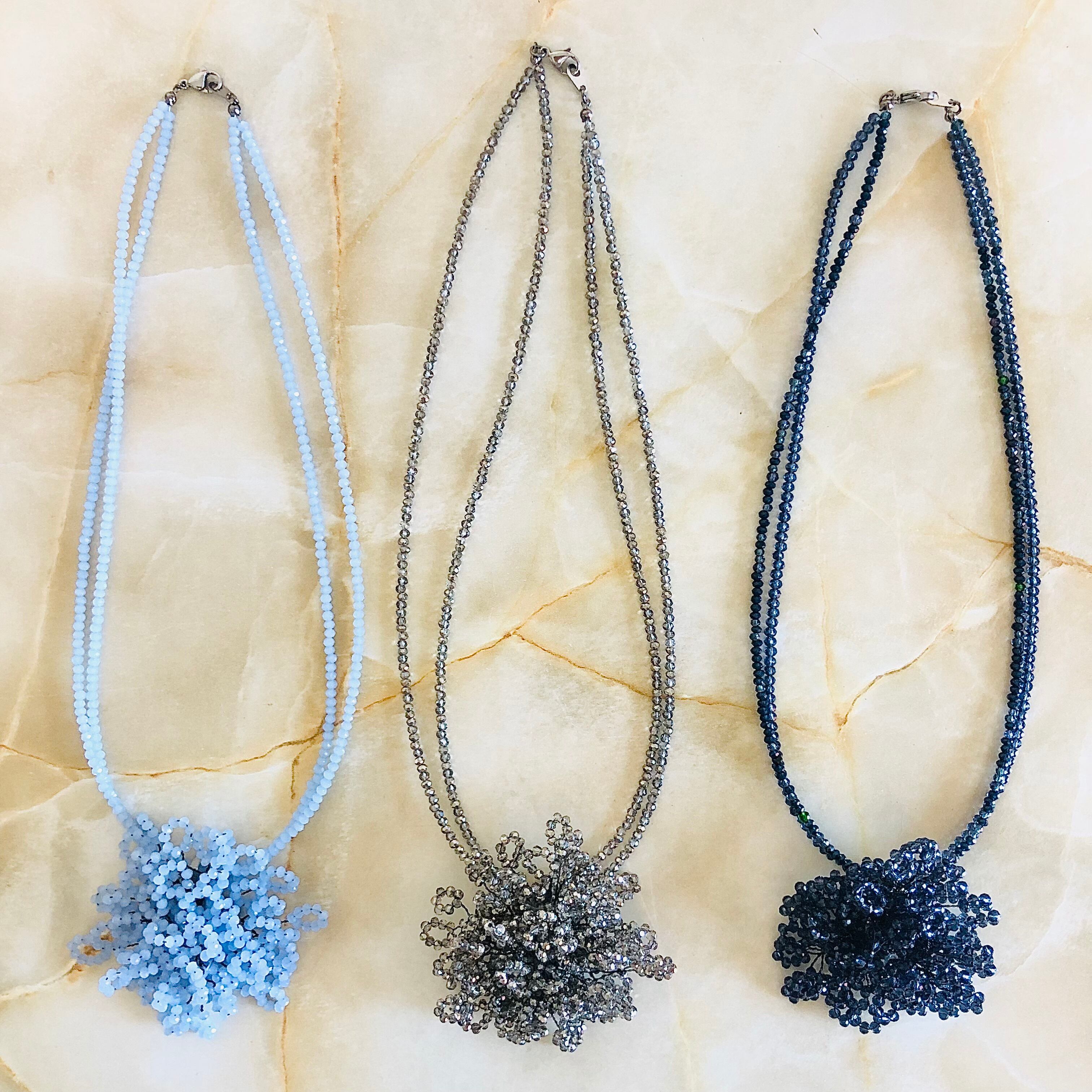 ワンランク上のガラスビーズの輝きで作ったフラワーモチーフが特徴的なネックレスです。