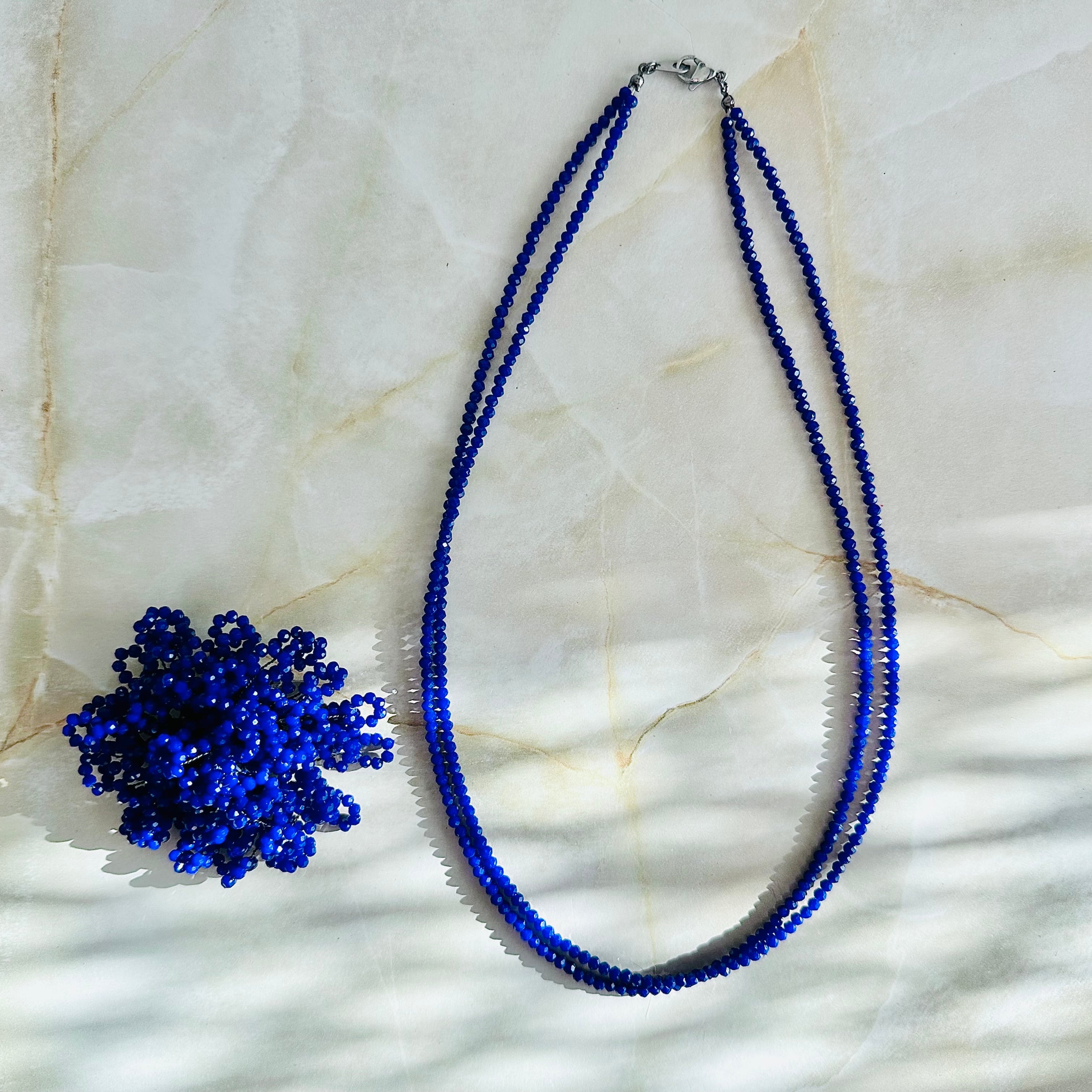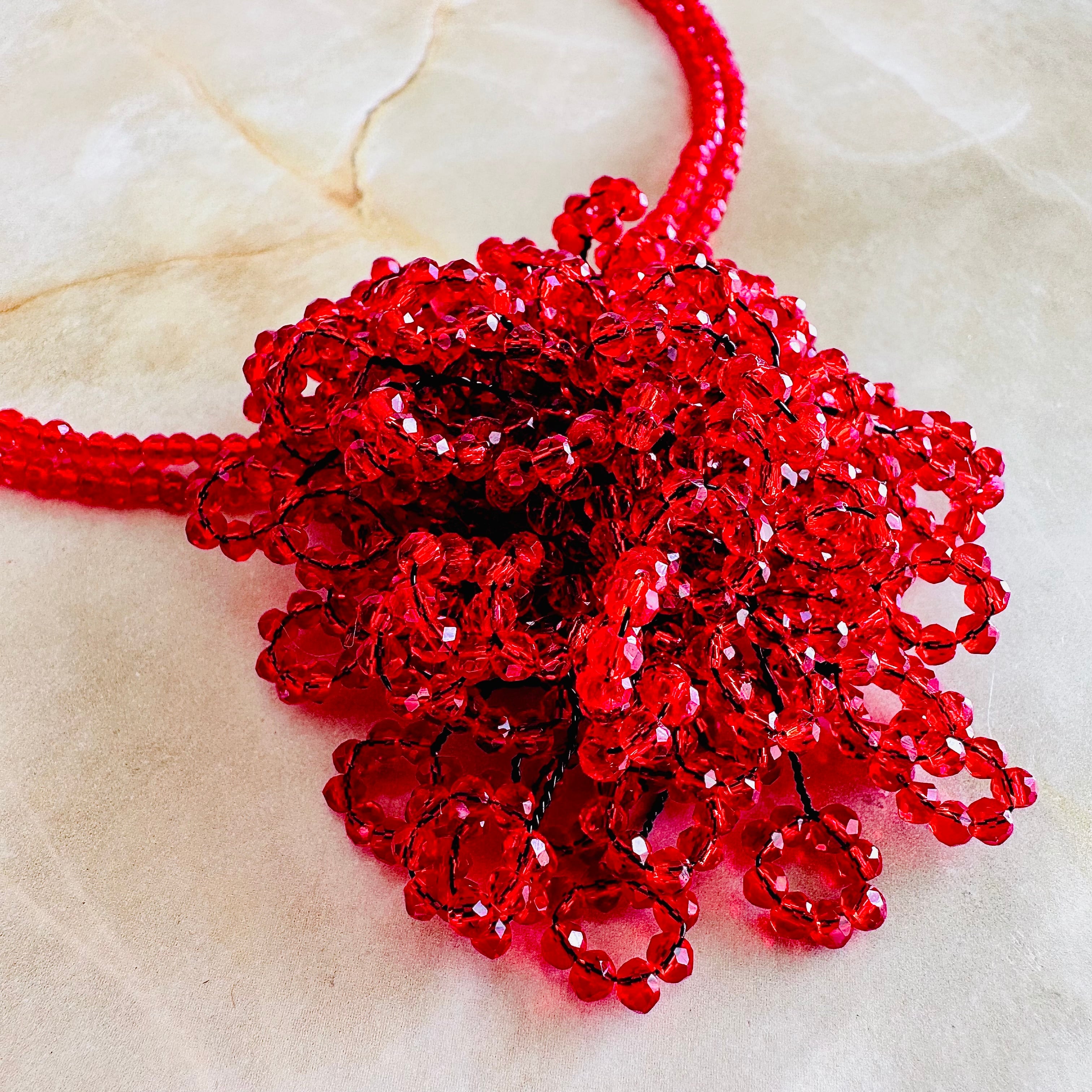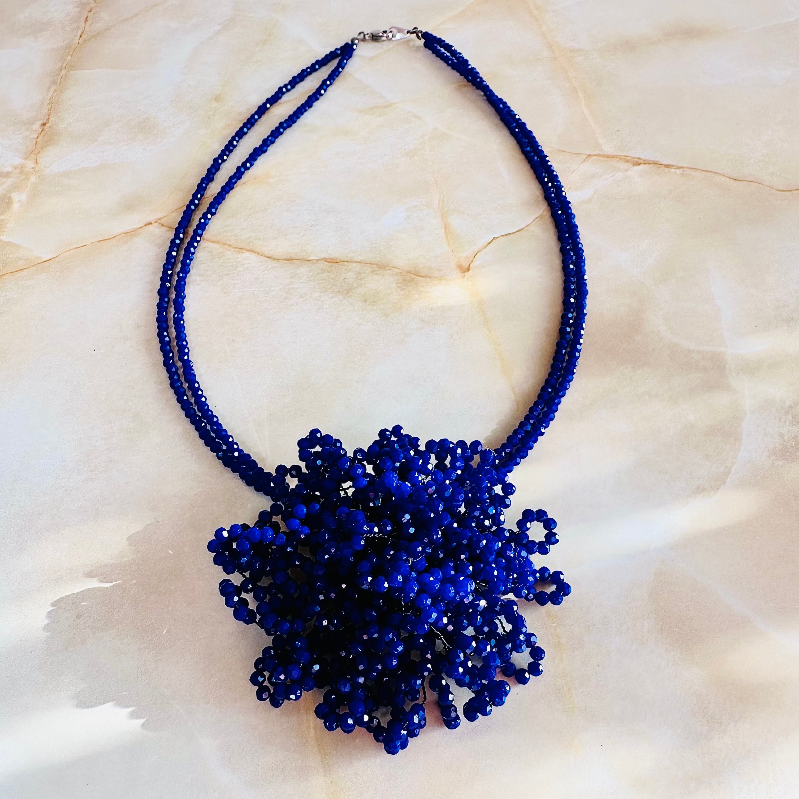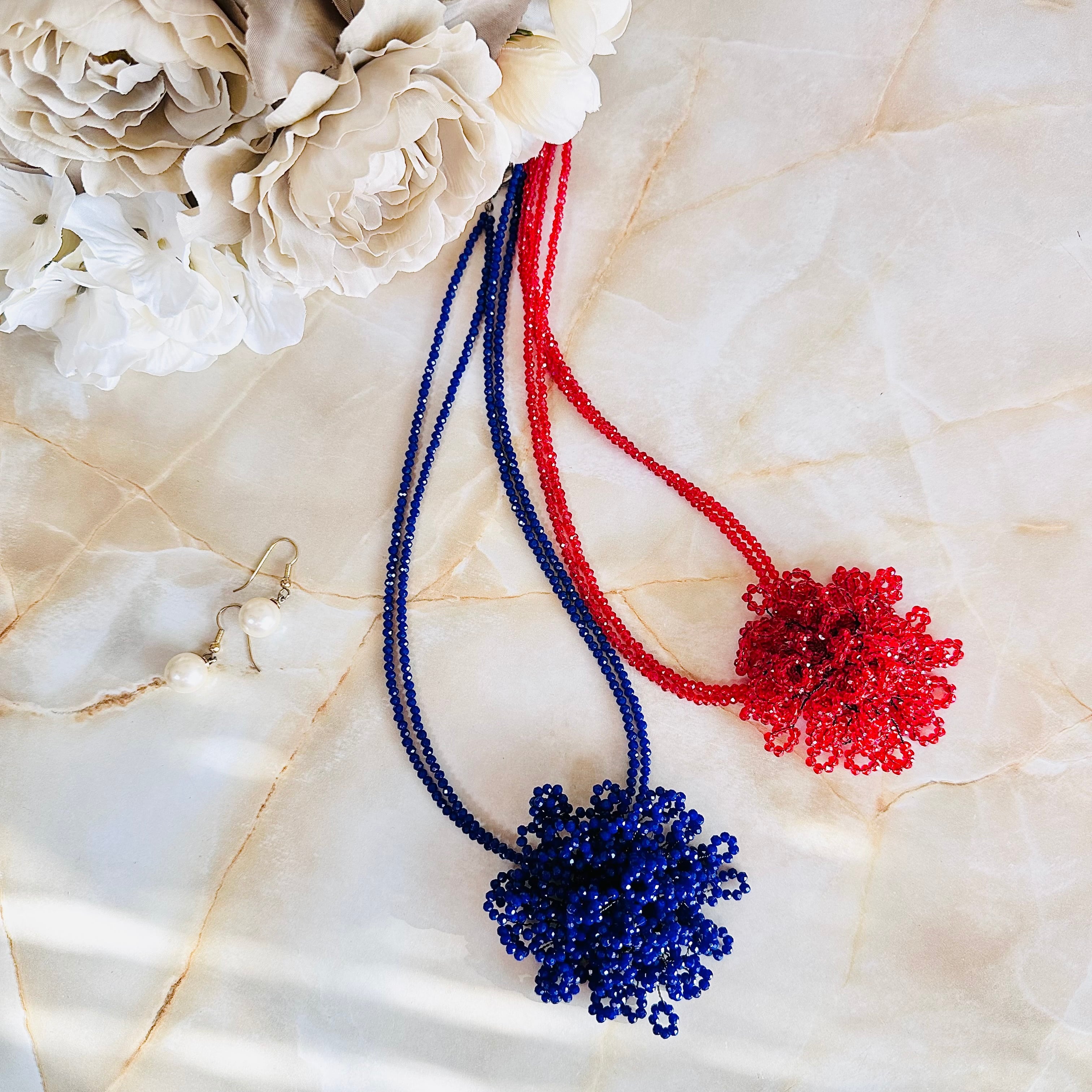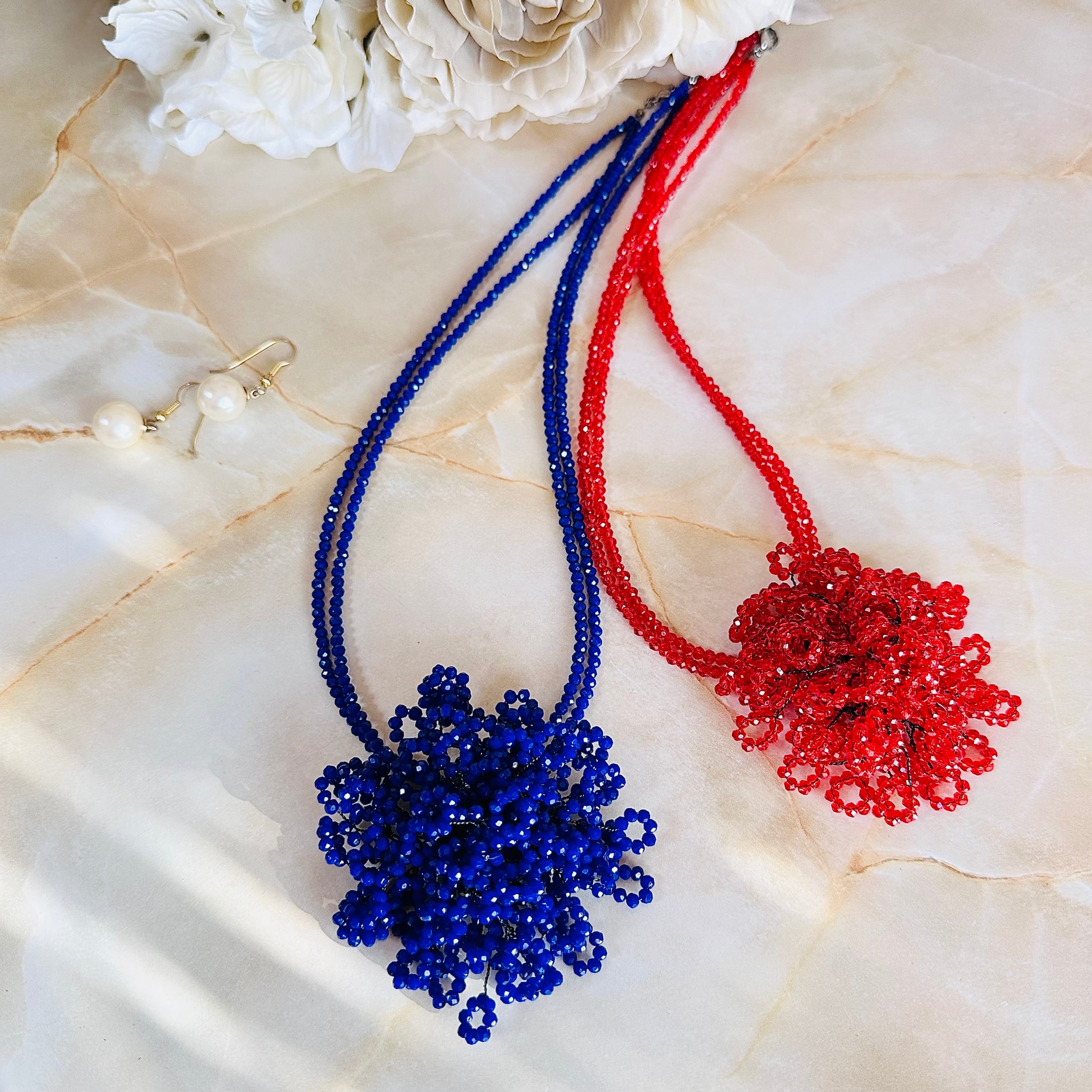 ワンランク上のガラスビーズの輝きで作ったフラワーモチーフが特徴的なネックレスです。