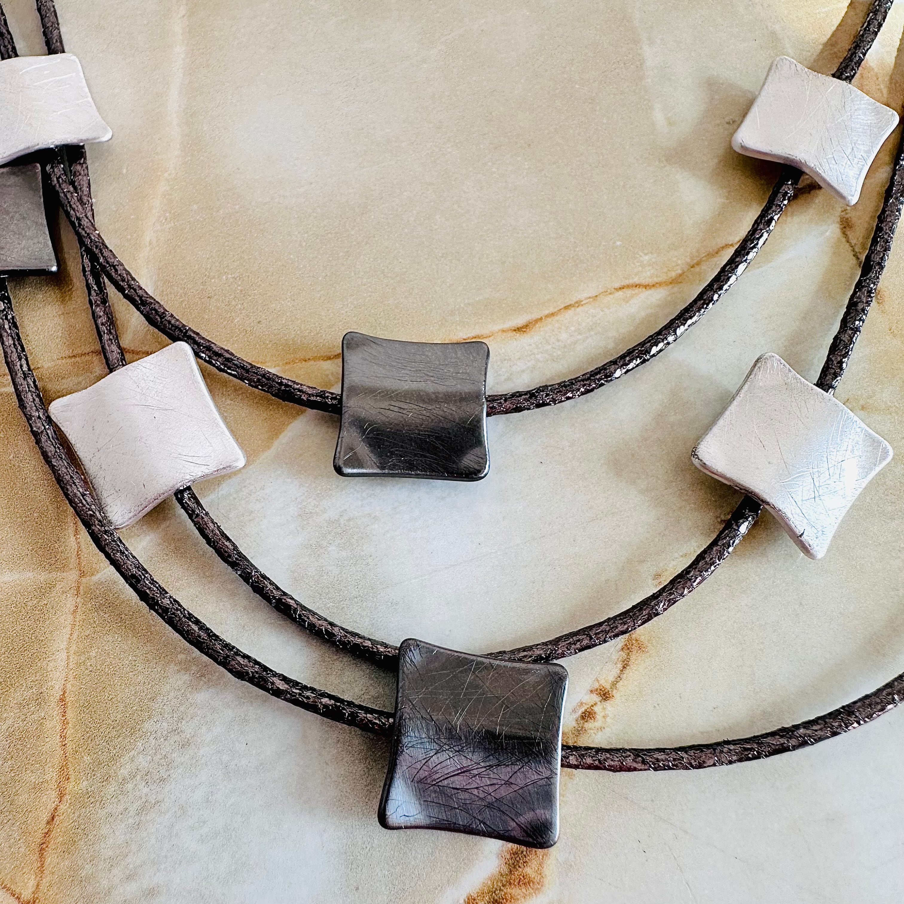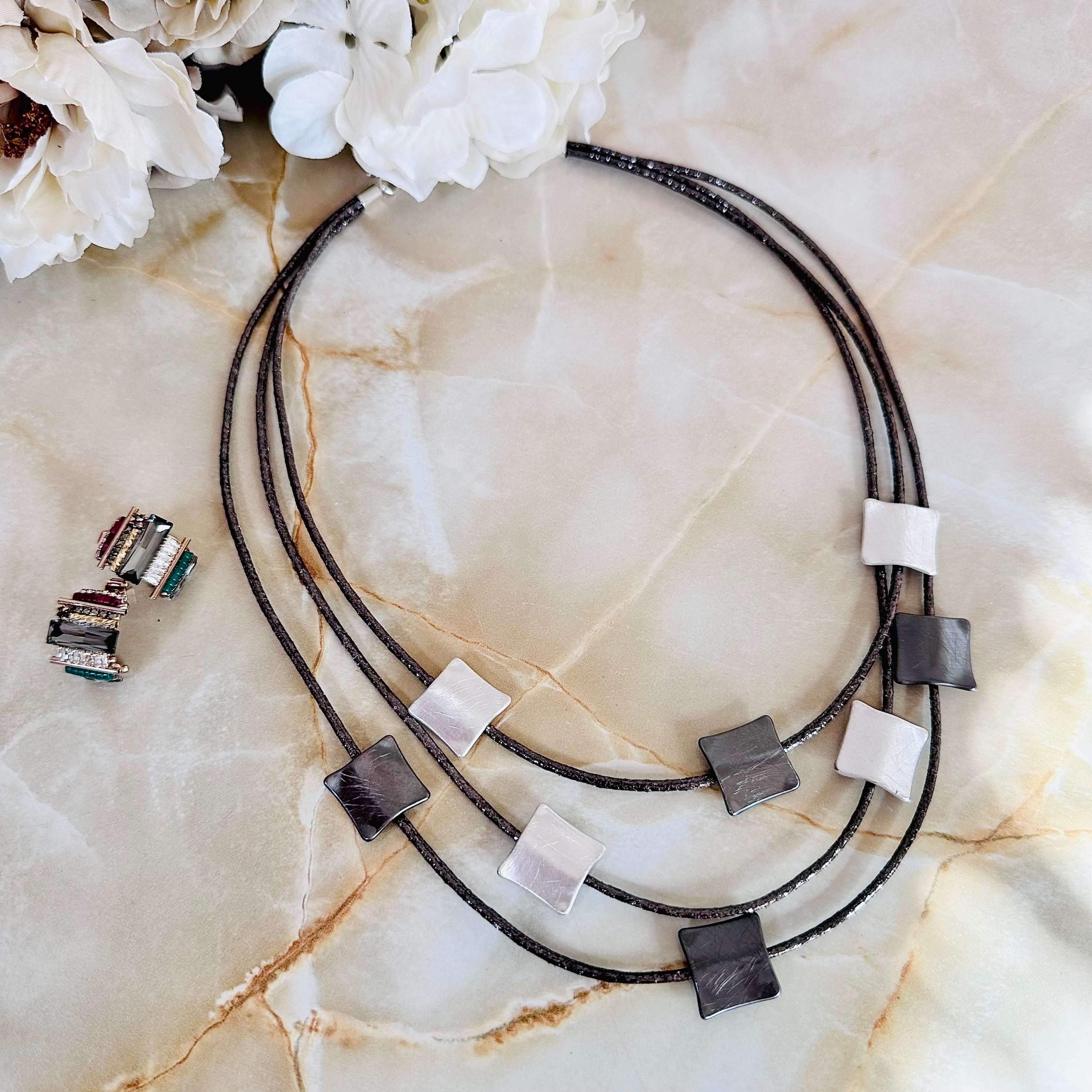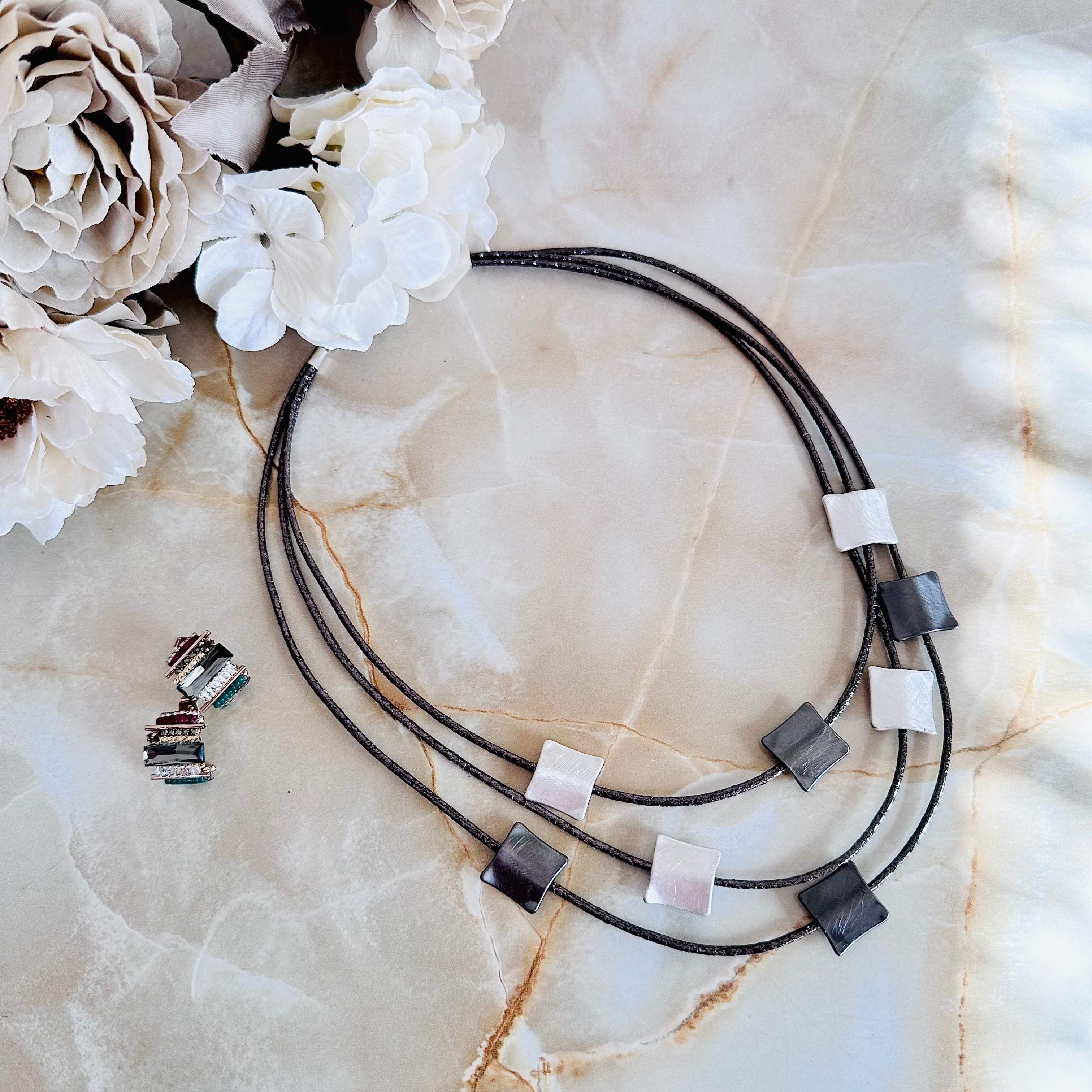 スクウェアのマットな質感のパーツに表情をプラスするためにあえて細かいキズを施し、3連のコードにバランス良く配置したデザインです。