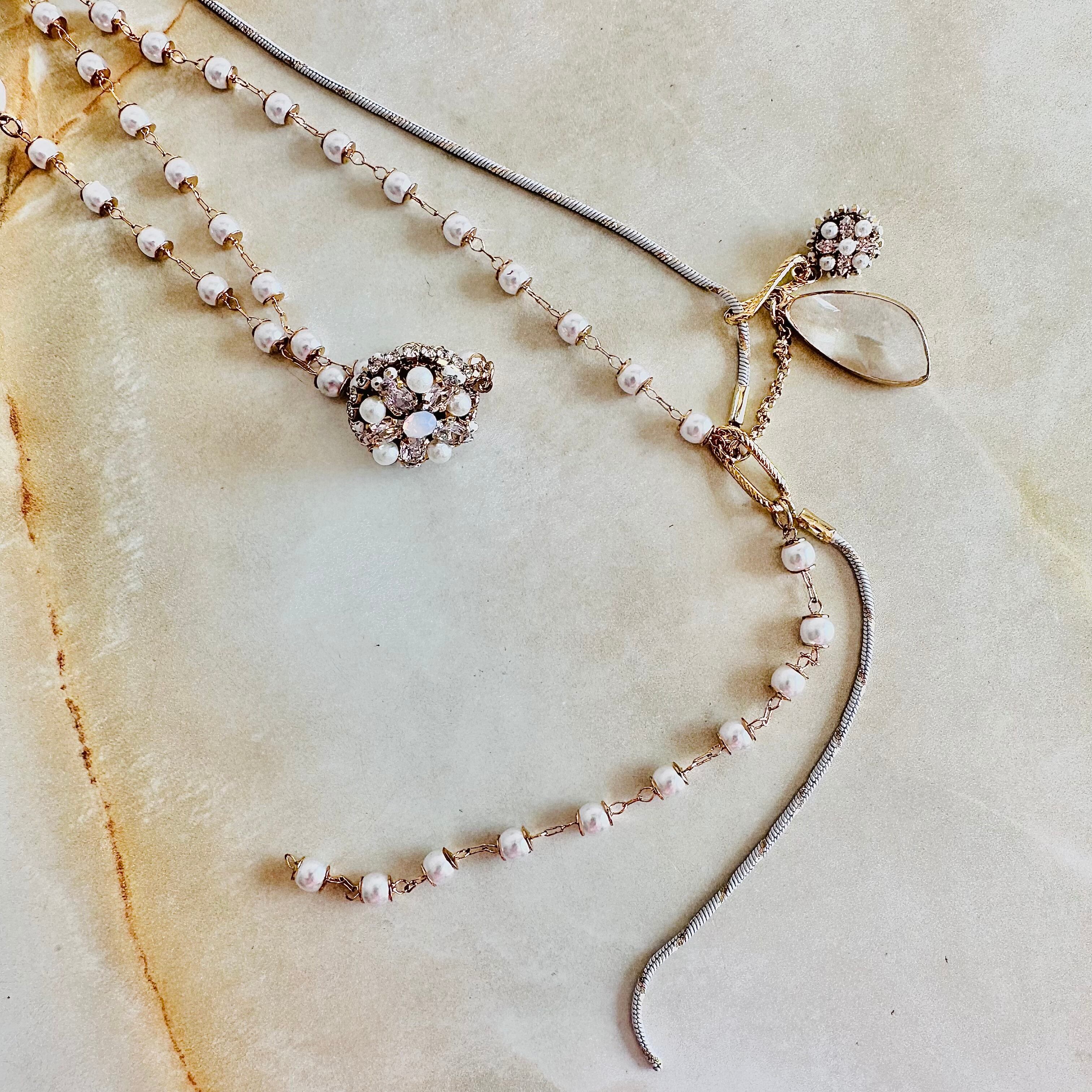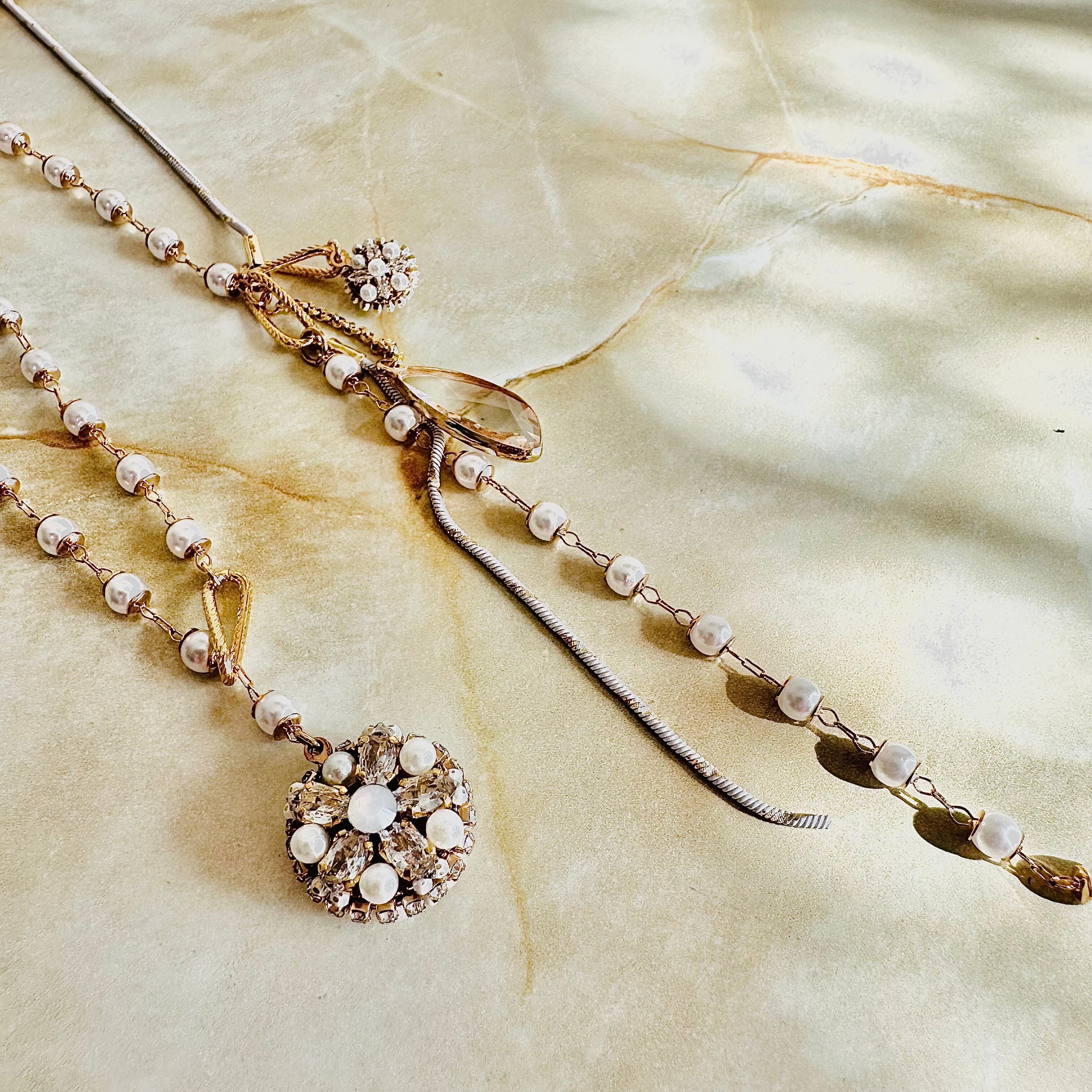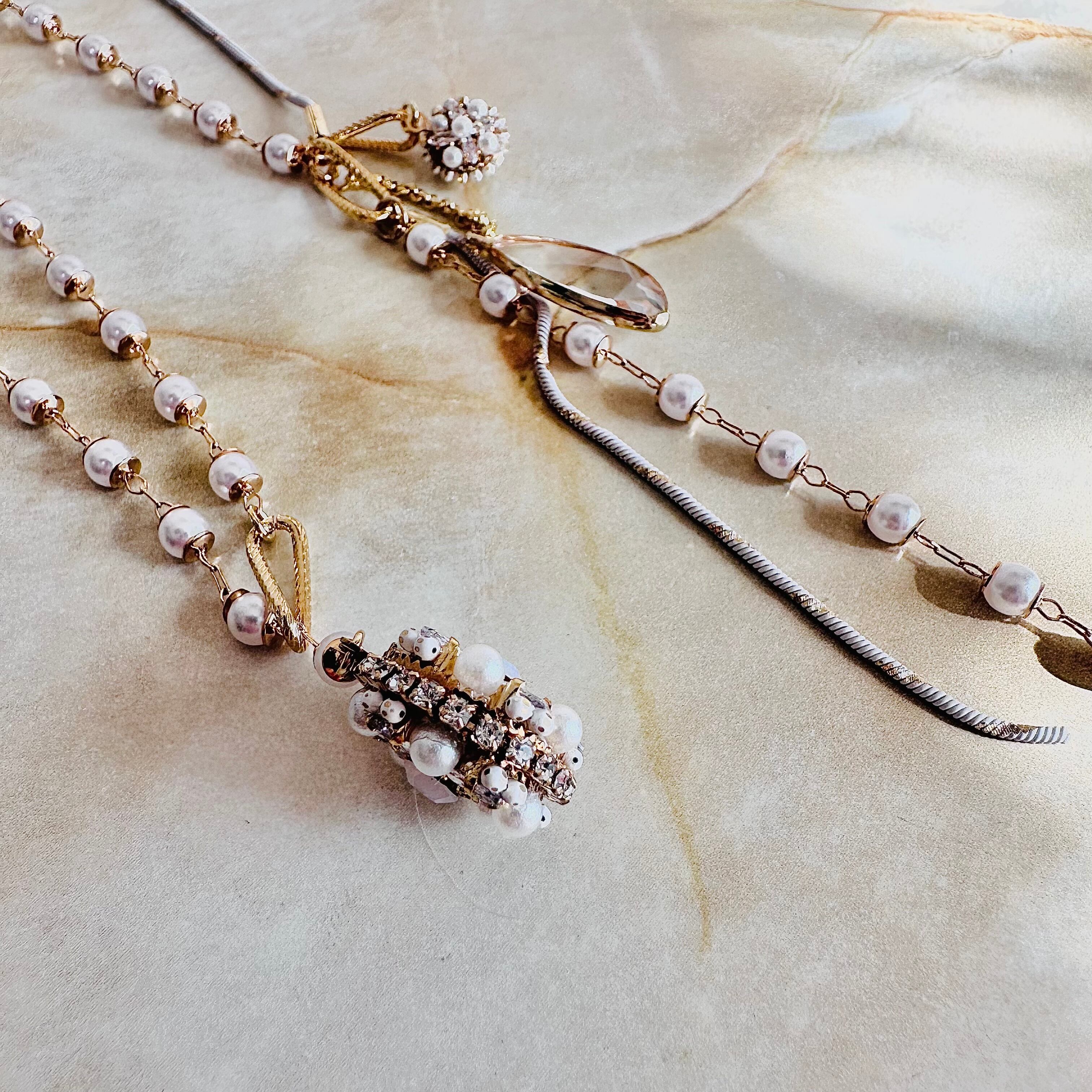小粒パール、ガラスパーツ、ラインストーンなど華やかな素材を上品なカラーで組み合わせたデザインです。