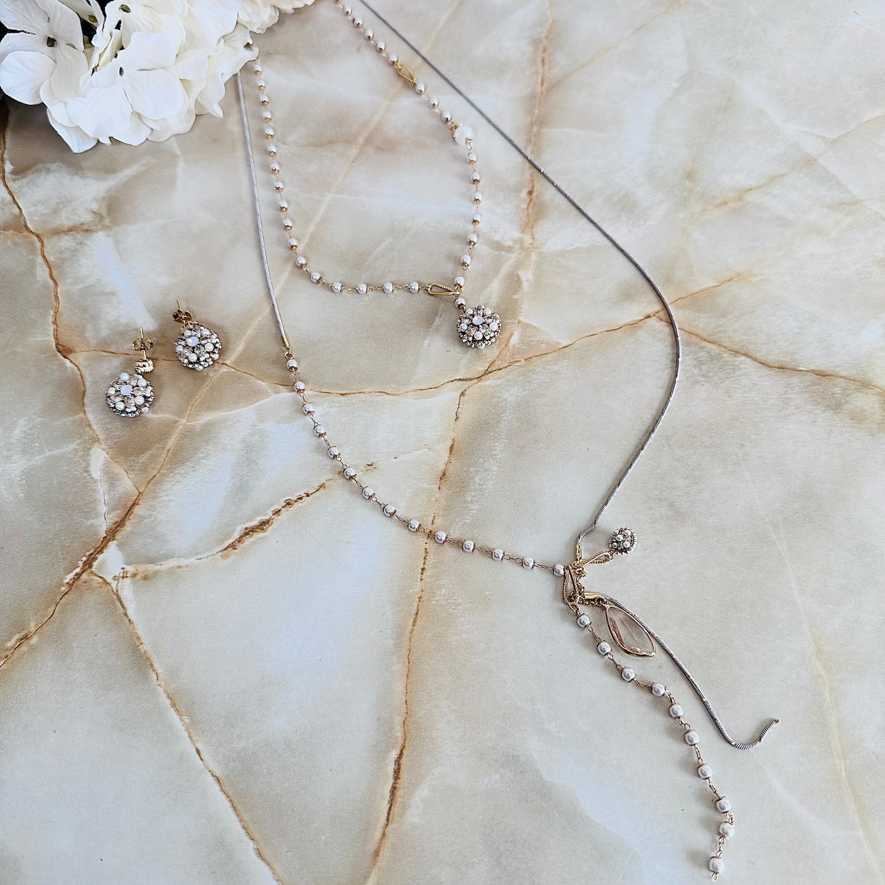 それぞれのデザインが素敵で、別々でつけて女性の繊細さを表現しても良し、両方つける重ね付けの他、お手持ちのネックレスとの組み合わせなどなど