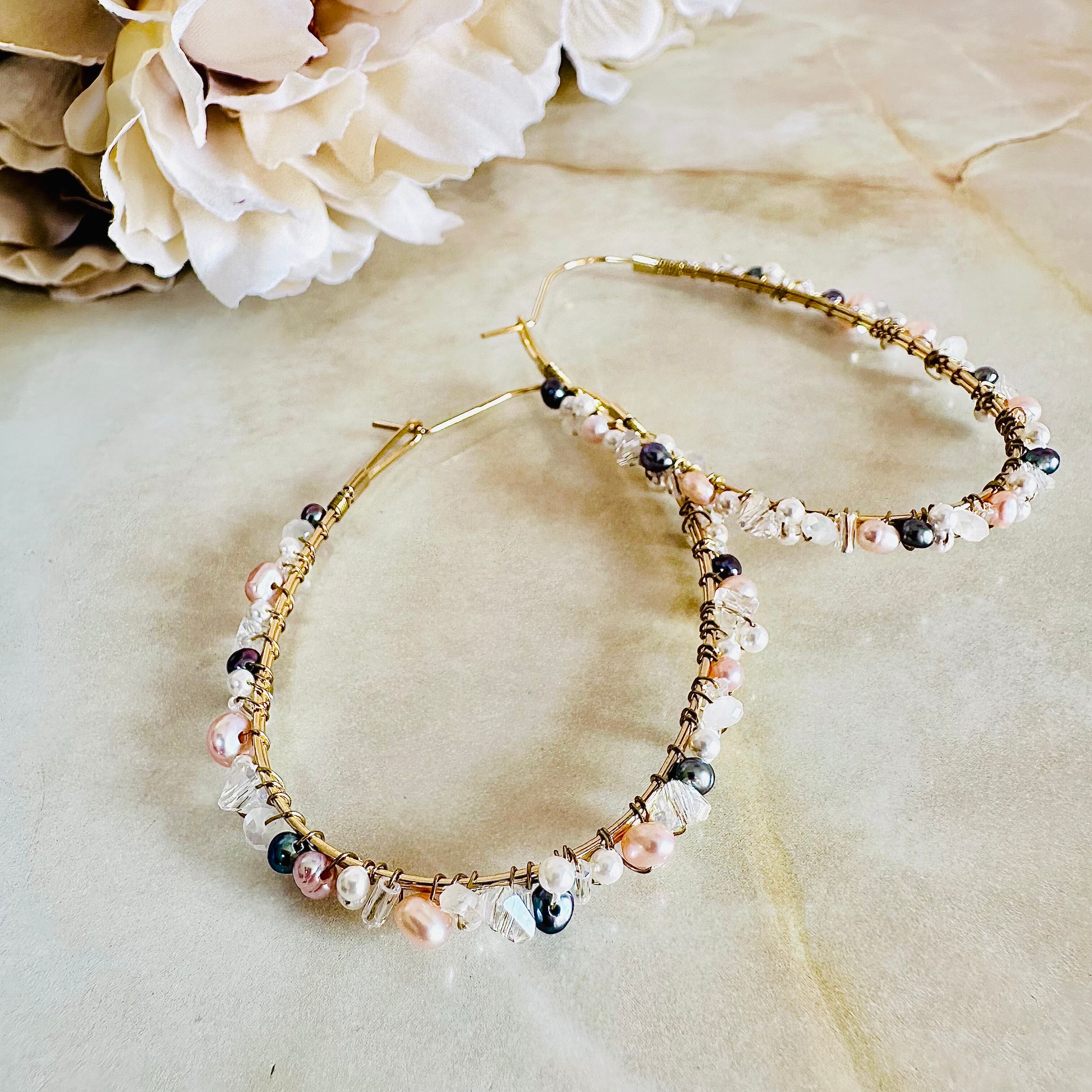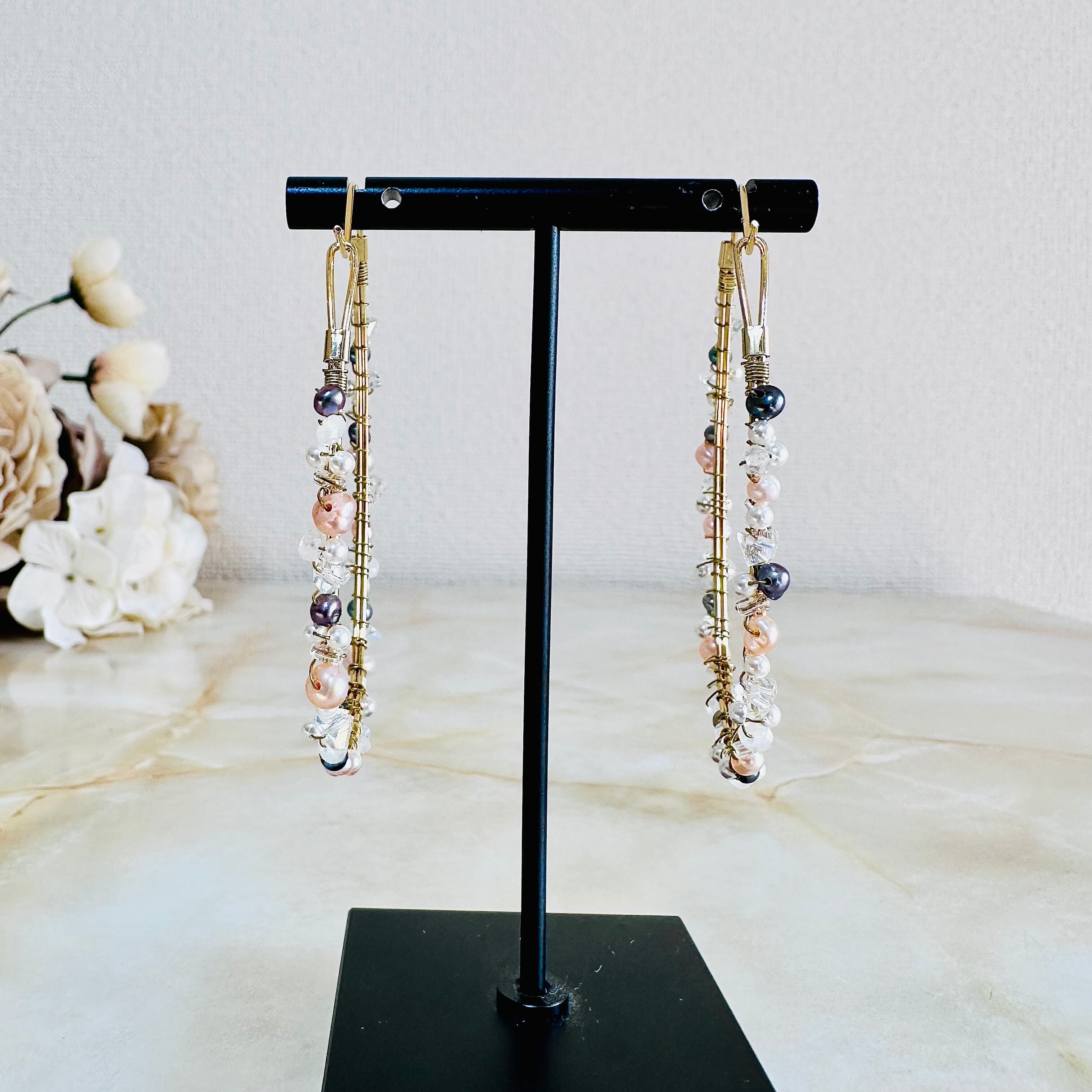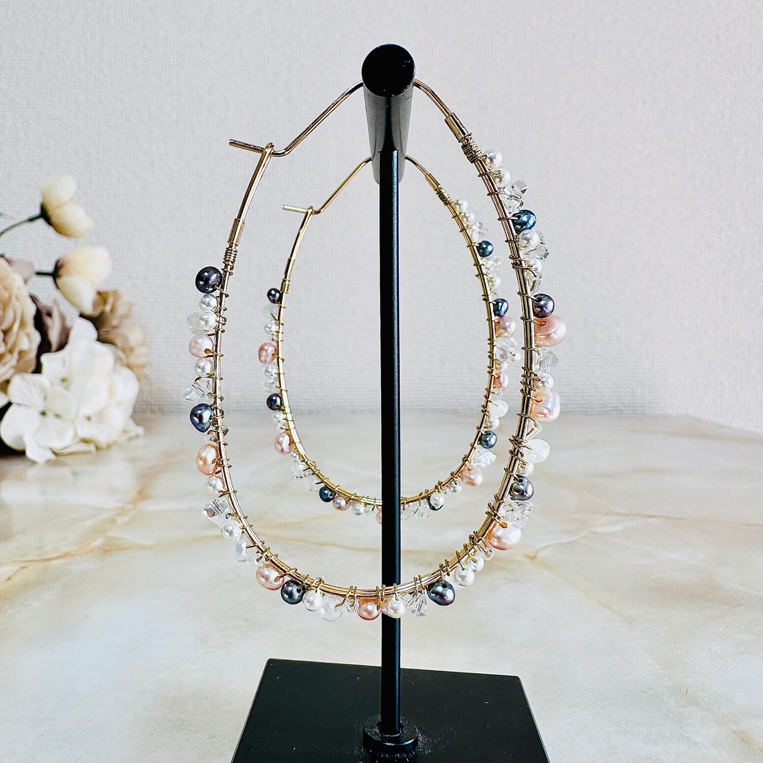 様々なカラーの小粒天然淡水パールやクリスタルビーズなどを繊細に組み合わせた上品な華やかさのあるデザインです。