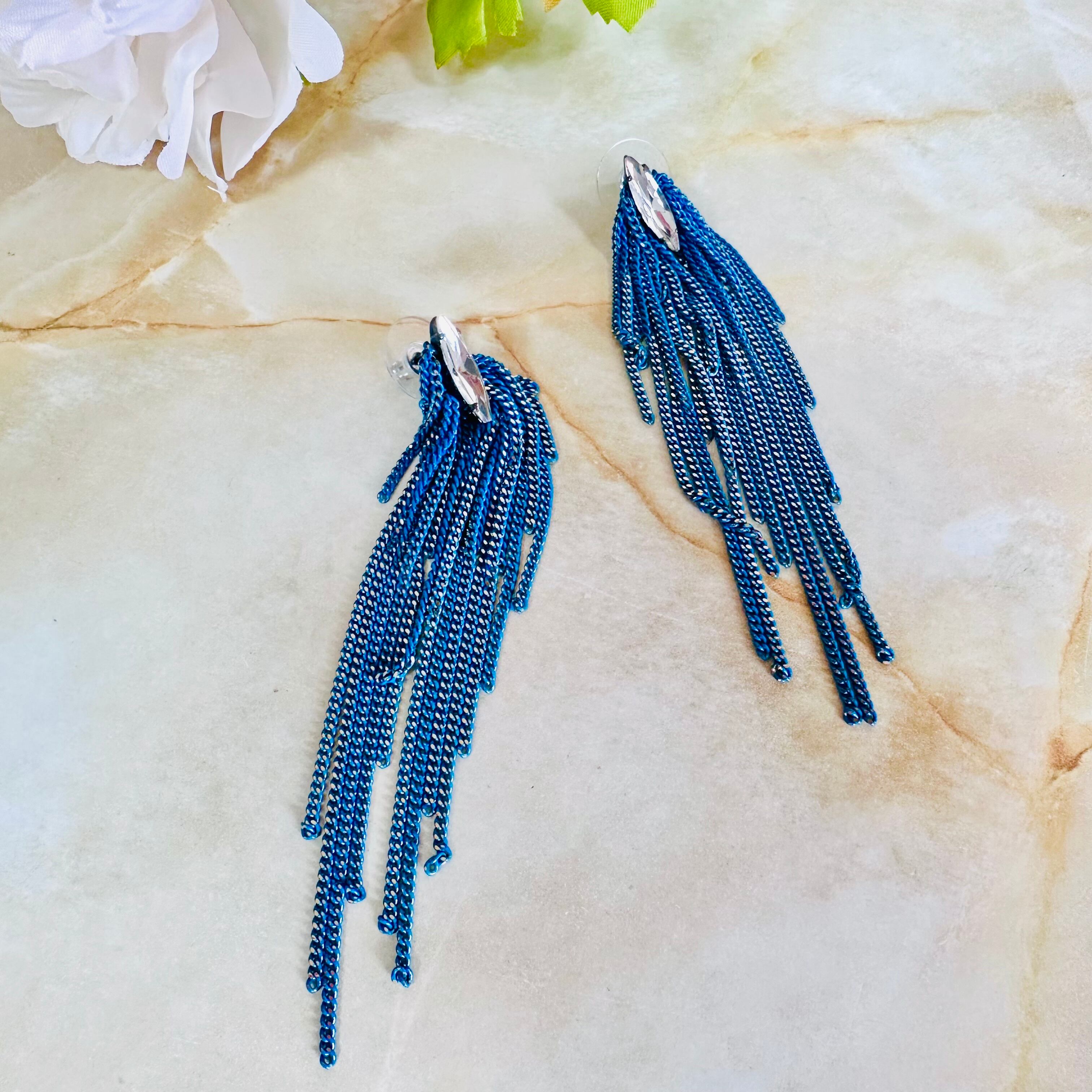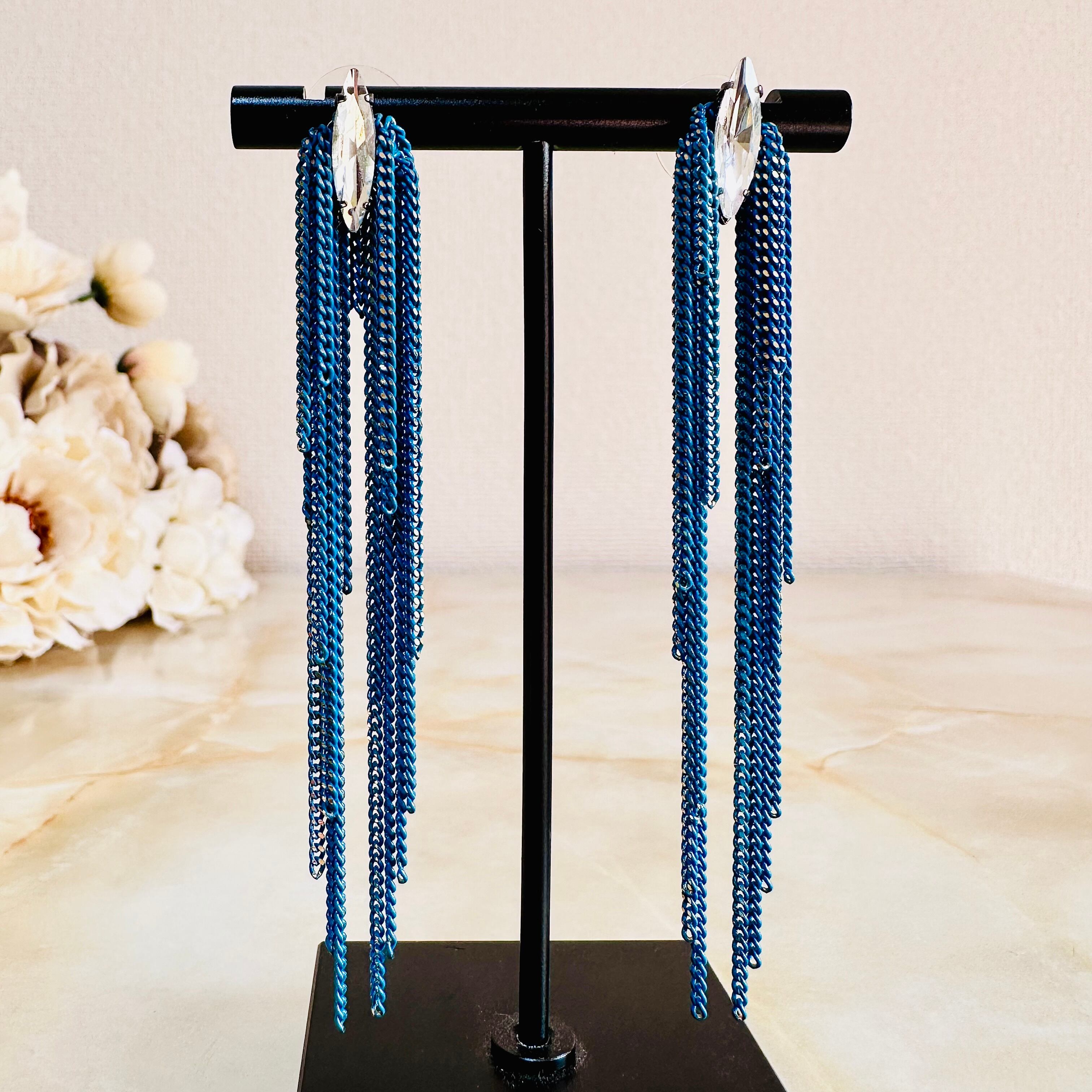 ゴールドの入ったブルーのチェーンを長めに流し、ラインストーンでカッコ良く仕上げたデザインです。