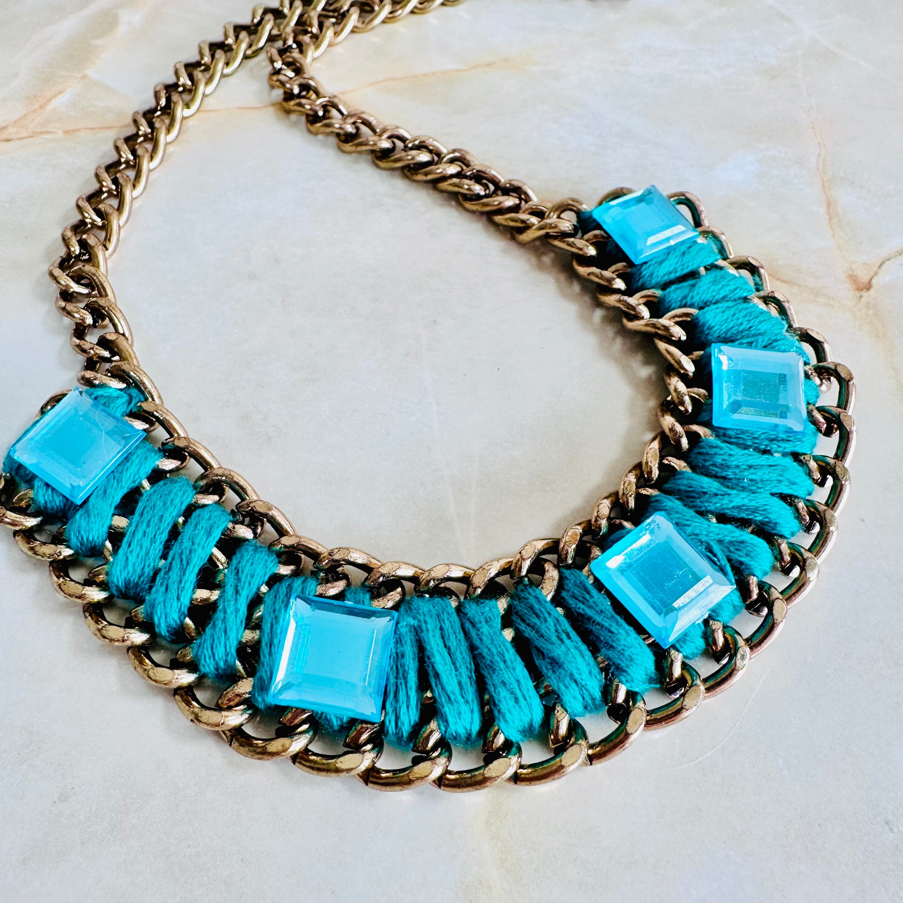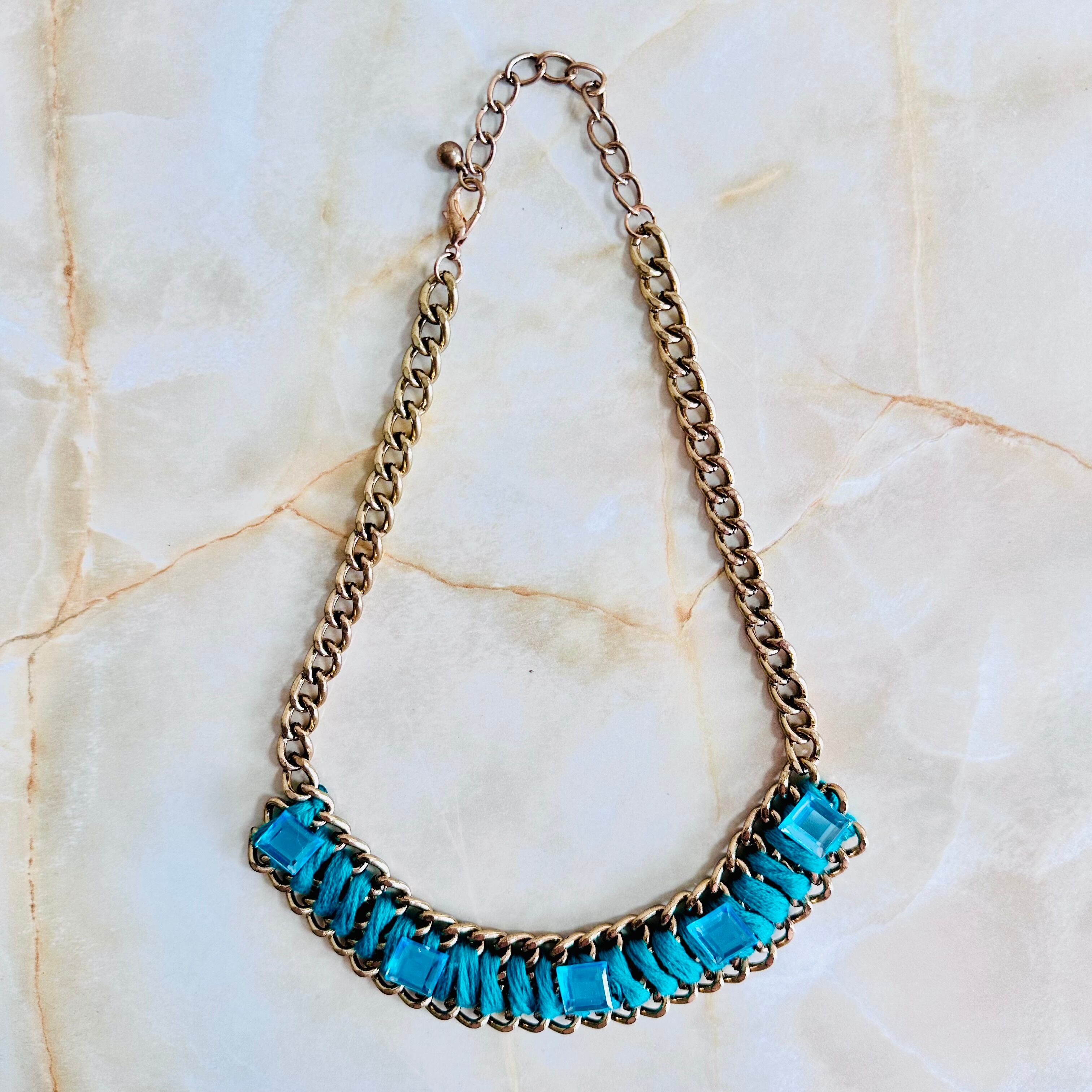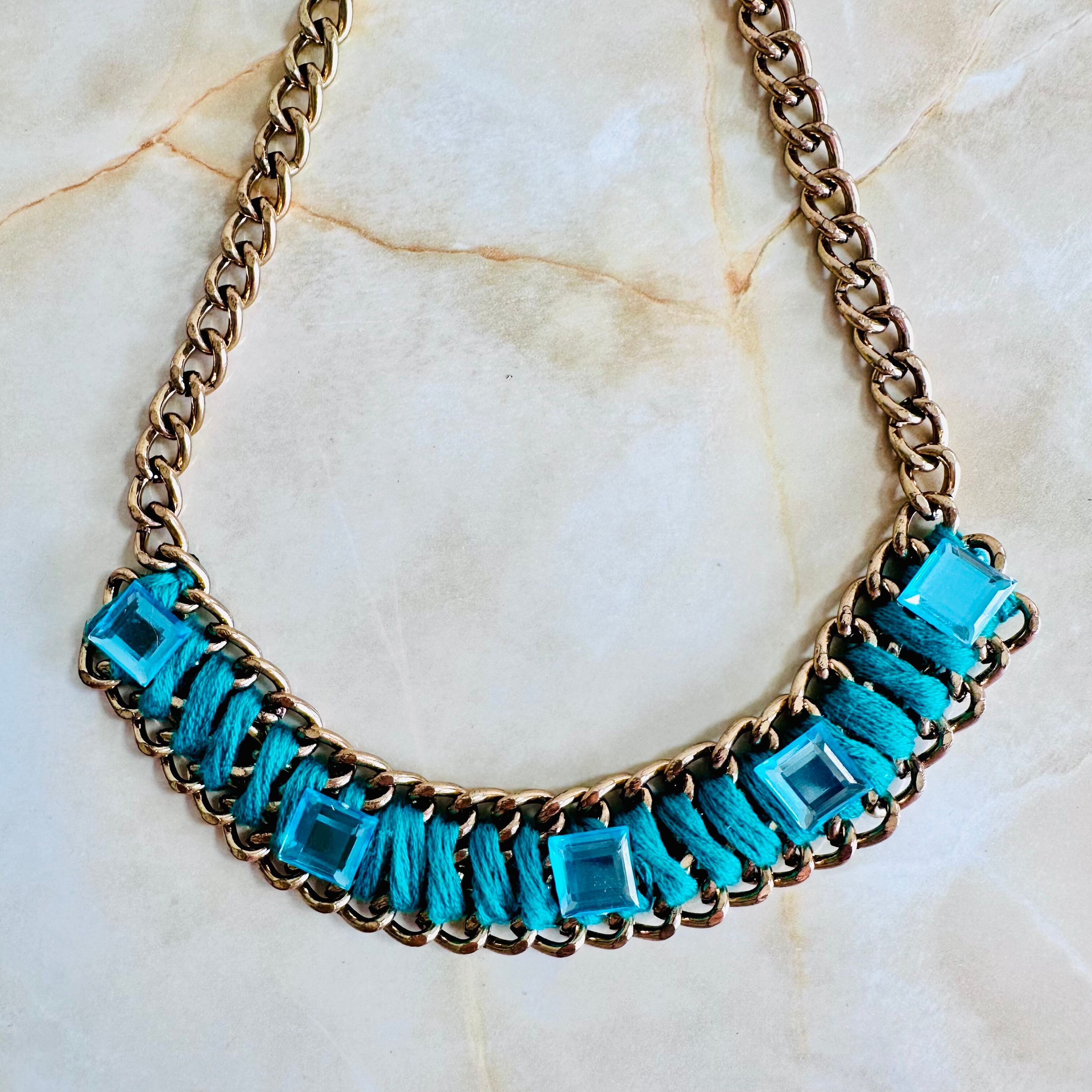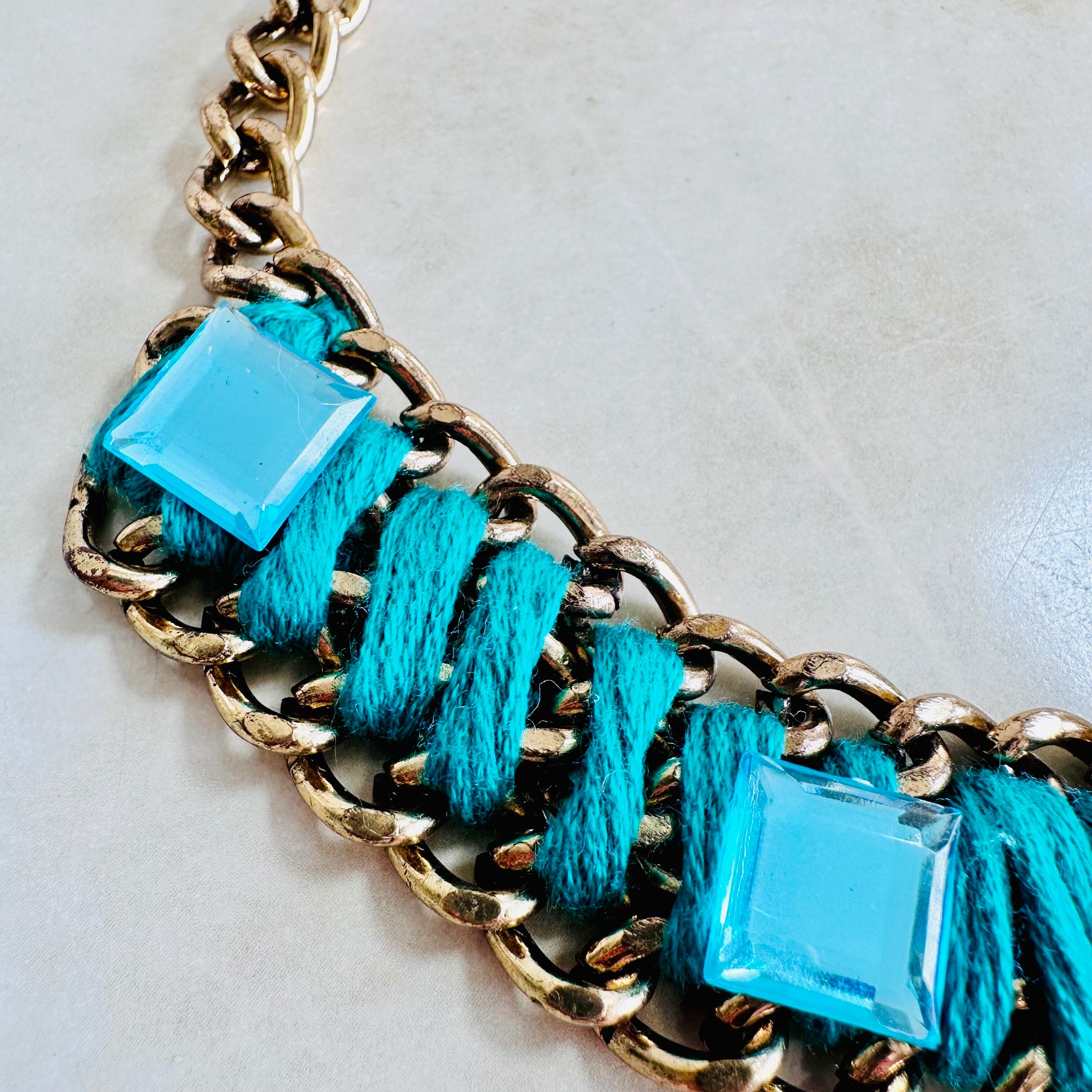 糸をチェーンに巻きつけ、キラキラと輝くスクウェアのパーツをデコレートしたユニークなデザインです。