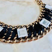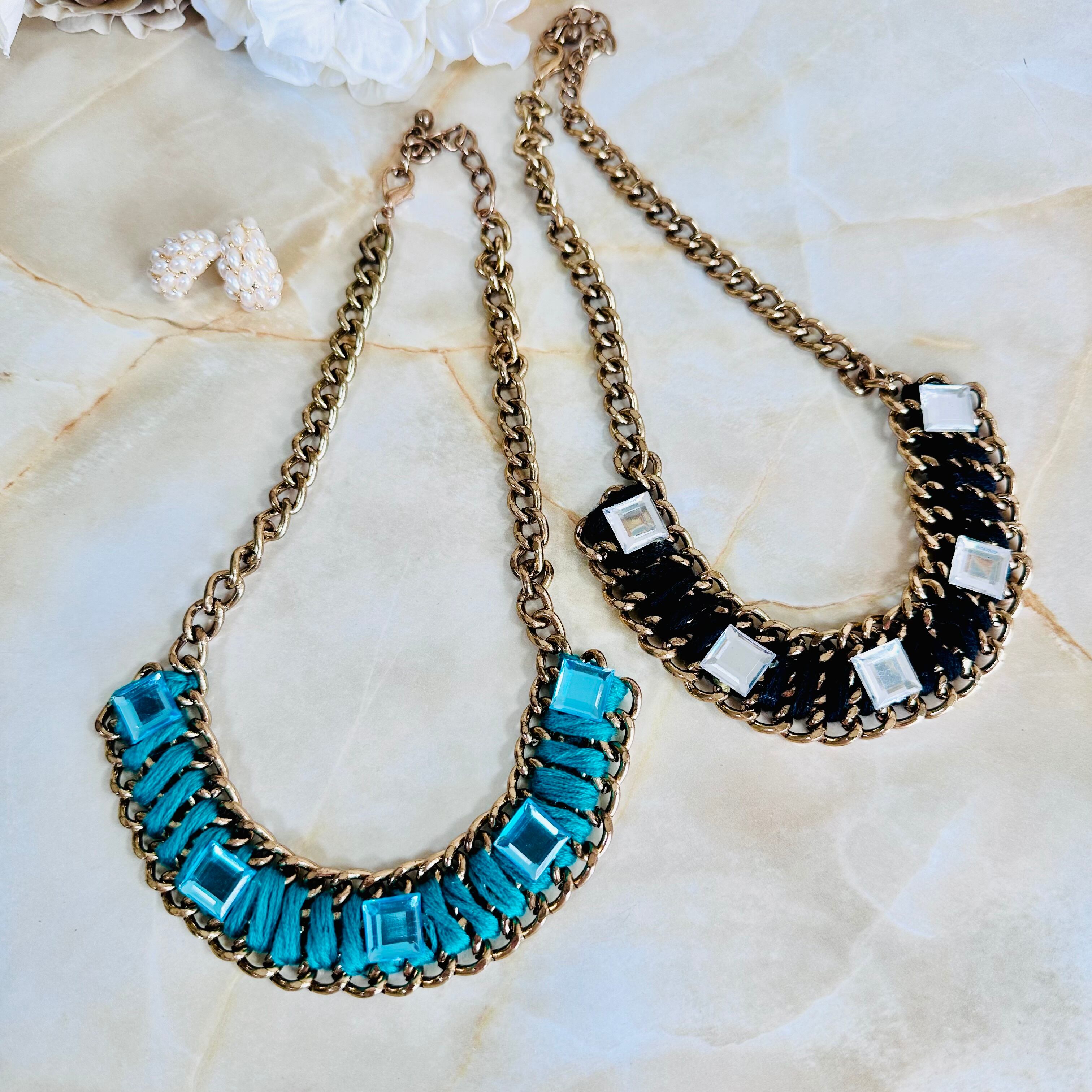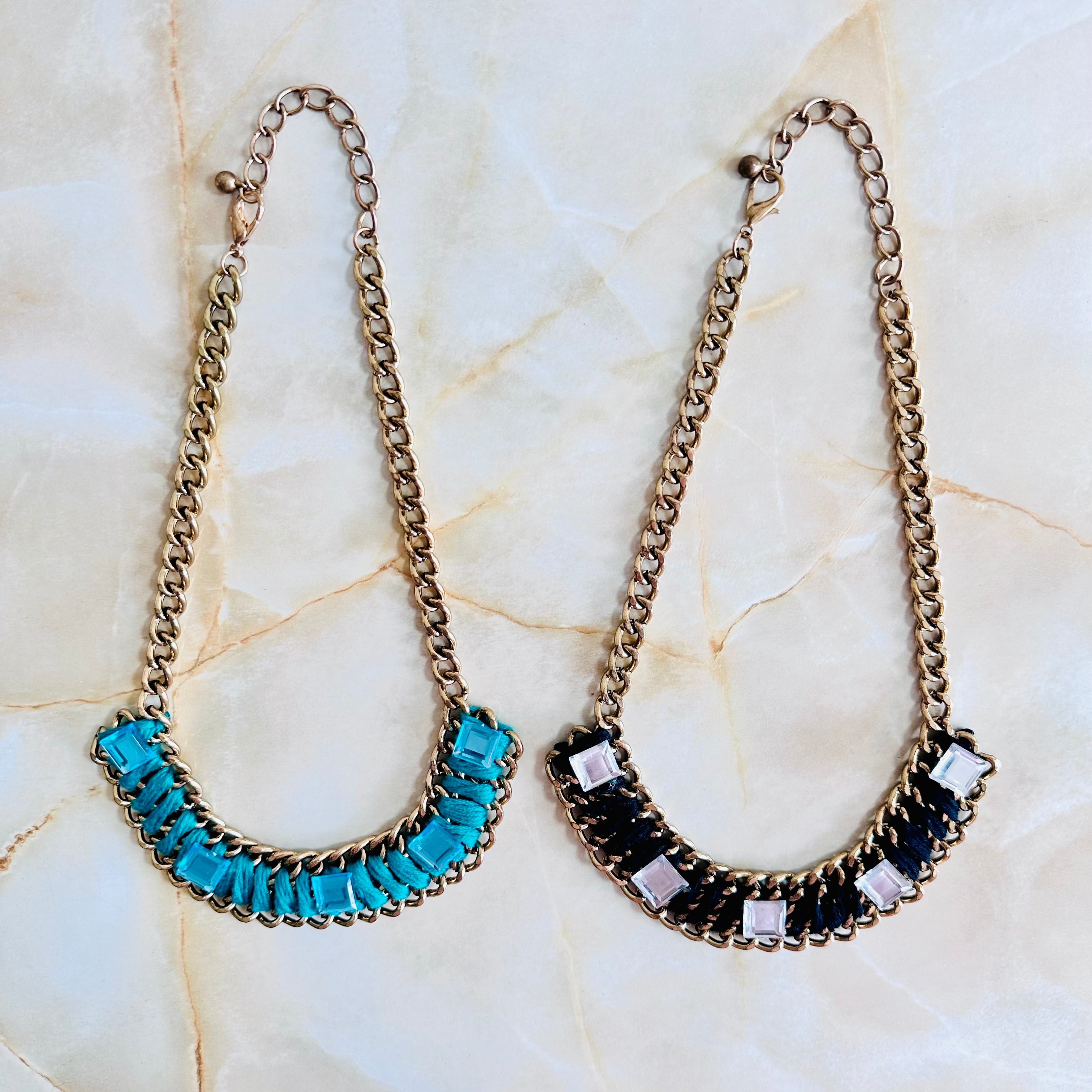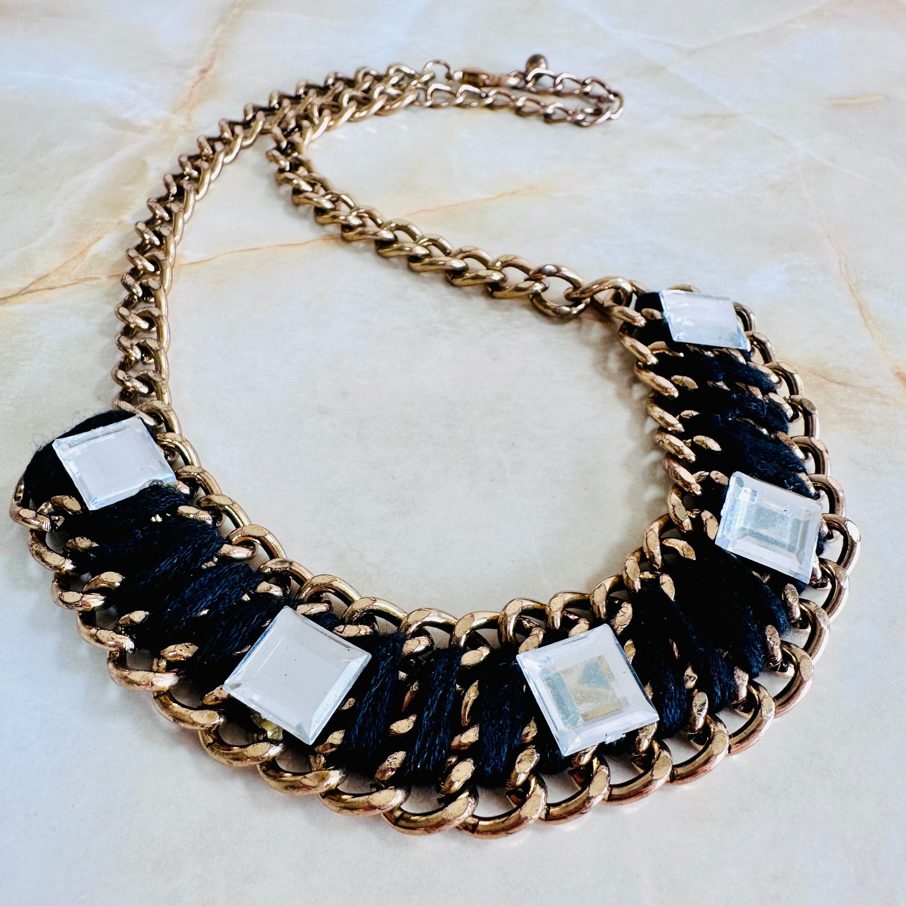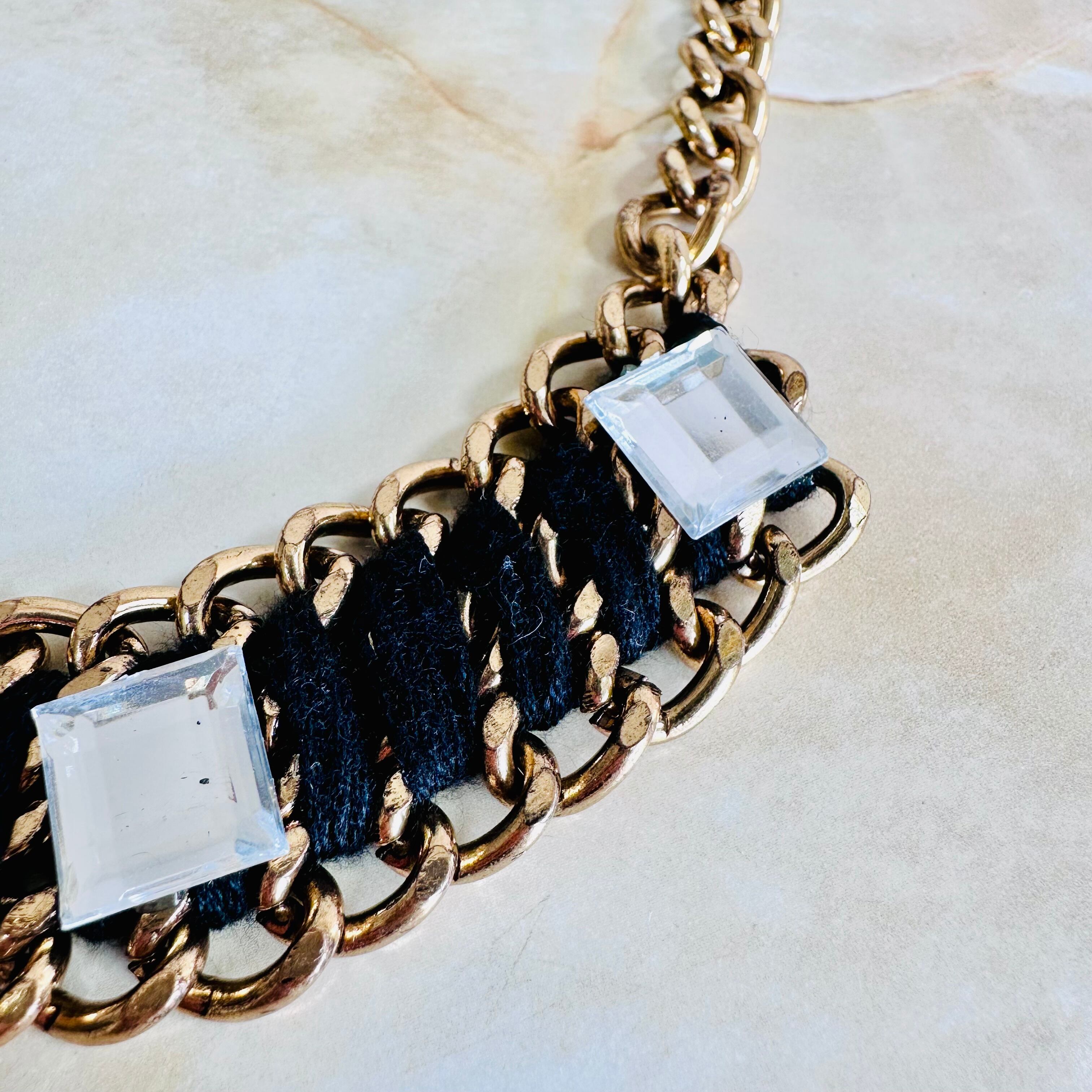 糸をチェーンに巻きつけ、キラキラと輝くスクウェアのパーツをデコレートしたユニークなデザインです。