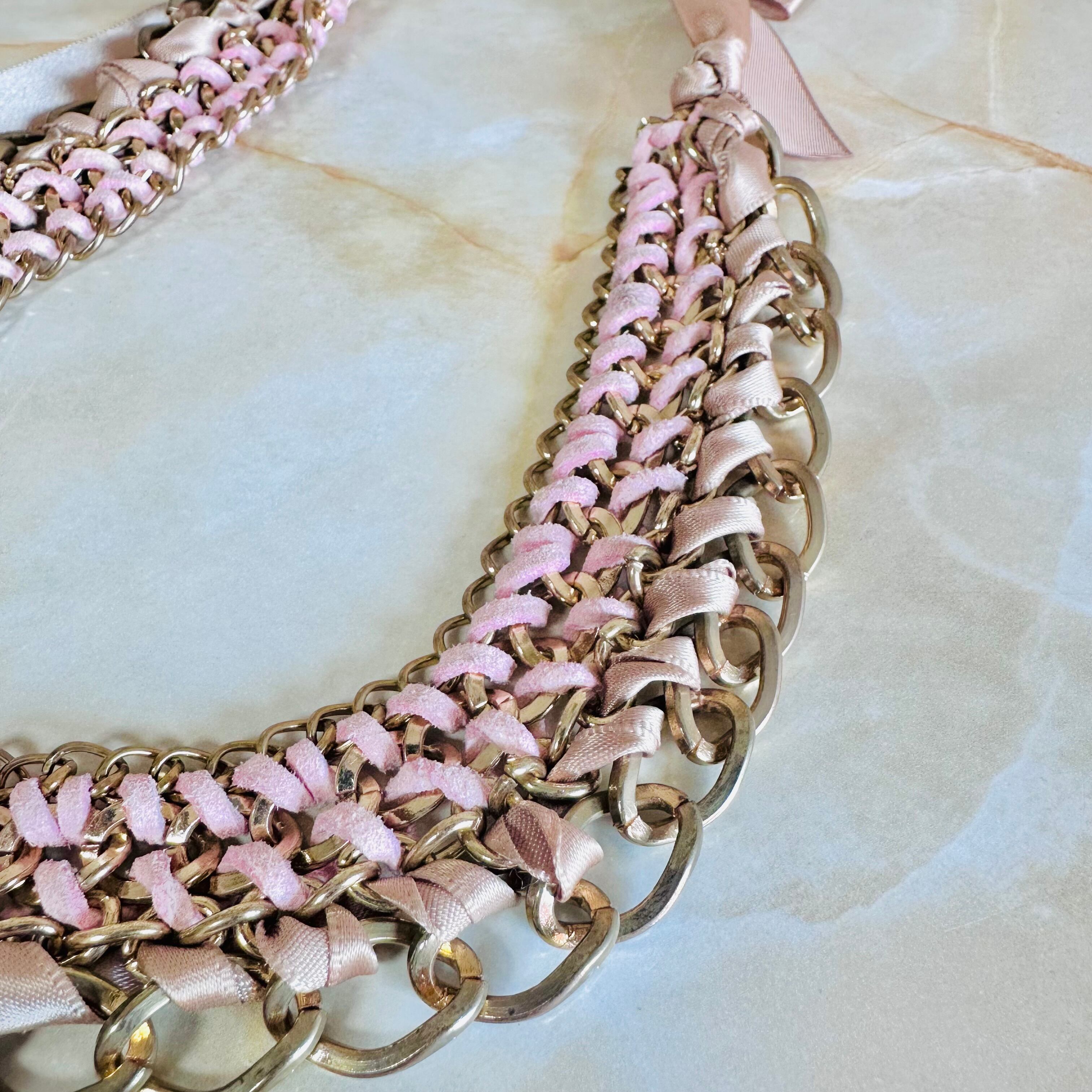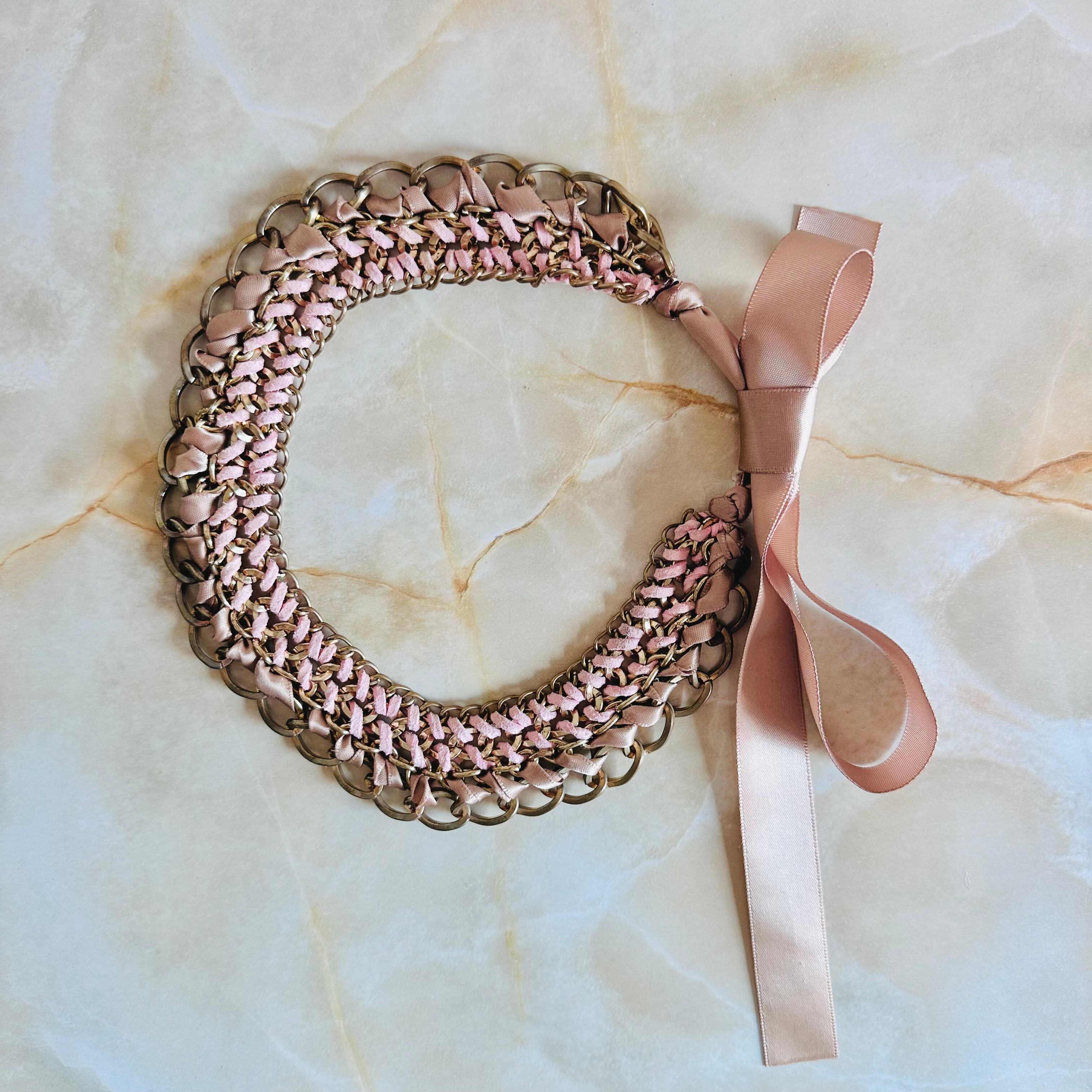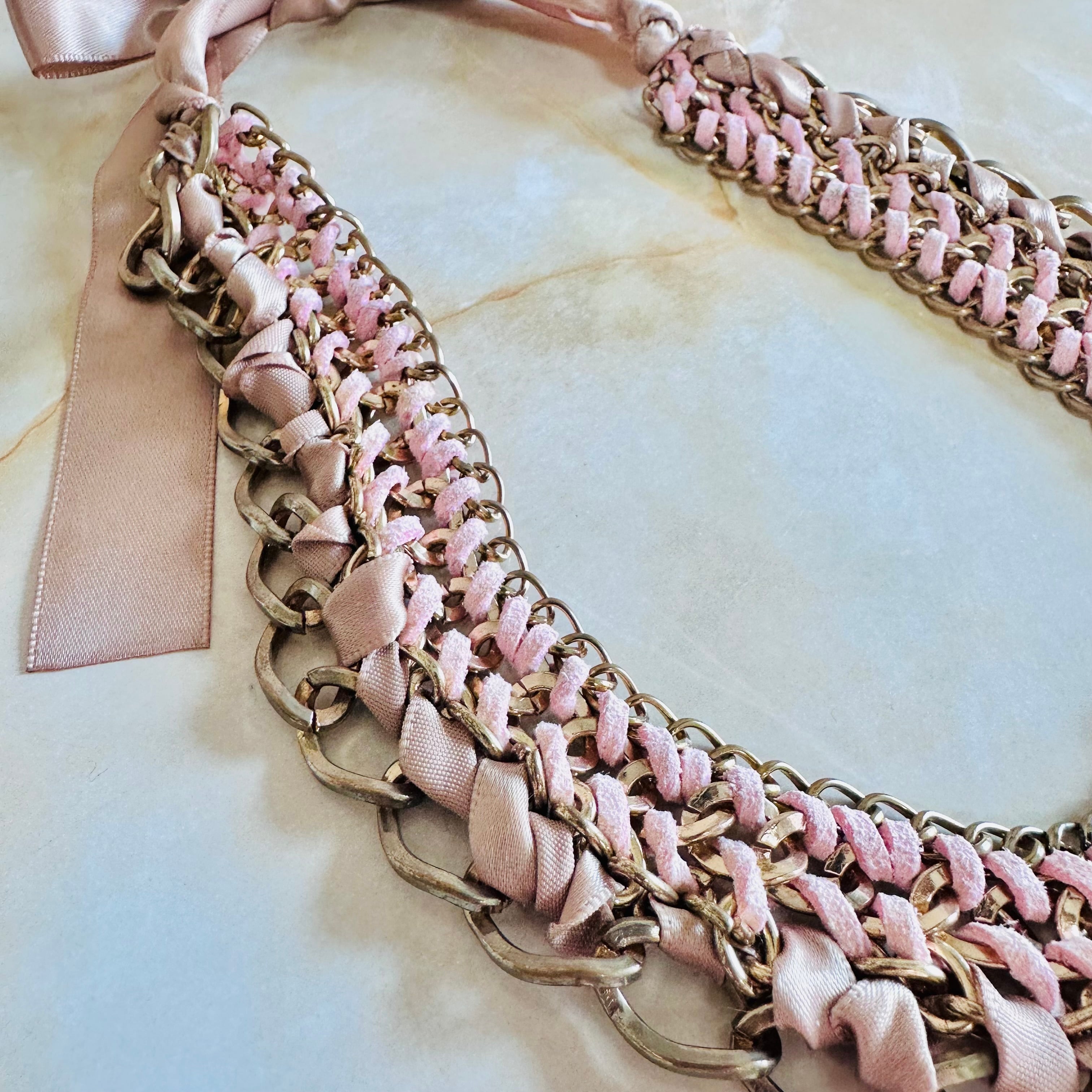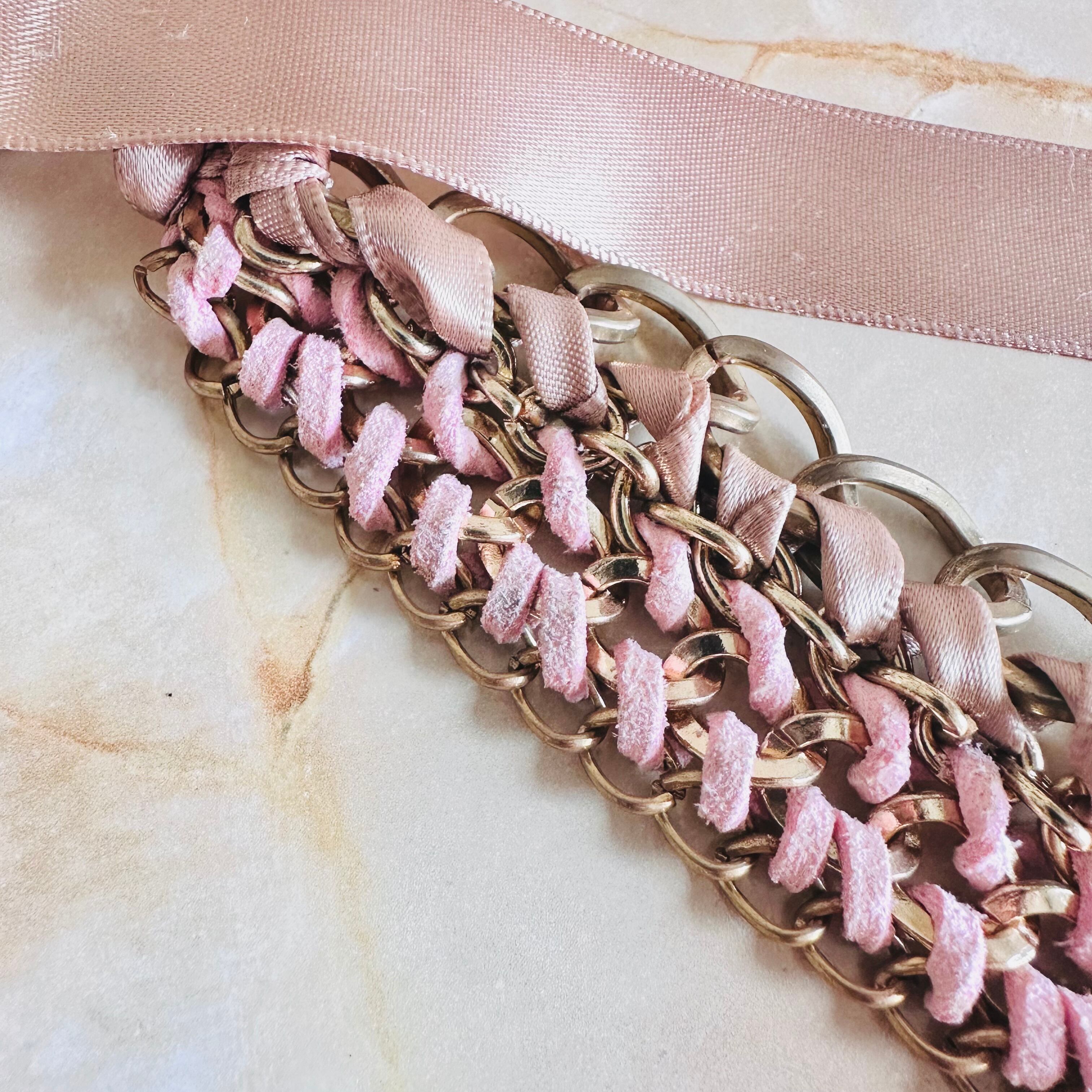 チェーンにグラグランテープと優しいピンクカラーのスウェード革紐を編み上げ、リボンで結ぶデザインに仕上げました。