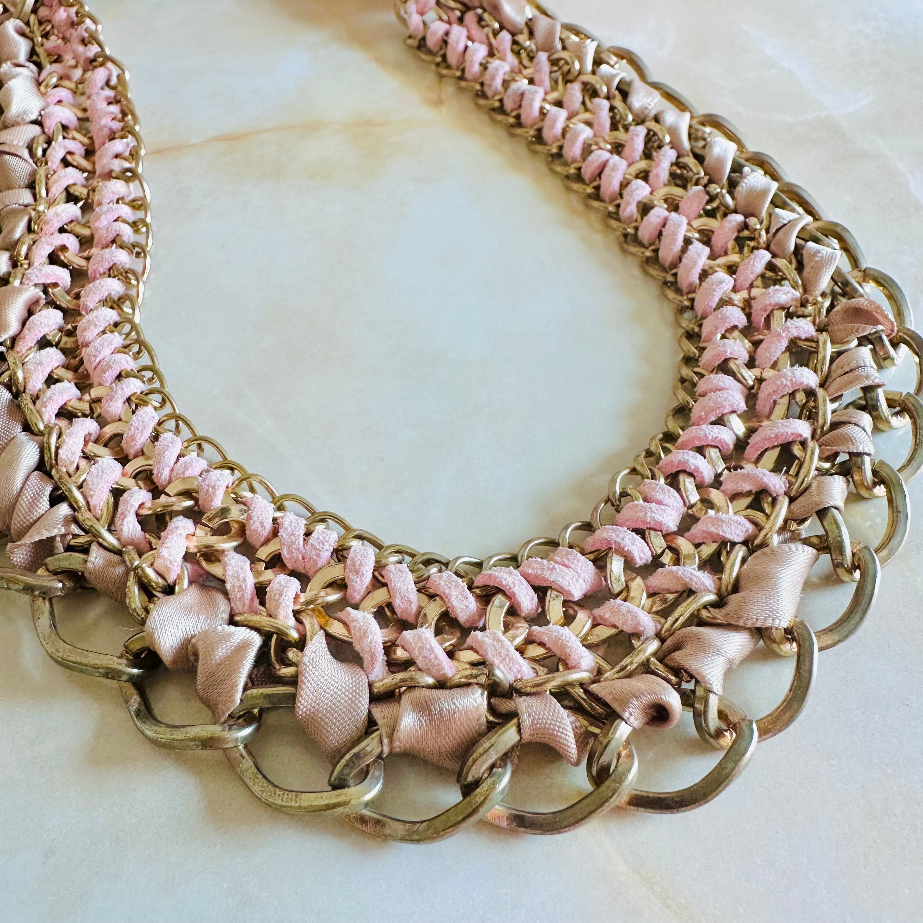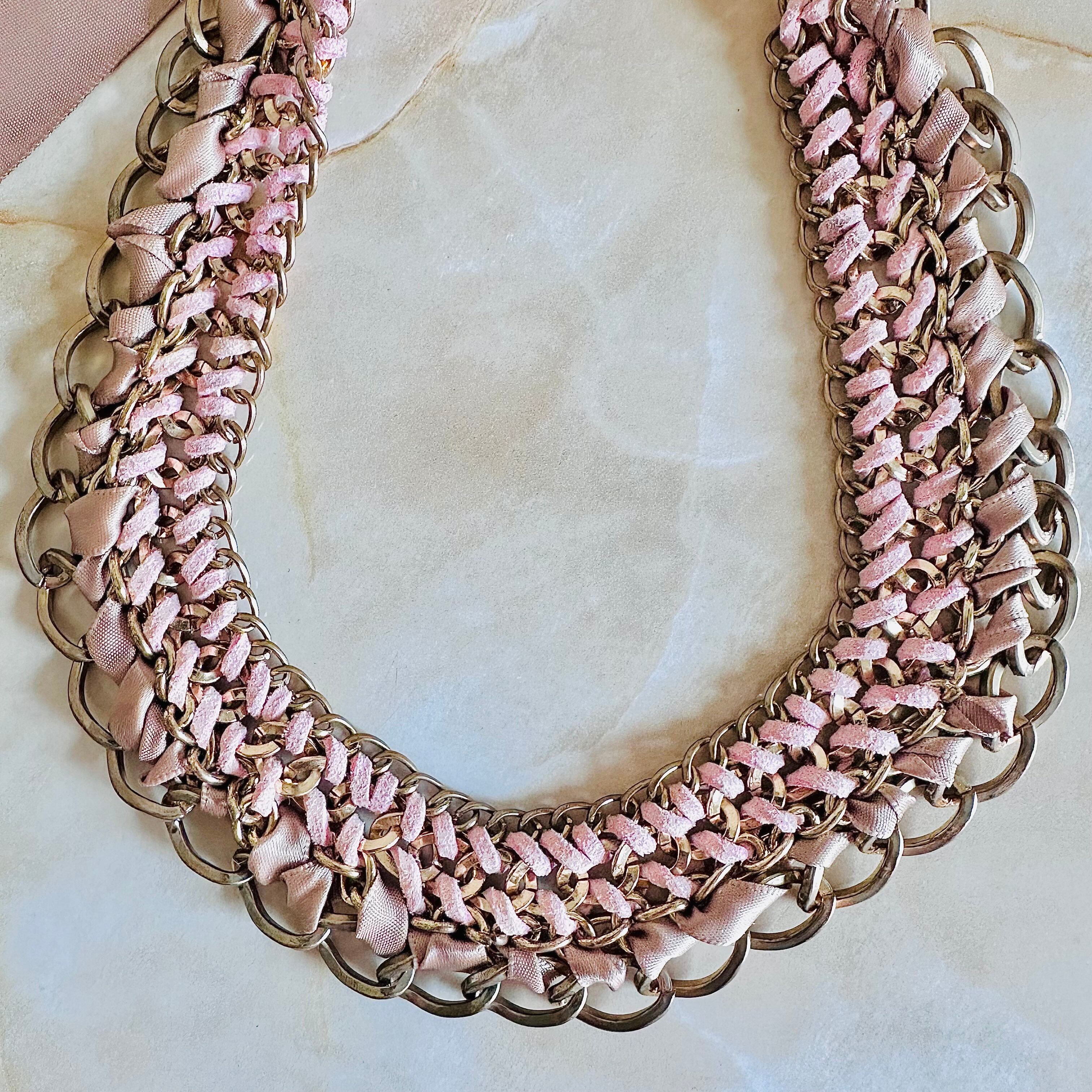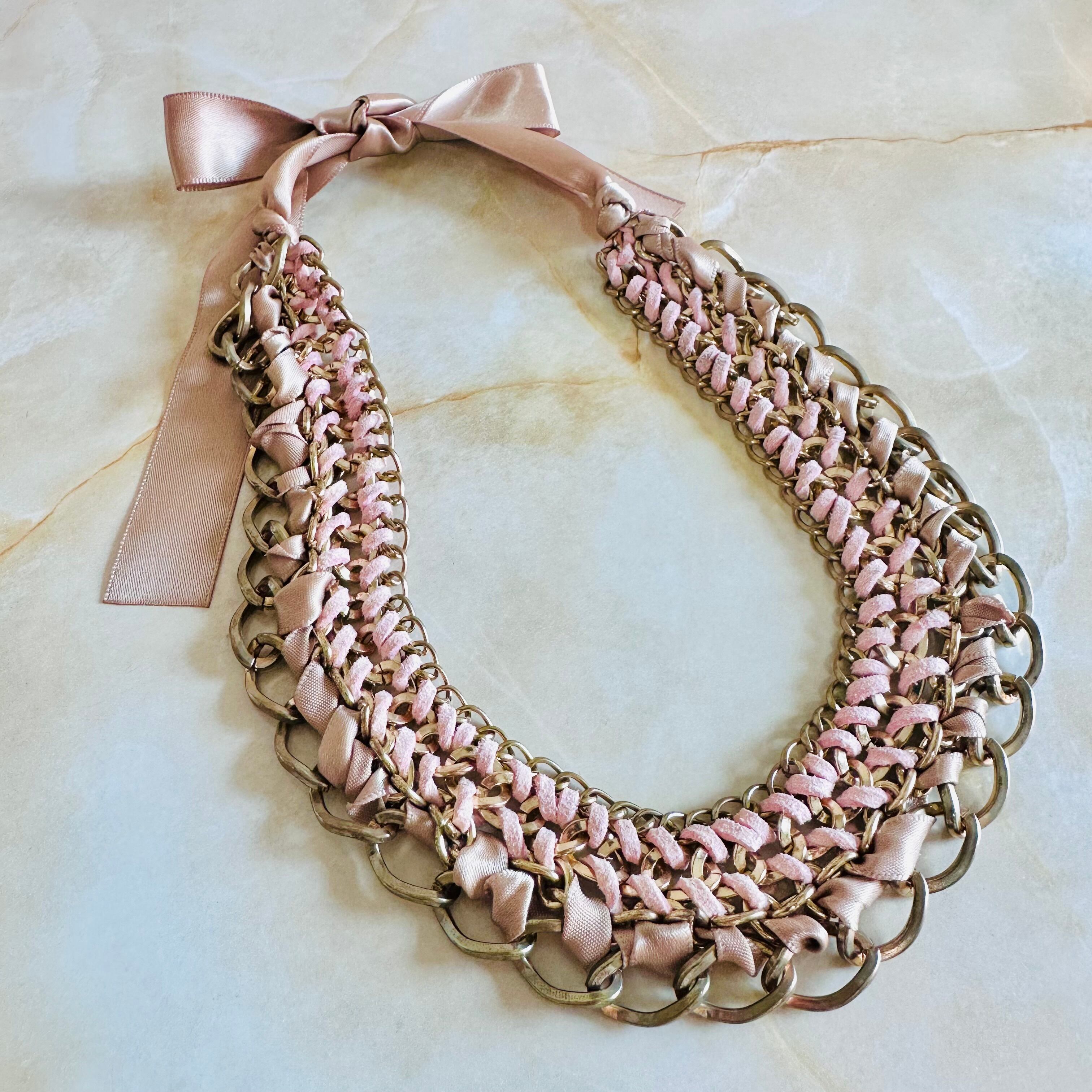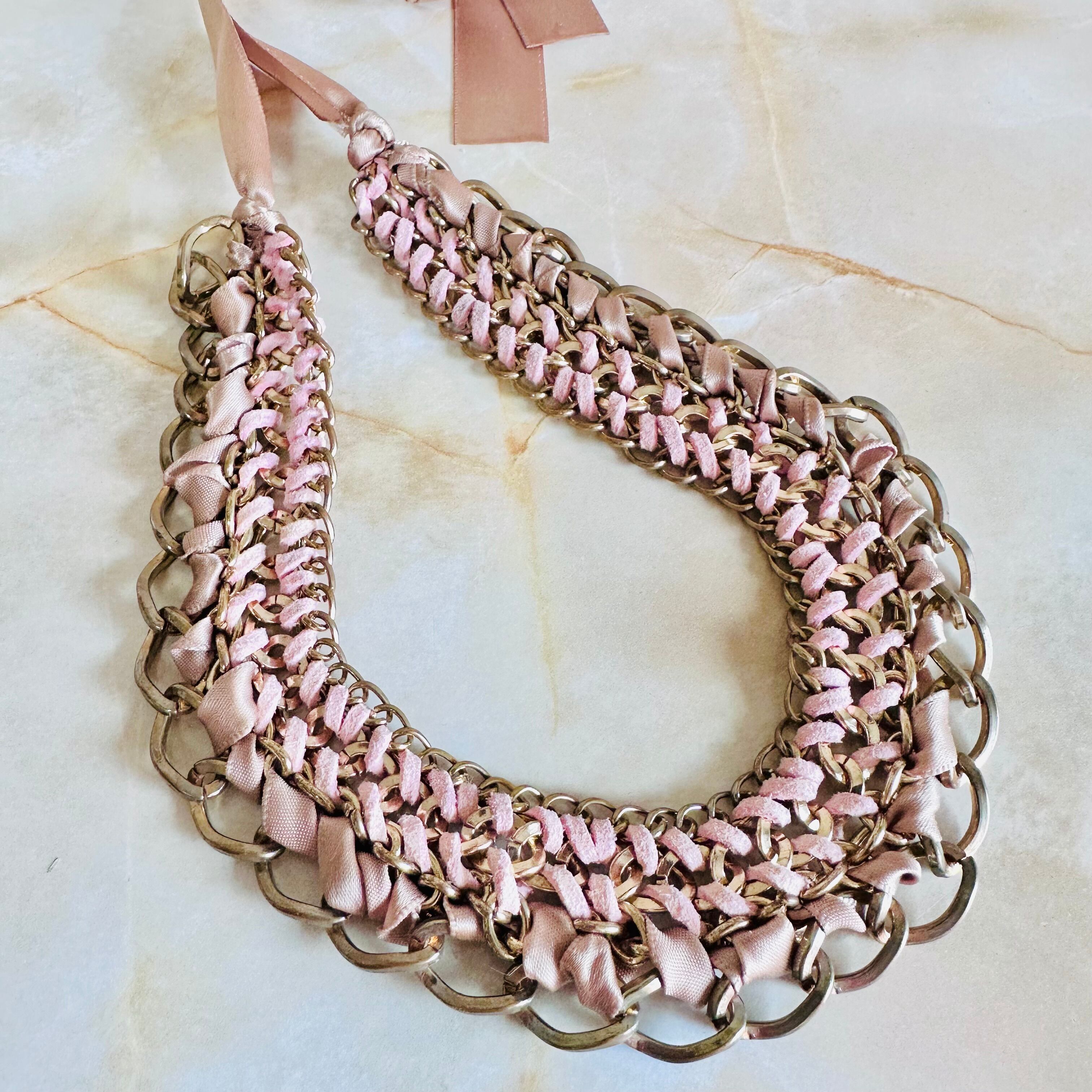 チェーンにグラグランテープと優しいピンクカラーのスウェード革紐を編み上げ、リボンで結ぶデザインに仕上げました。