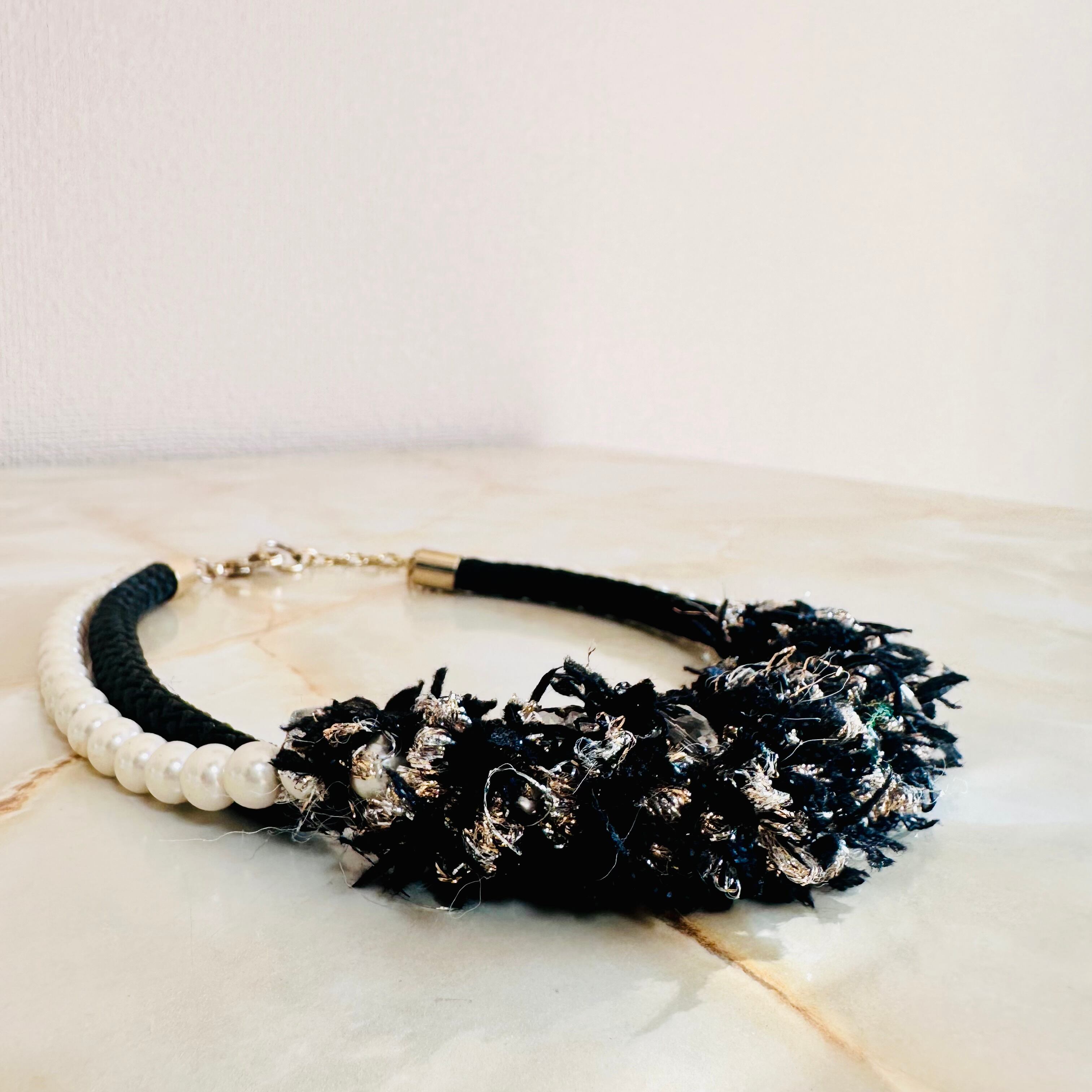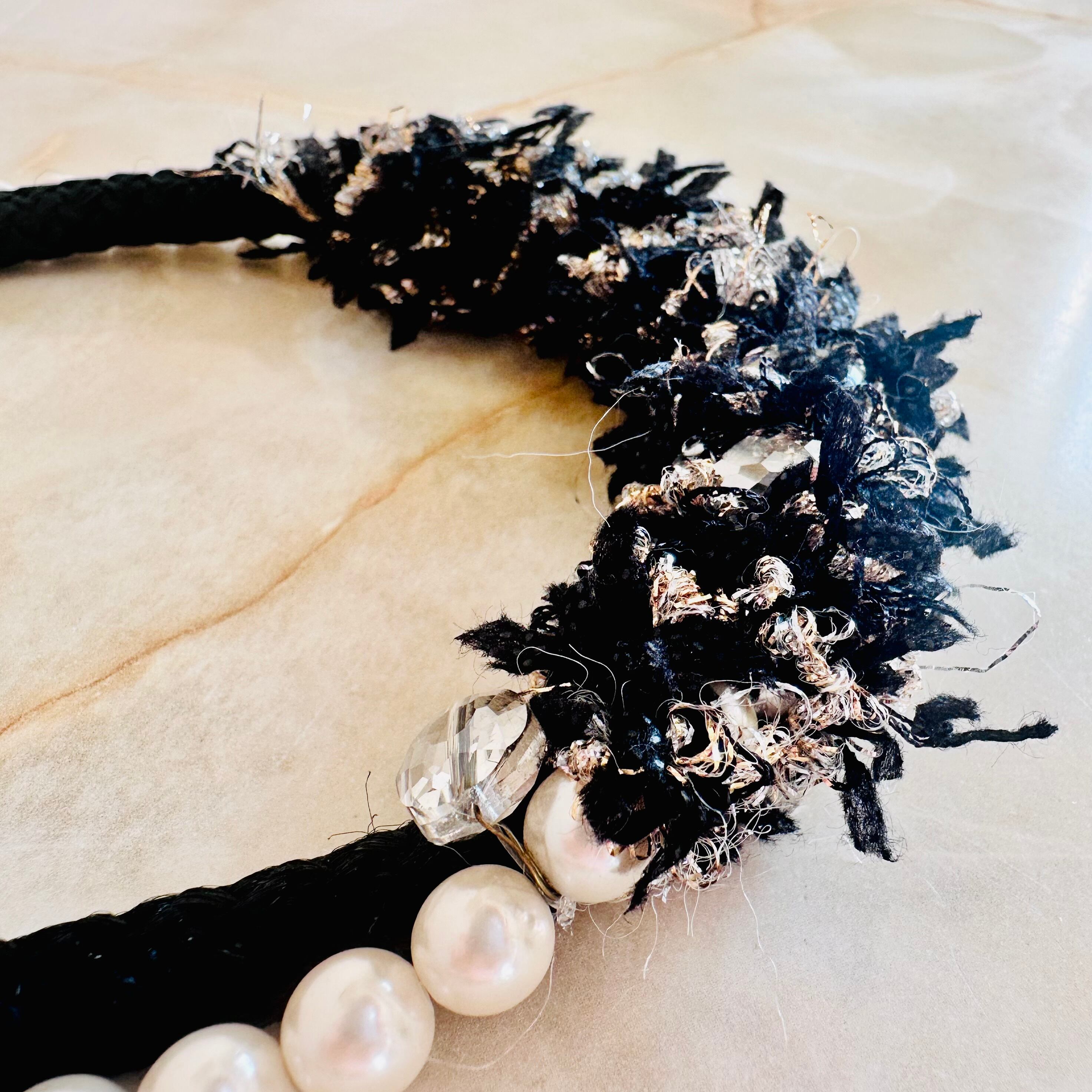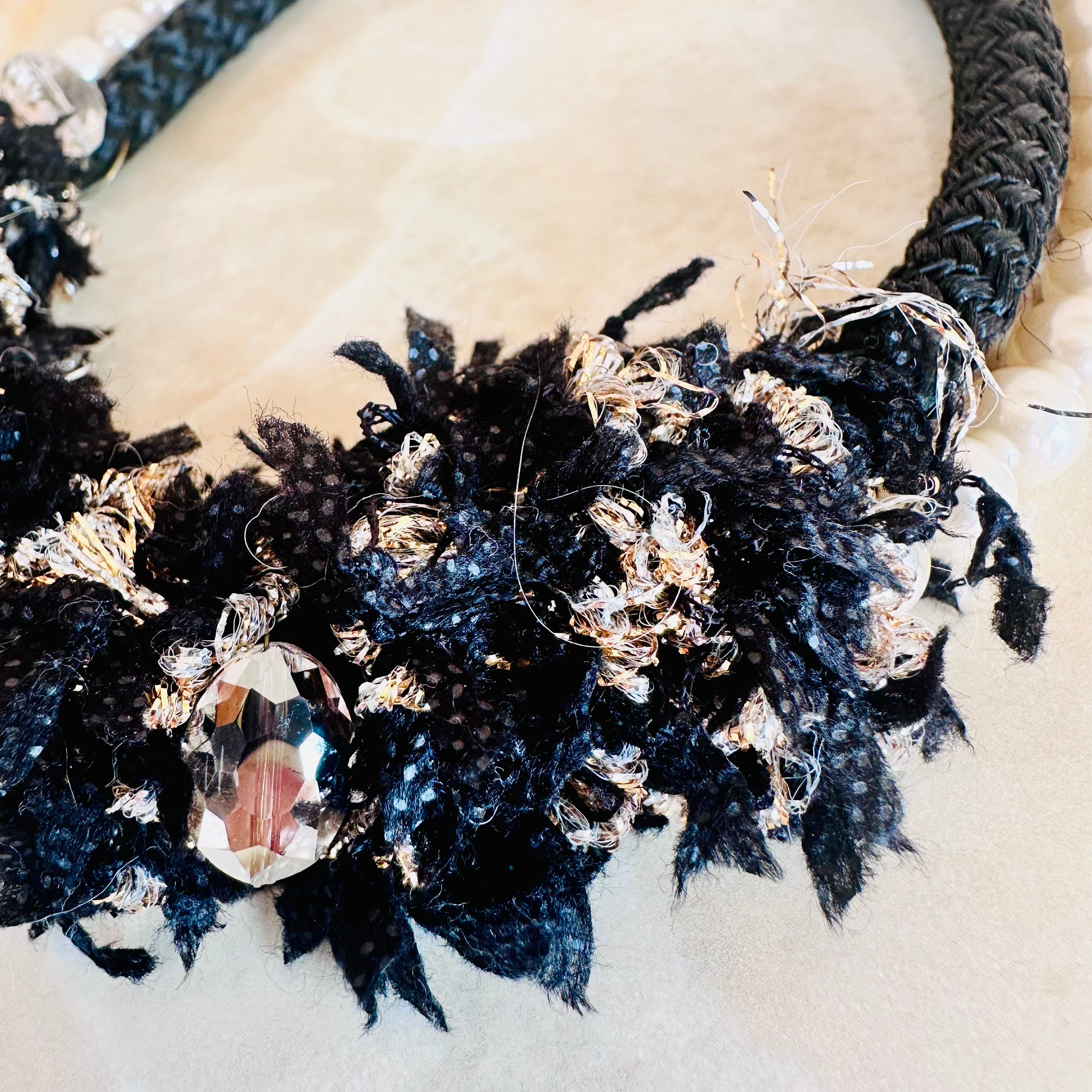 ツィードの風合いのあるコードを巻き、クリアカラーのラインストーンを散りばめたユニークな作りが目を惹くデザインです。