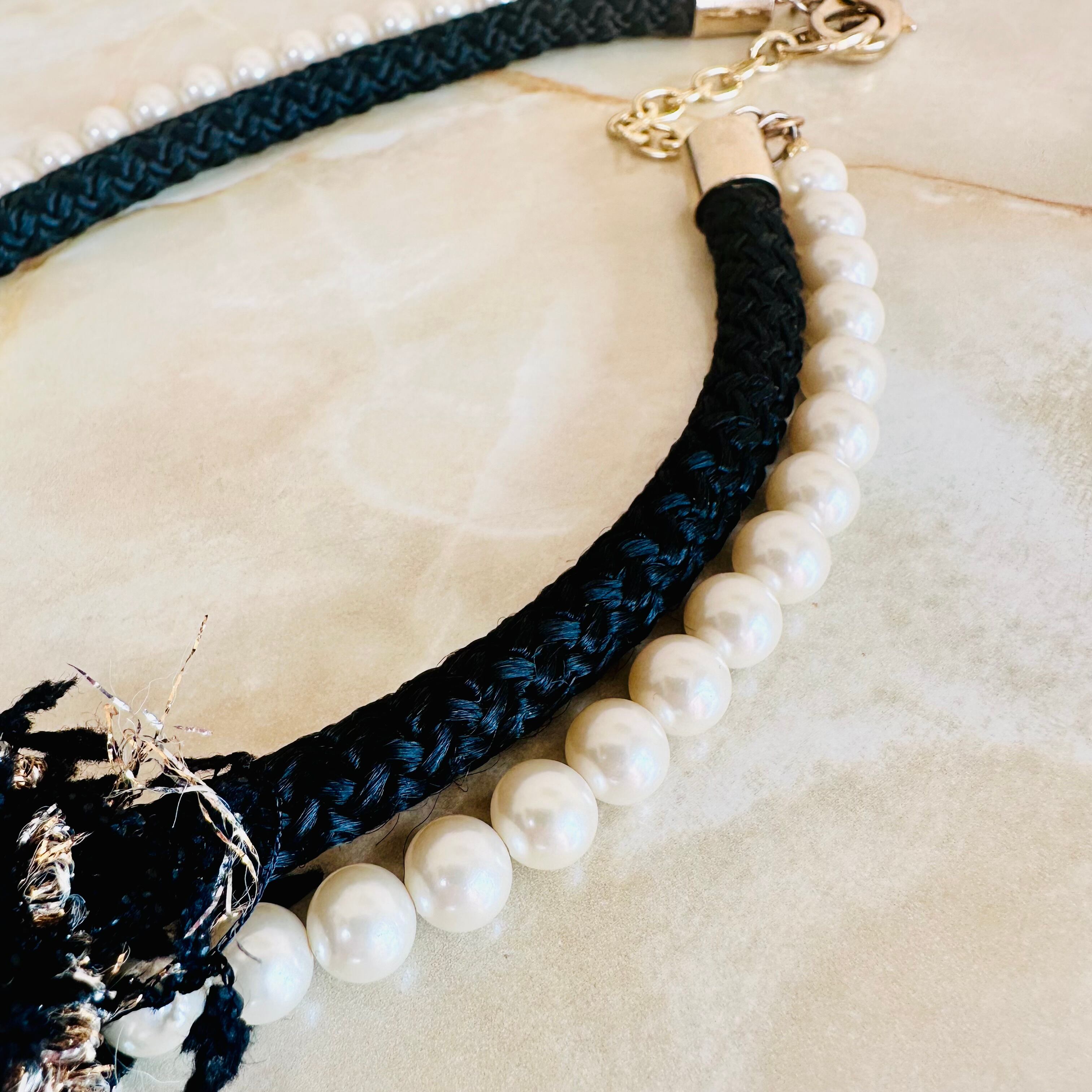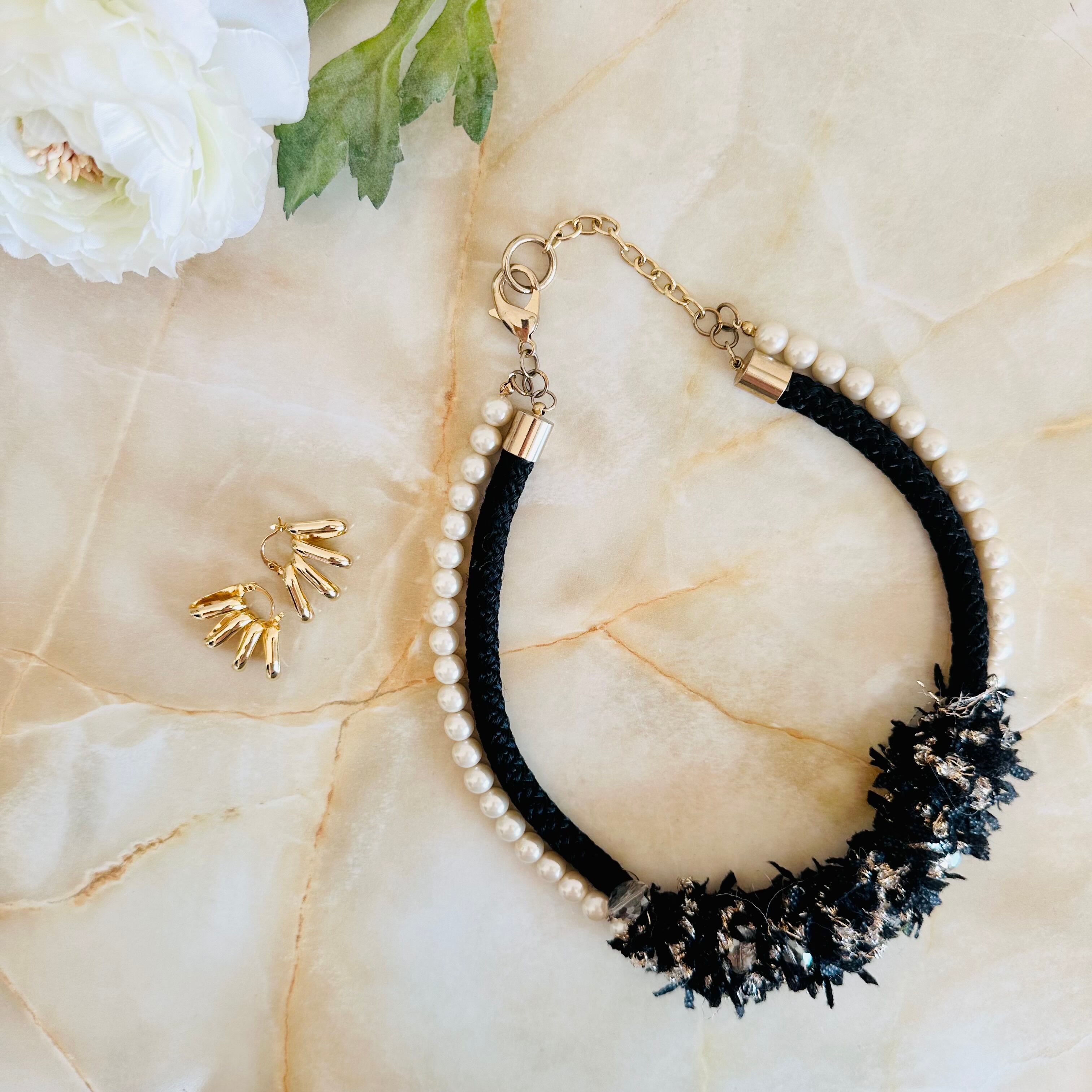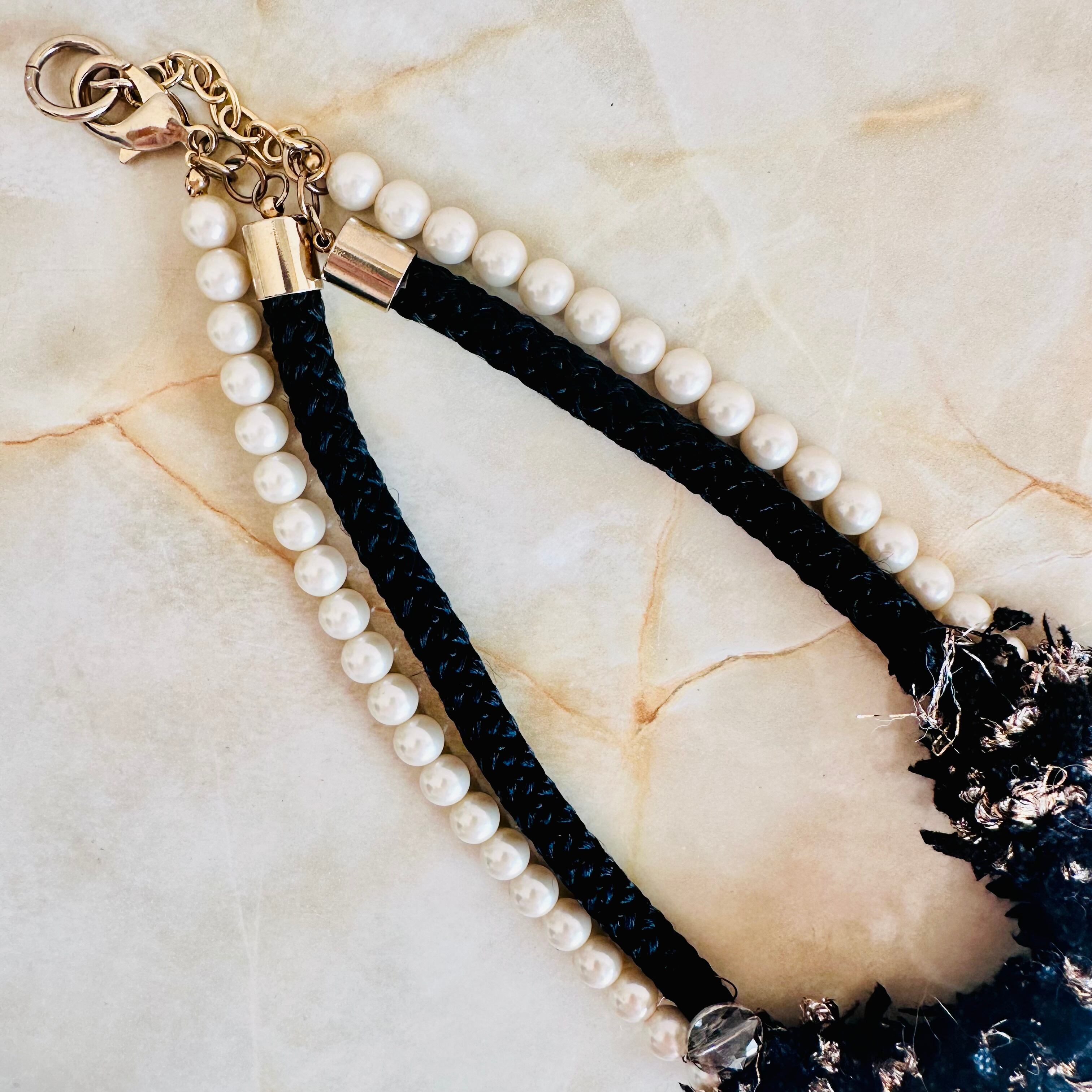 ツィードの風合いのあるコードを巻き、クリアカラーのラインストーンを散りばめたユニークな作りが目を惹くデザインです。