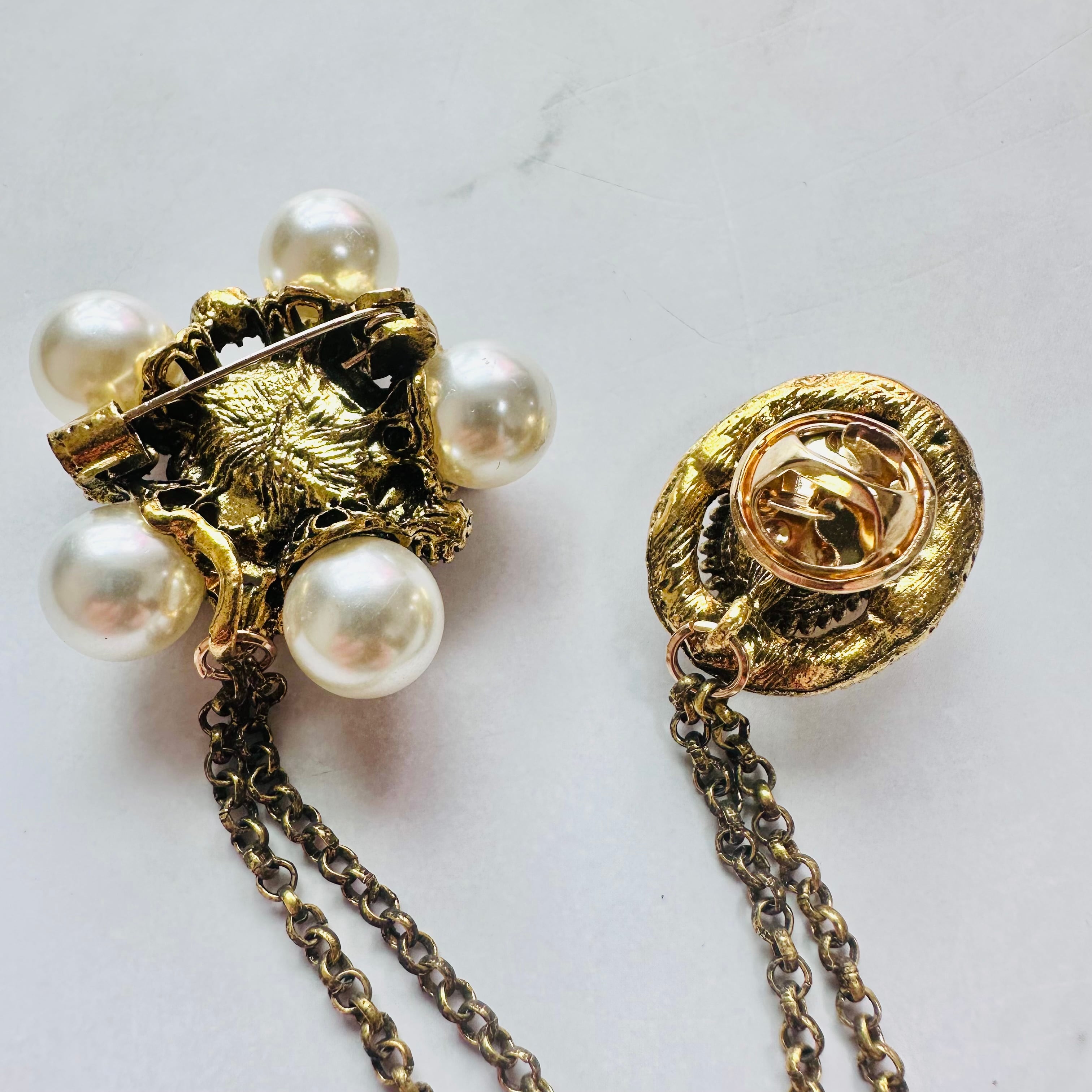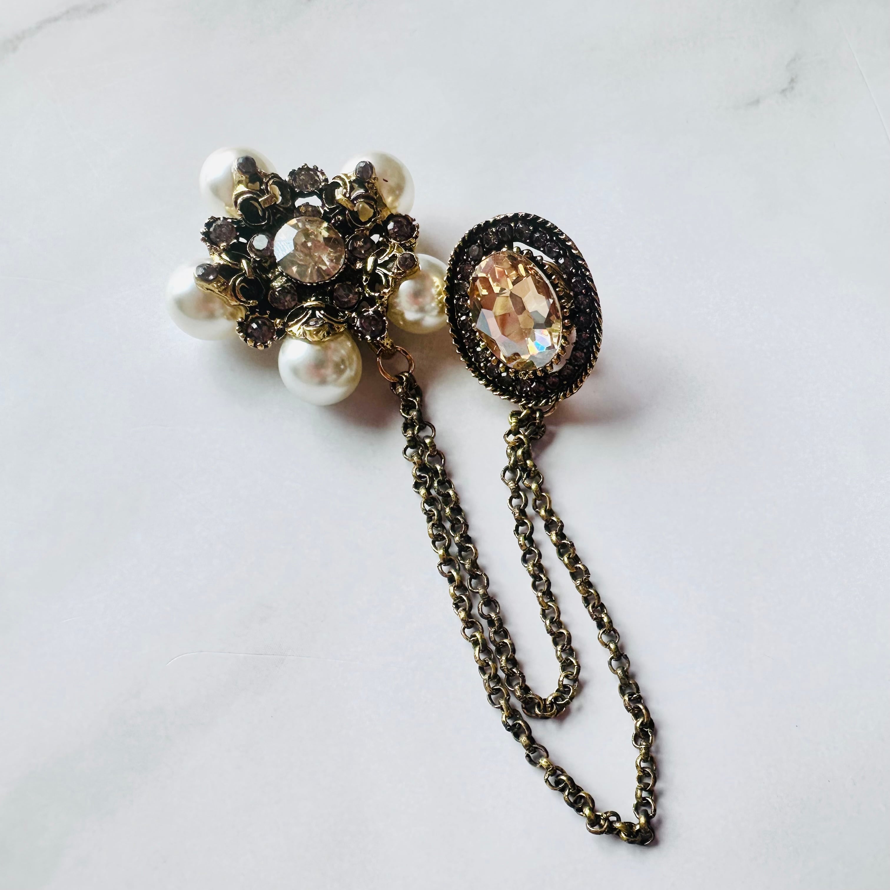 パールにグレー、クリアのラインストーンを使用したフラワーデザインと、ベージュのラインストーンをはめ込んだデザインをチェーンで繋げ、アンティークゴールドでレトロなデザインに仕上げています。