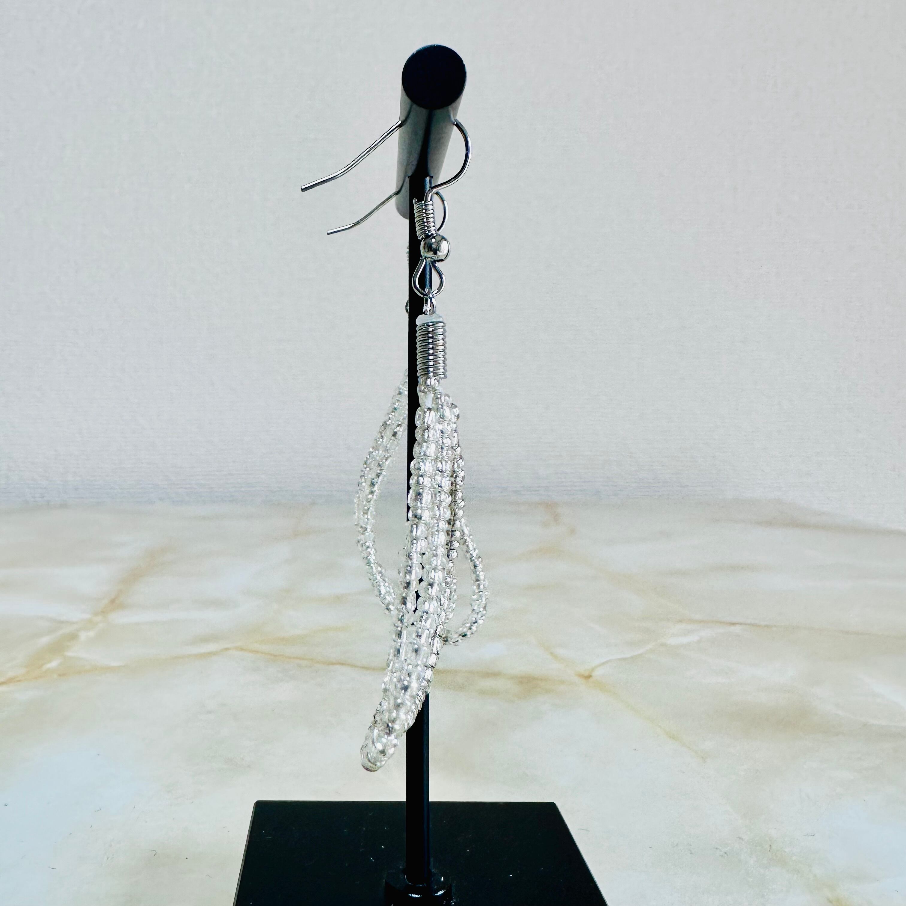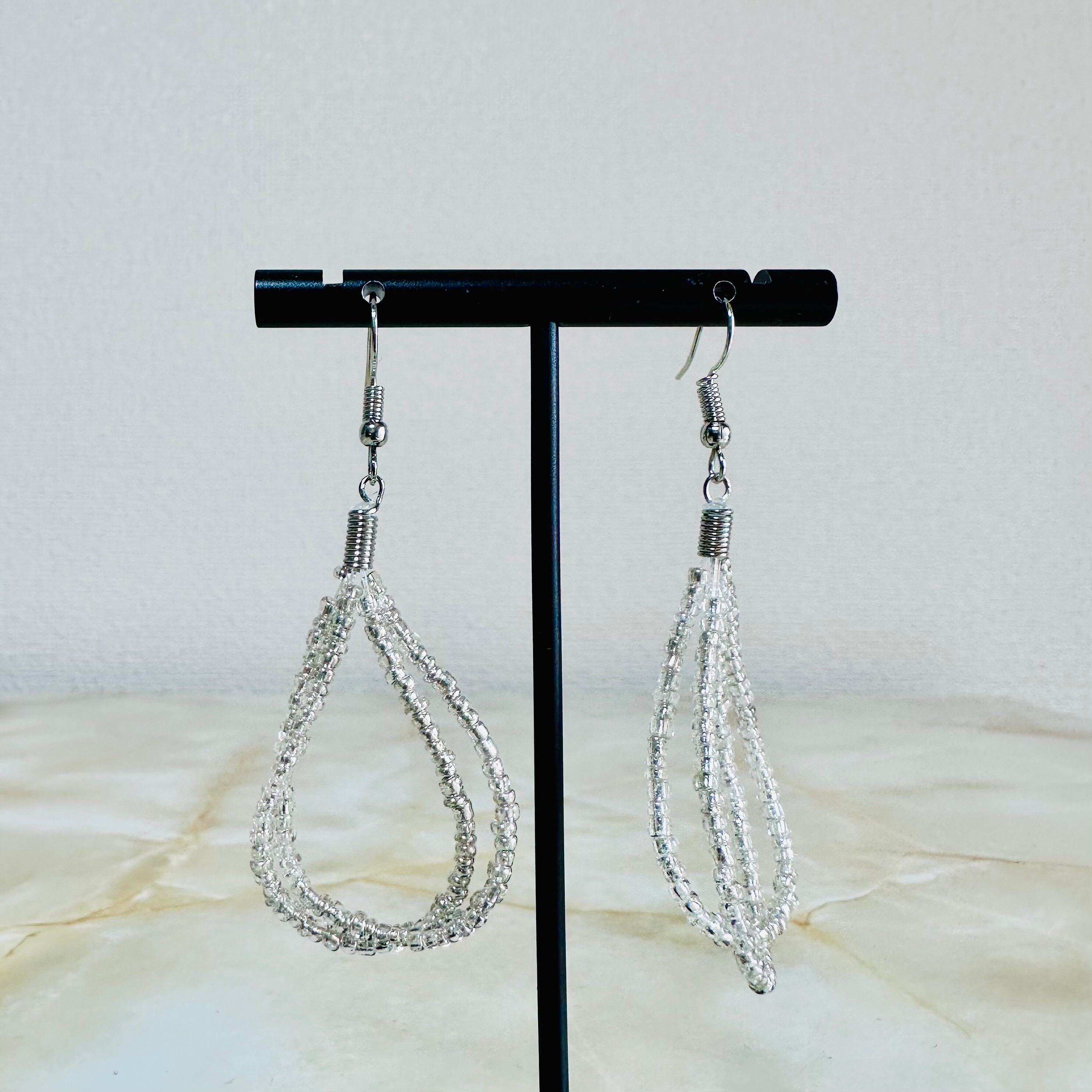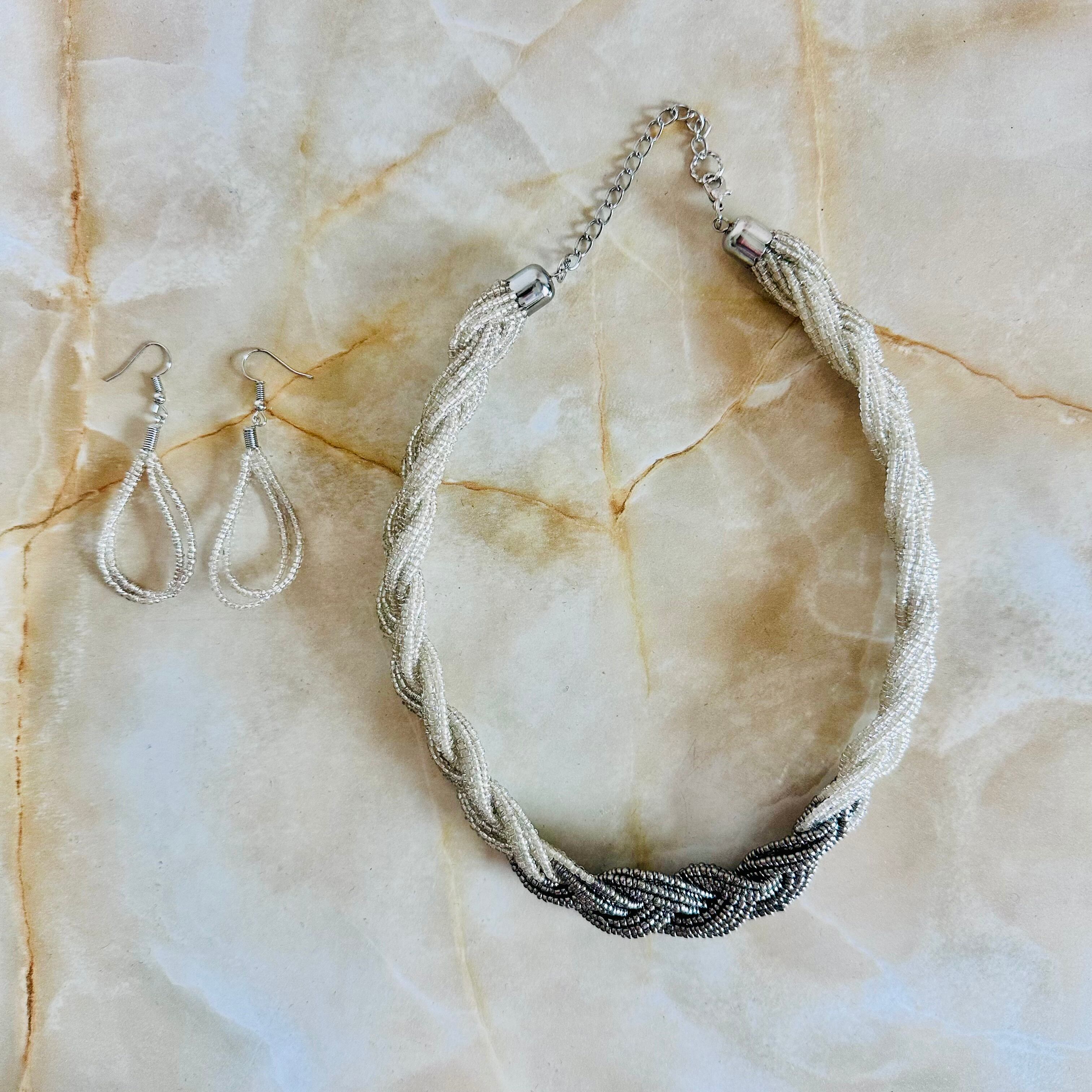 クリアシルバー、メタリックシルバーのネックレスとピアスのセットです。