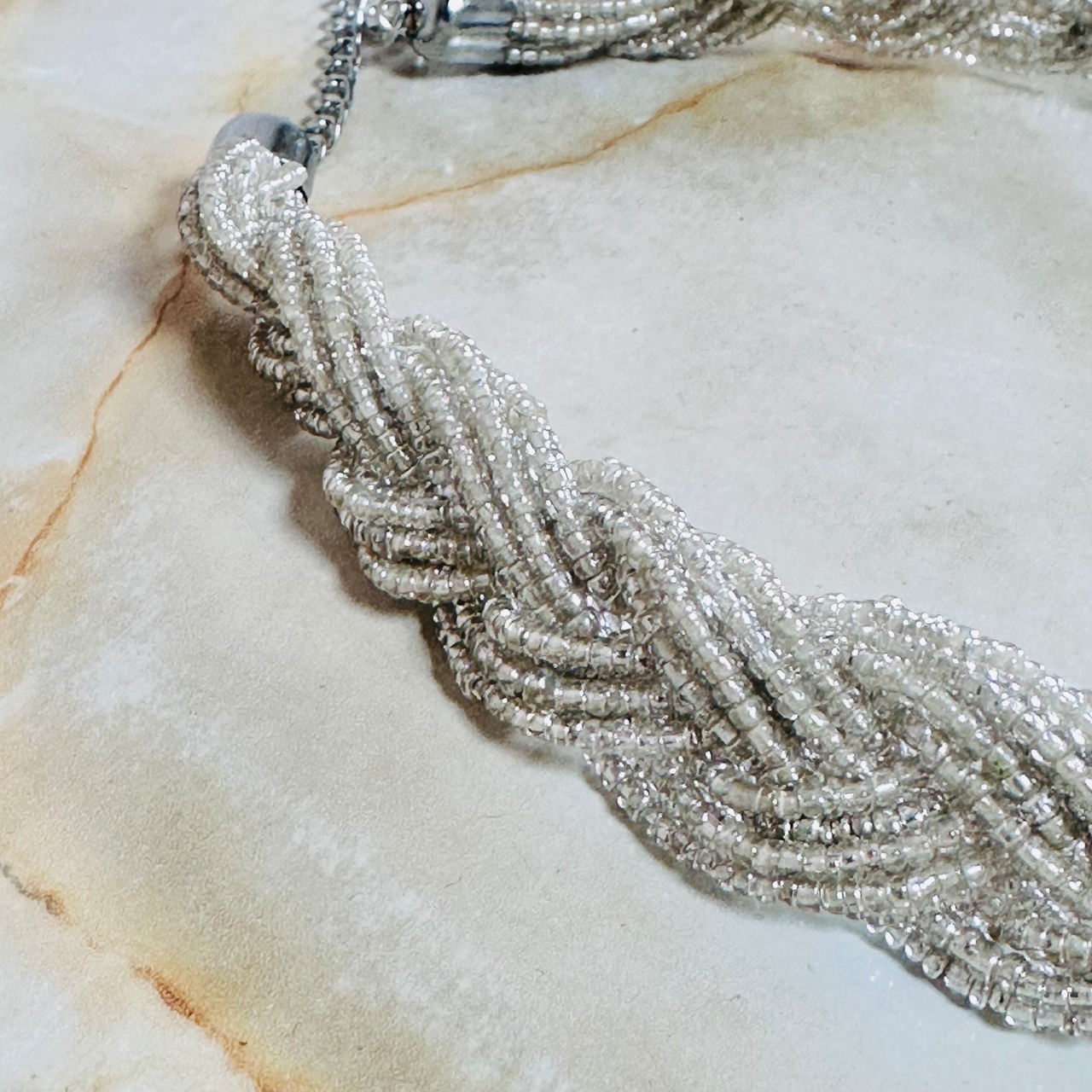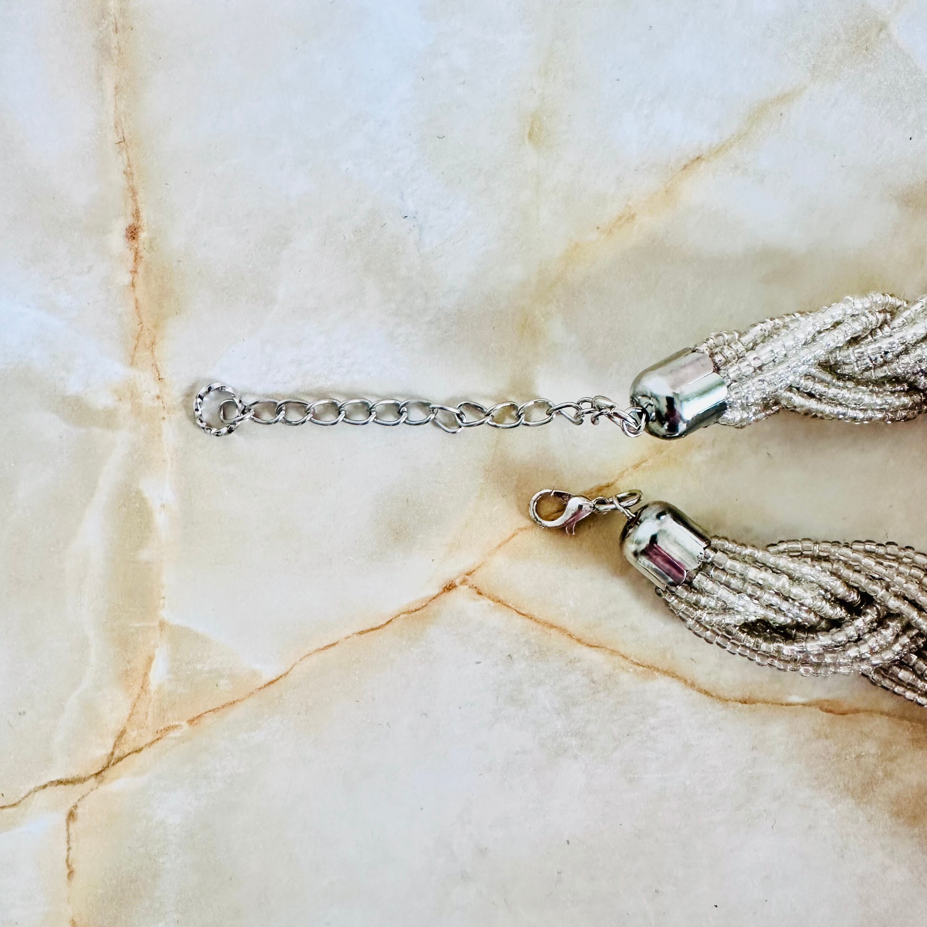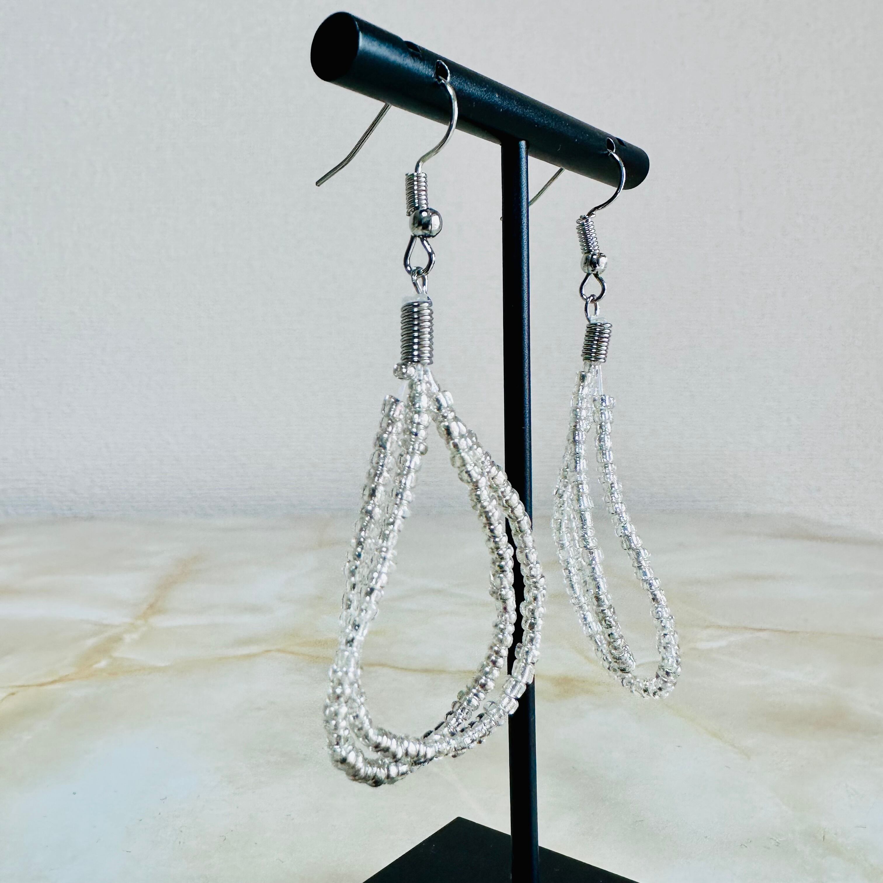 クリアシルバー、メタリックシルバーのネックレスとピアスのセットです。