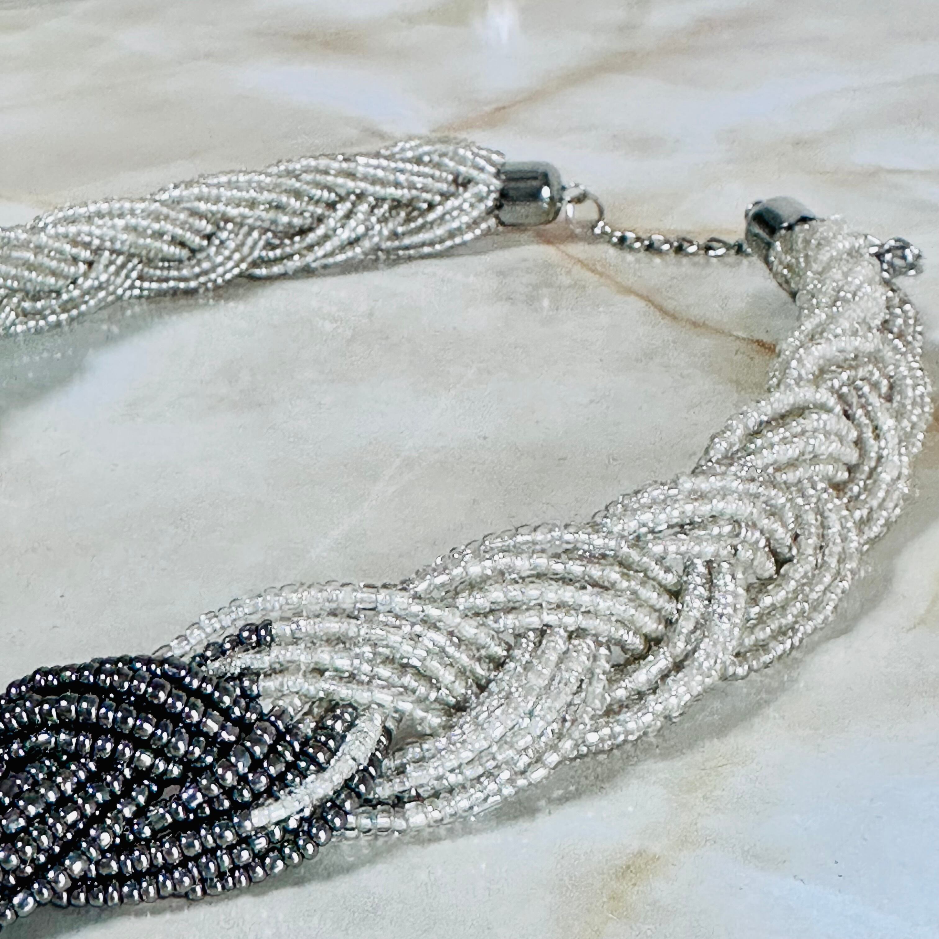 2色のビーズパーツをふんだんに使用し編み込んだデザインです。