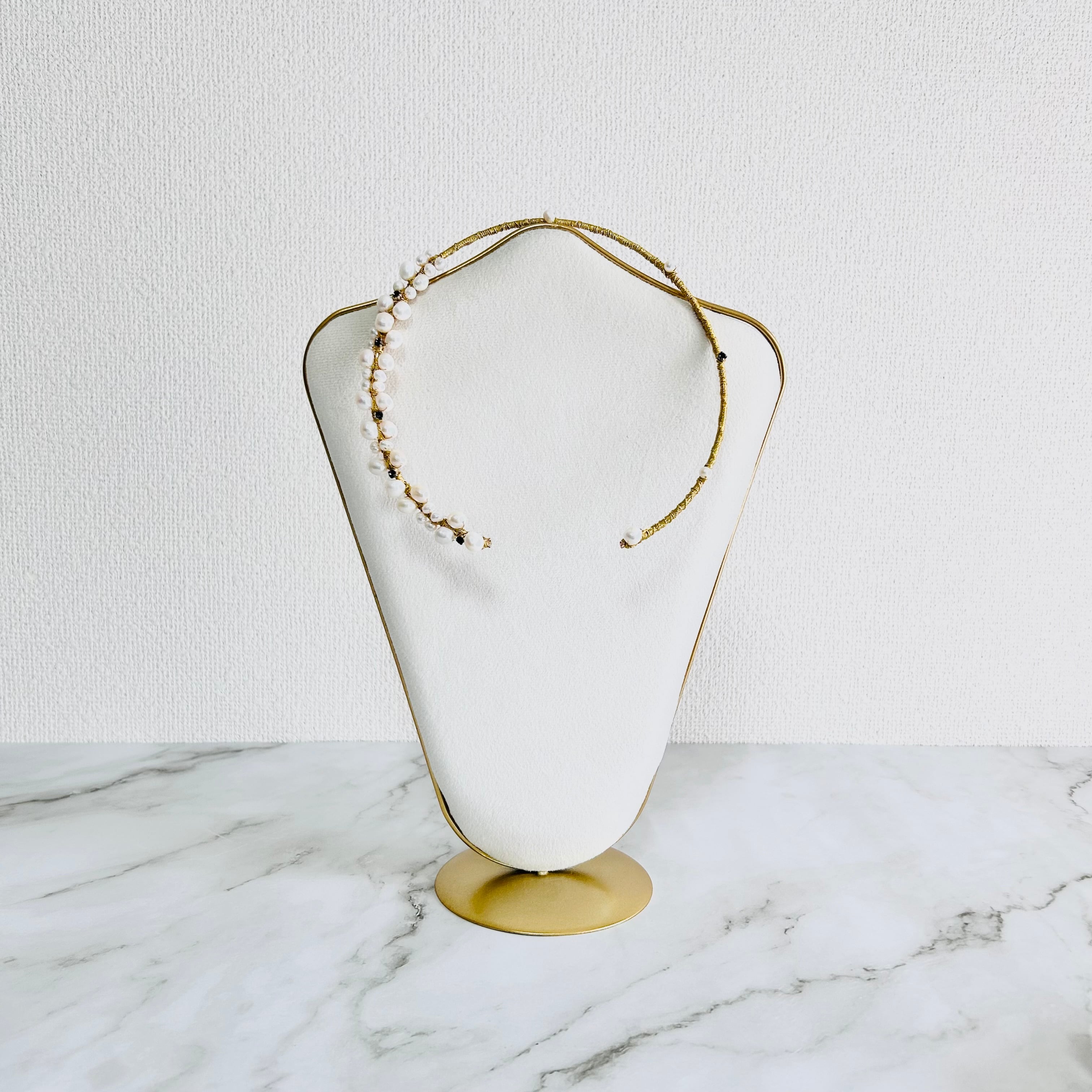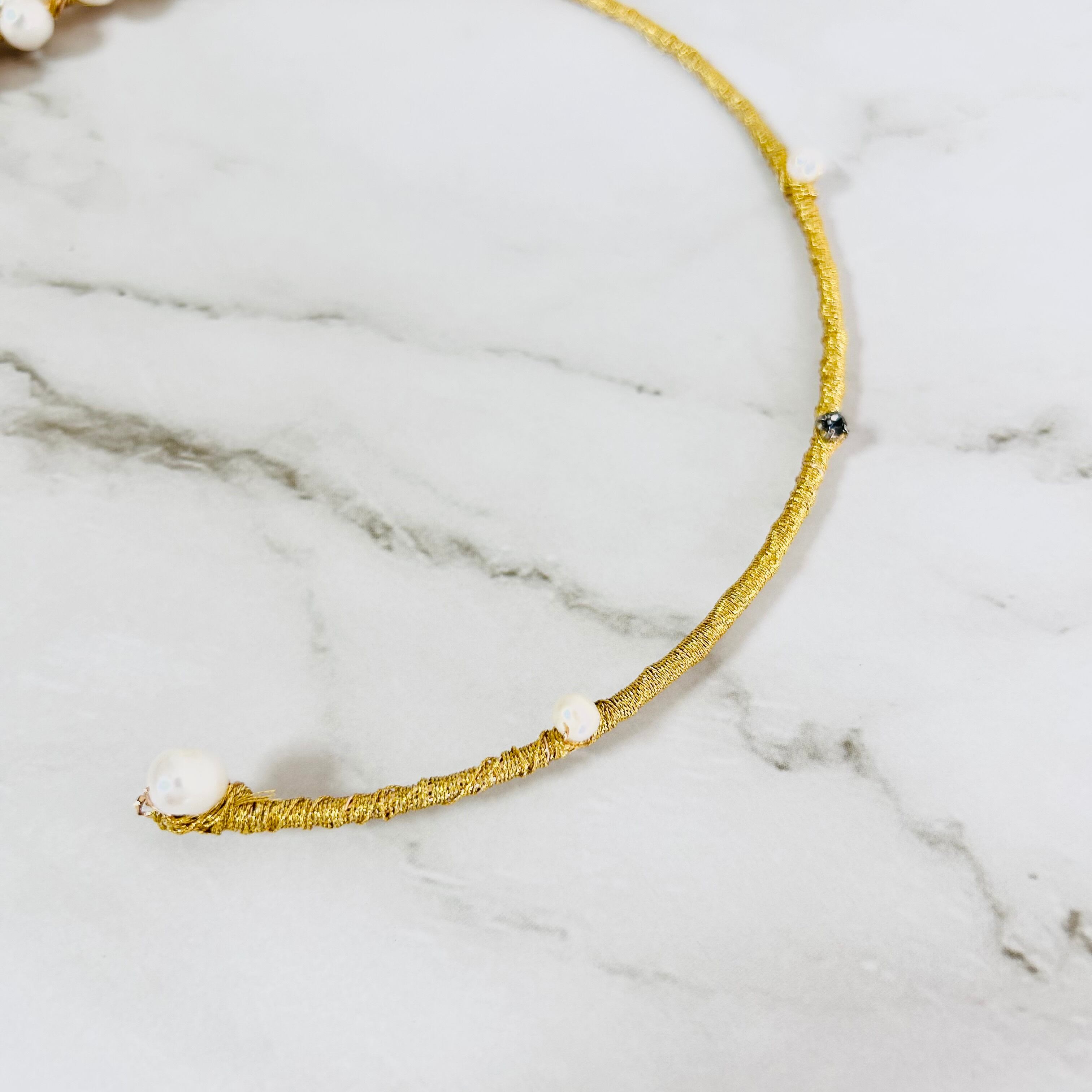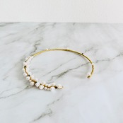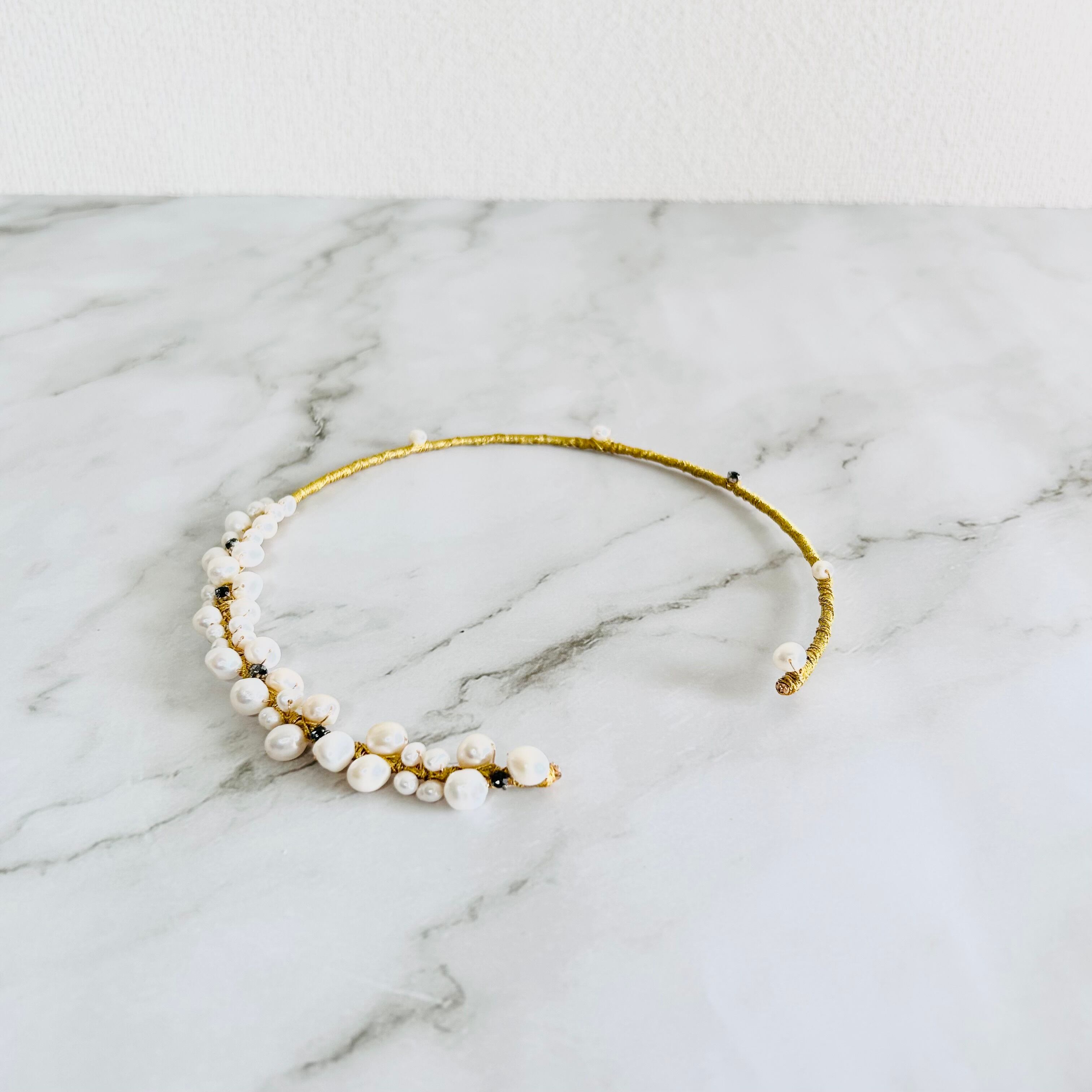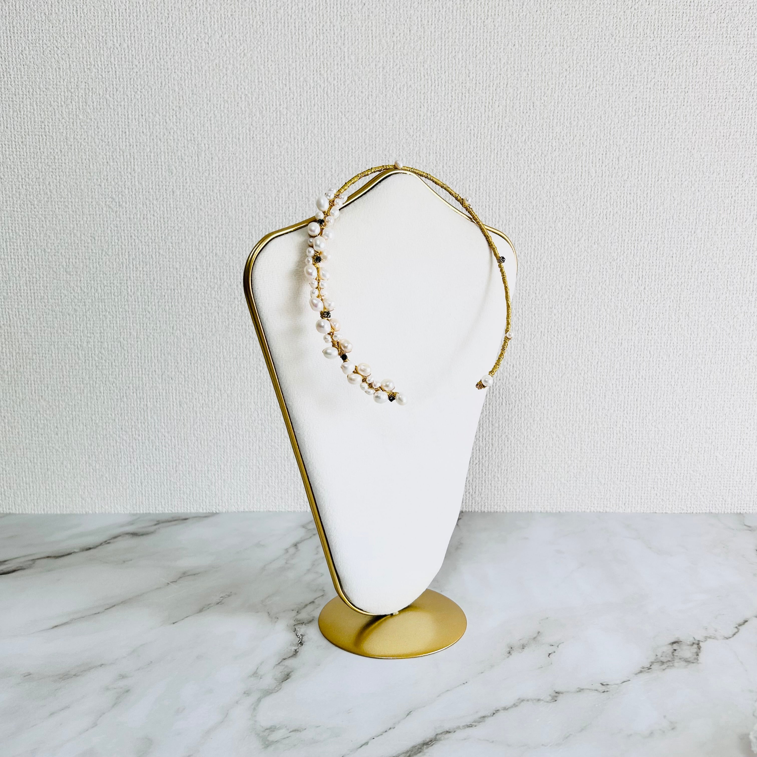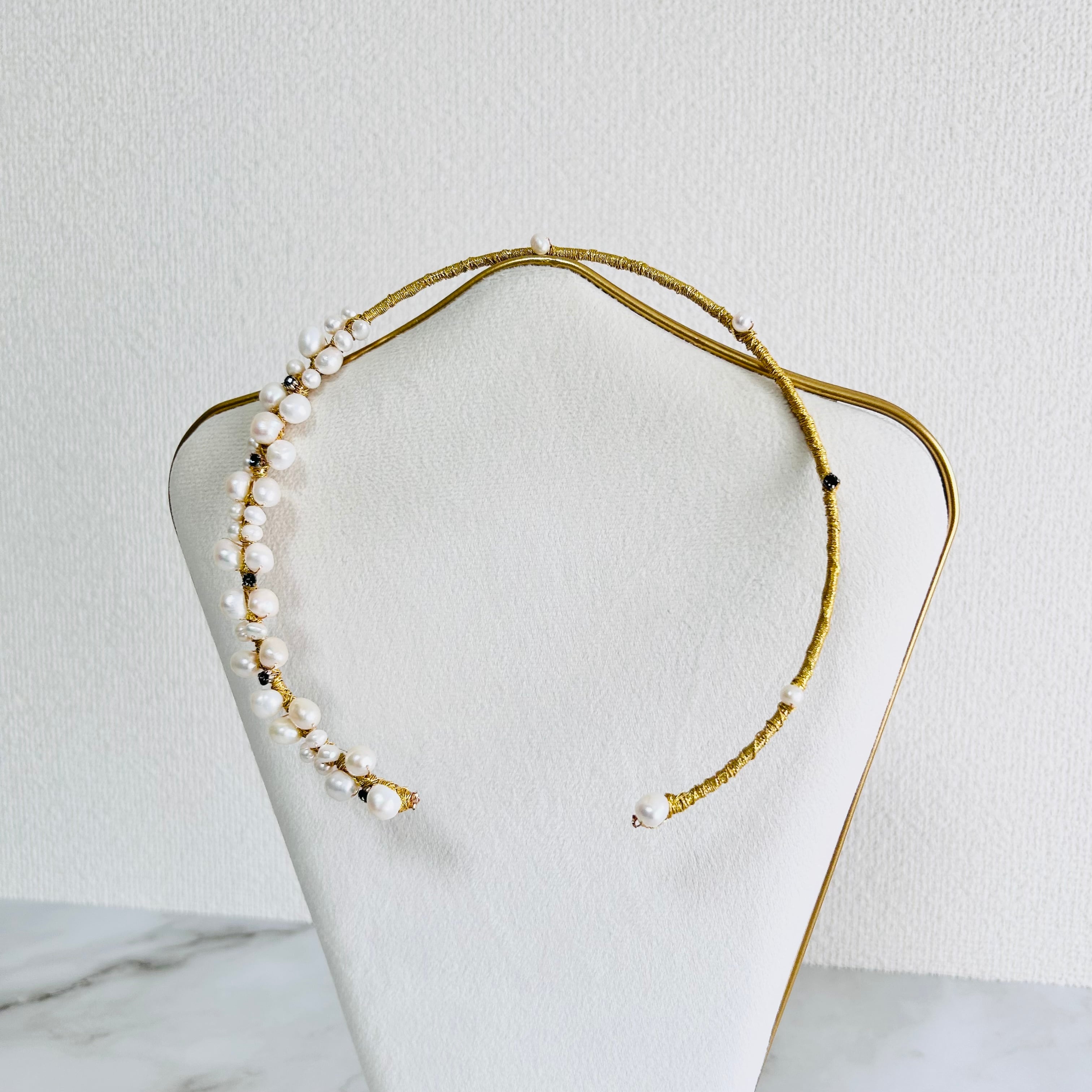 淡水パールとラインストーンを合わせてフープにゴールドのワイヤーを巻き付けフープタイプに仕上げたチョーカーデザインです。