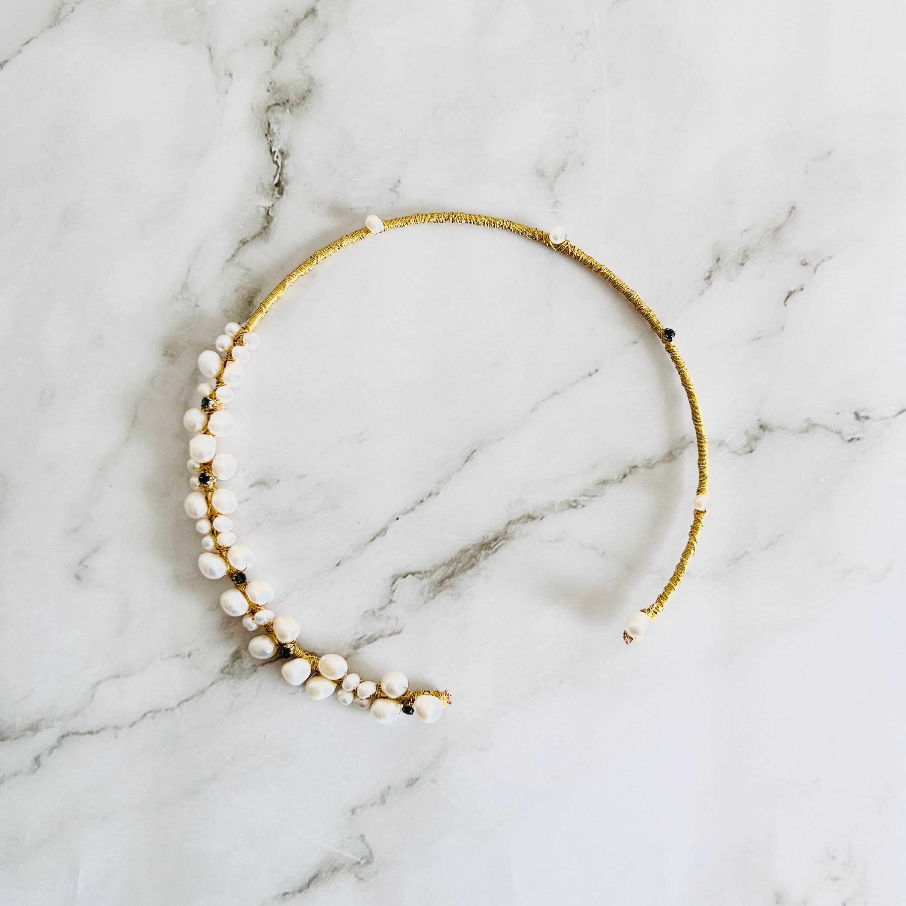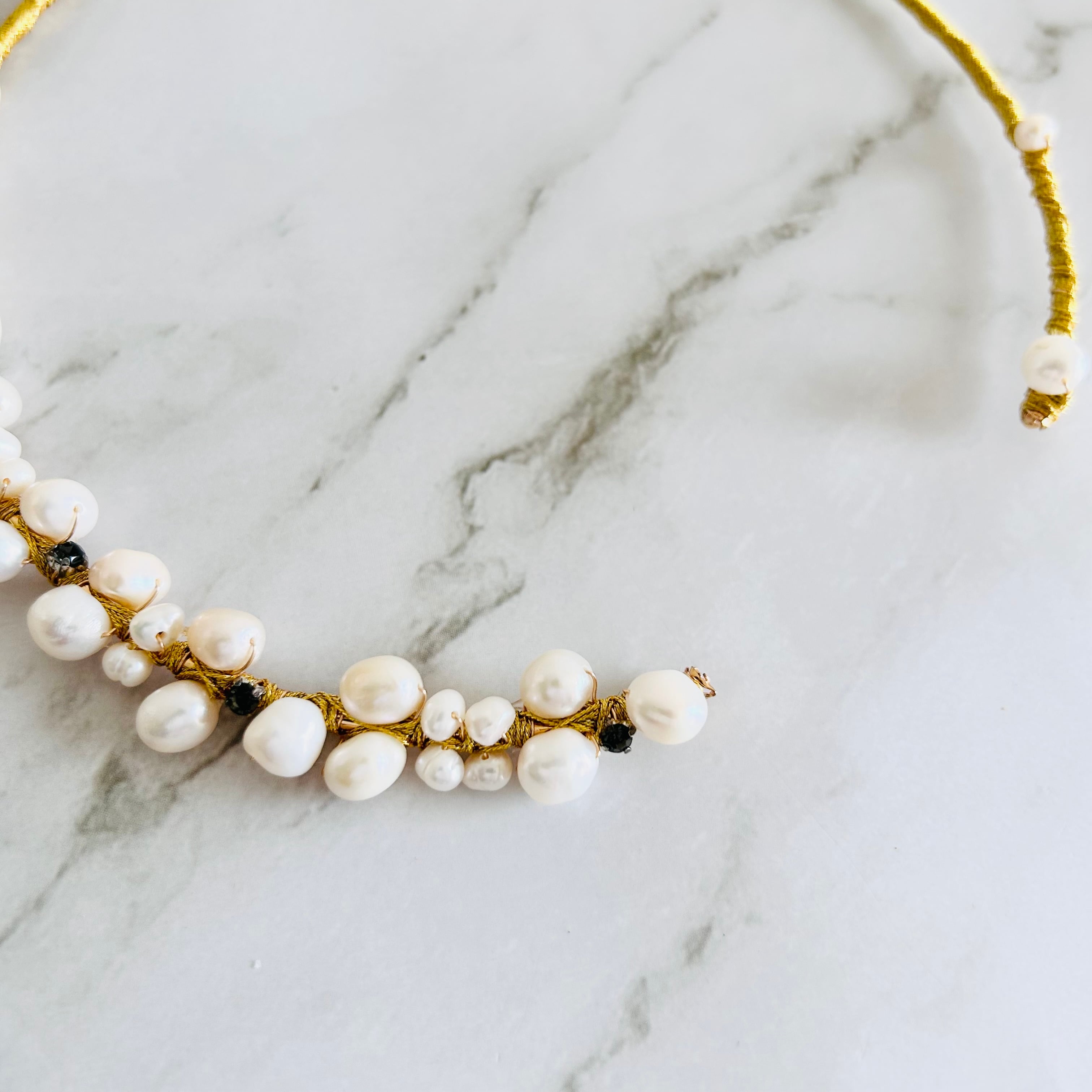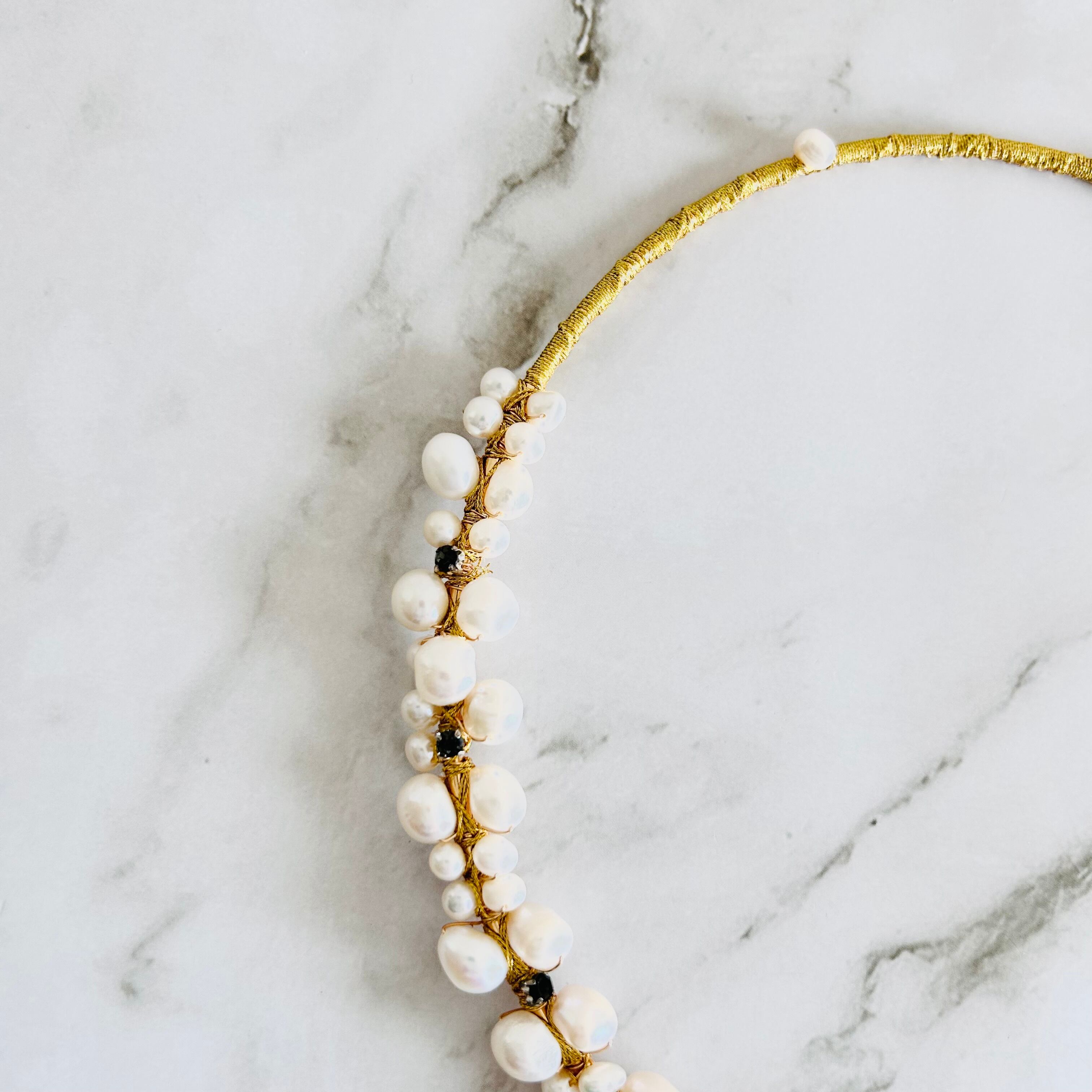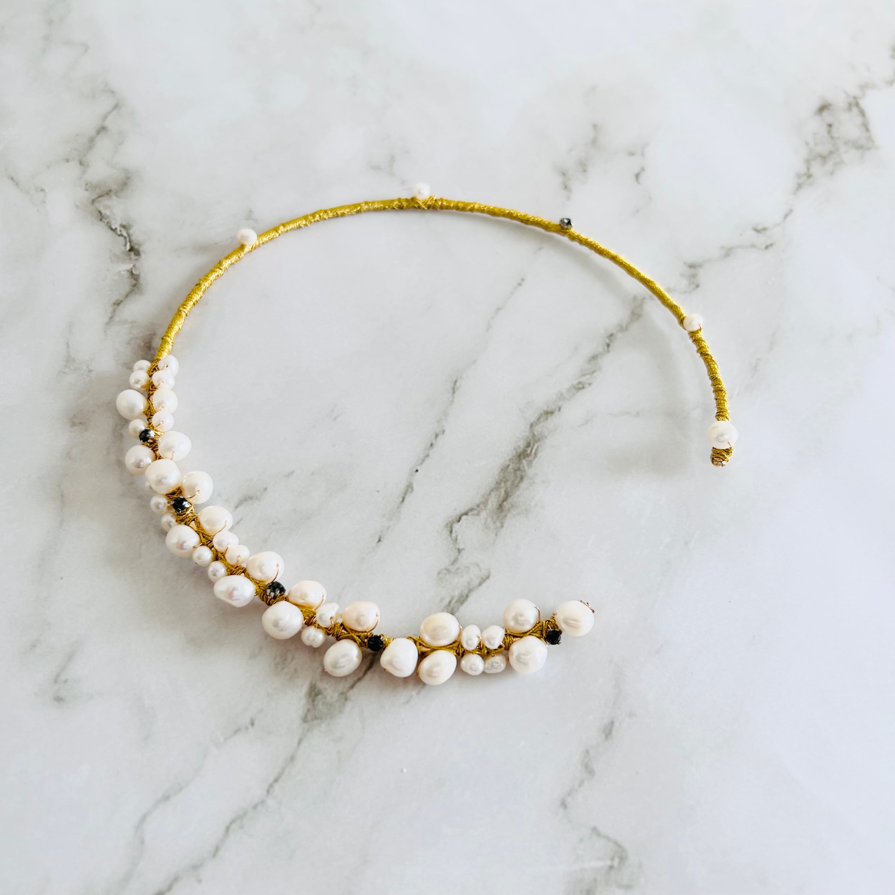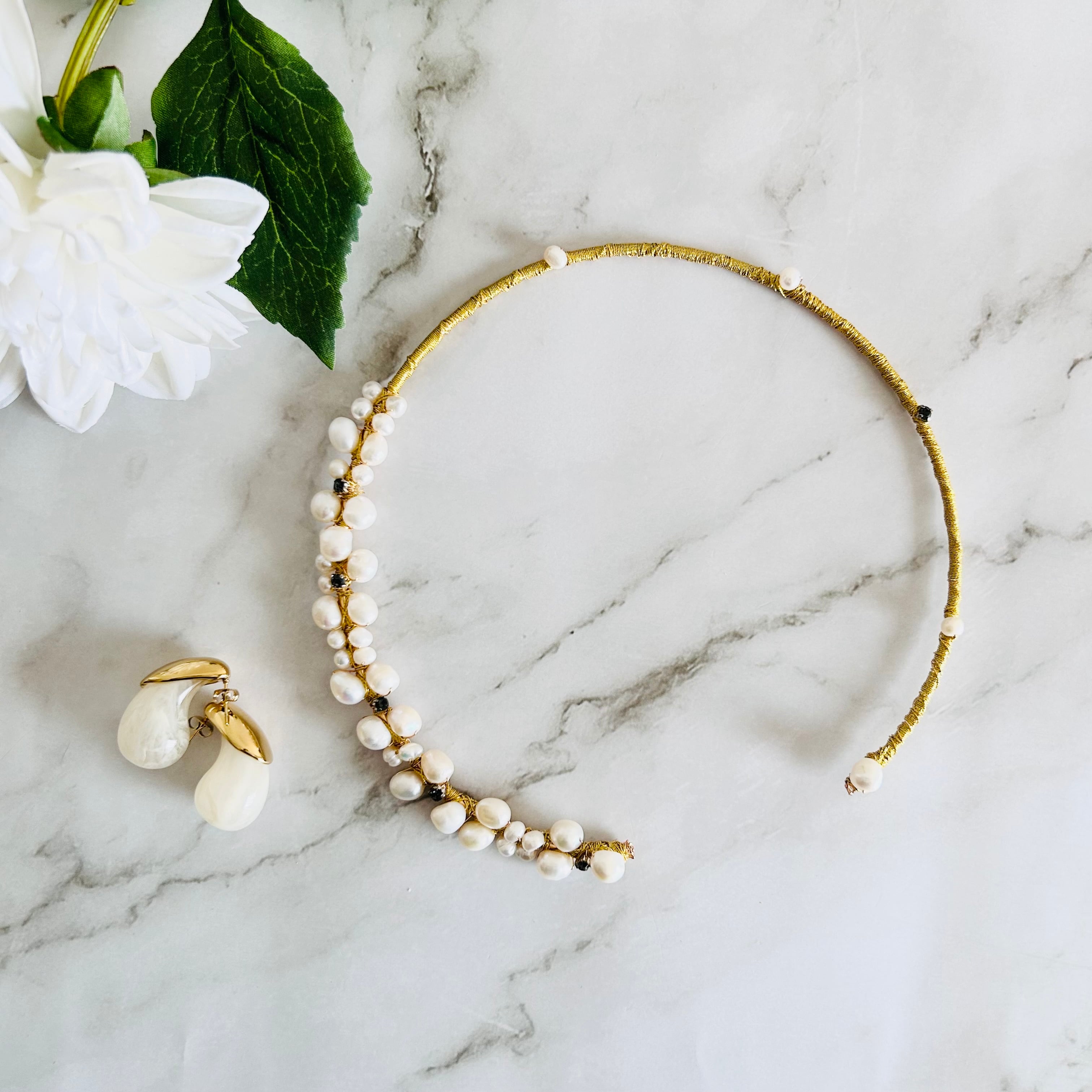 淡水パールとラインストーンを合わせてフープにゴールドのワイヤーを巻き付けフープタイプに仕上げたチョーカーデザインです。