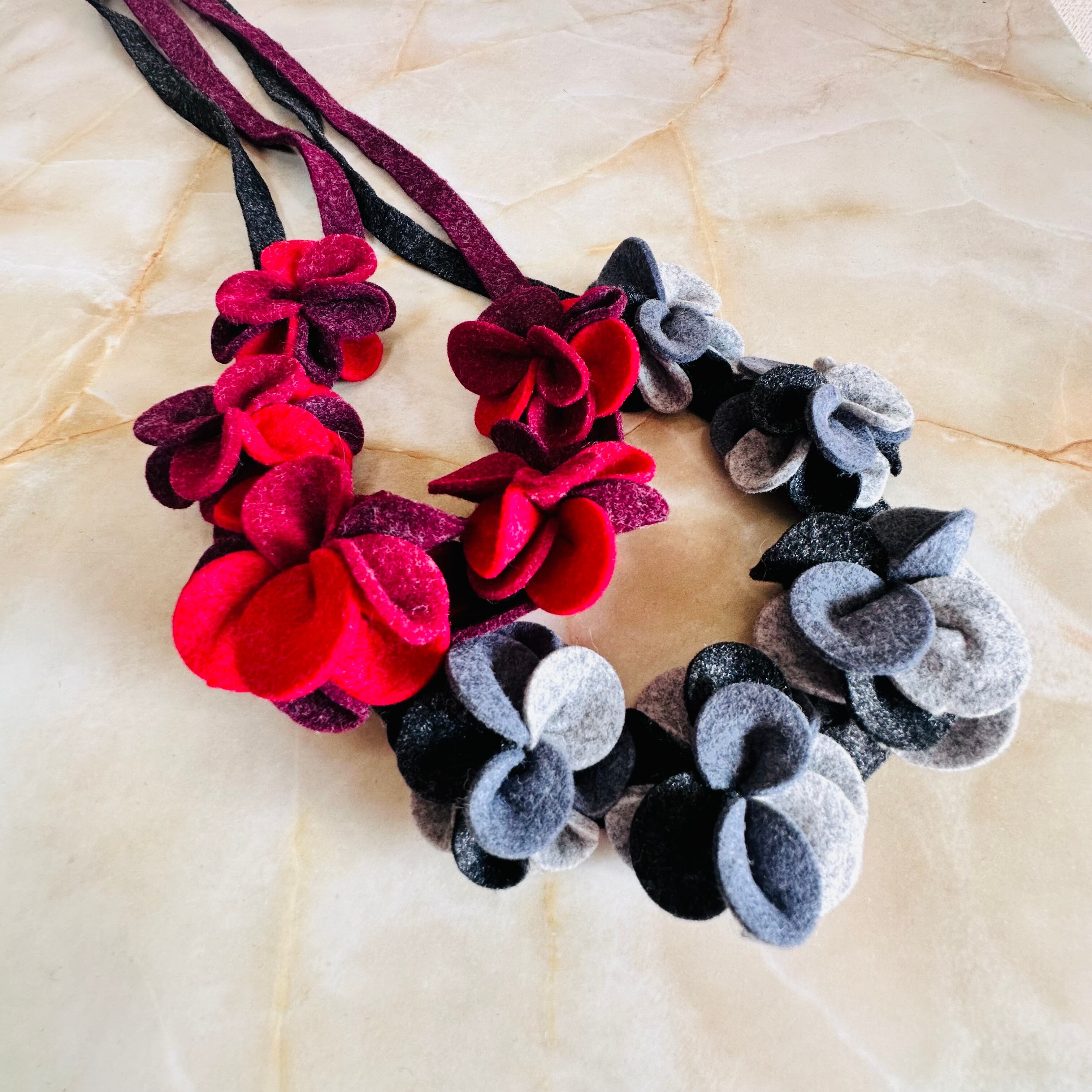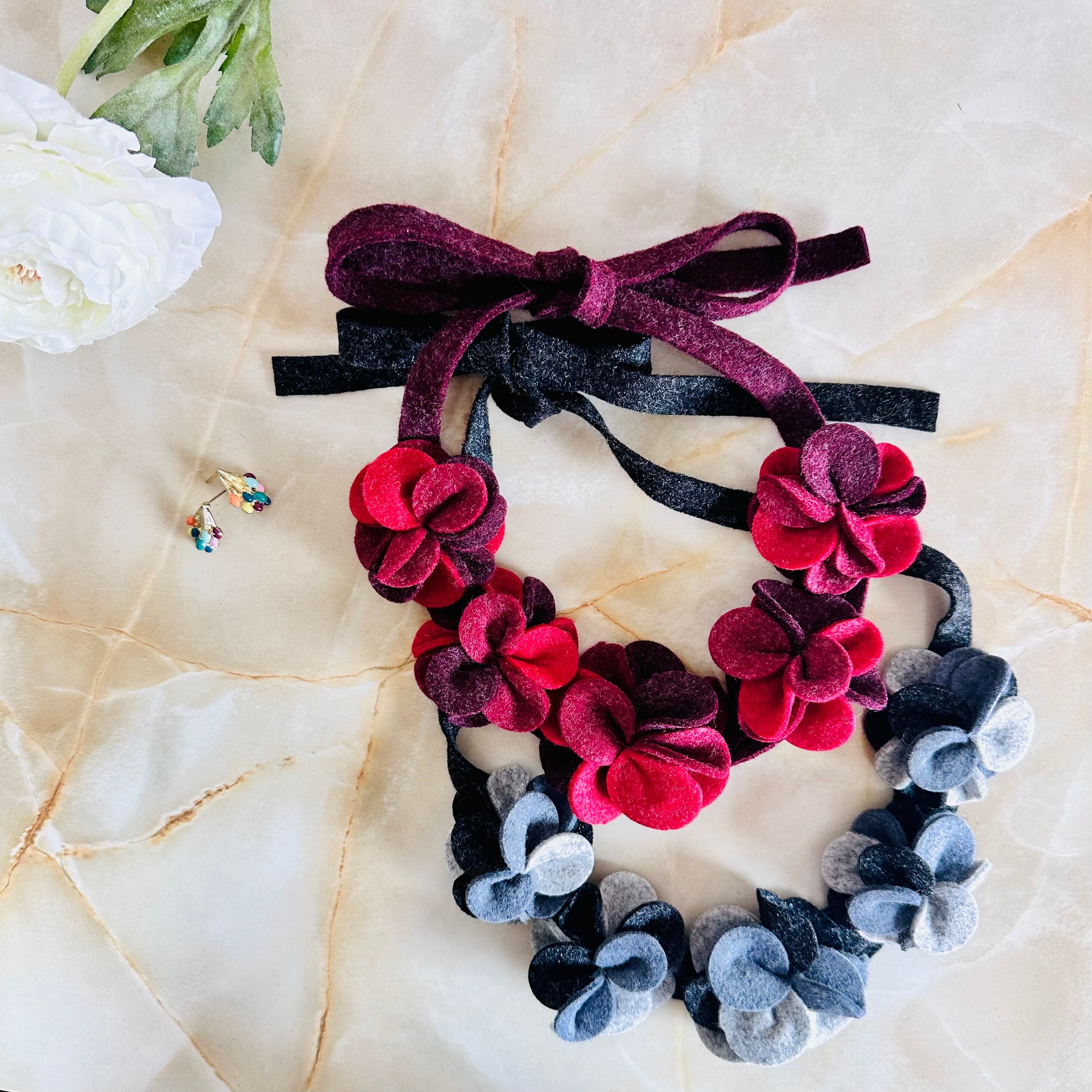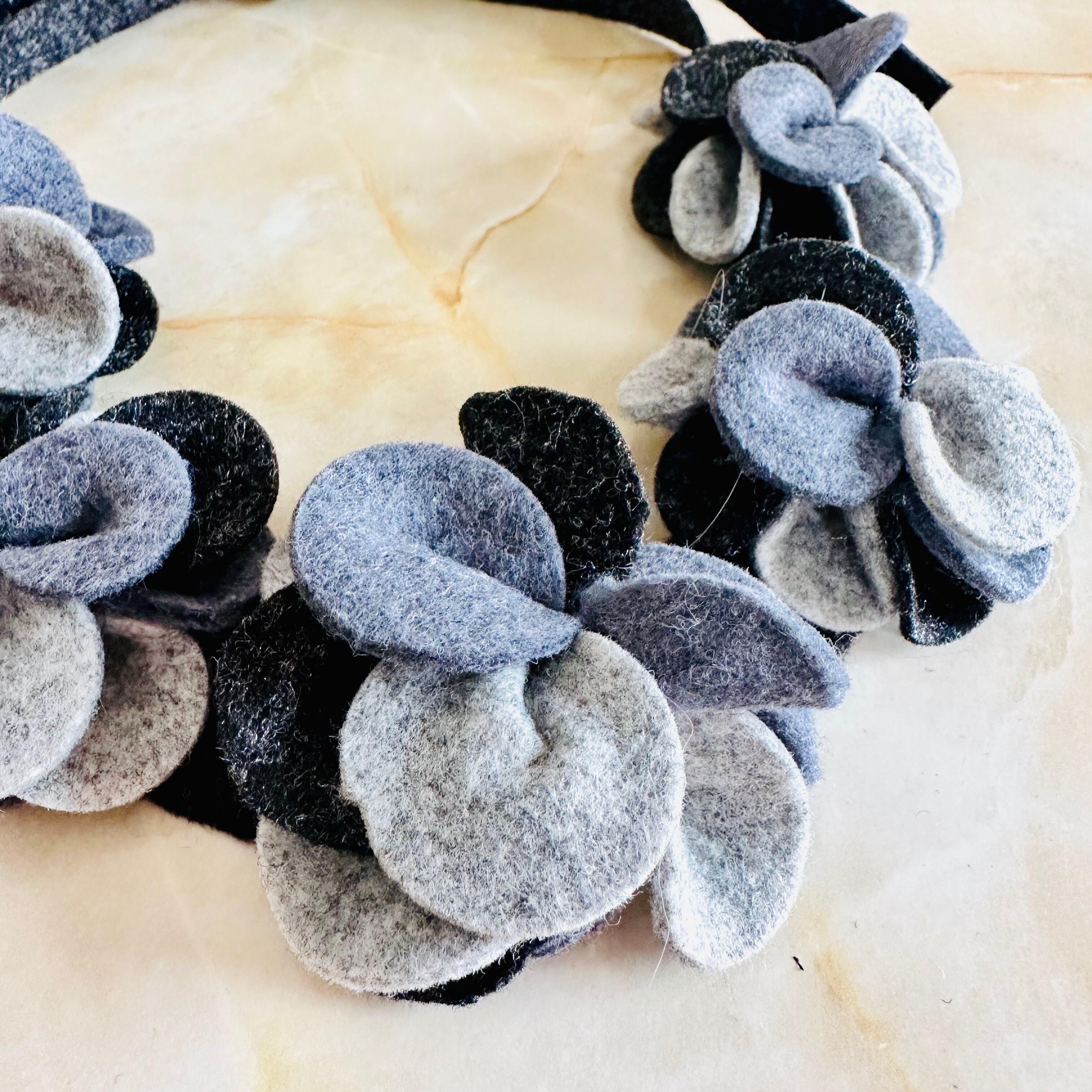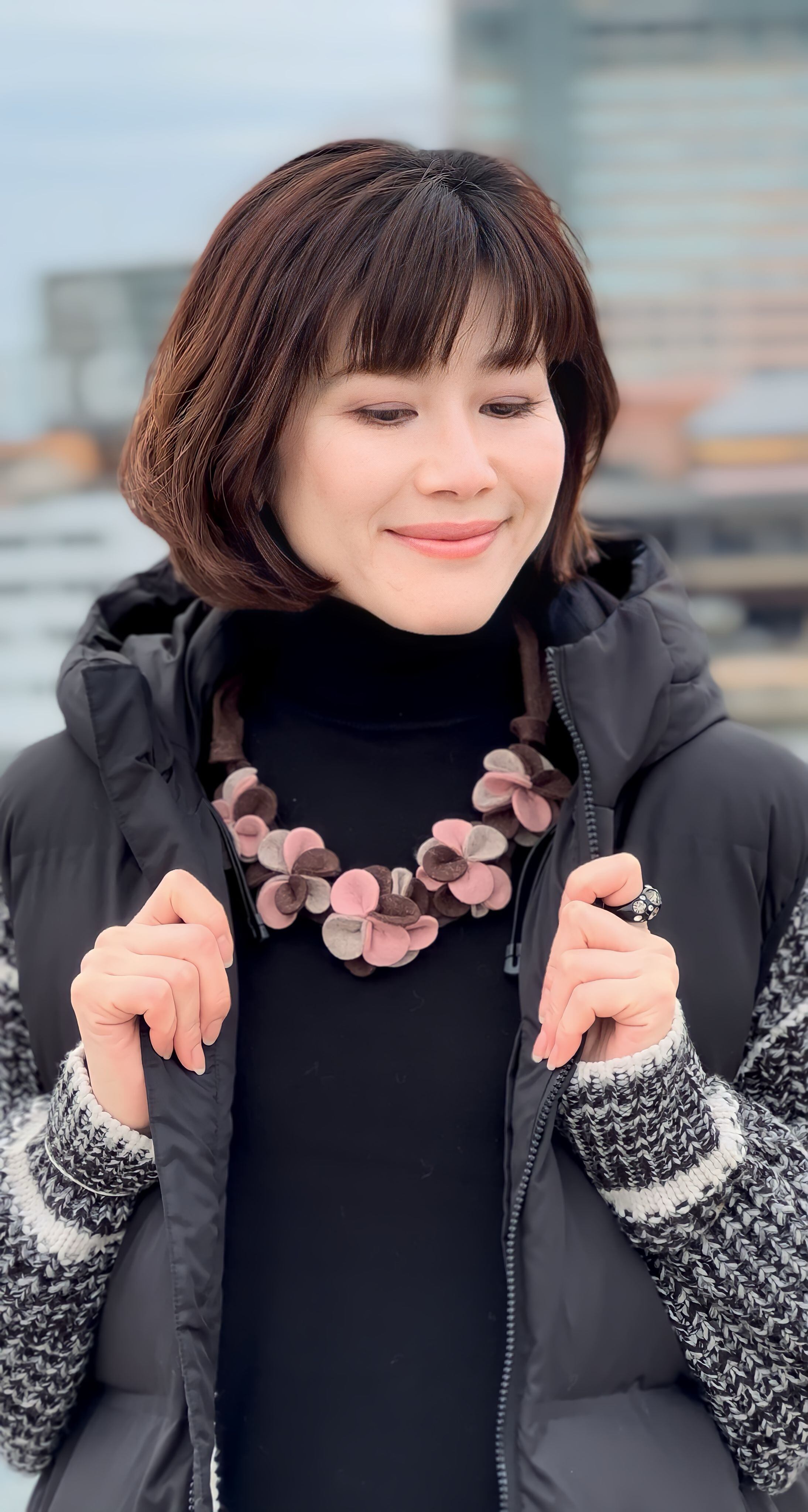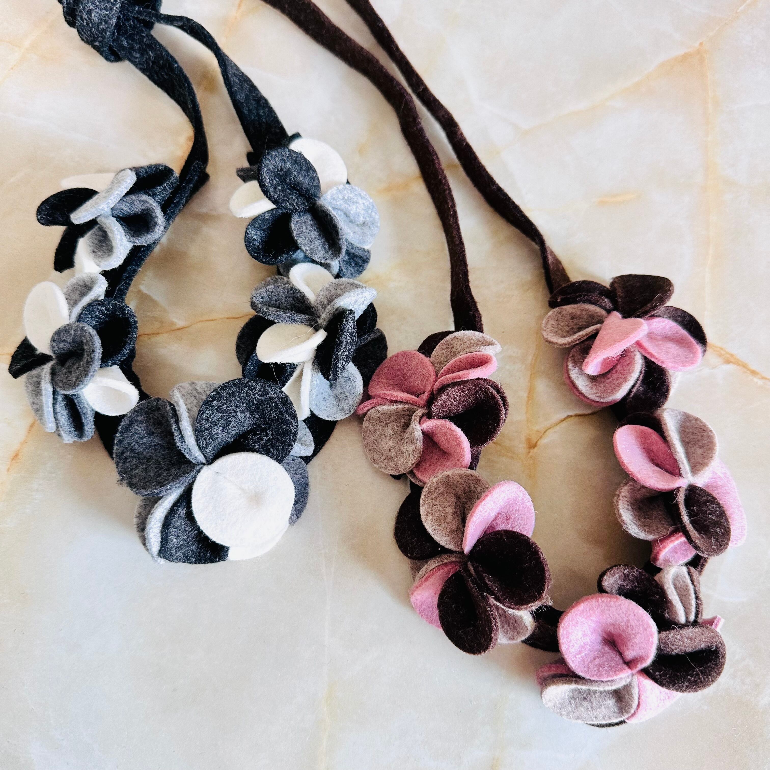 それぞれ同系の3色のフェルトを使用して、キュートなフラワーモチーフに仕上げました。