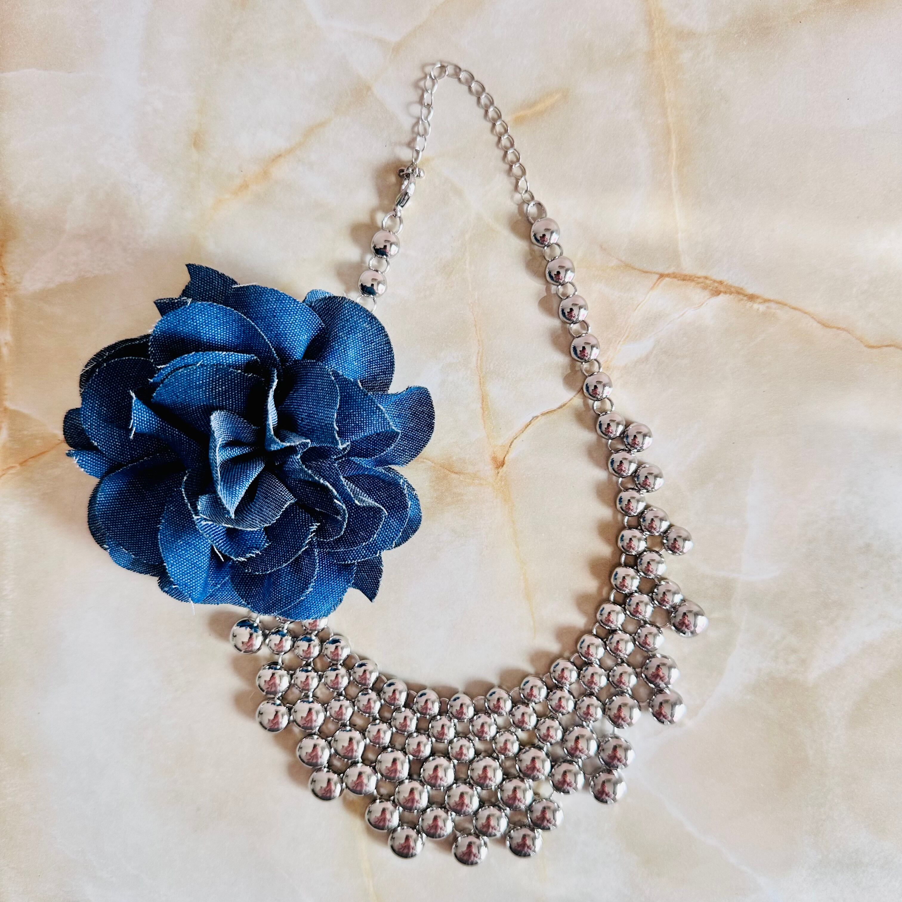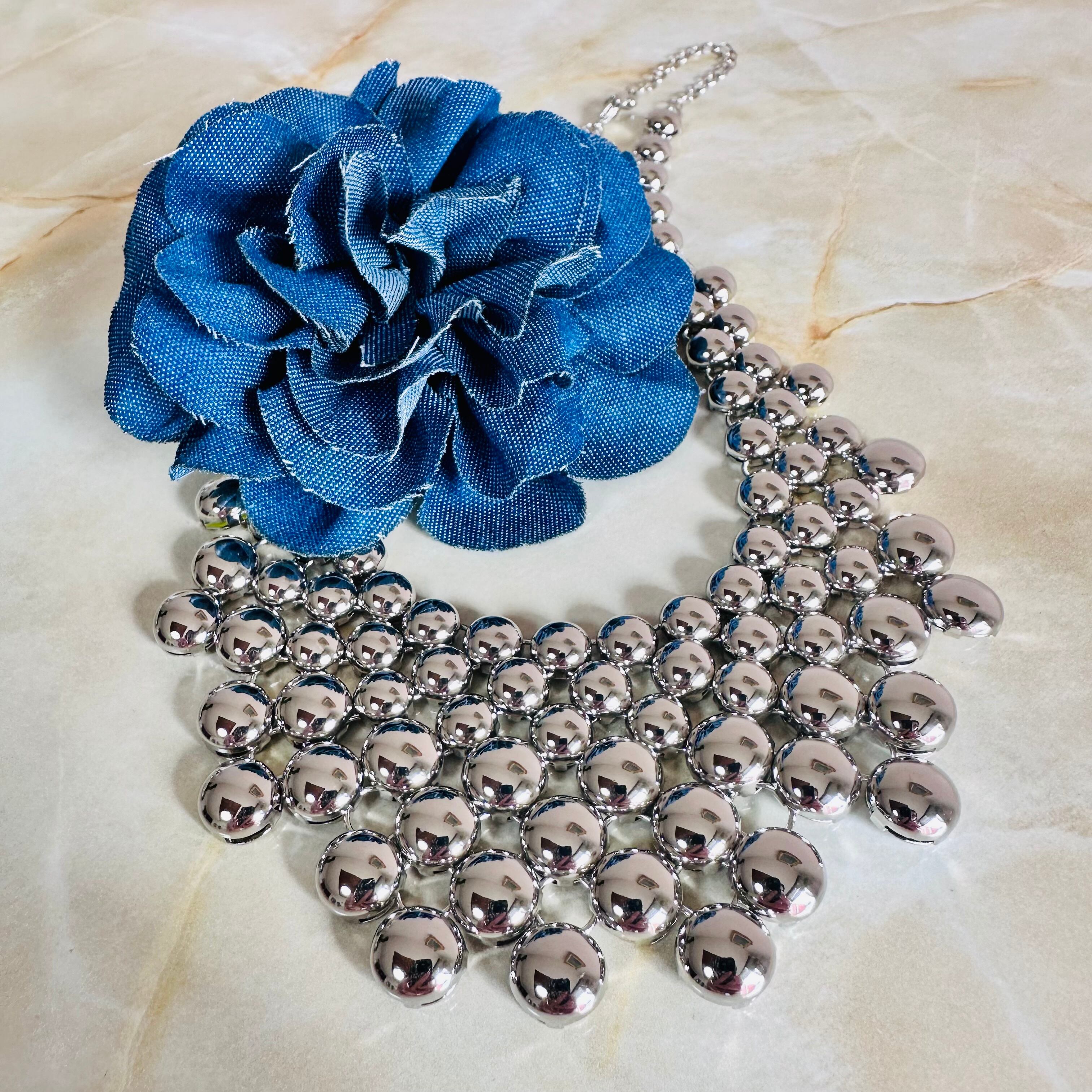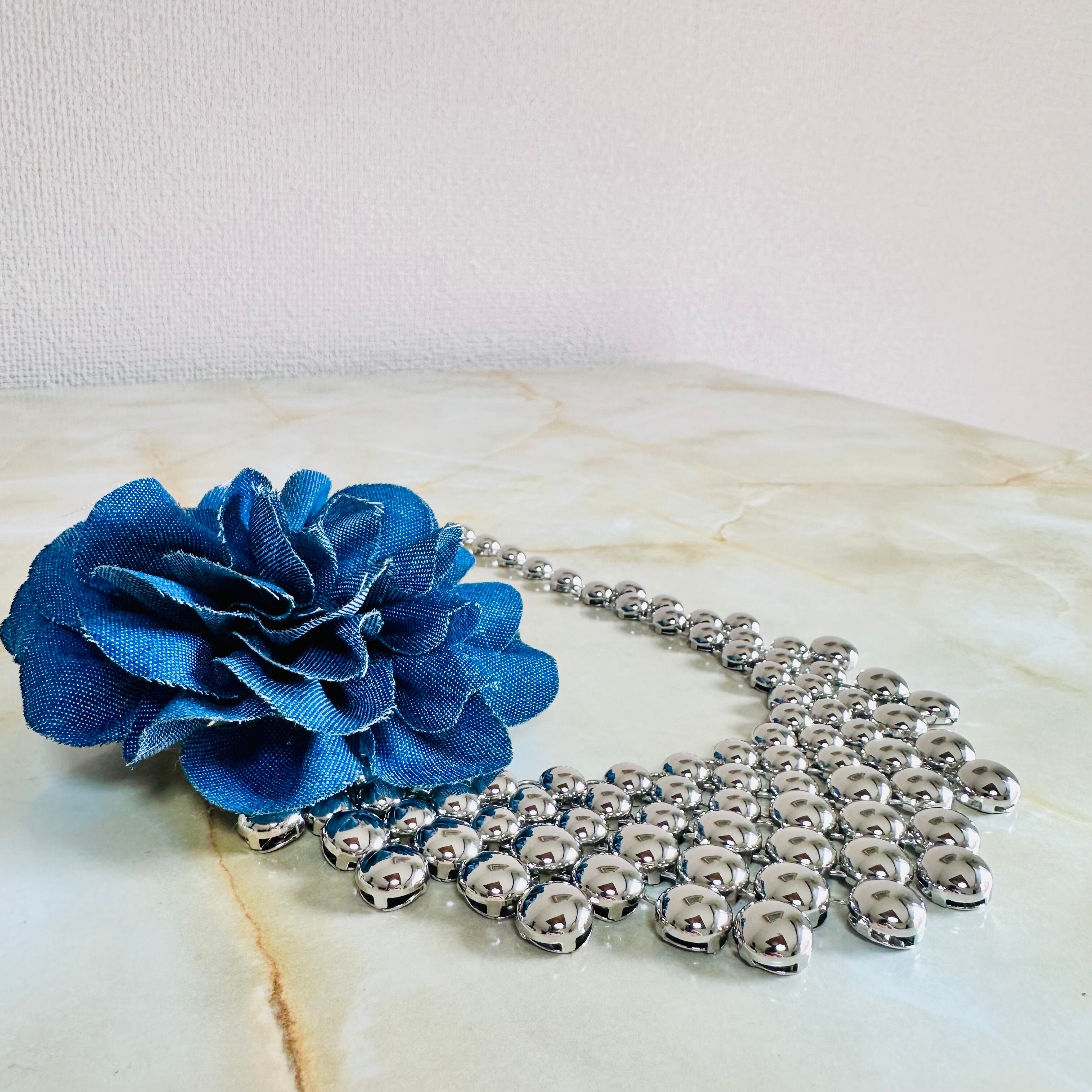 艶やかなシルバーカラーのネックレスにデニムカラーブローチがセットになったデザインです。
