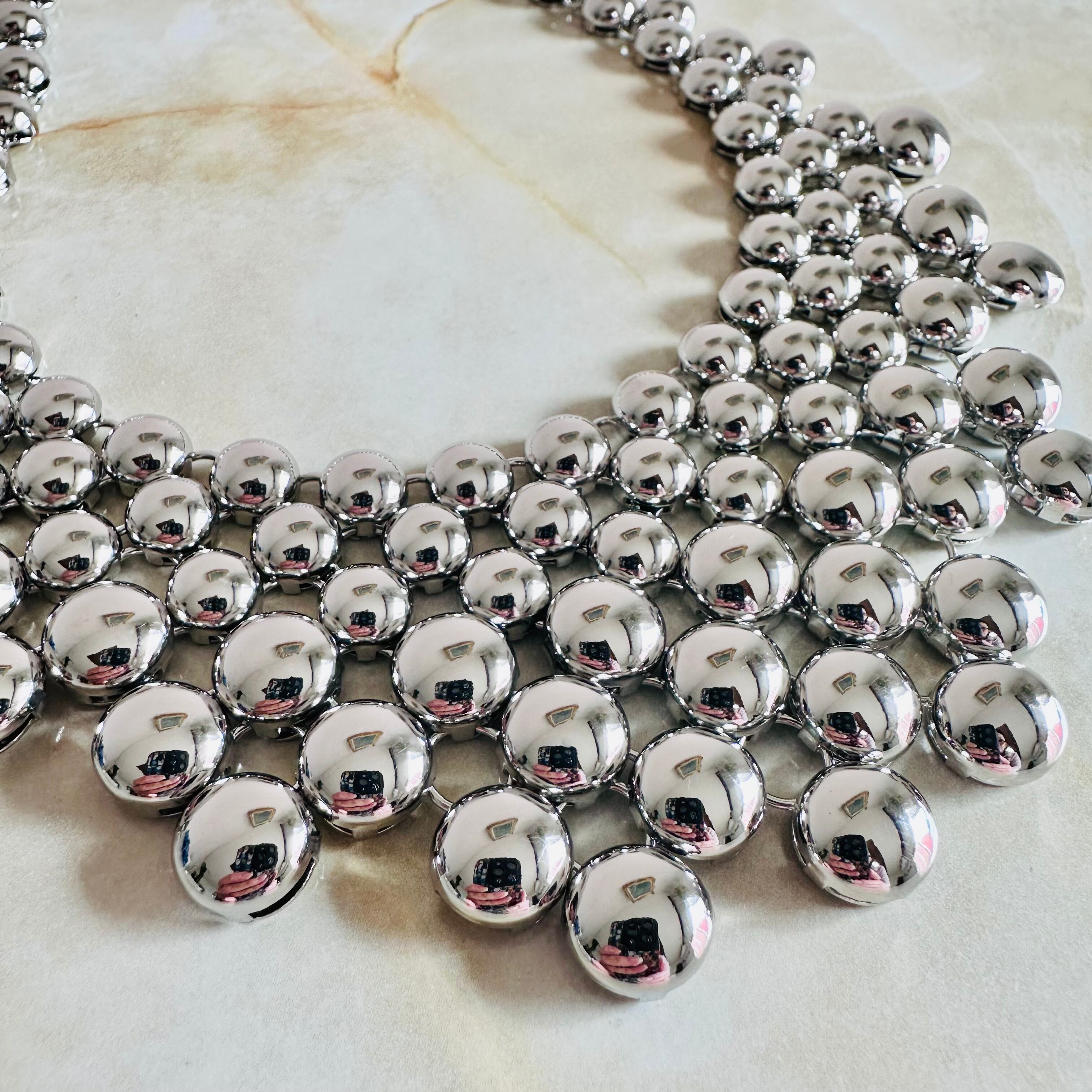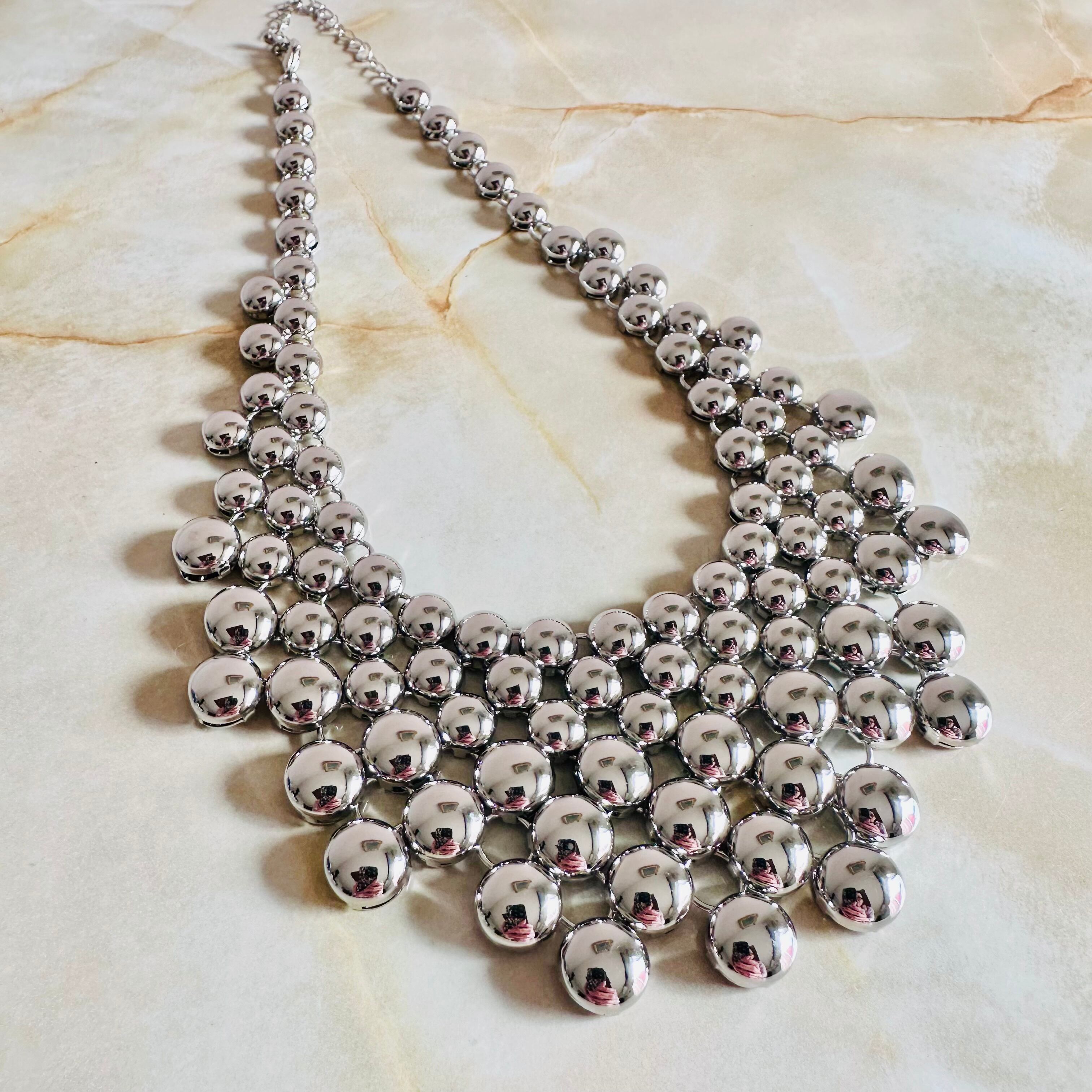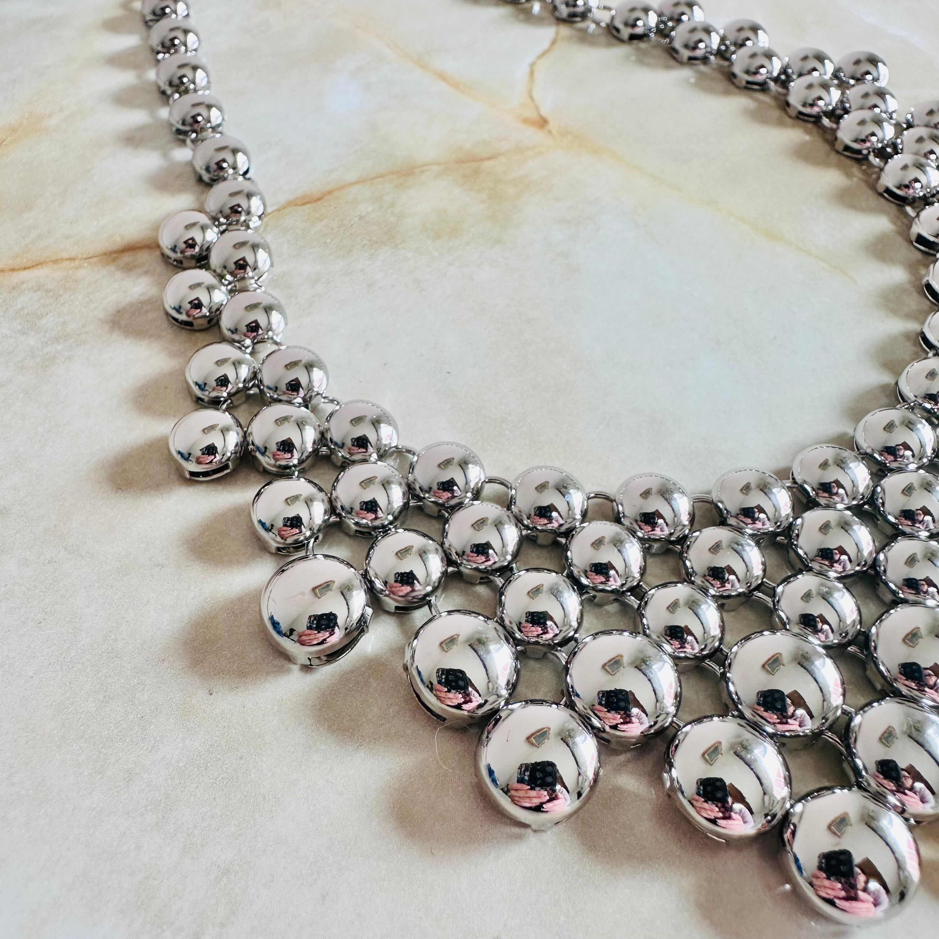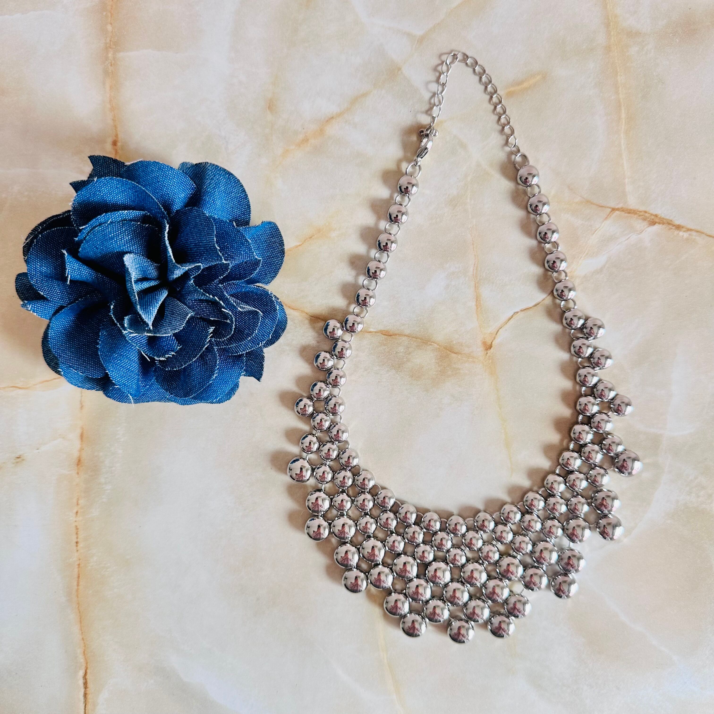 艶やかなシルバーカラーのネックレスにデニムカラーブローチがセットになったデザインです。