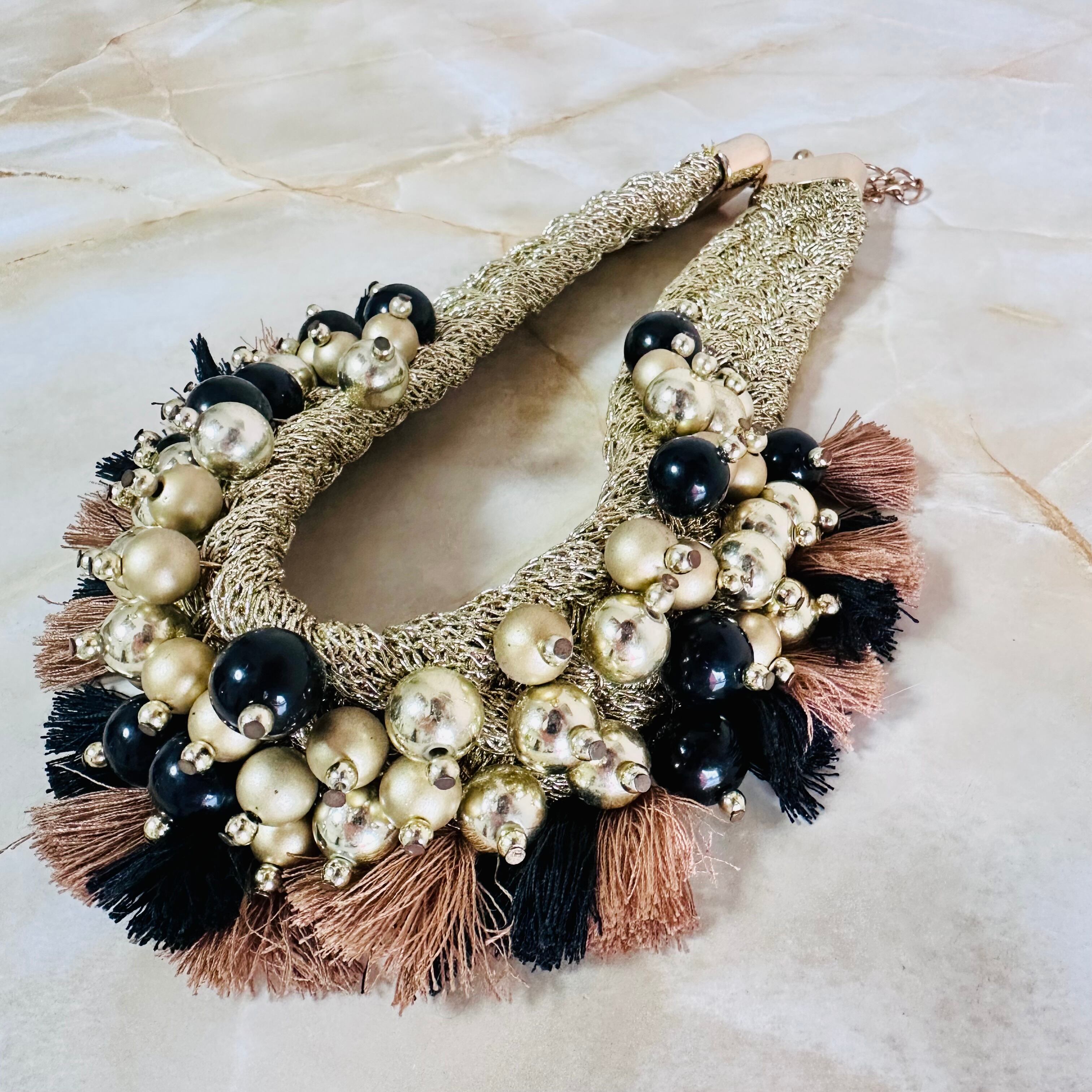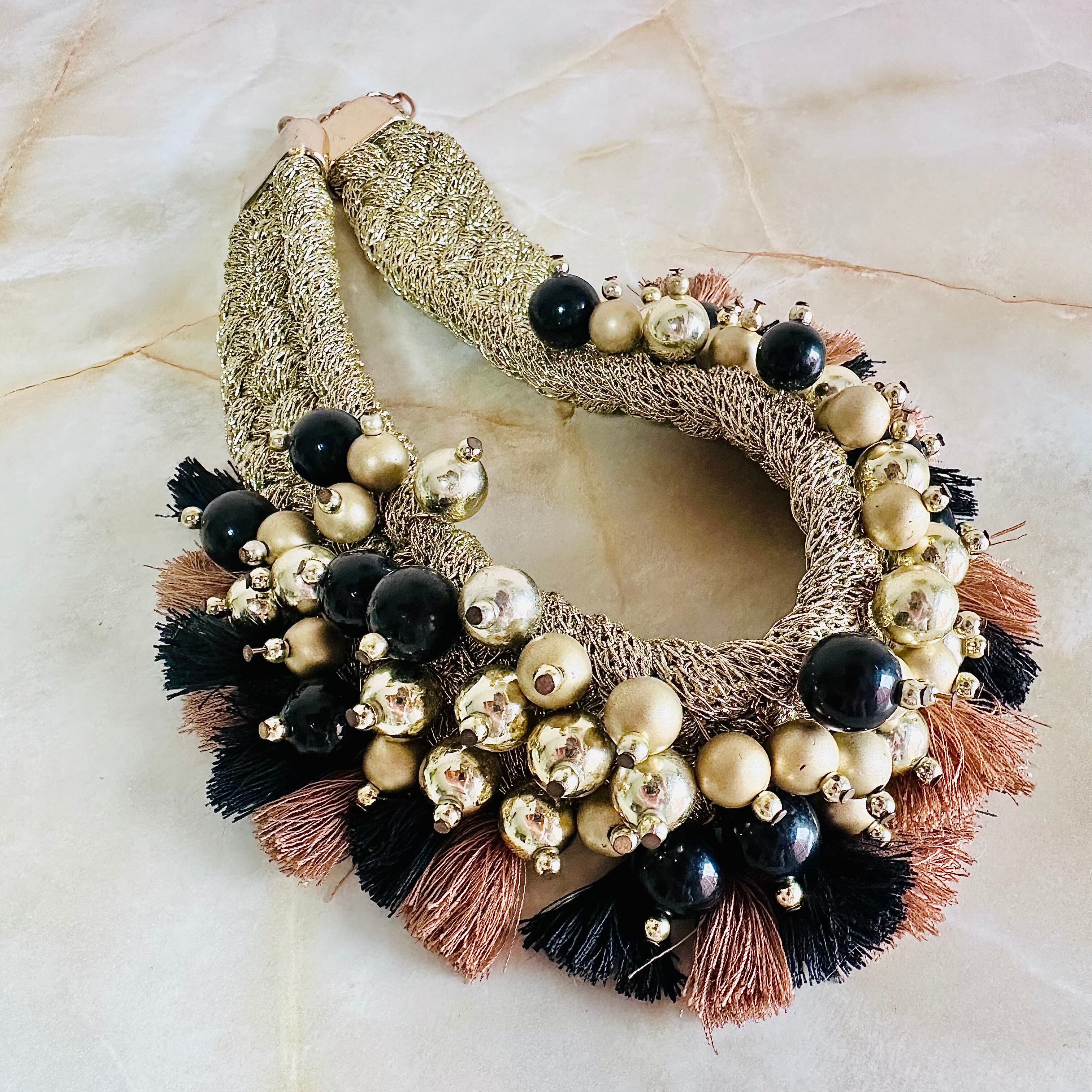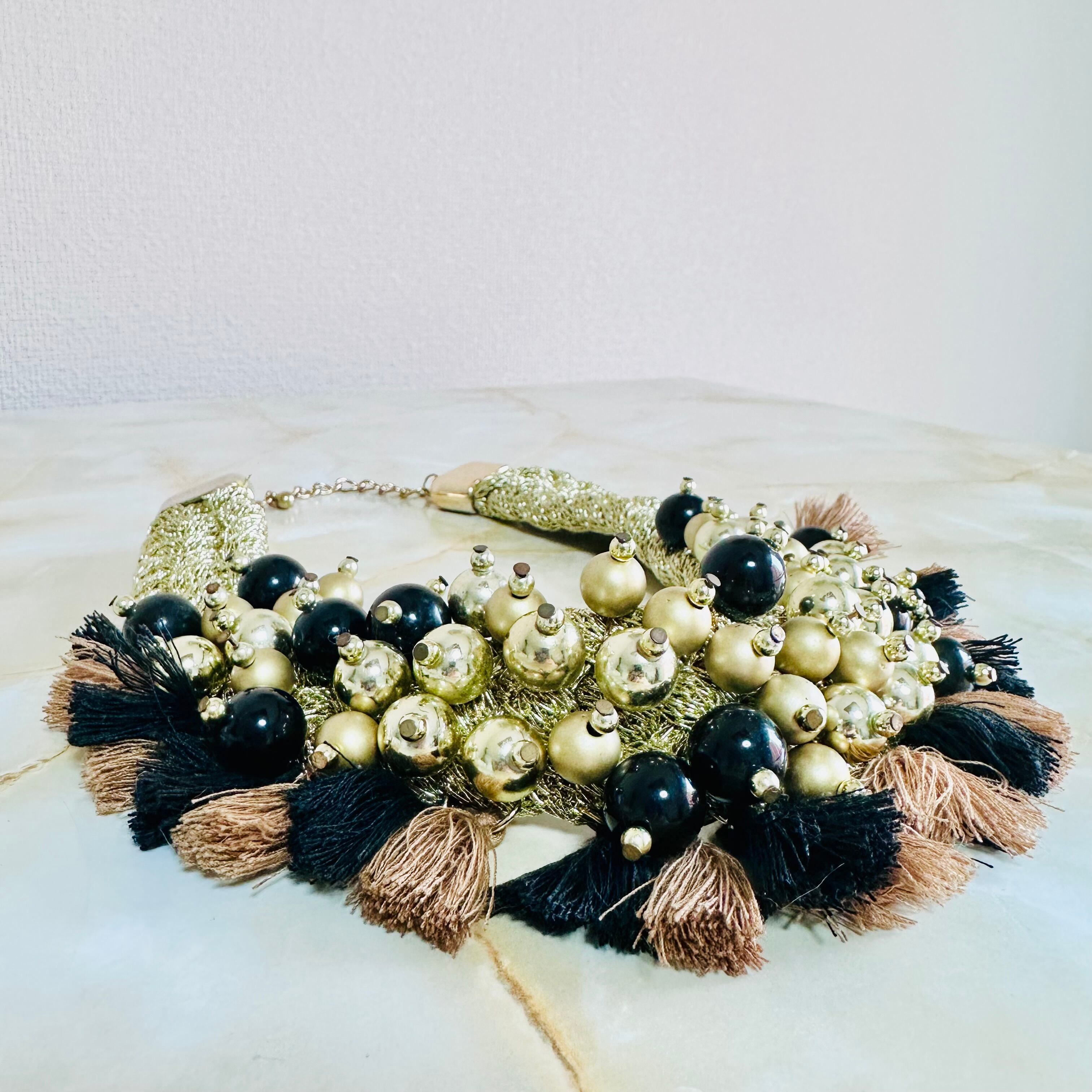 ゴールドカラーの生地を編み込み、ブラック、ゴールド、マットゴールドといったパーツを散りばめてフリンジをプラスしたボリューミーなデザインが目を惹きます。