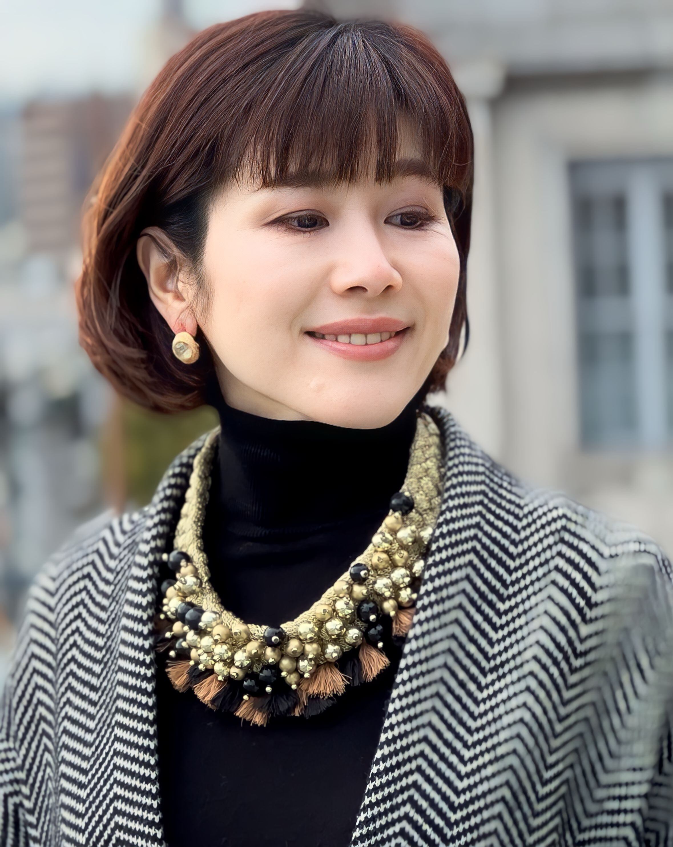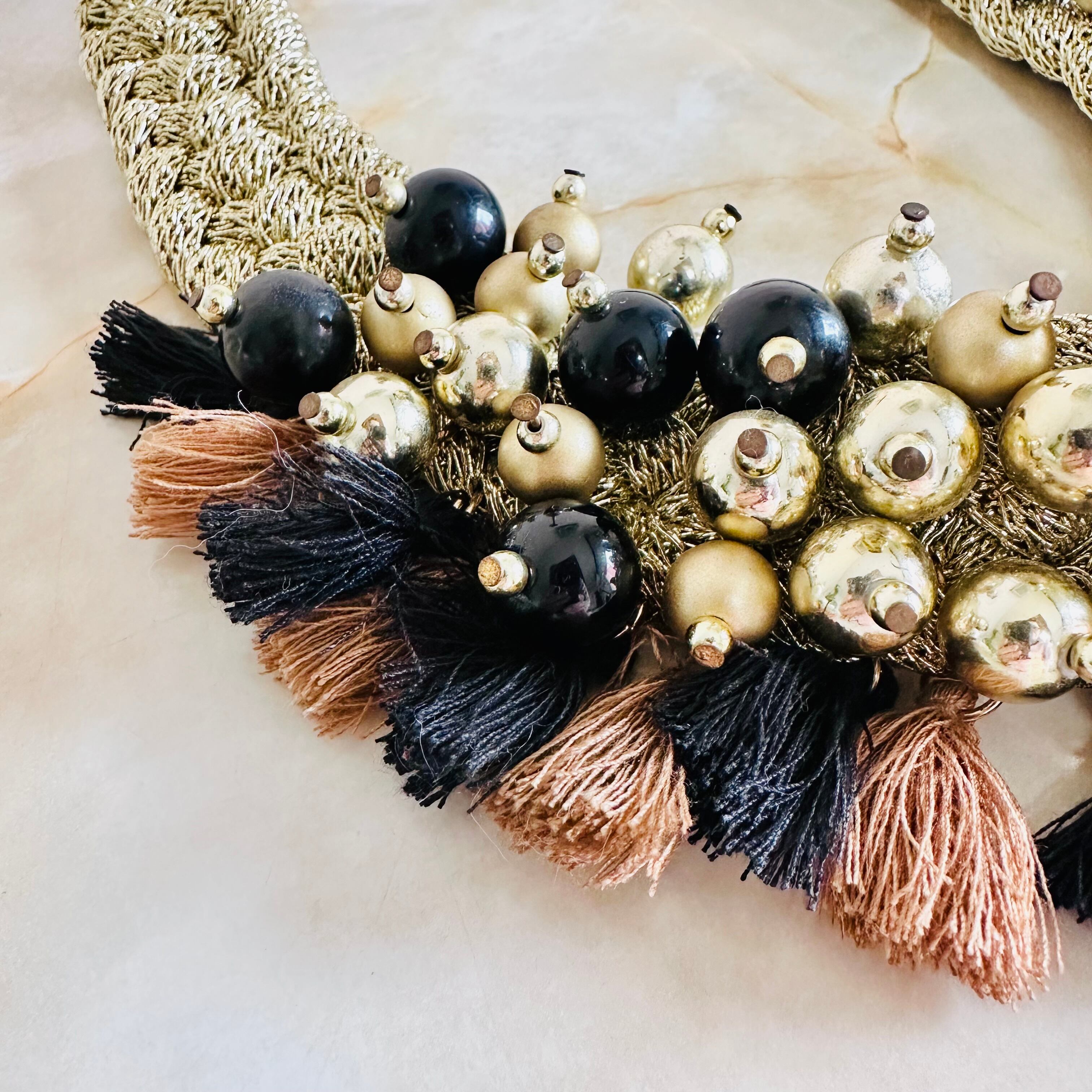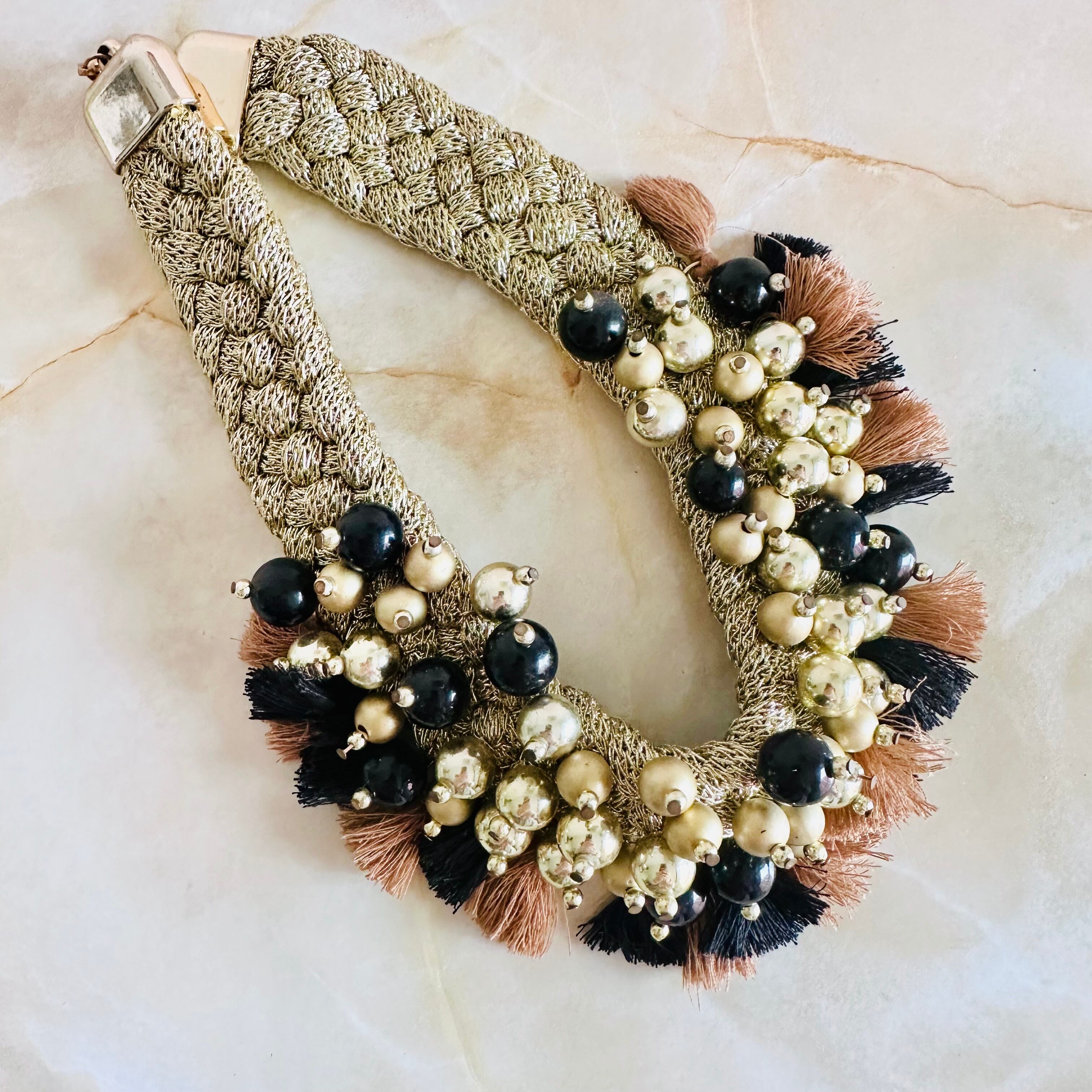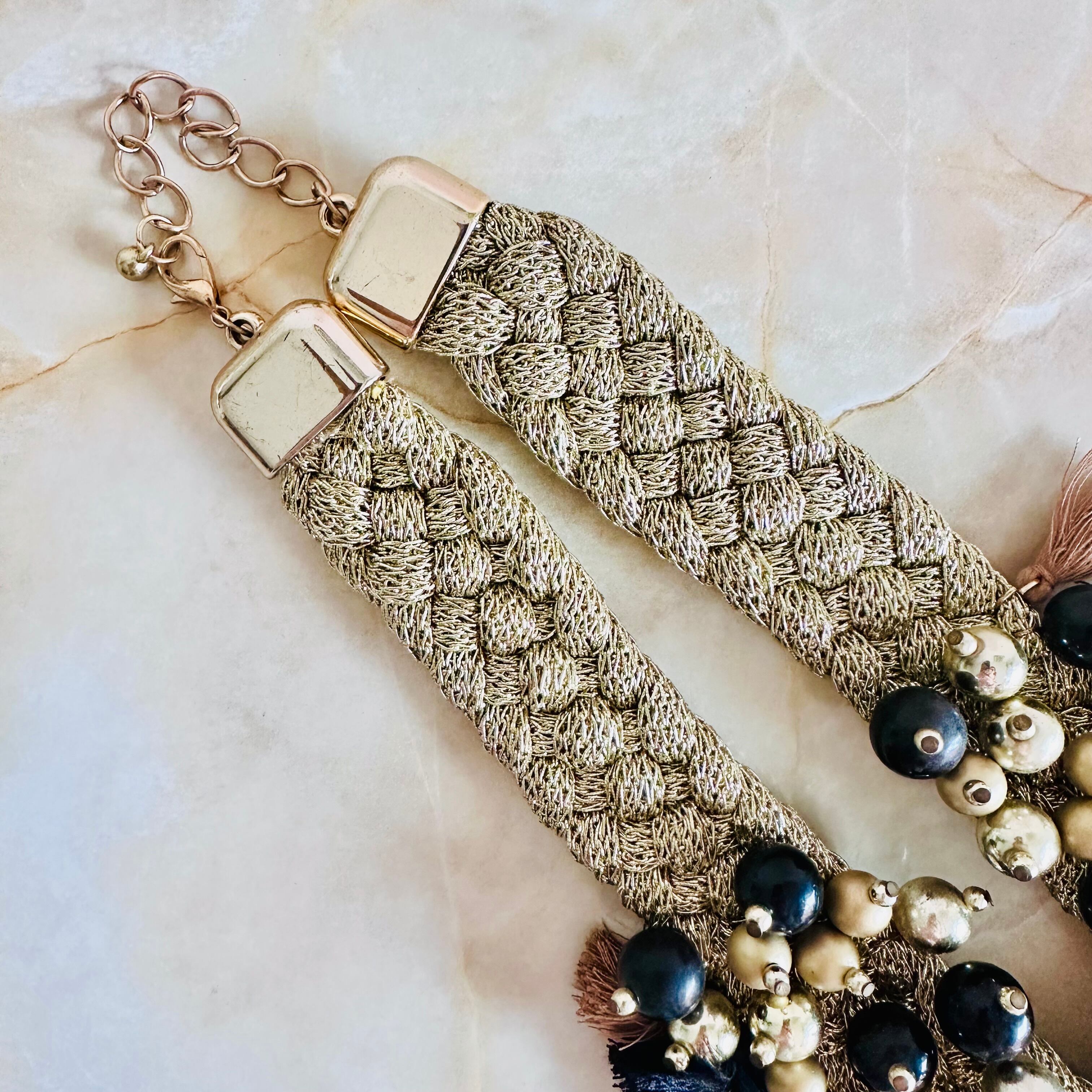 ゴールドカラーの生地を編み込み、ブラック、ゴールド、マットゴールドといったパーツを散りばめてフリンジをプラスしたボリューミーなデザインが目を惹きます。