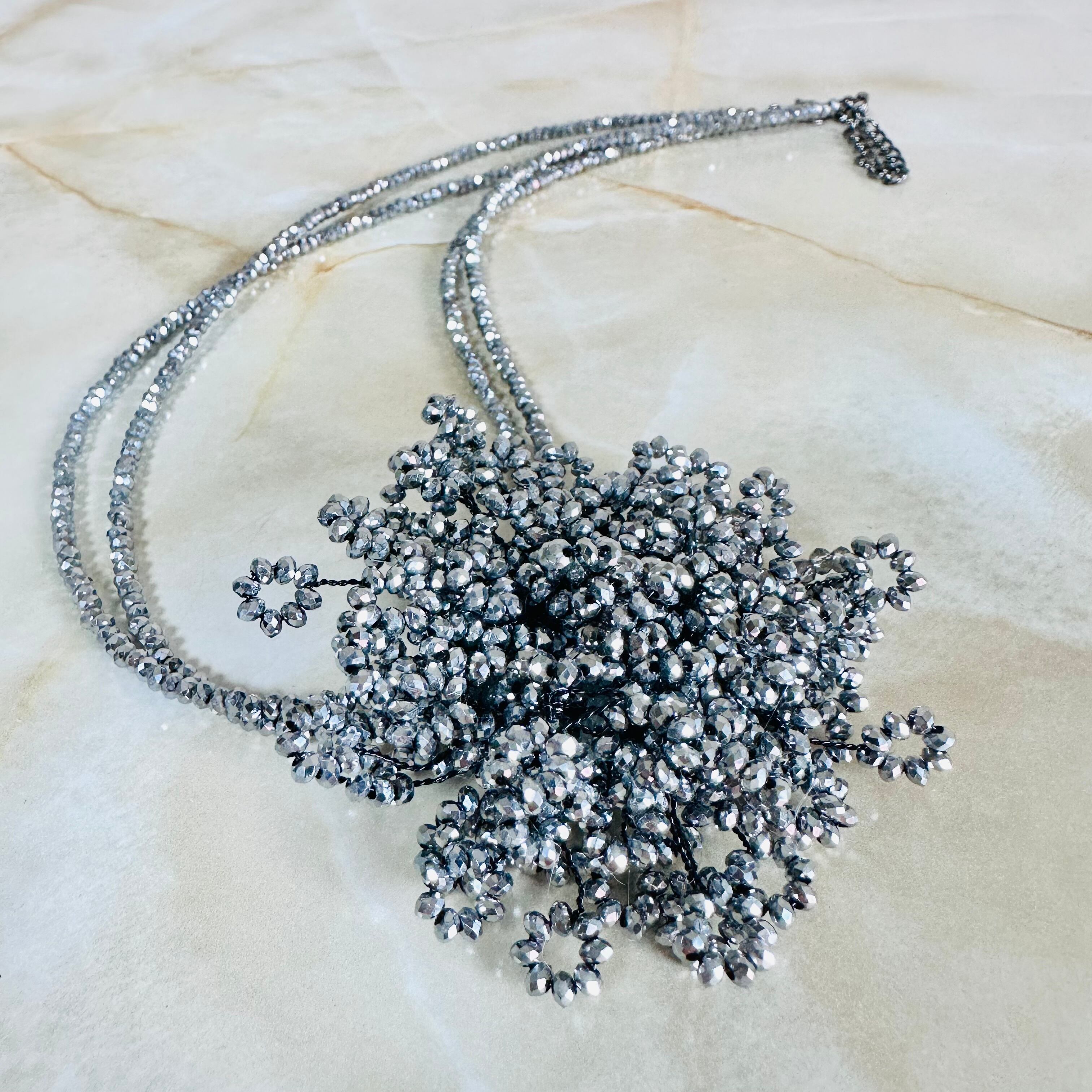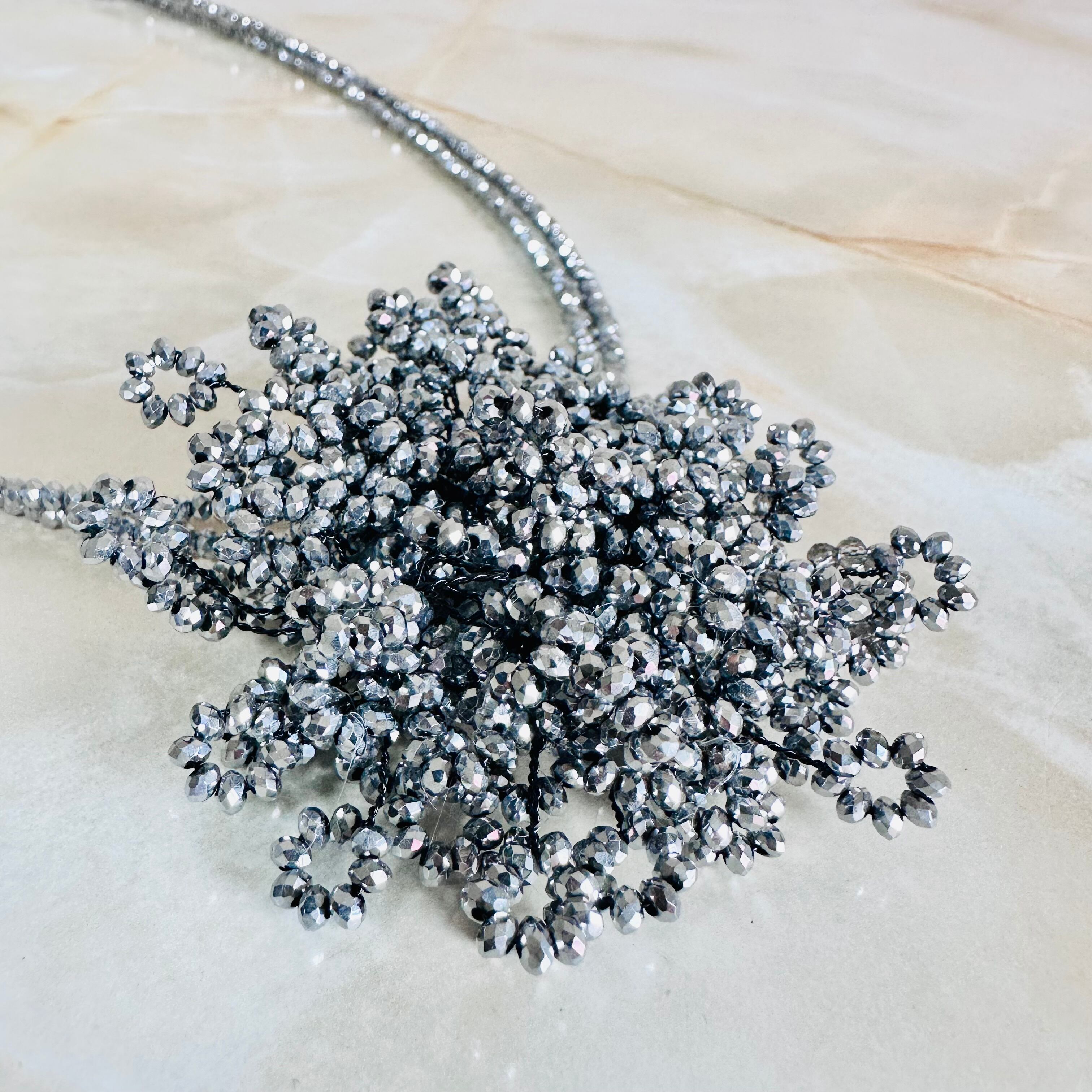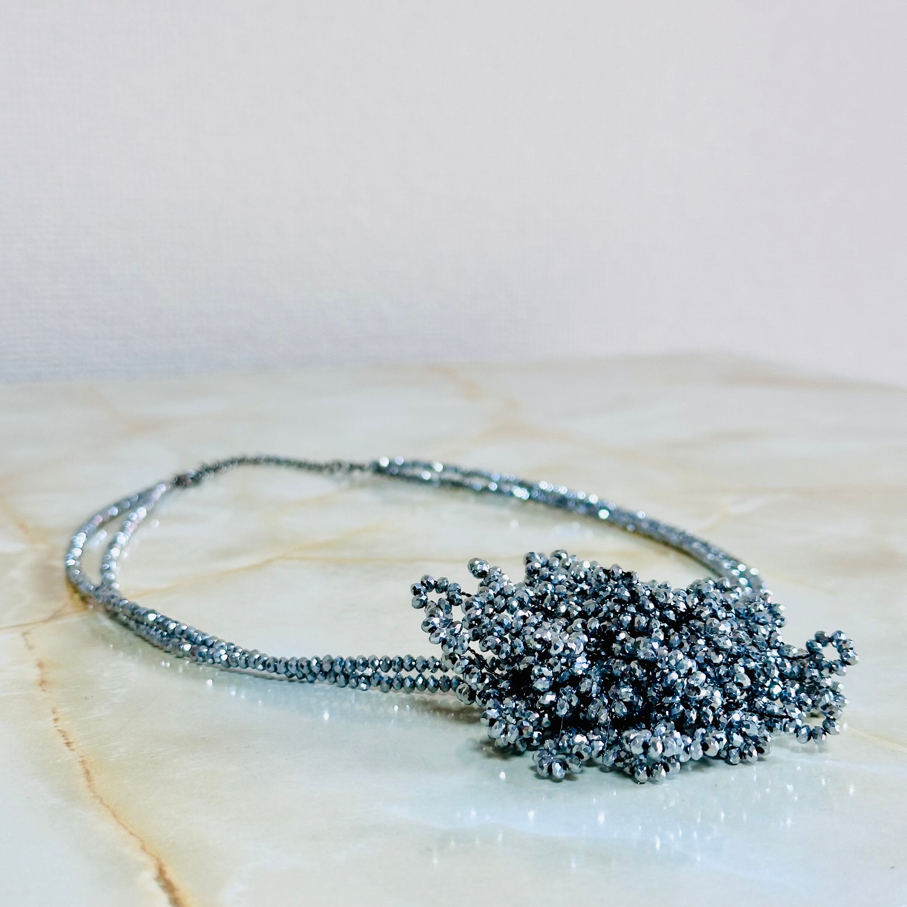 ワンランク上のガラスビーズの輝きで作ったフラワーモチーフが特徴的なネックレスです。