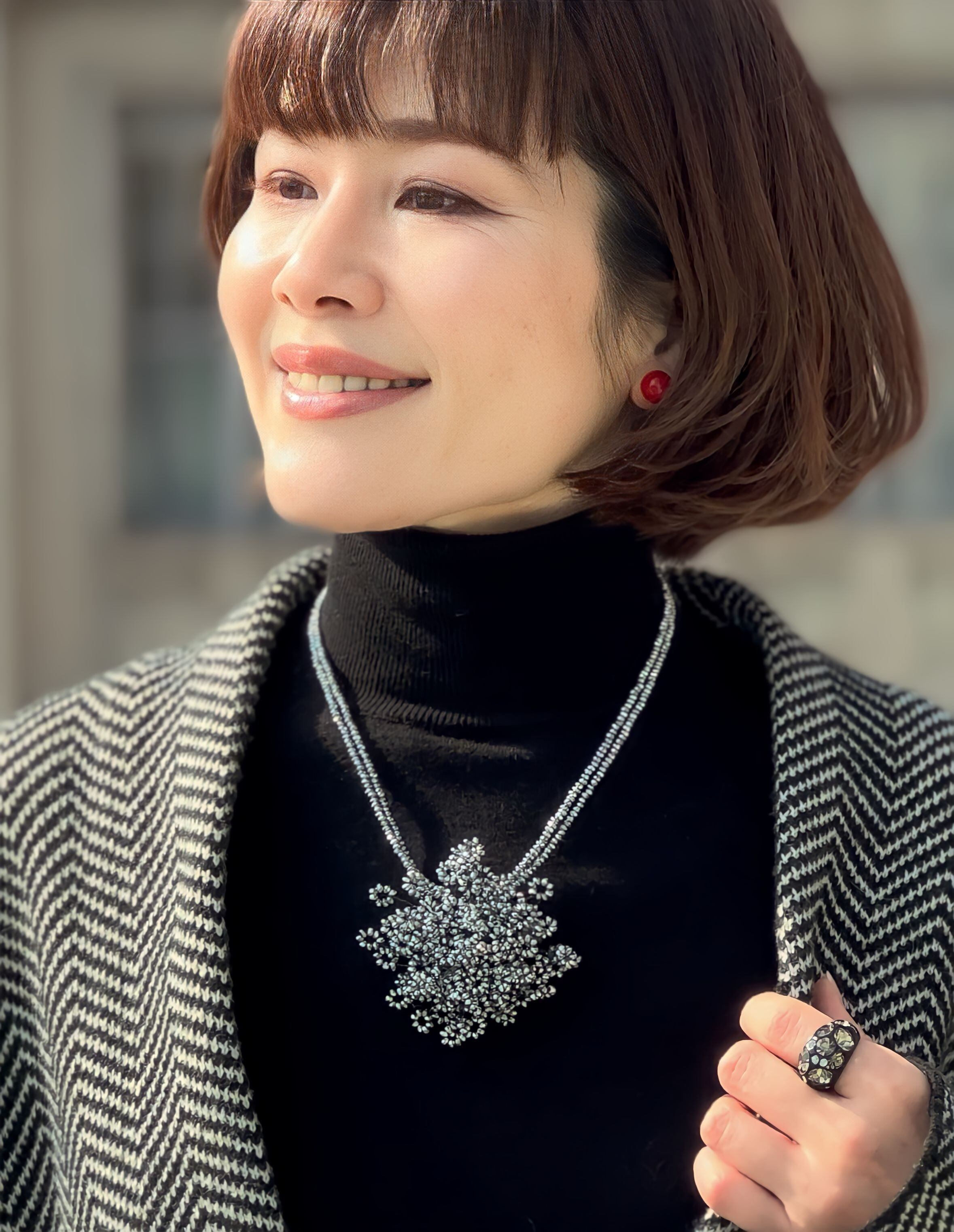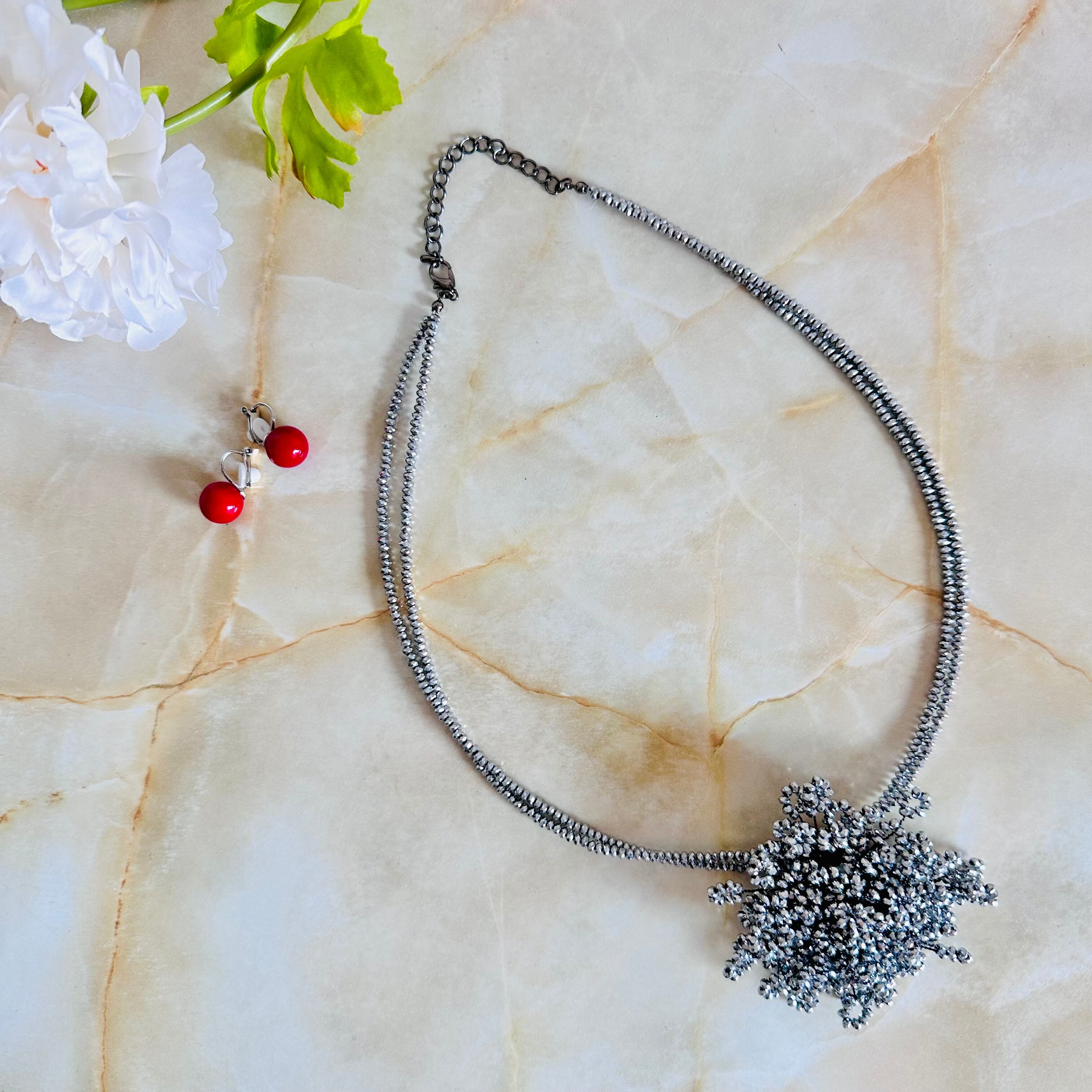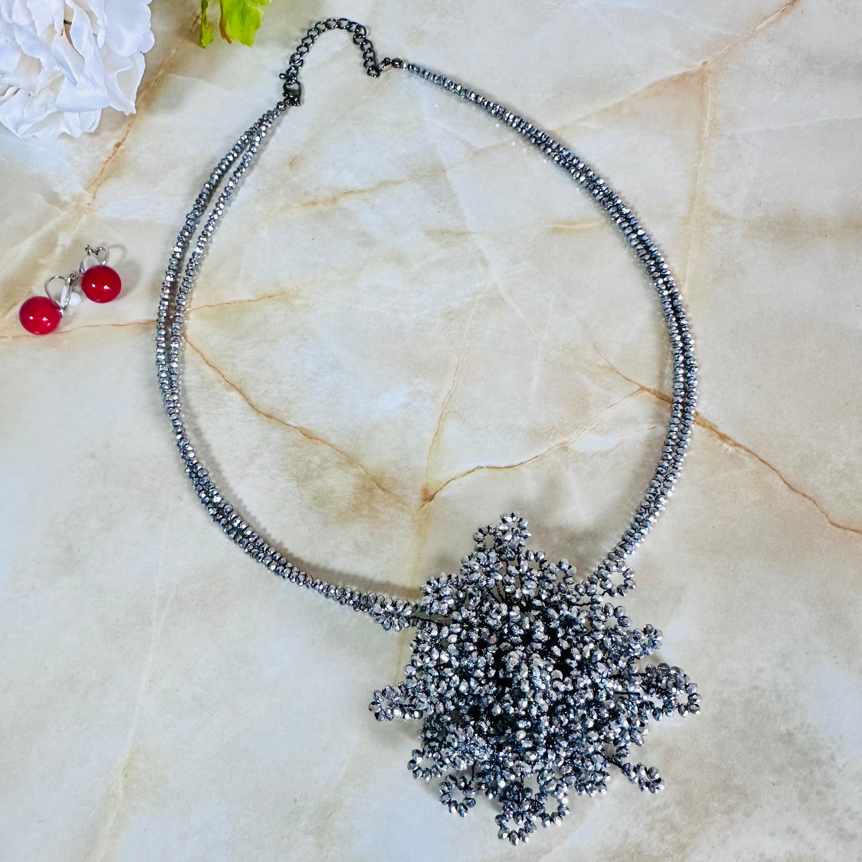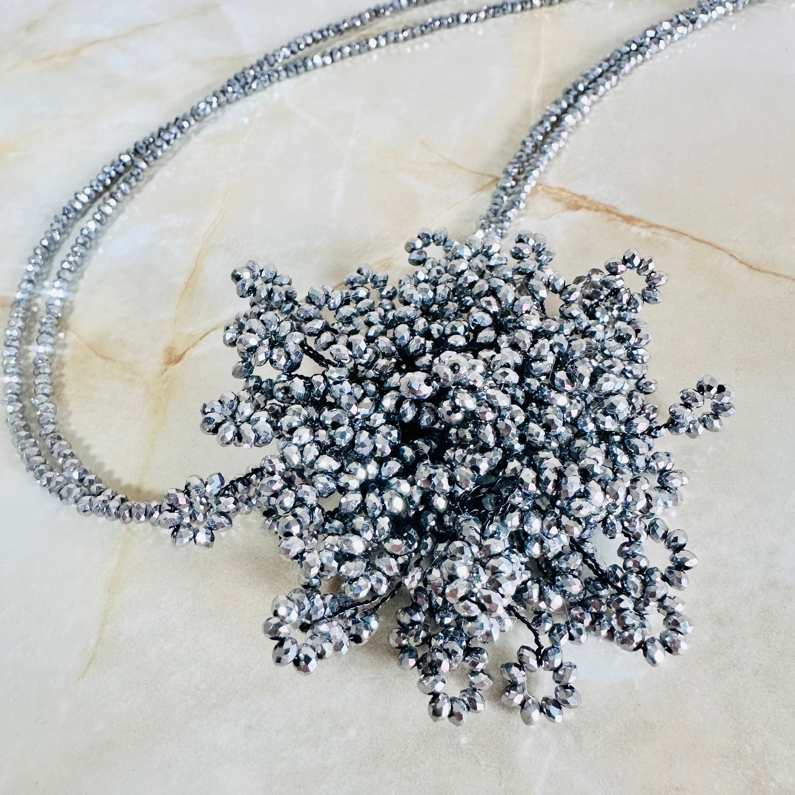 ワンランク上のガラスビーズの輝きで作ったフラワーモチーフが特徴的なネックレスです。