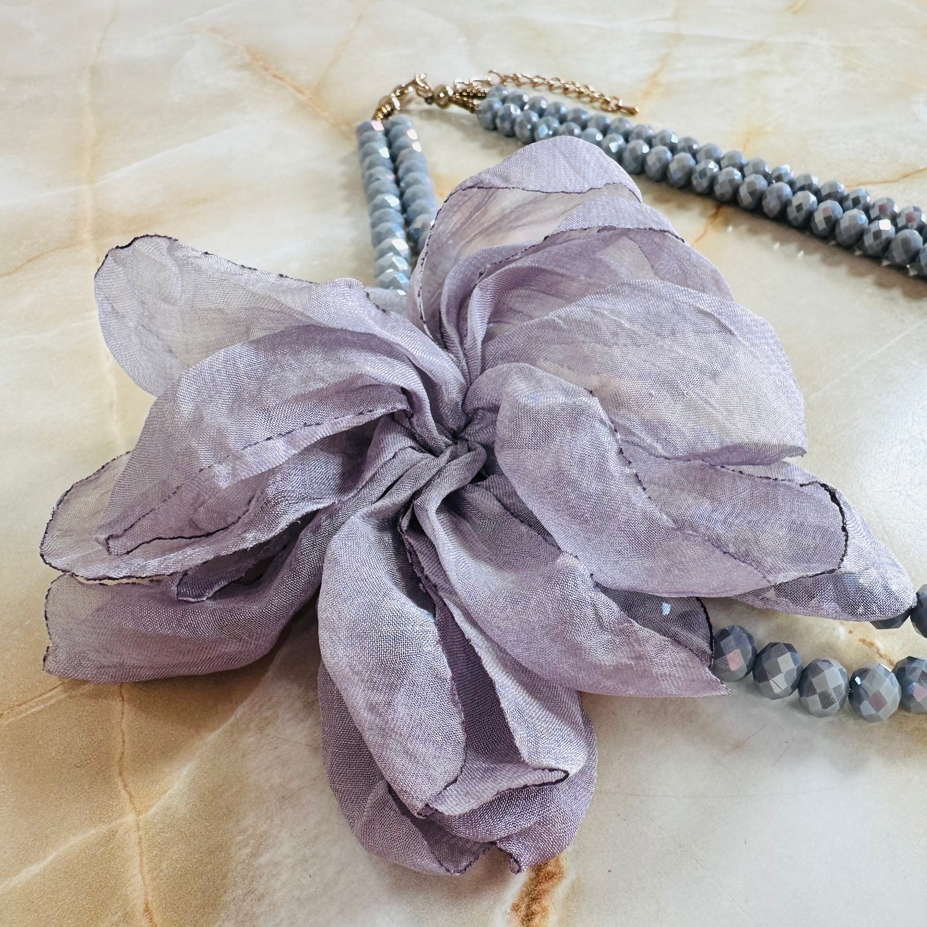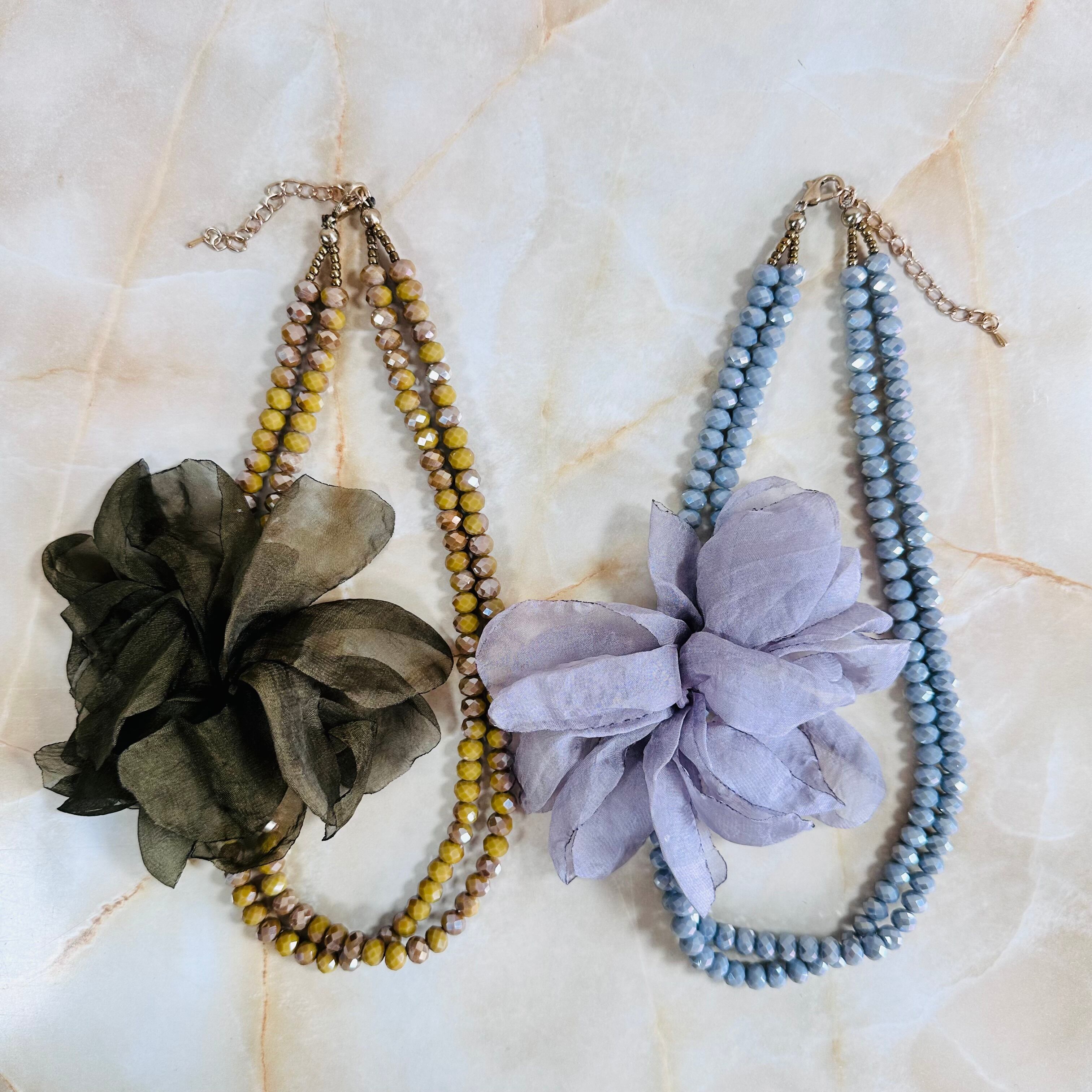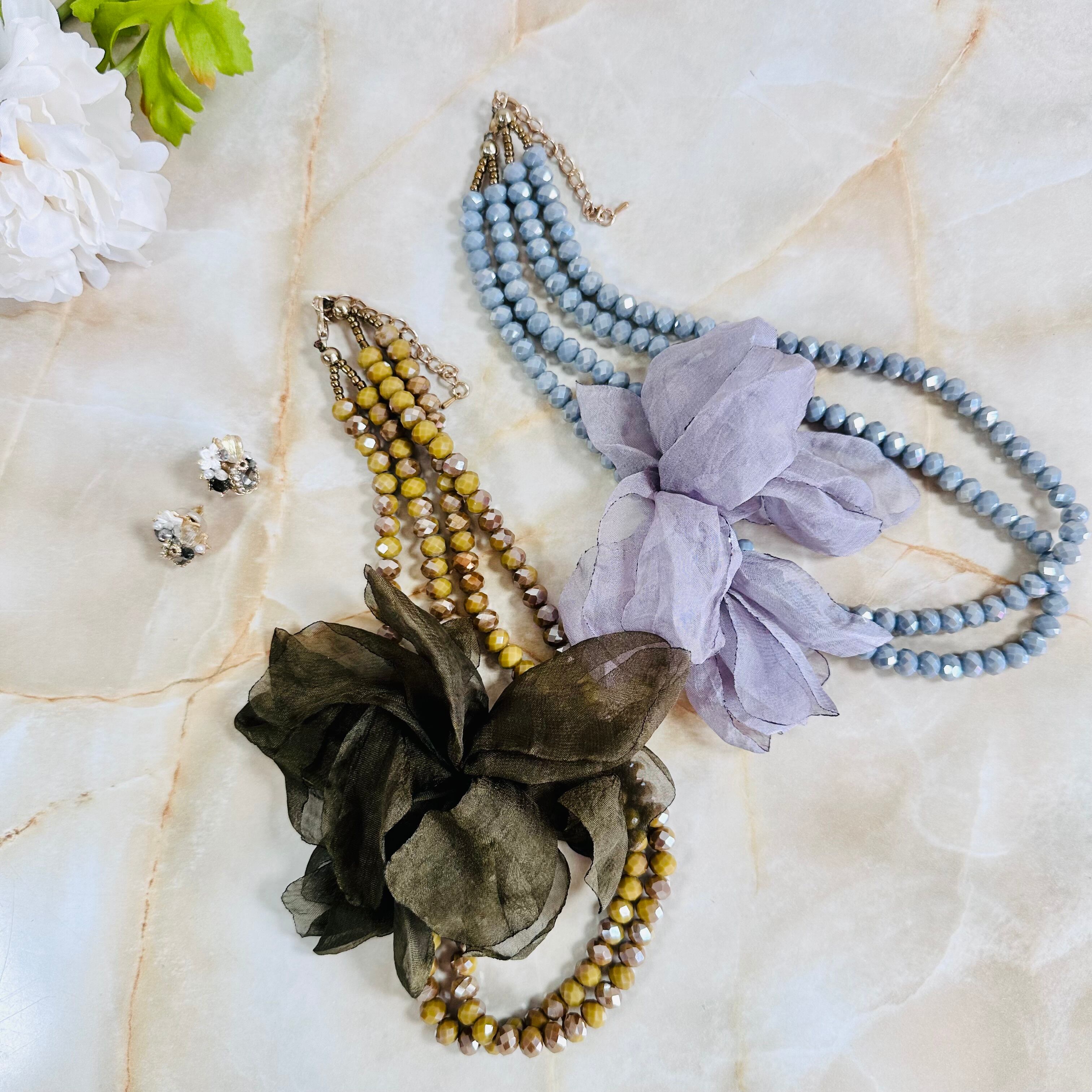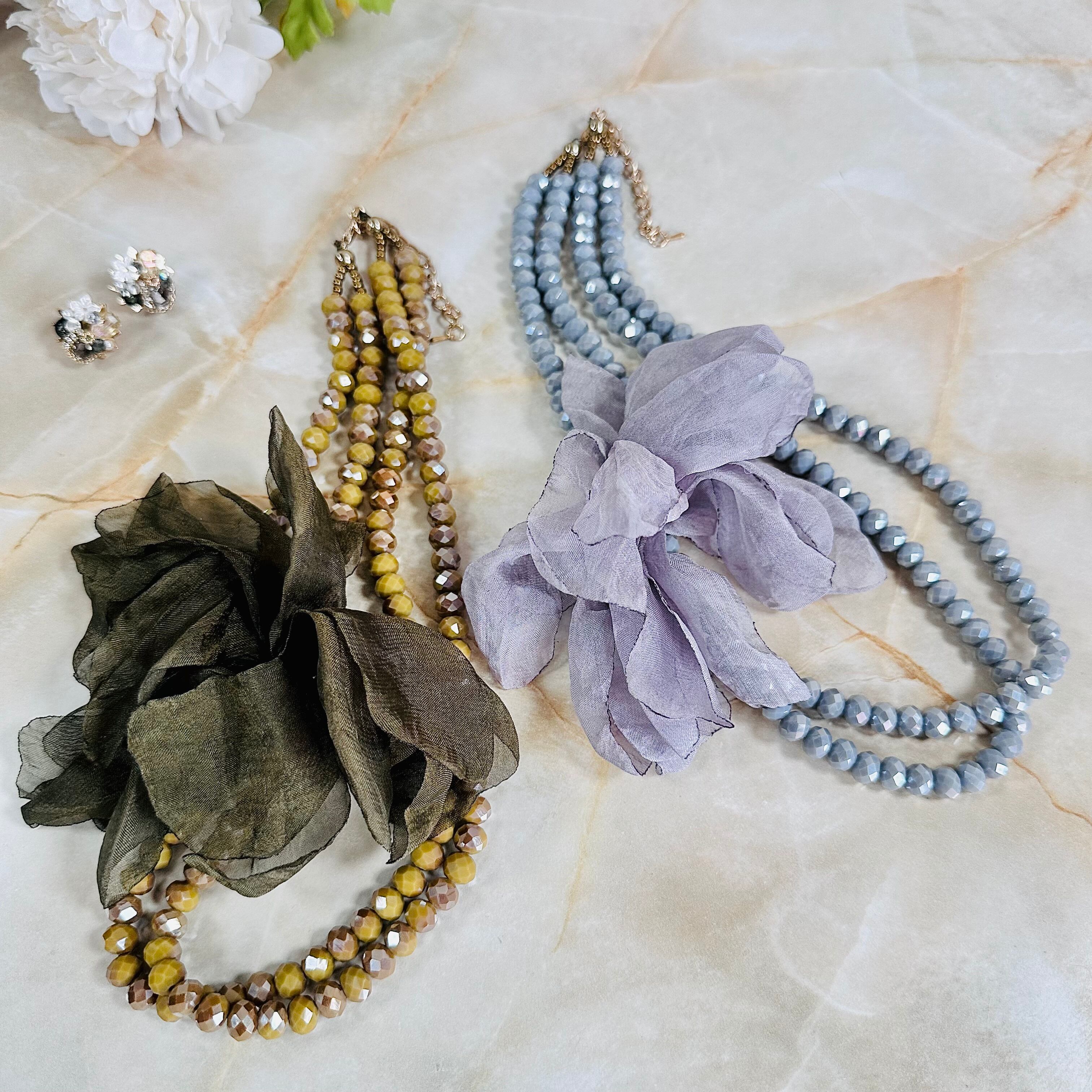 オーロラ調に輝くガラスビーズにオーガンジーのフラワーモチーフを取り付けたフェミニンなデザインです♡
