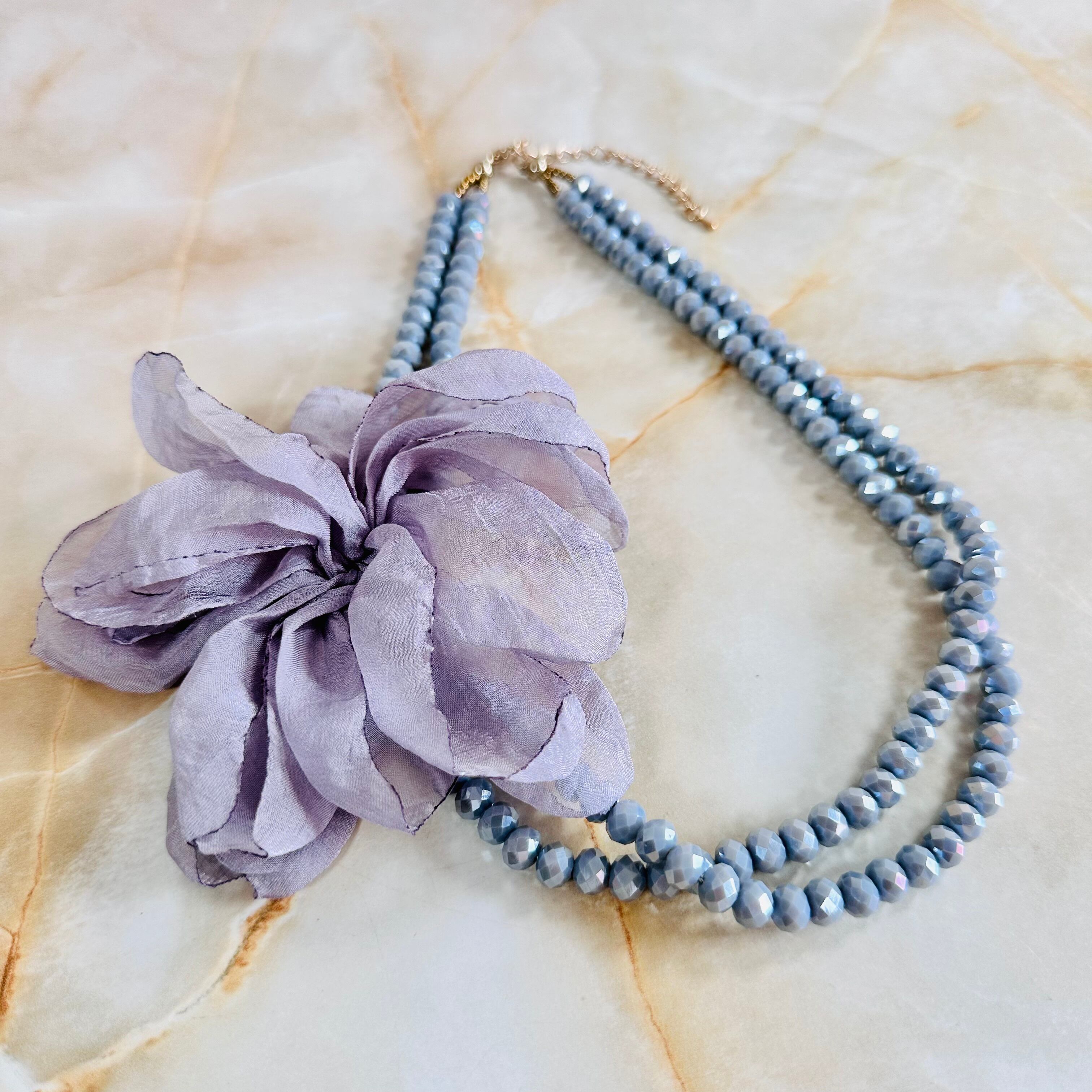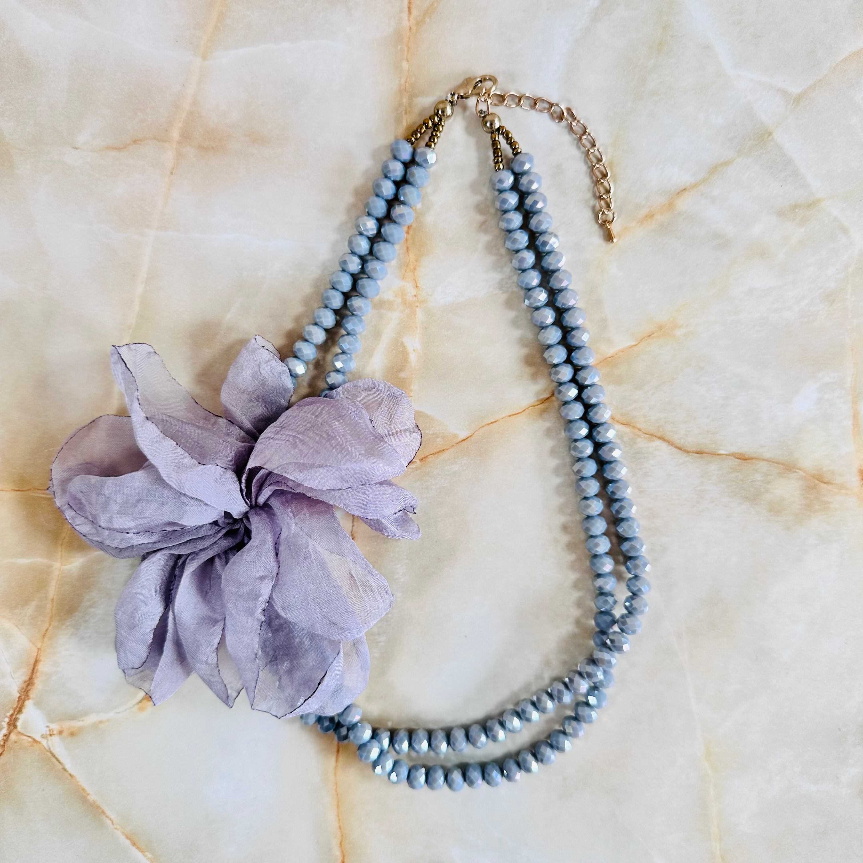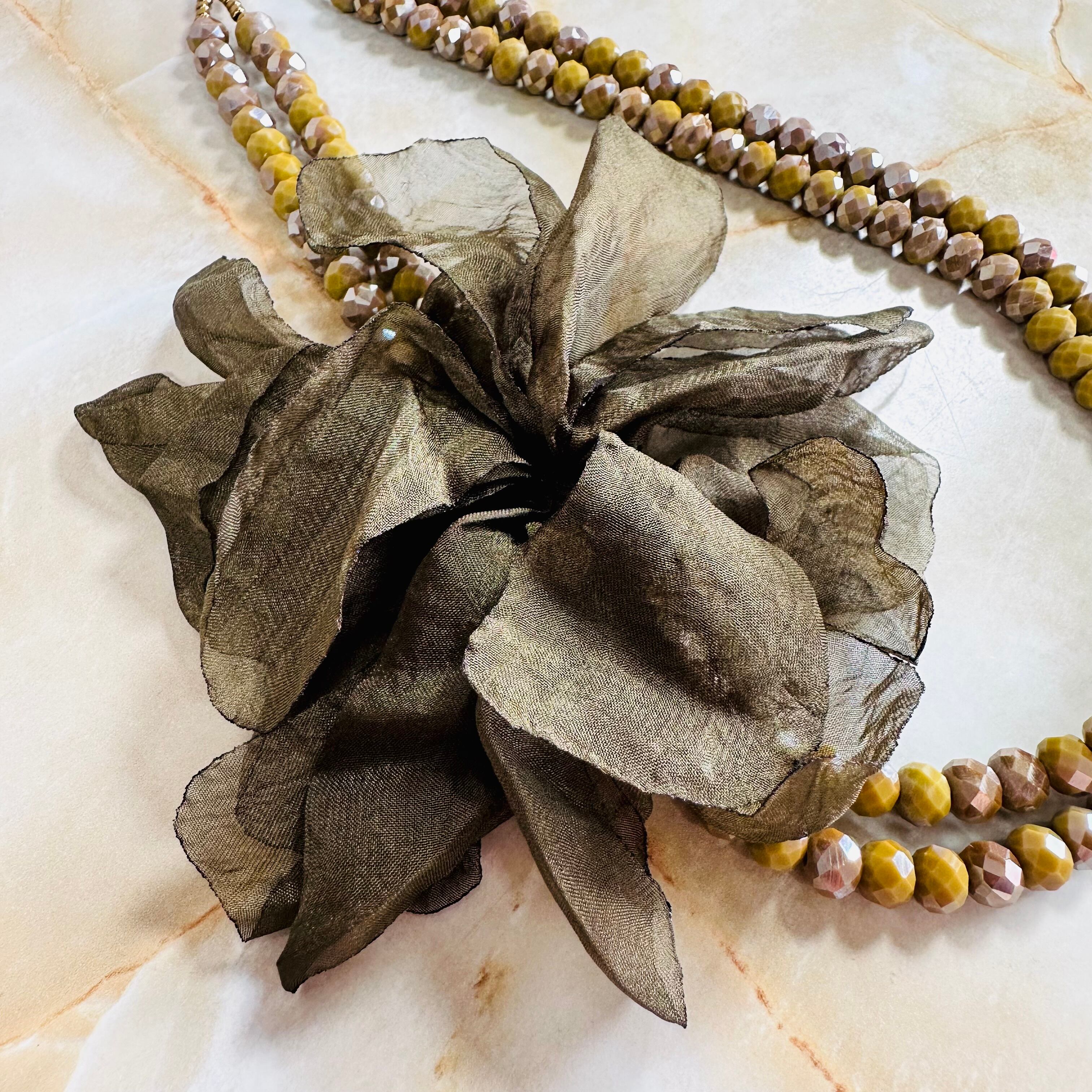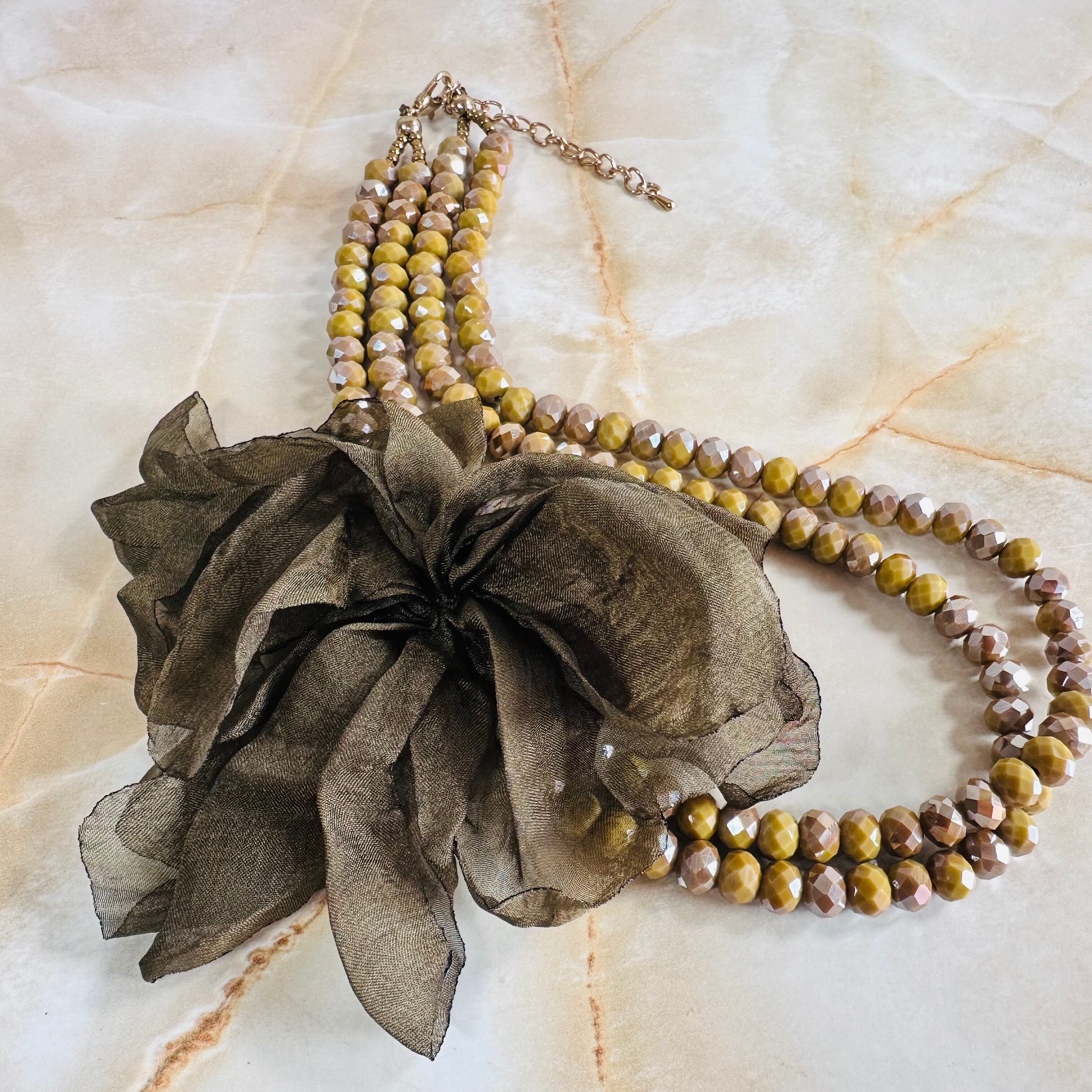 オーロラ調に輝くガラスビーズにオーガンジーのフラワーモチーフを取り付けたフェミニンなデザインです♡