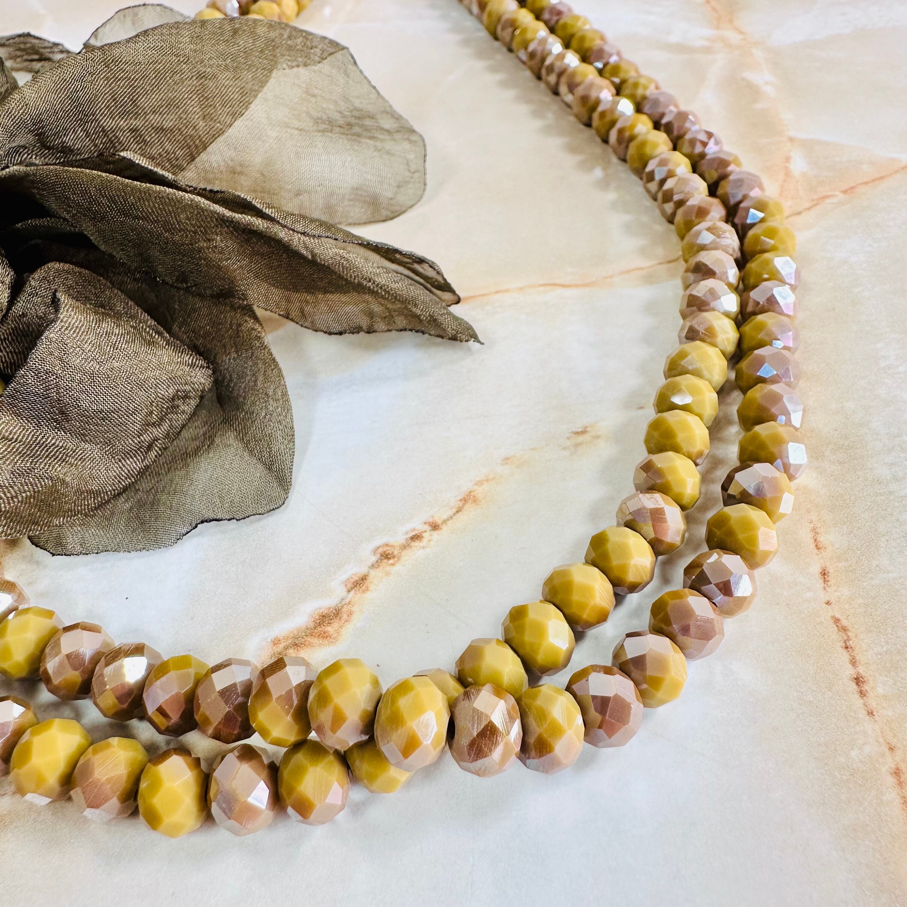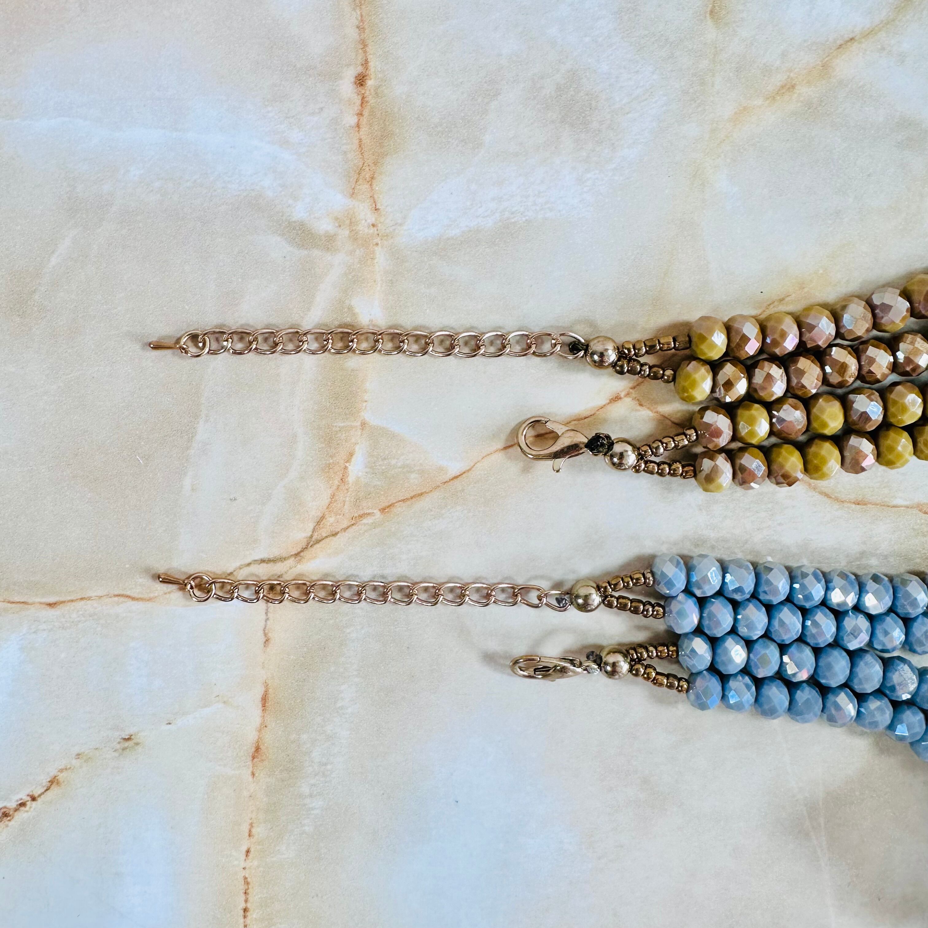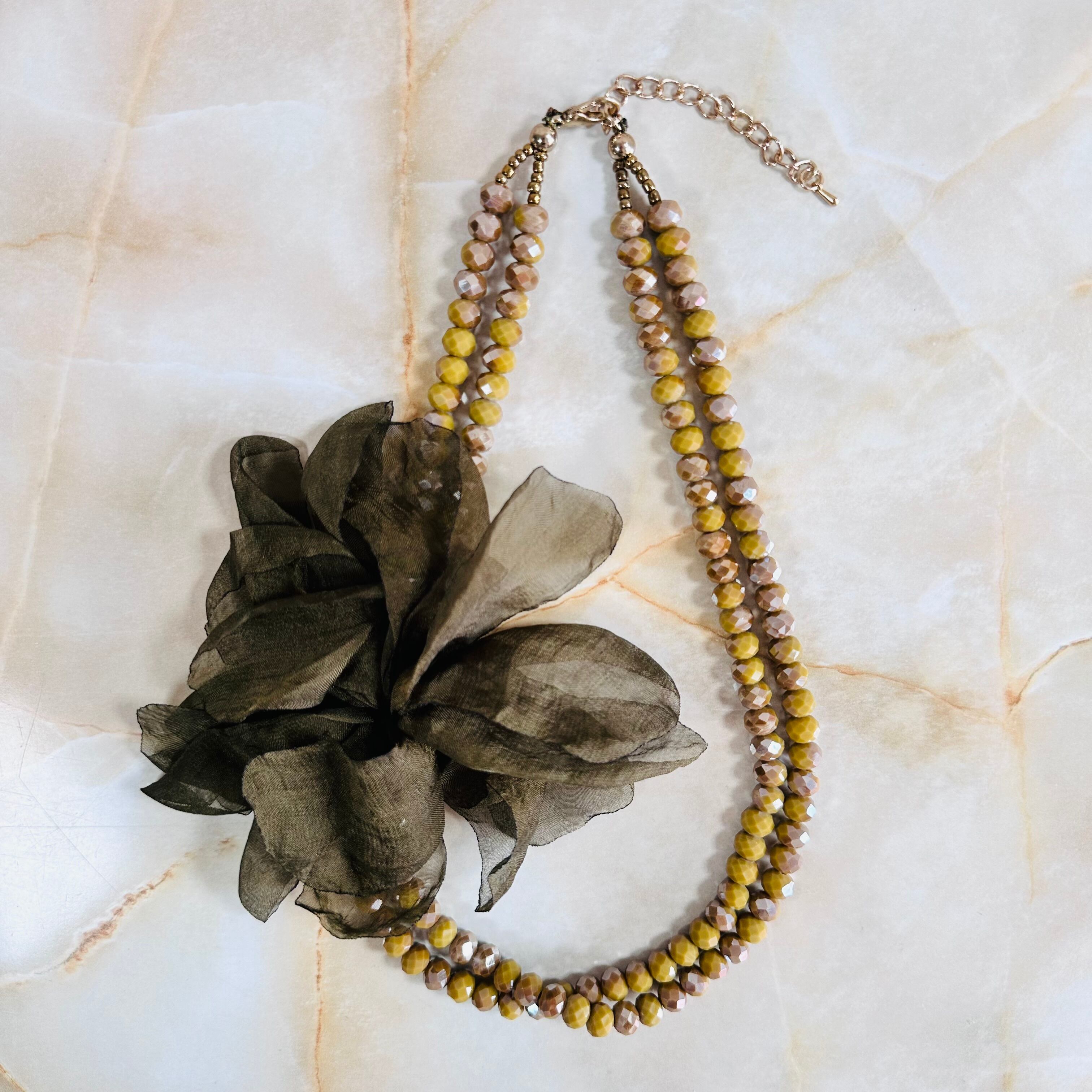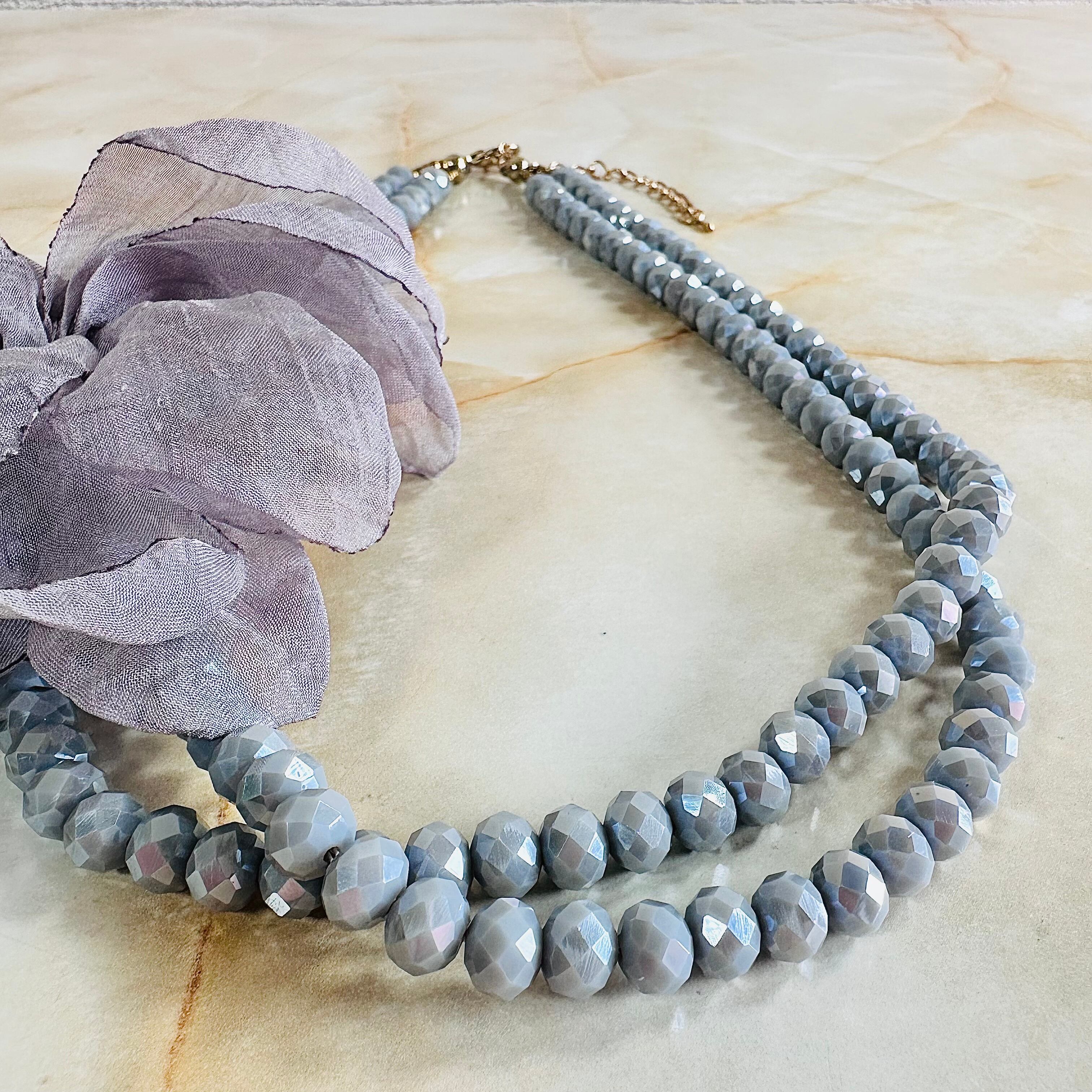 オーロラ調に輝くガラスビーズにオーガンジーのフラワーモチーフを取り付けたフェミニンなデザインです♡