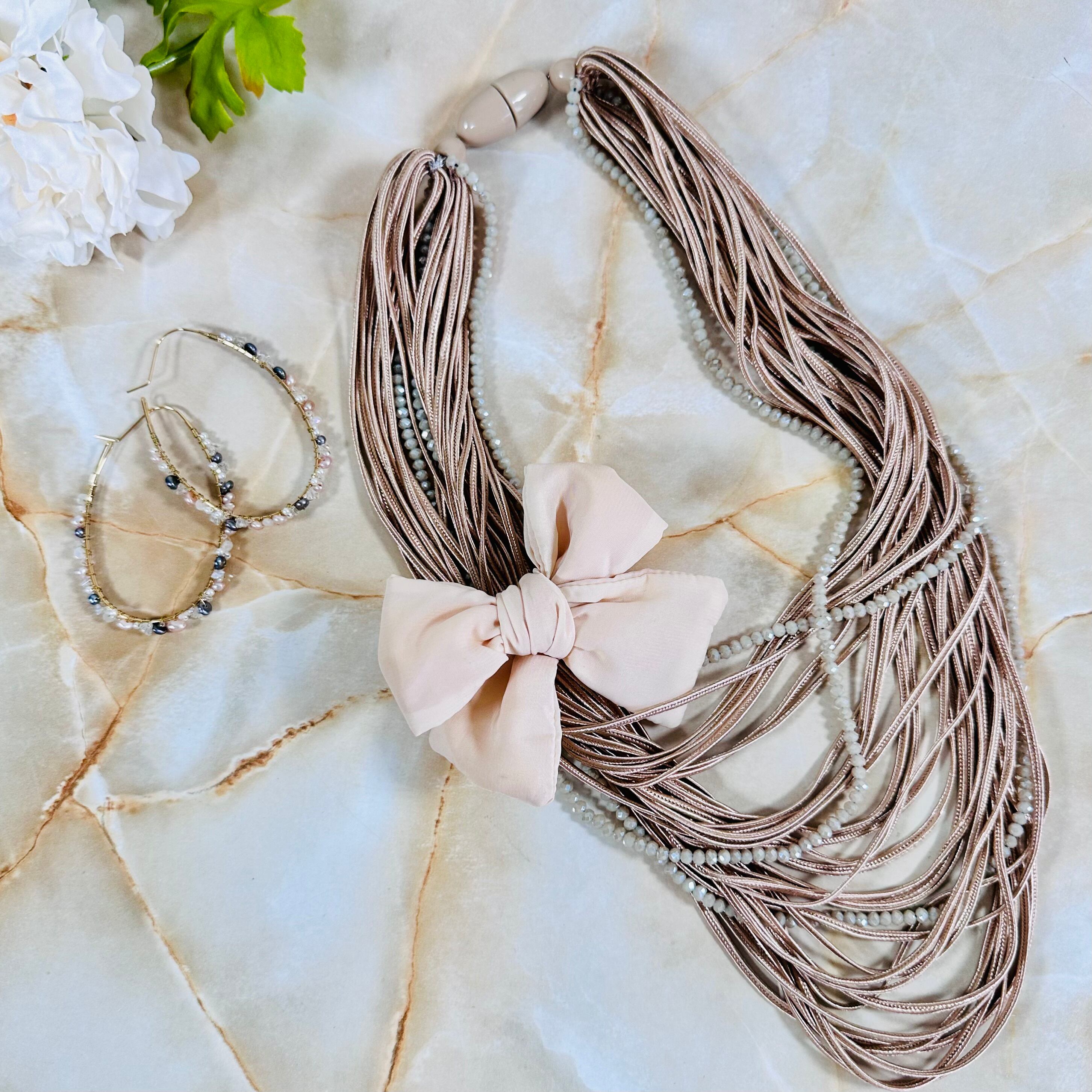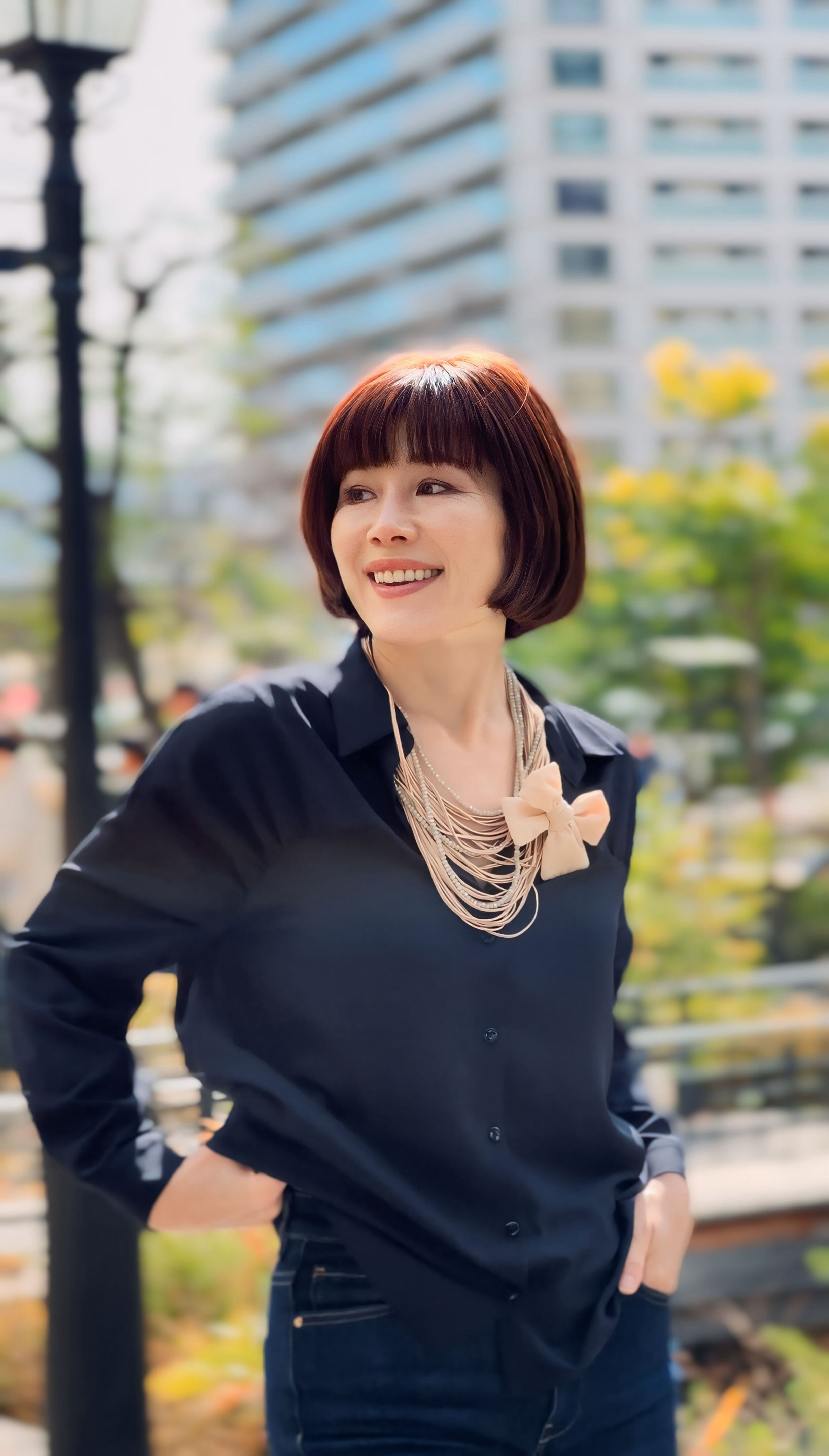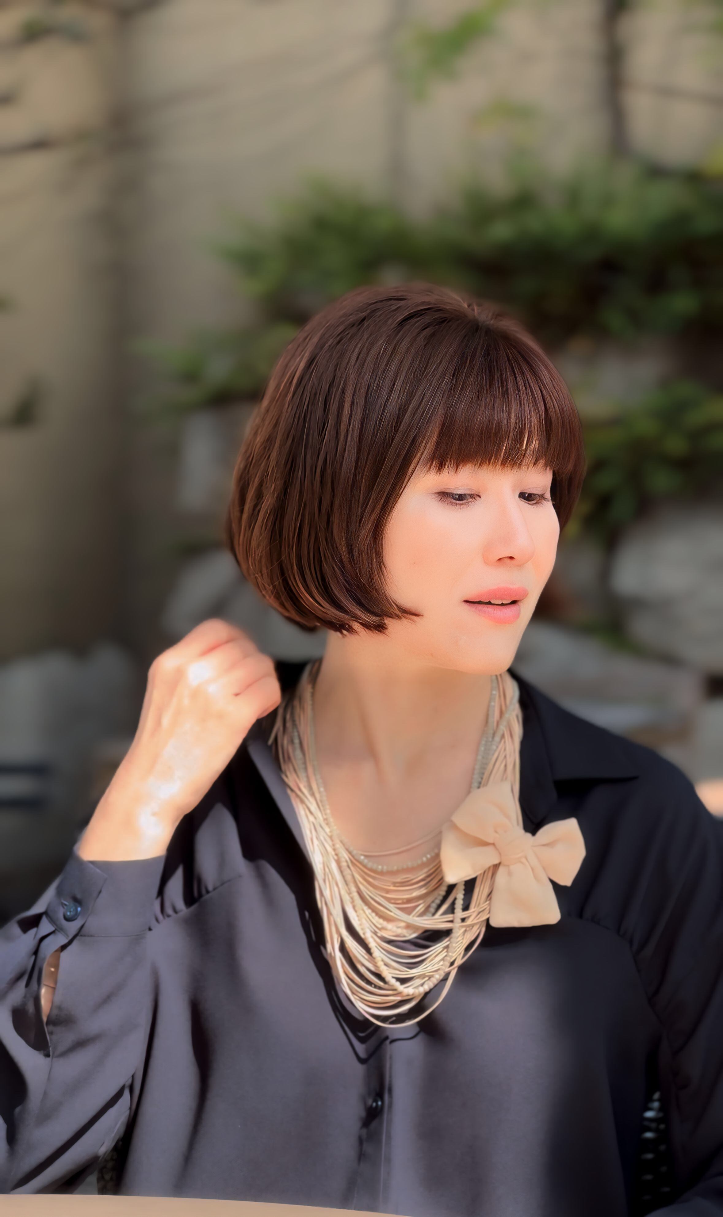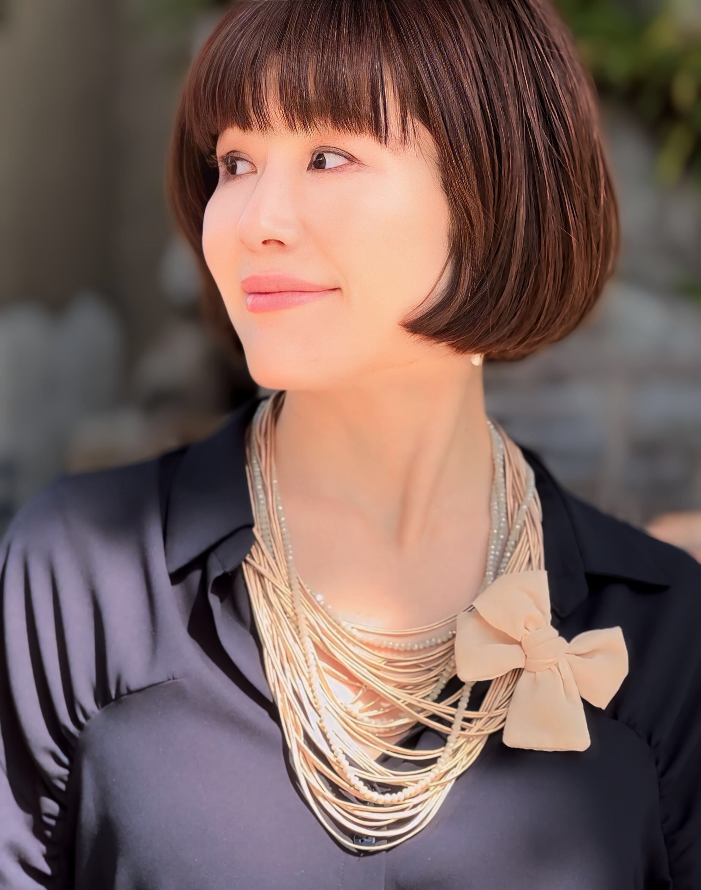 リボンブローチのキュートな印象とネックレスのコンビネーションが「大人可愛い」を叶えてくれます。