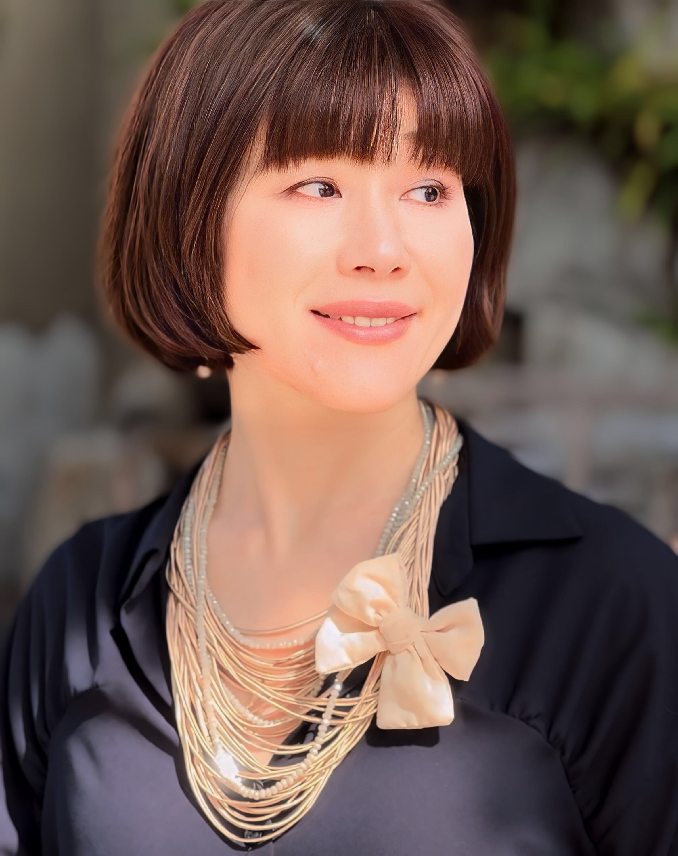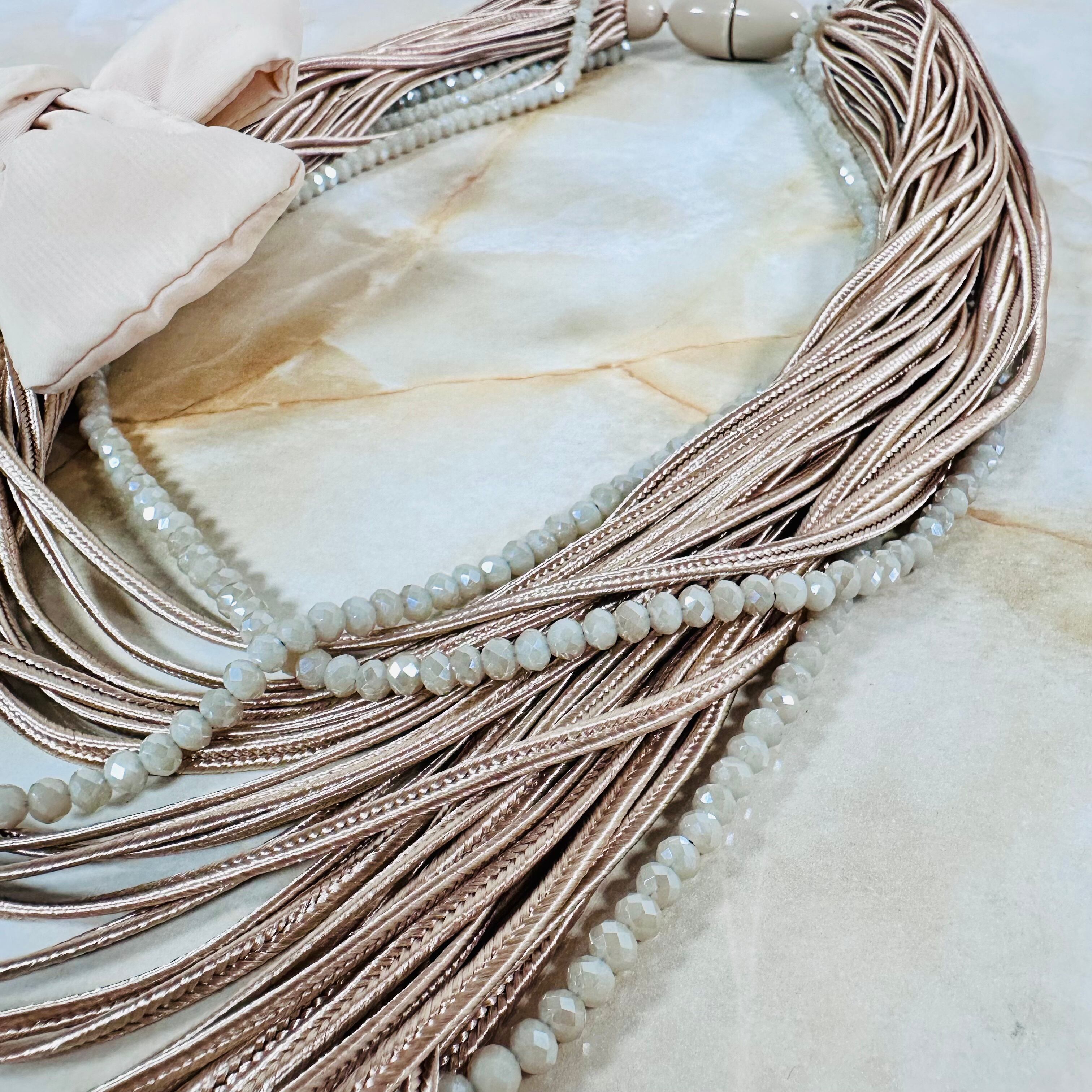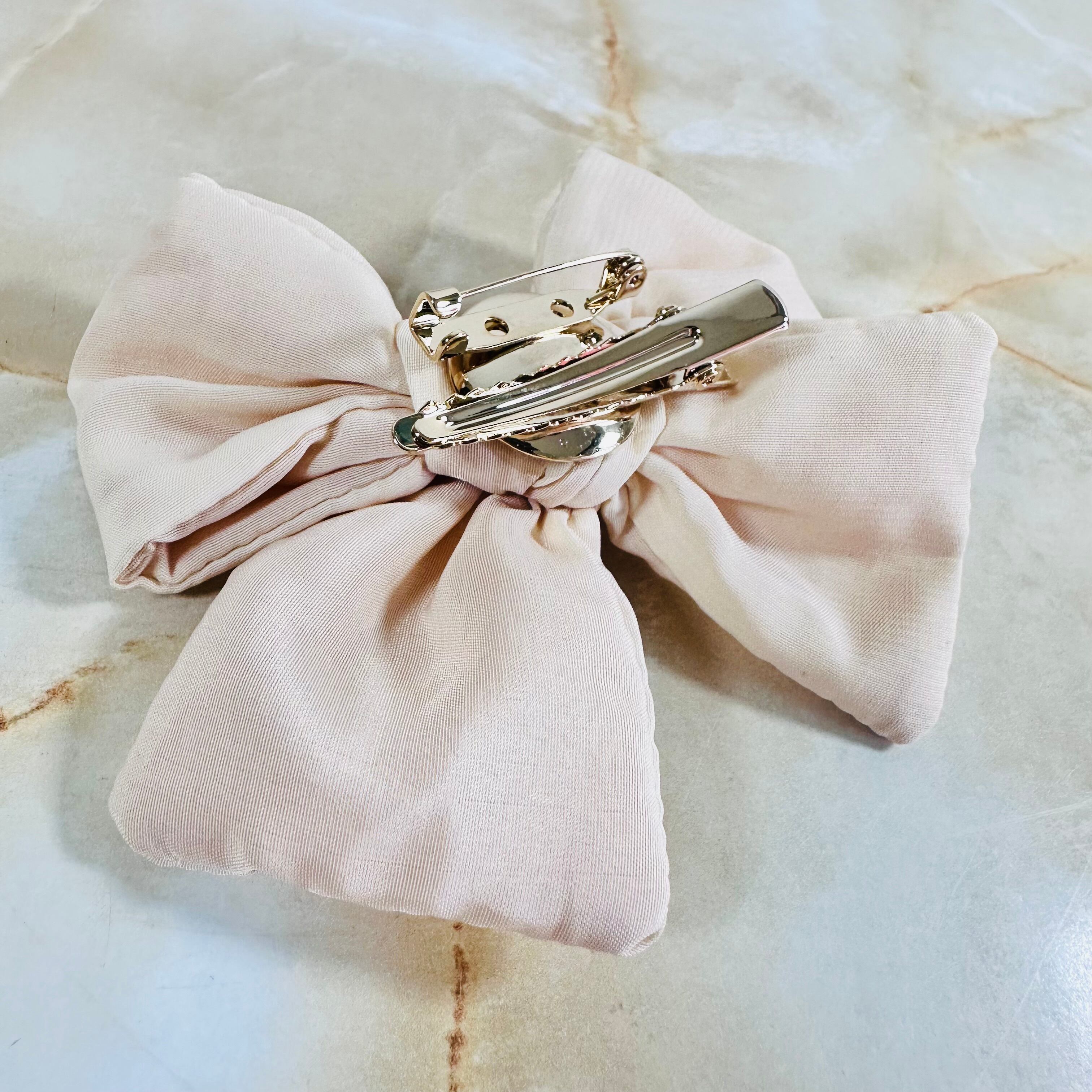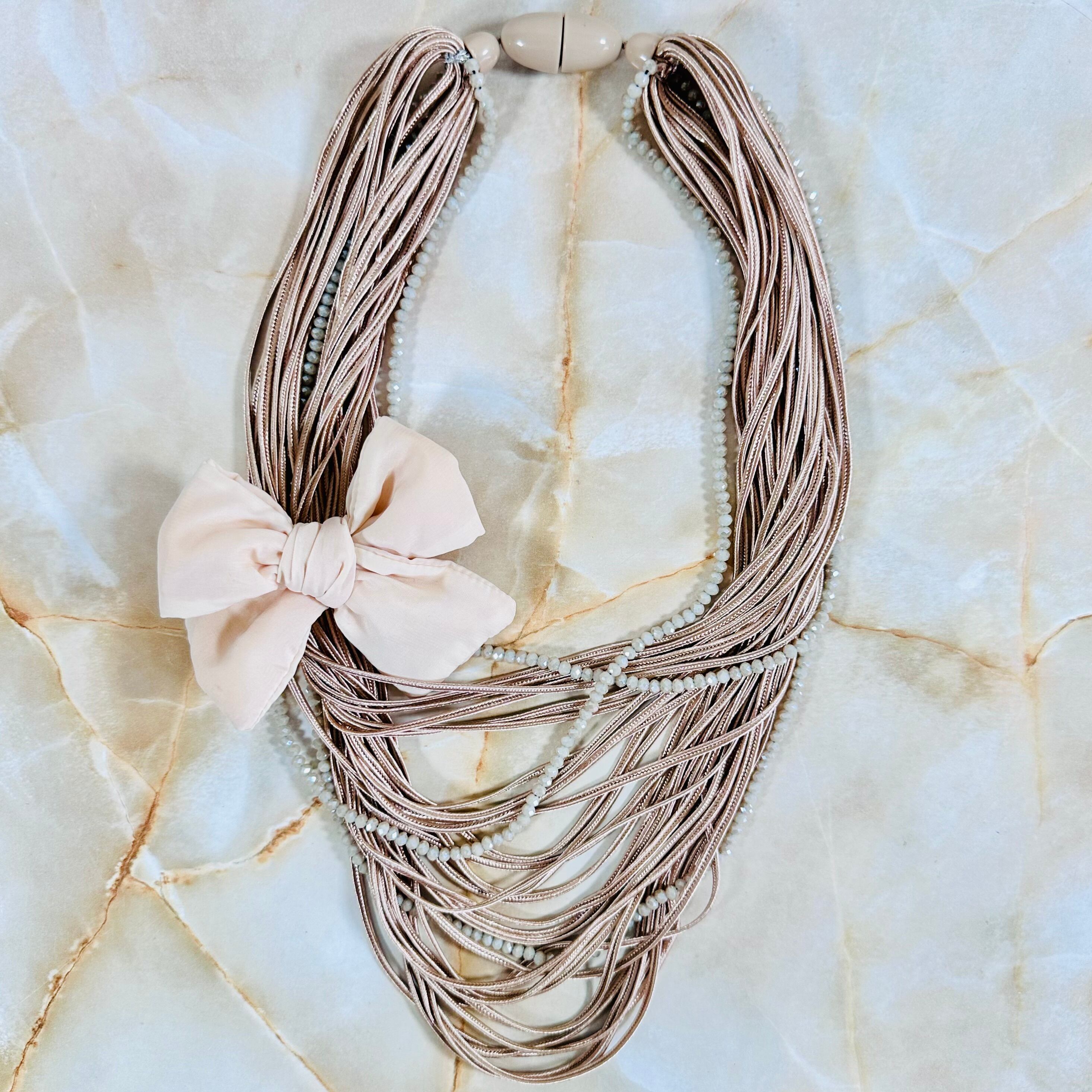 リボンブローチのキュートな印象とネックレスのコンビネーションが「大人可愛い」を叶えてくれます。