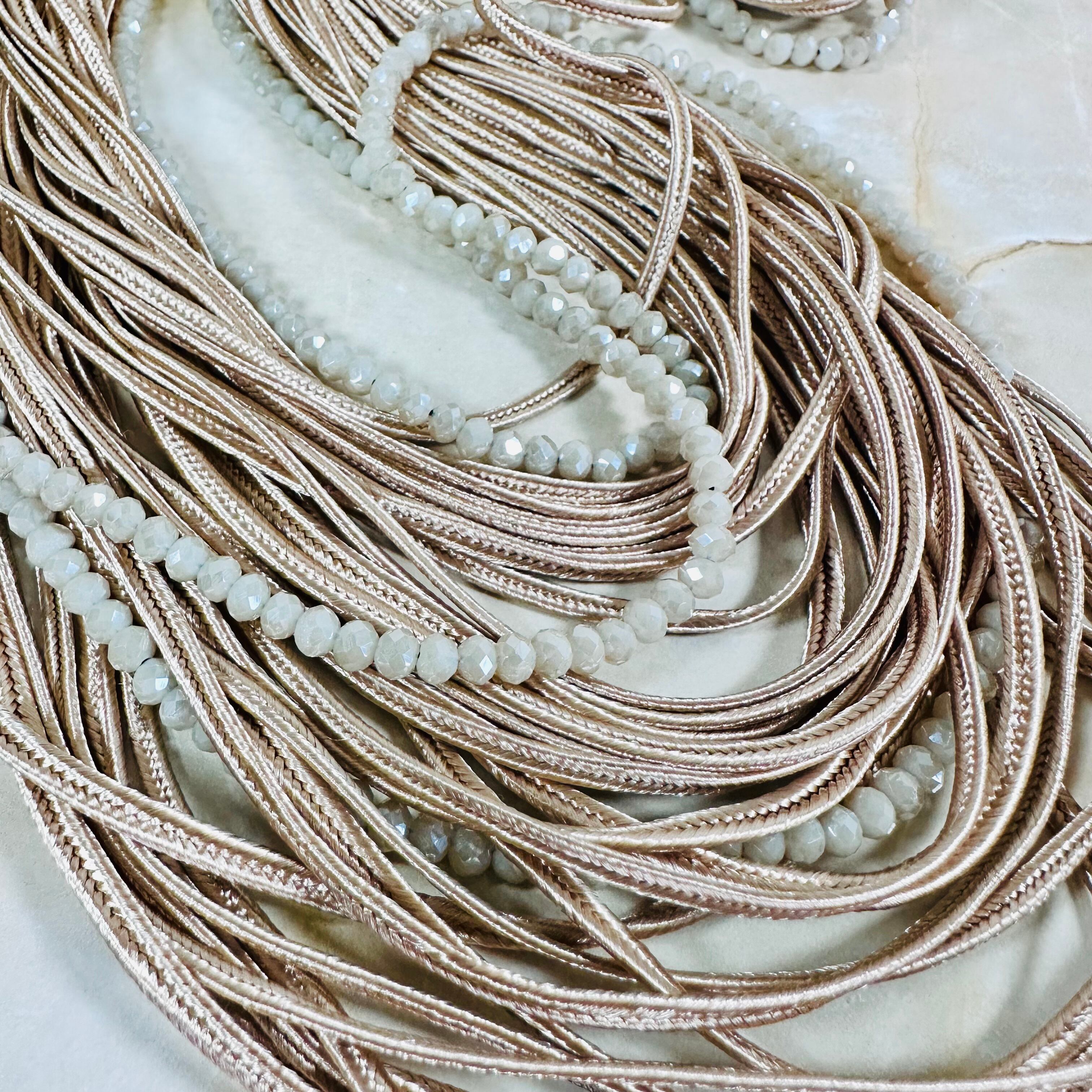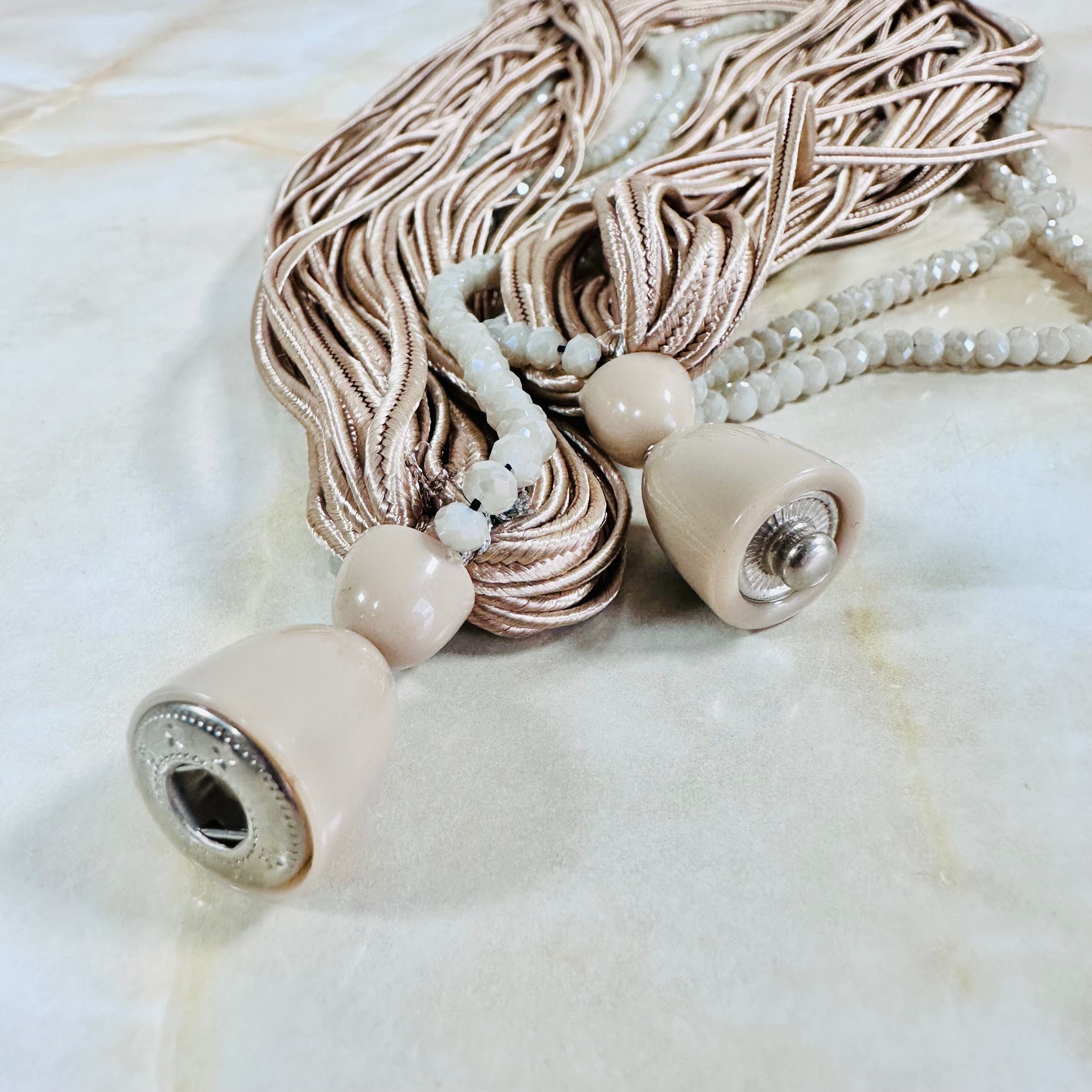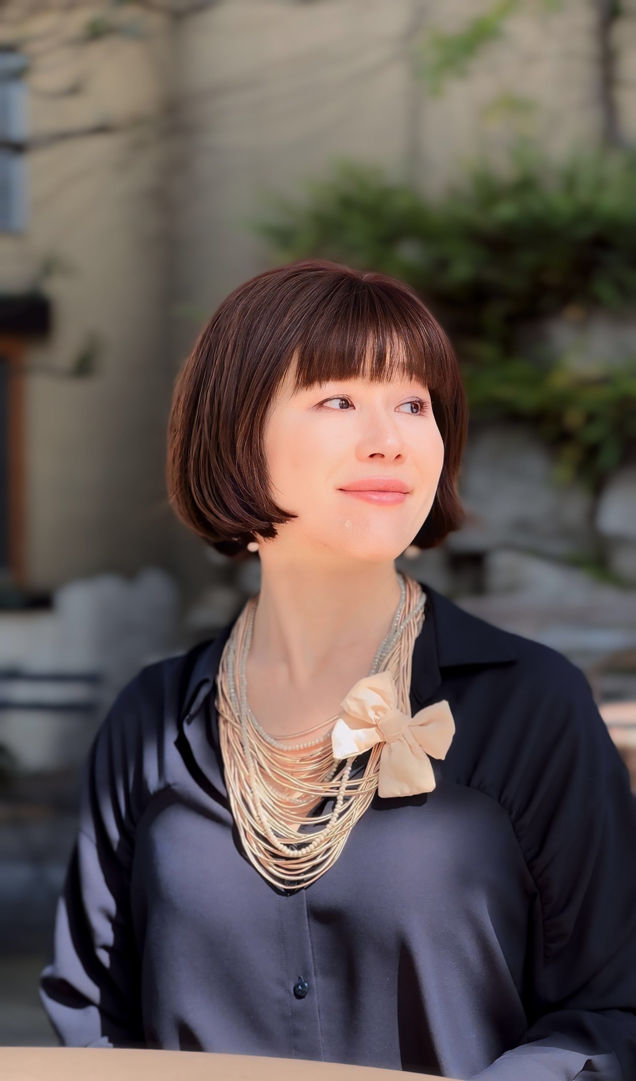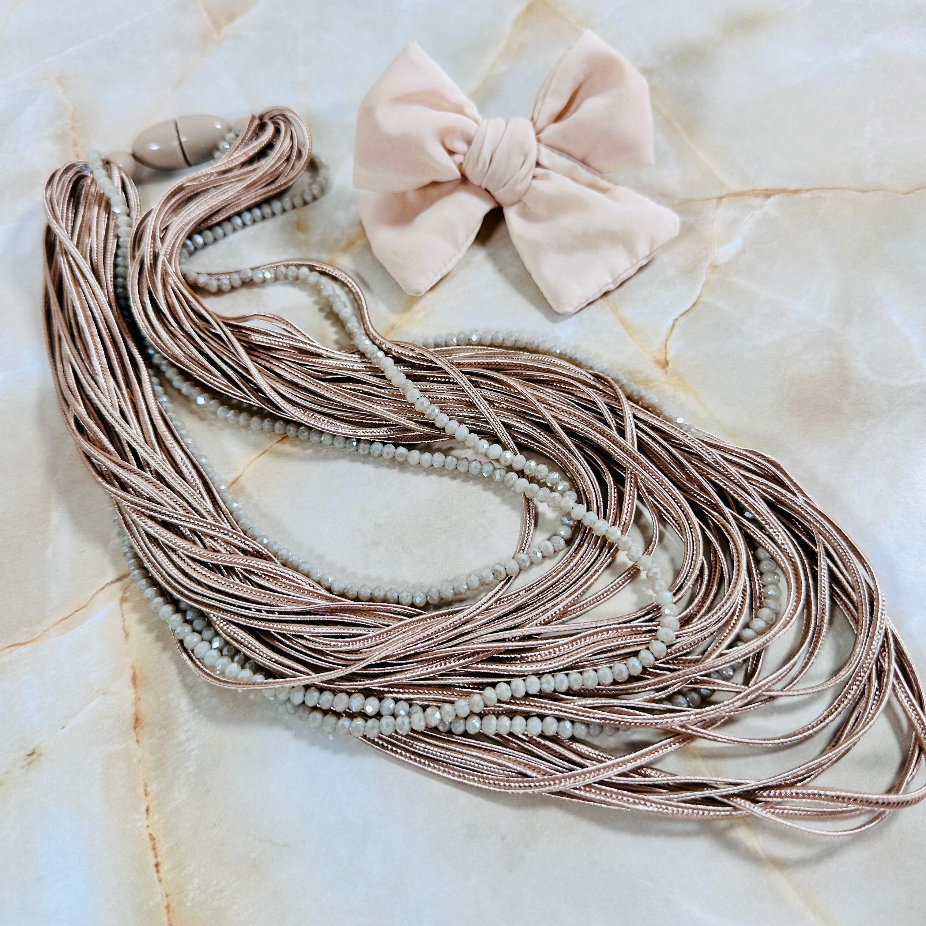 リボンブローチのキュートな印象とネックレスのコンビネーションが「大人可愛い」を叶えてくれます。