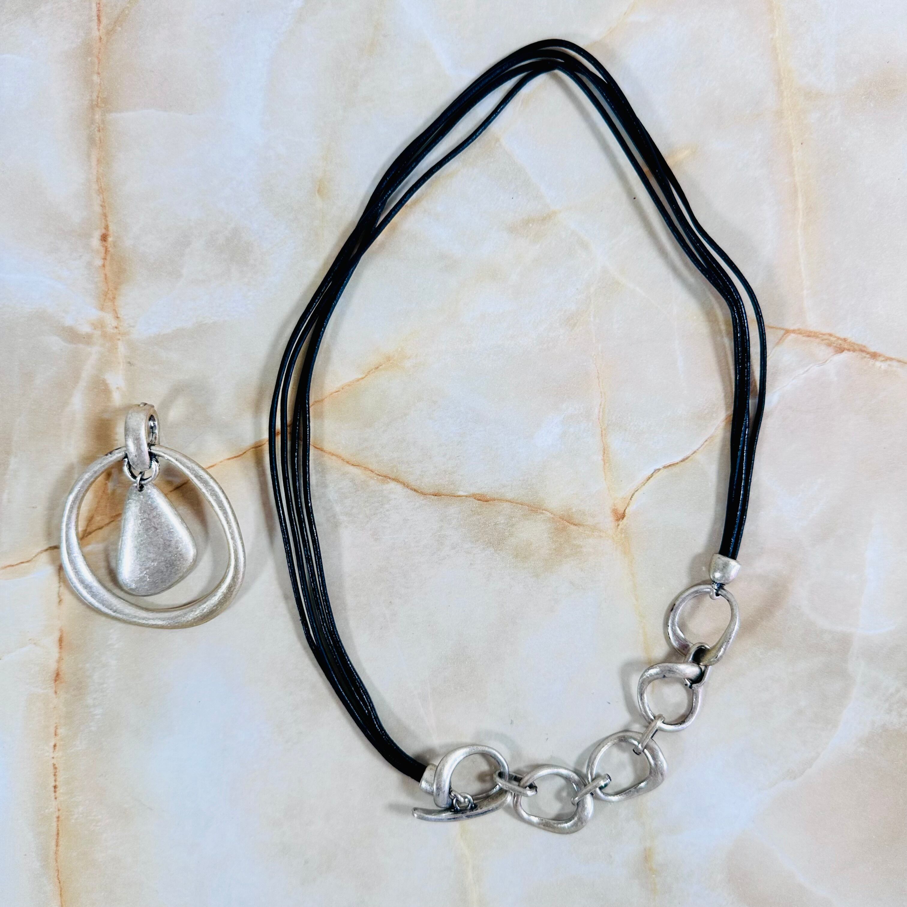 ブラックのコードに合わせたアンティーク調のマットなシルバーカラーのモチーフが目を惹くデザインです。
