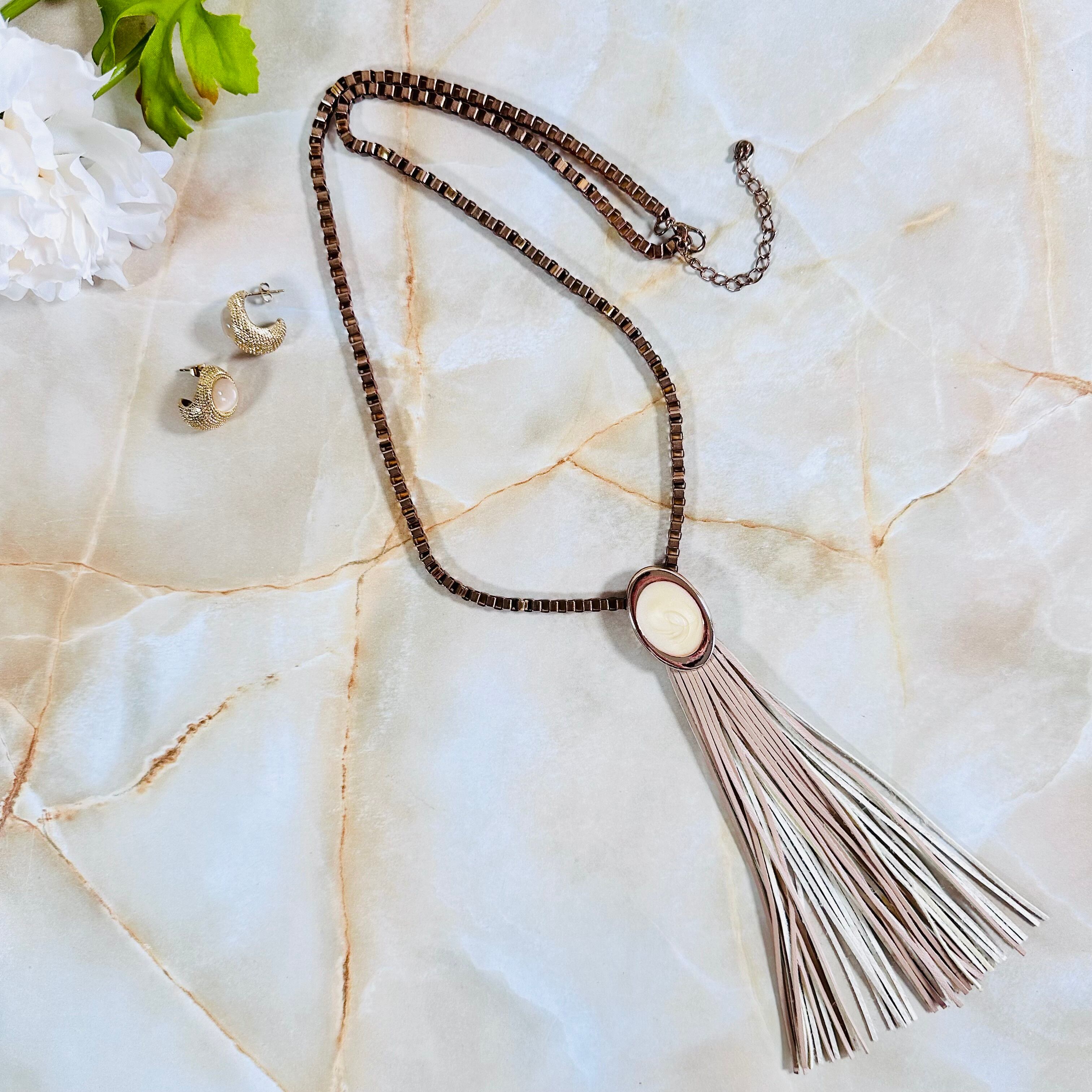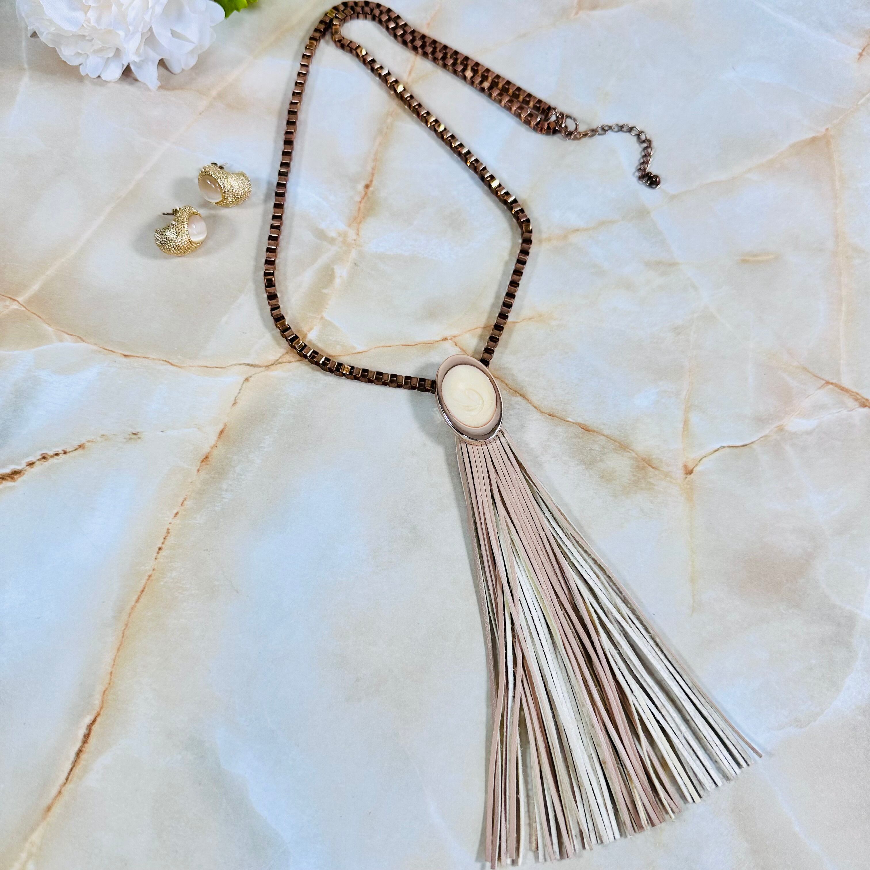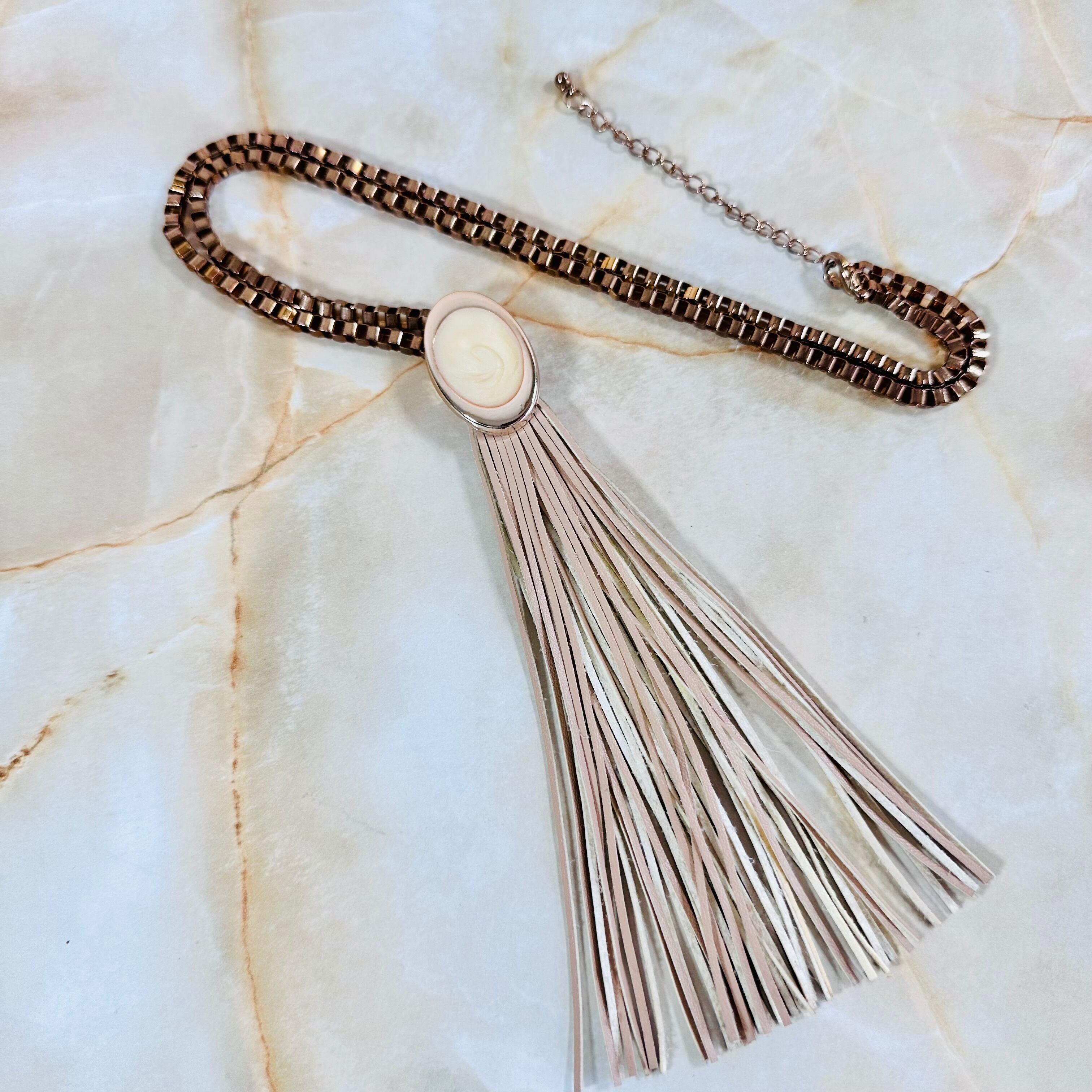上品なアイボリーなパーツにレザーのフリンジを組み合わせでアンティーク調に仕上げました。
