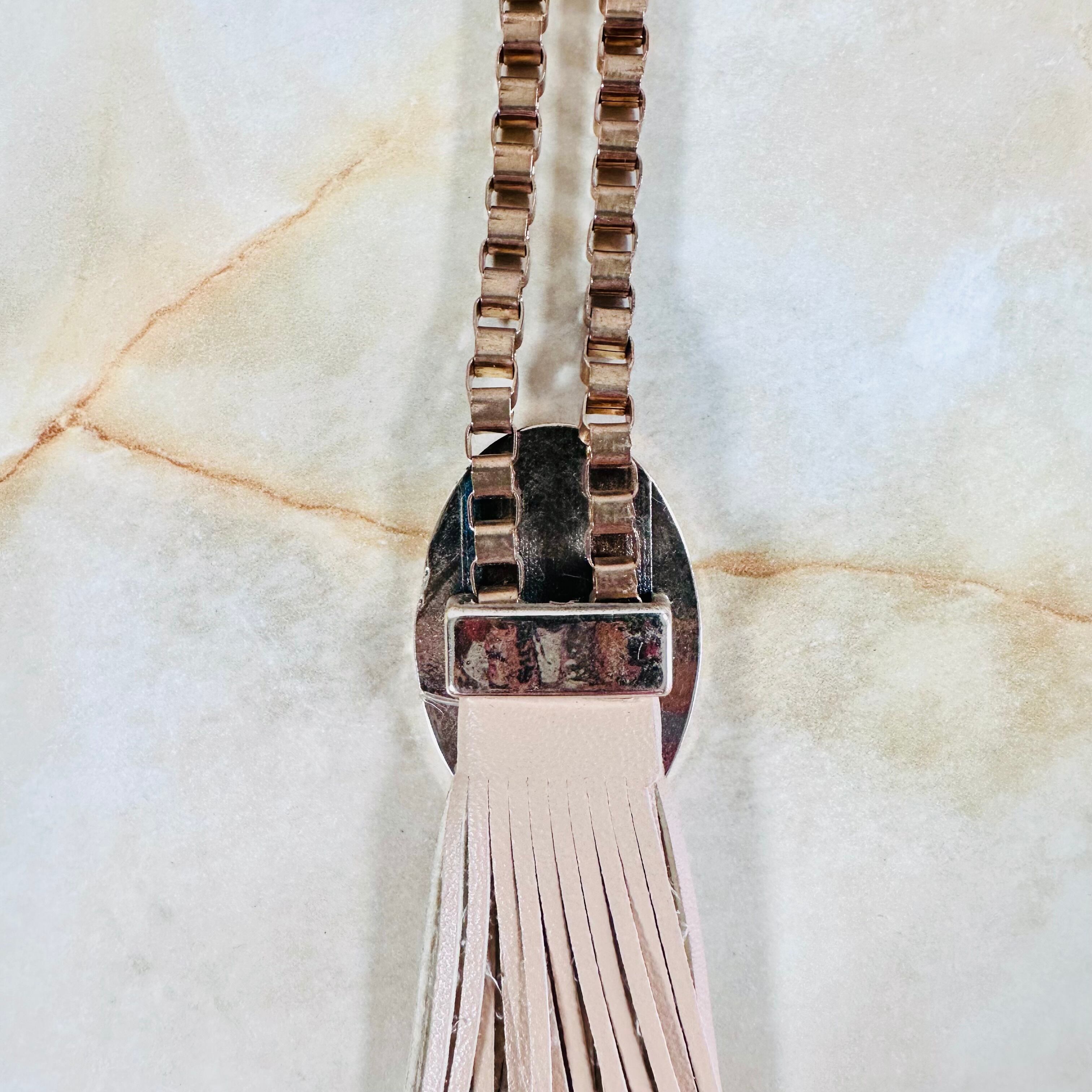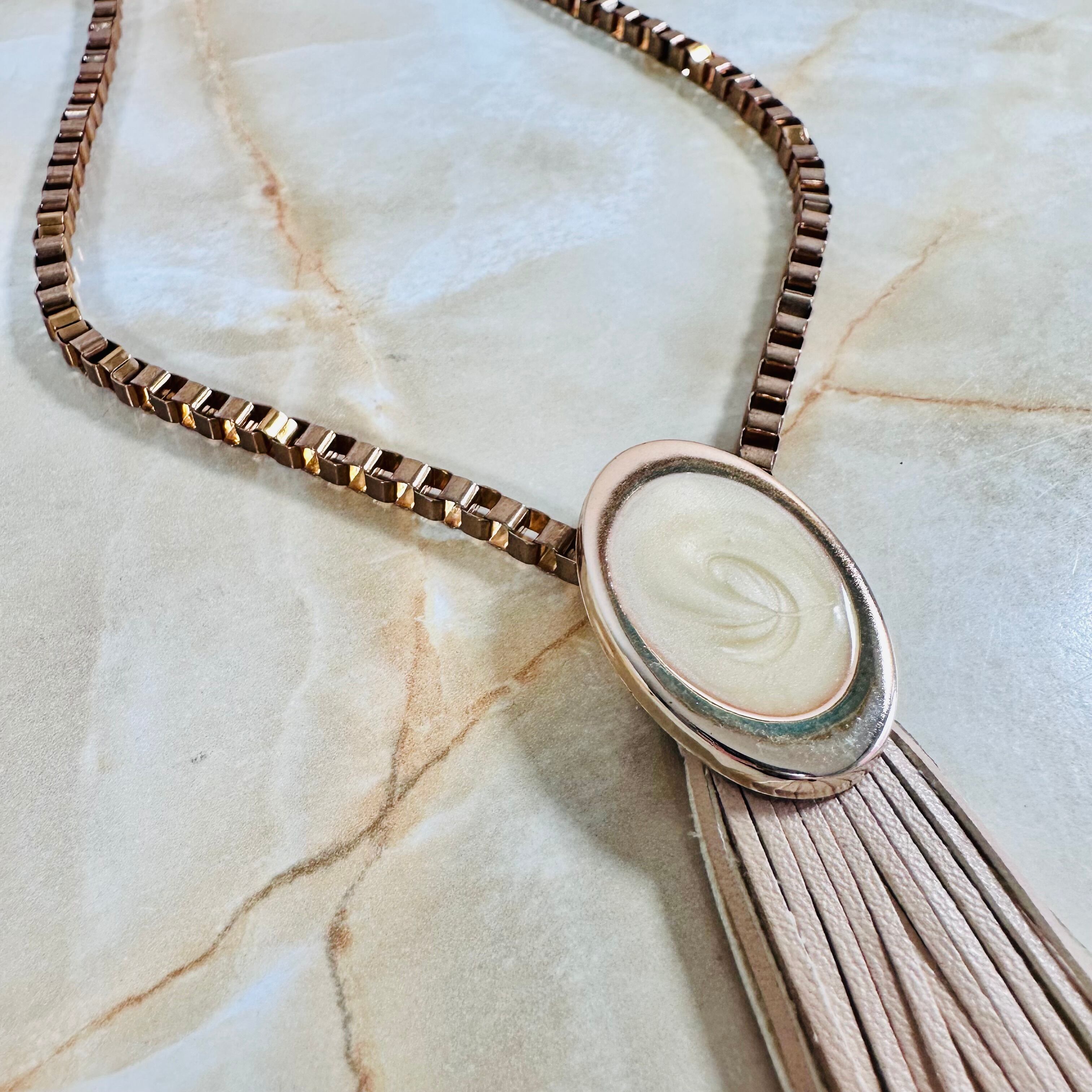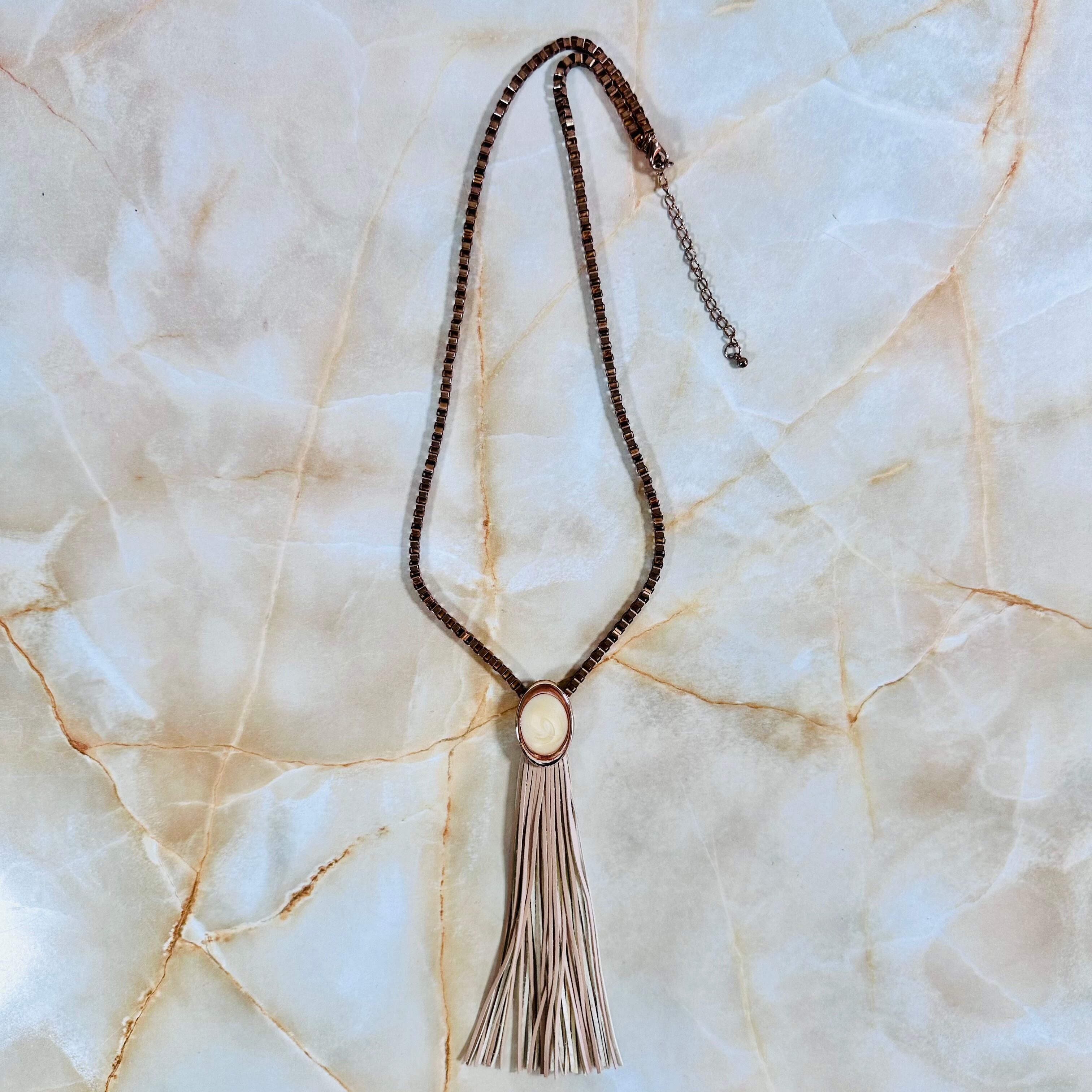 上品なアイボリーなパーツにレザーのフリンジを組み合わせでアンティーク調に仕上げました。