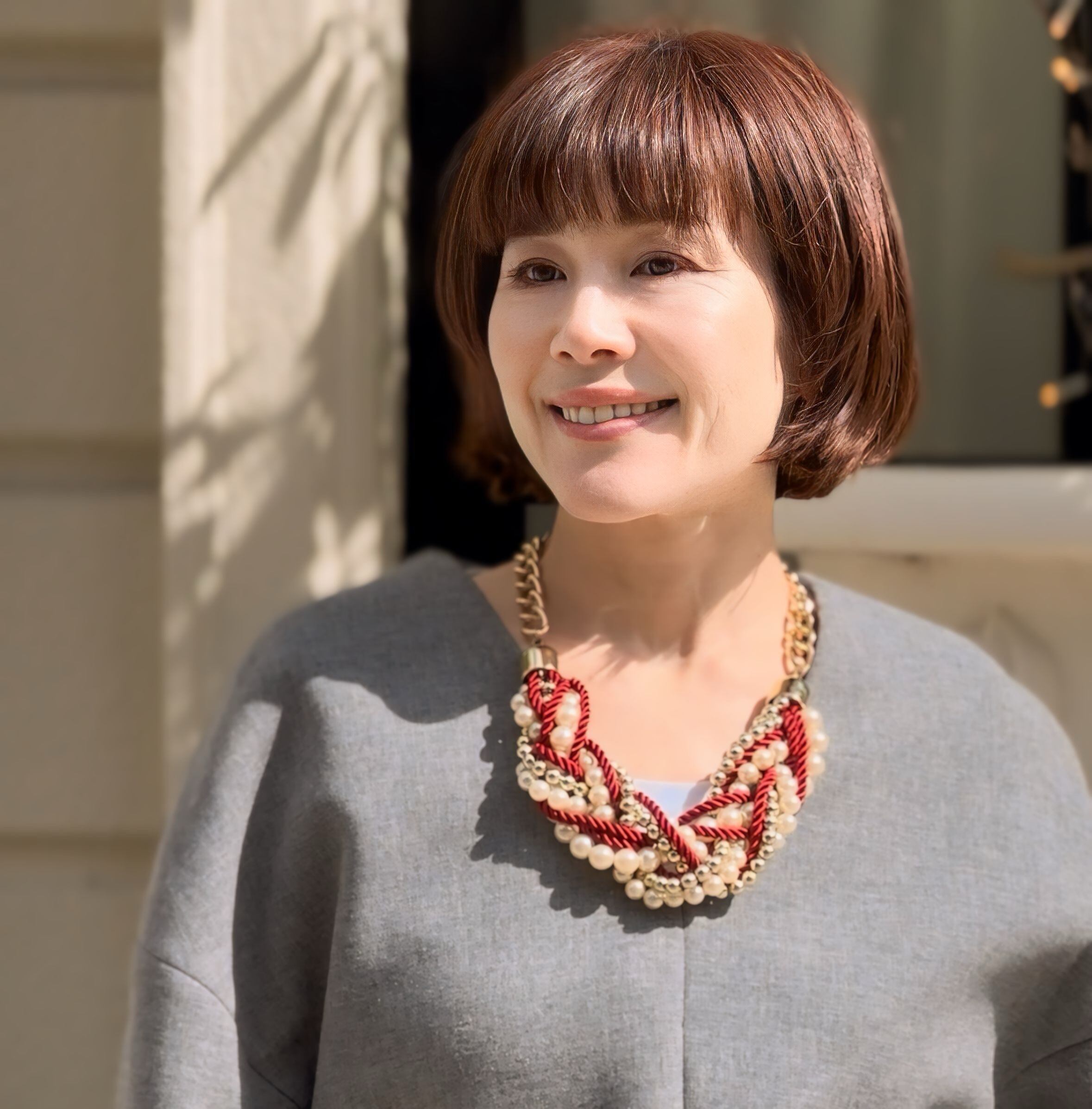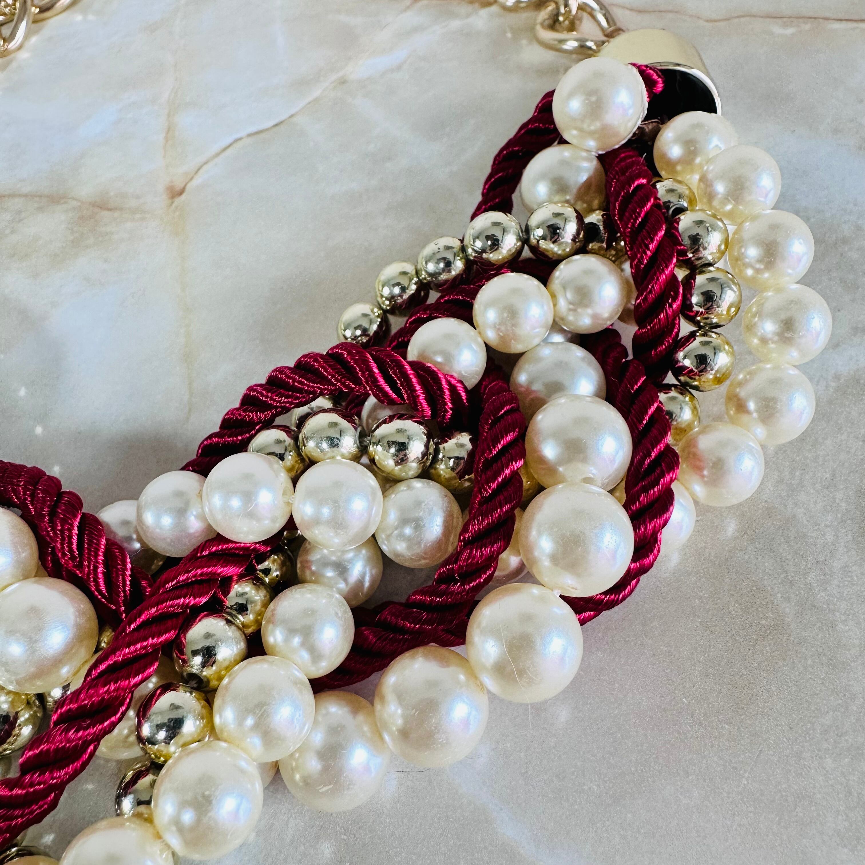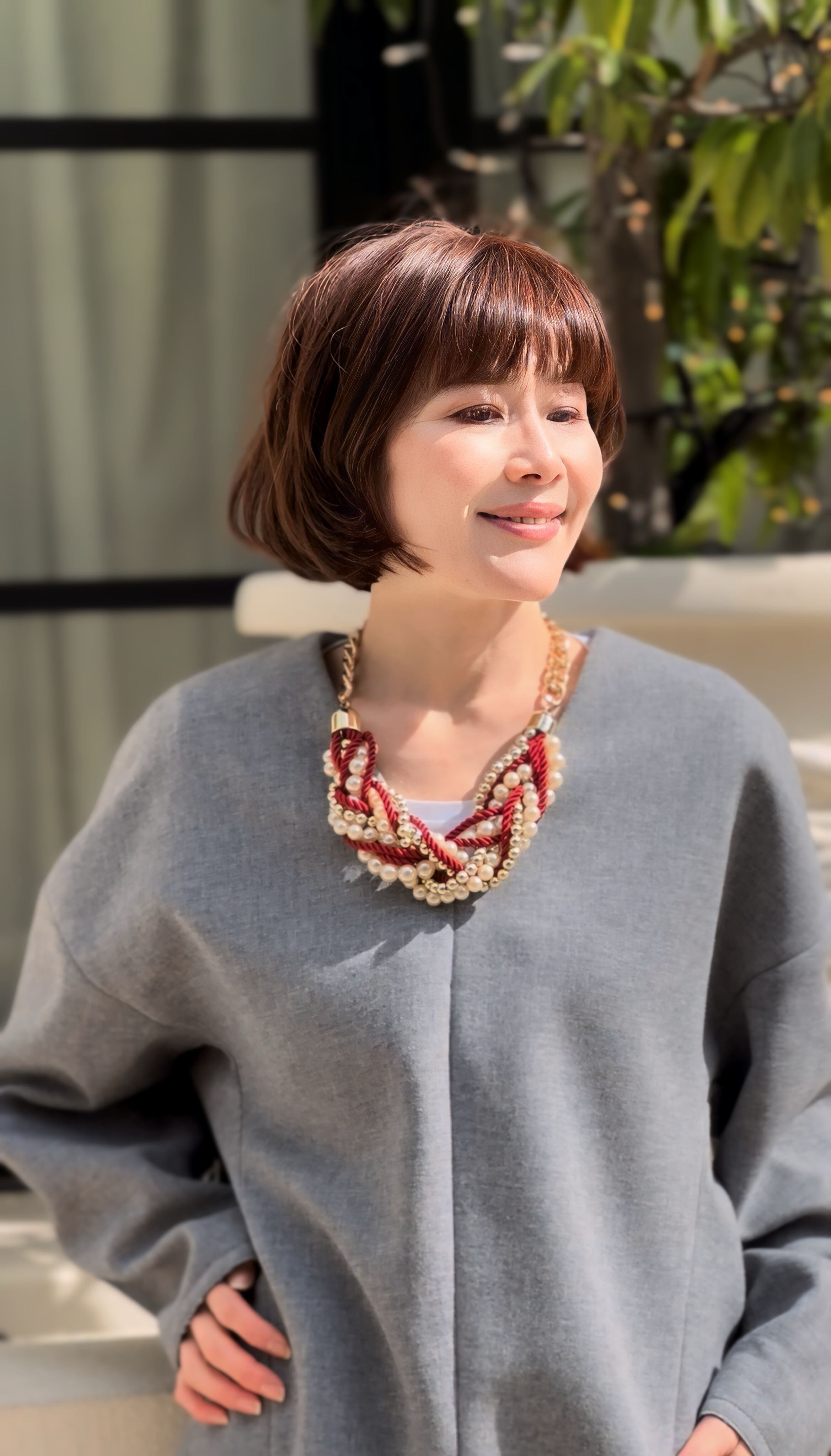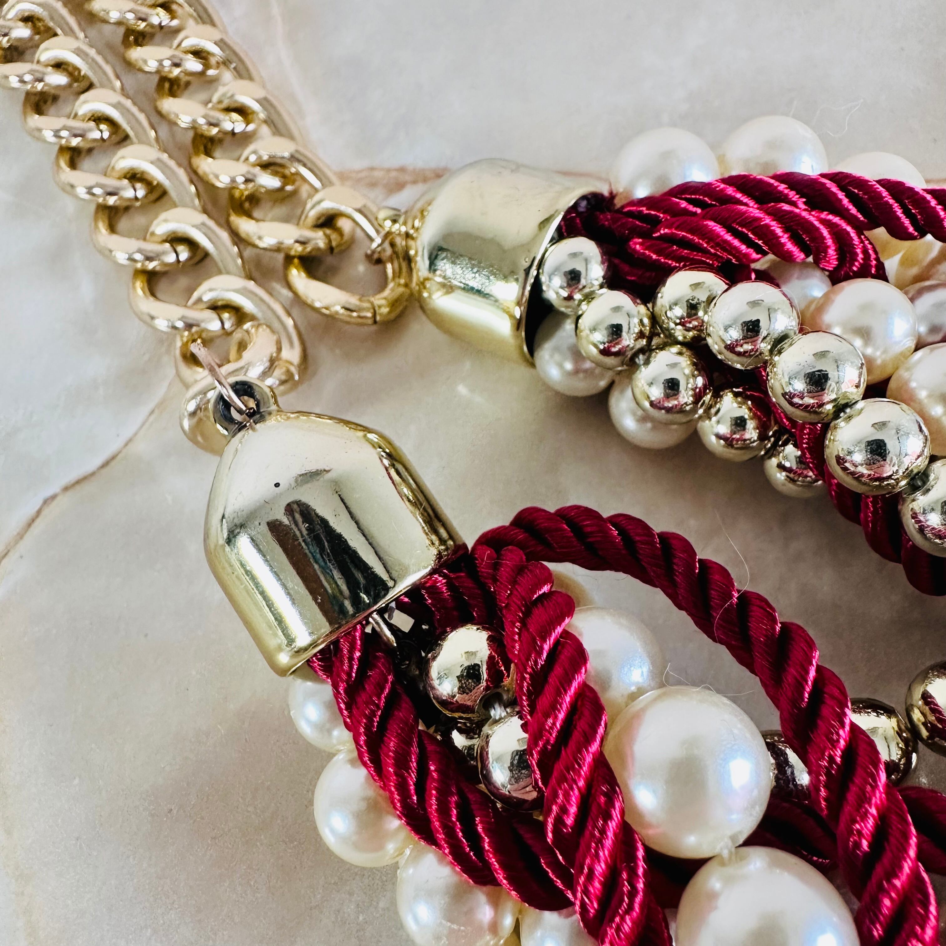 深めのレッドカラーのコードとパール、ゴールドビーズを編み込んでボリュームを強調したデザインに仕上げました。