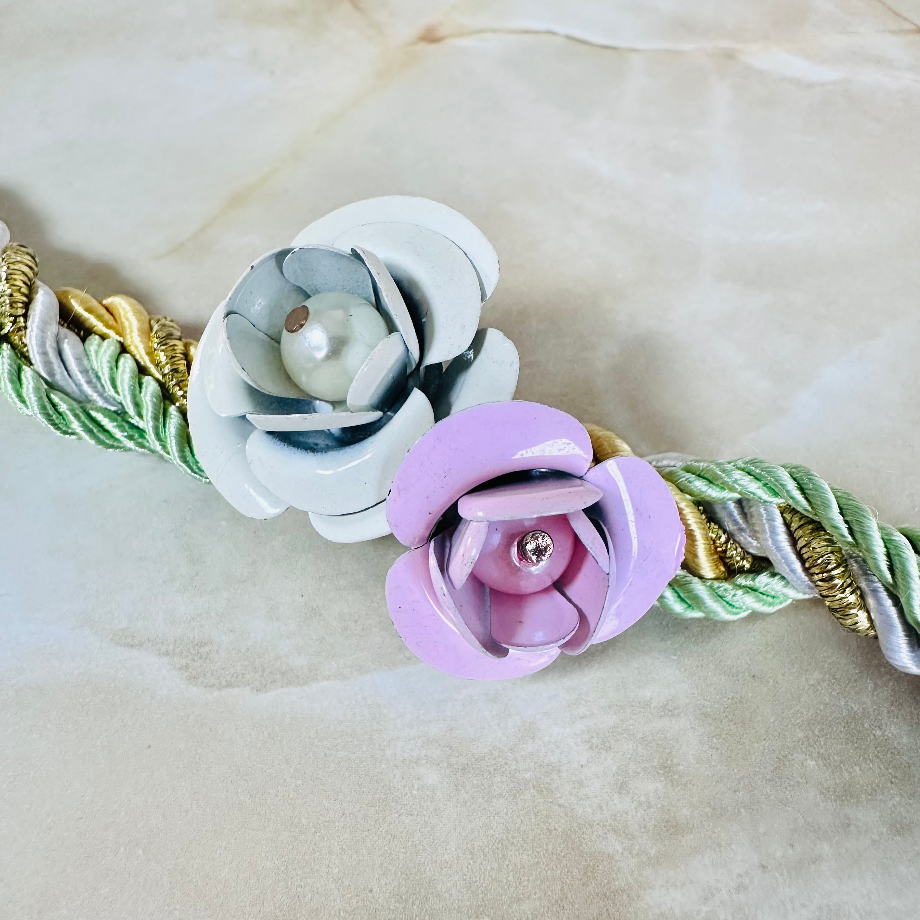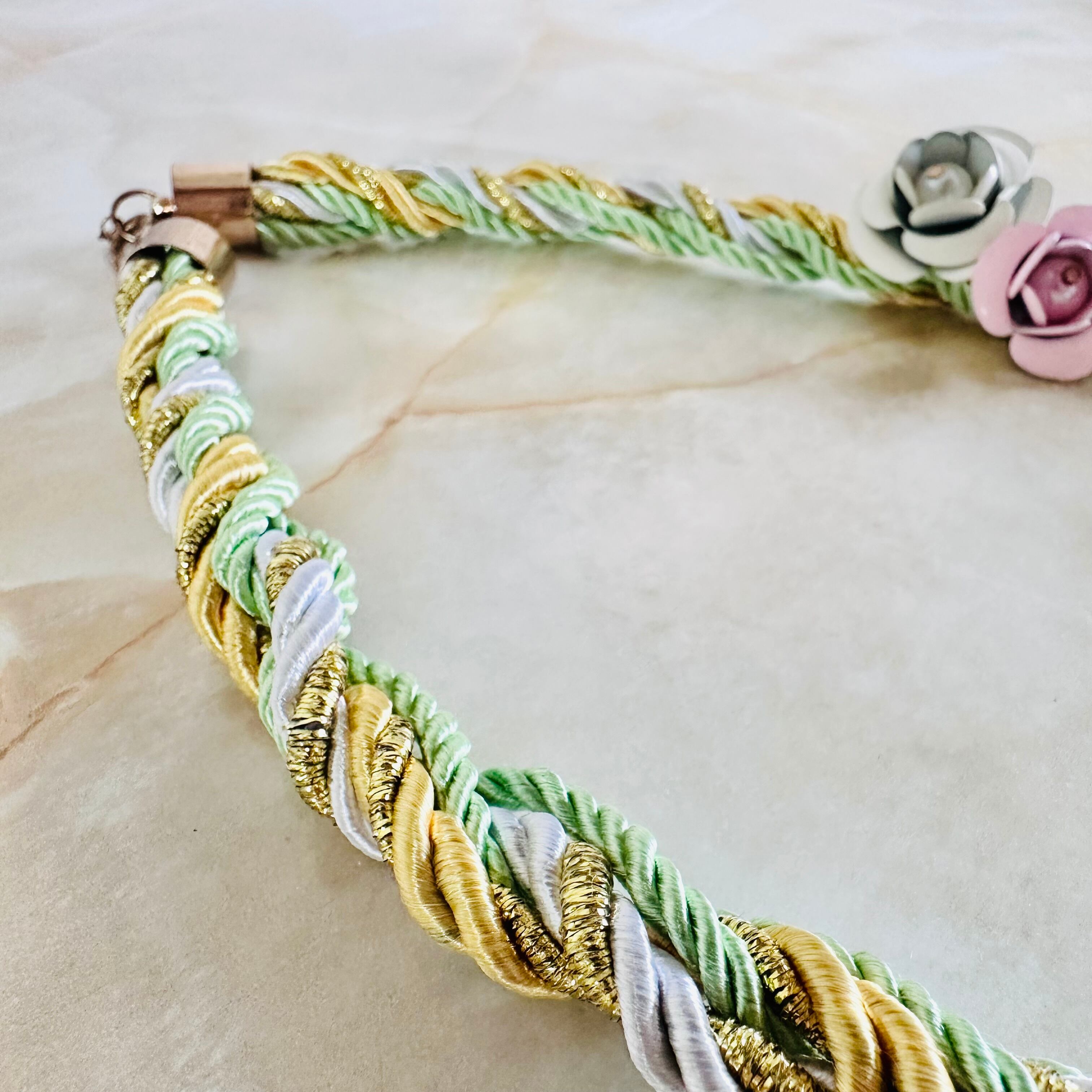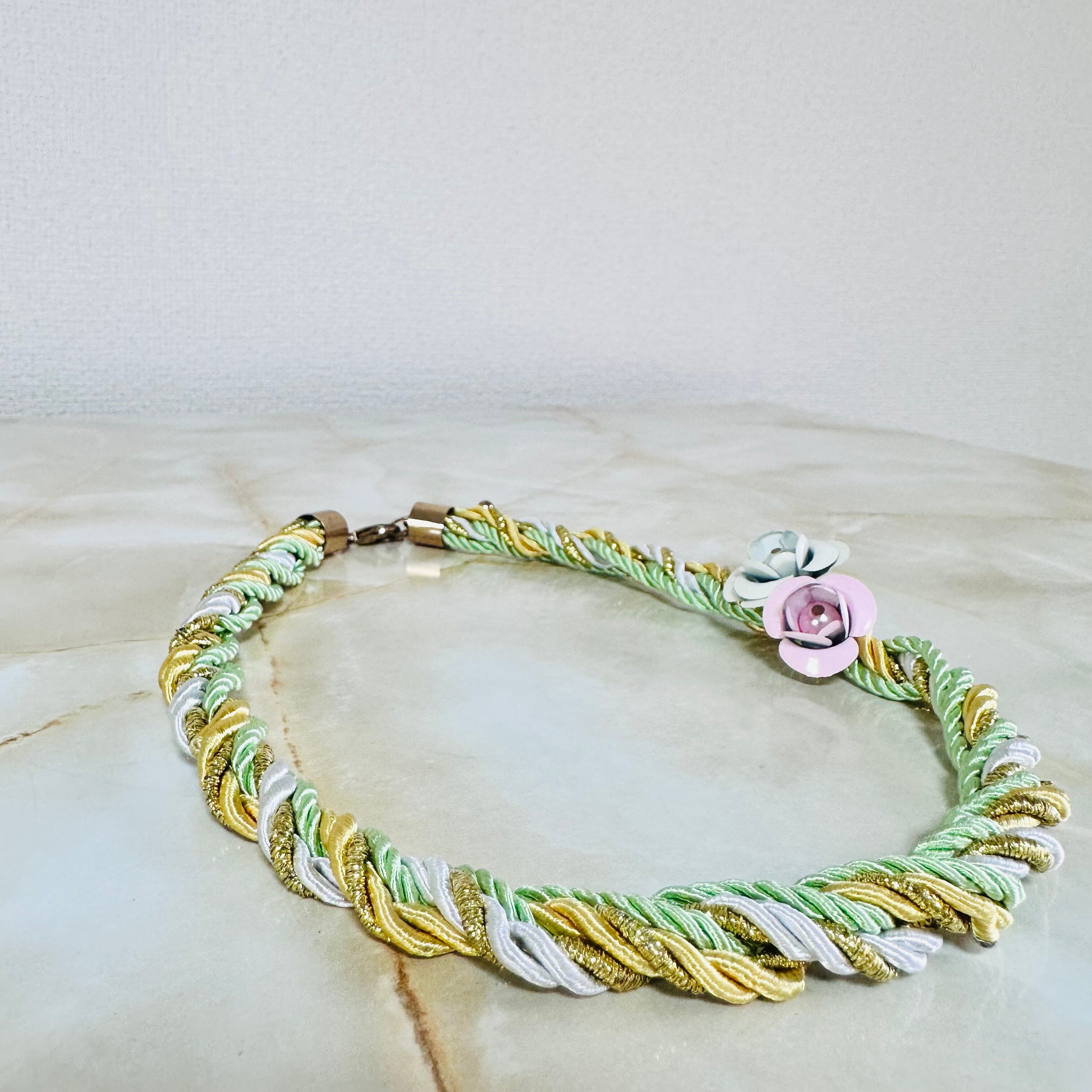 フレッシュなカラーのコードとゴールドをミックスし、キュートなフラワーをプラスしたフェミニンなデザインです。