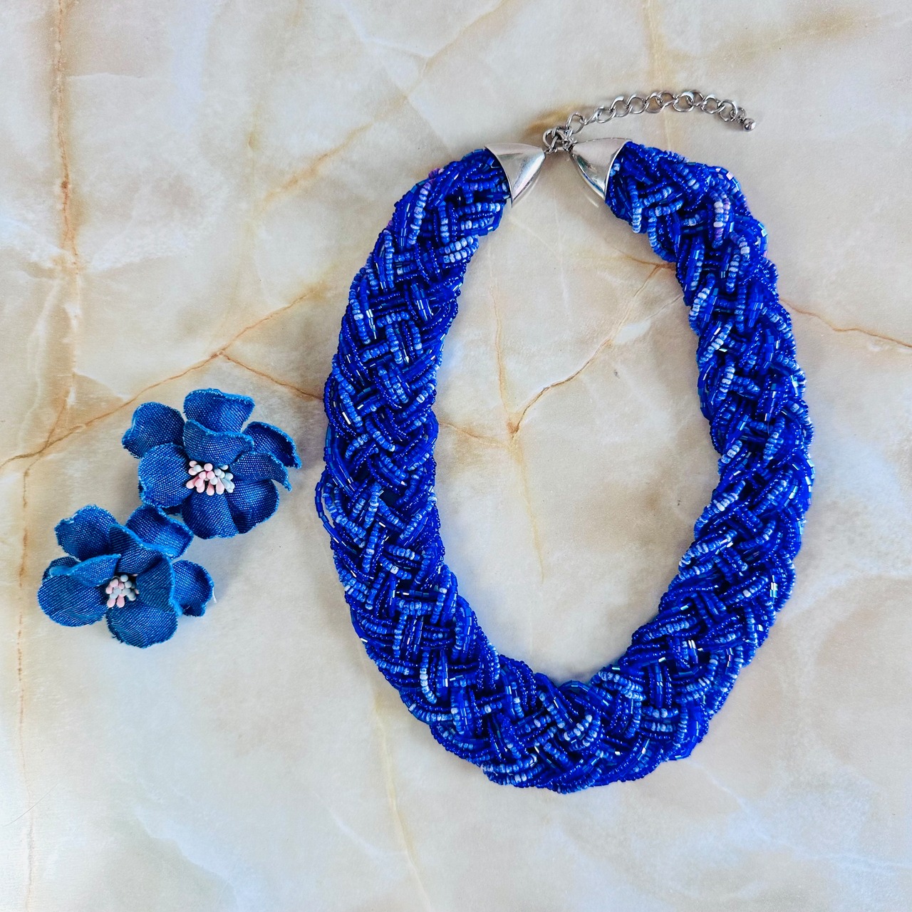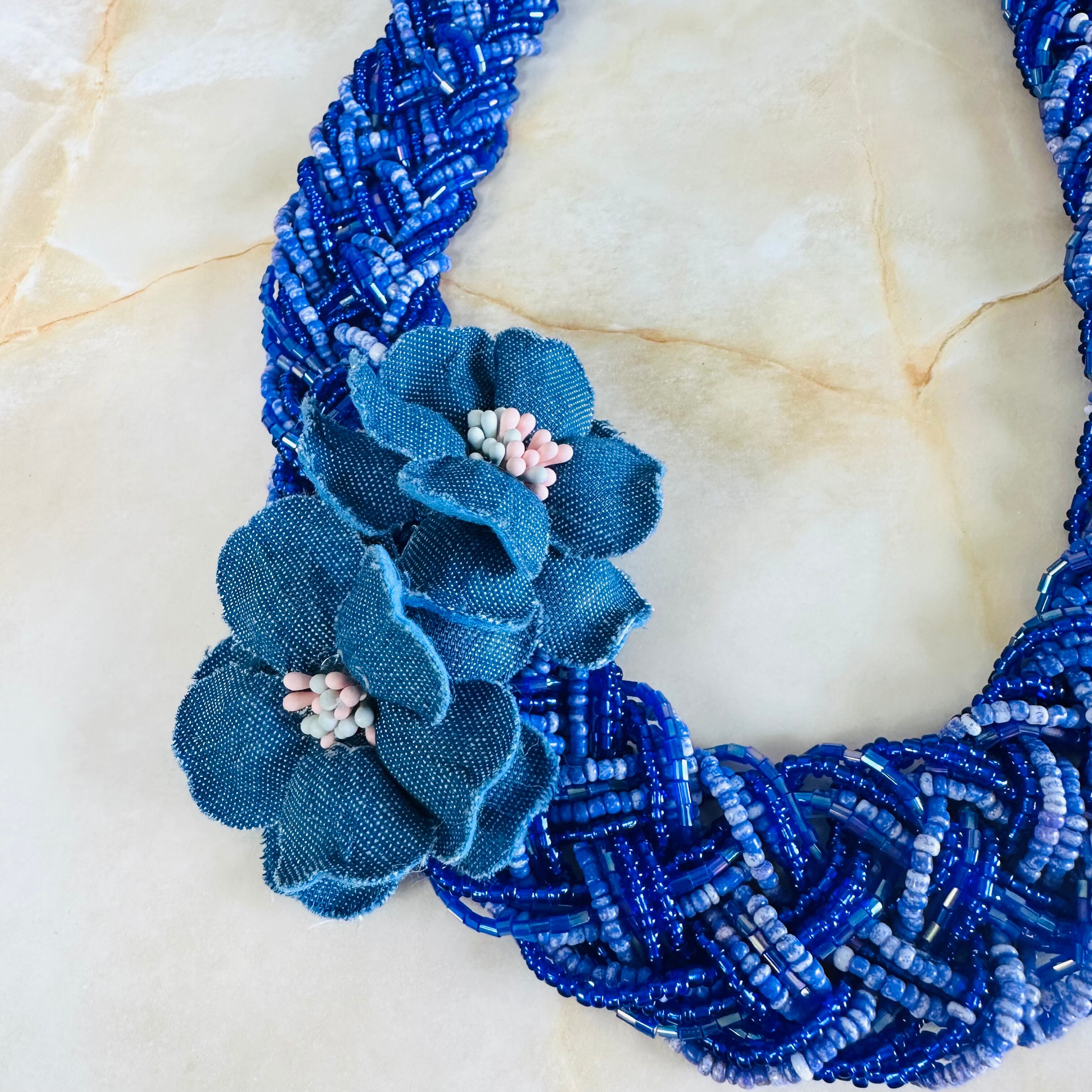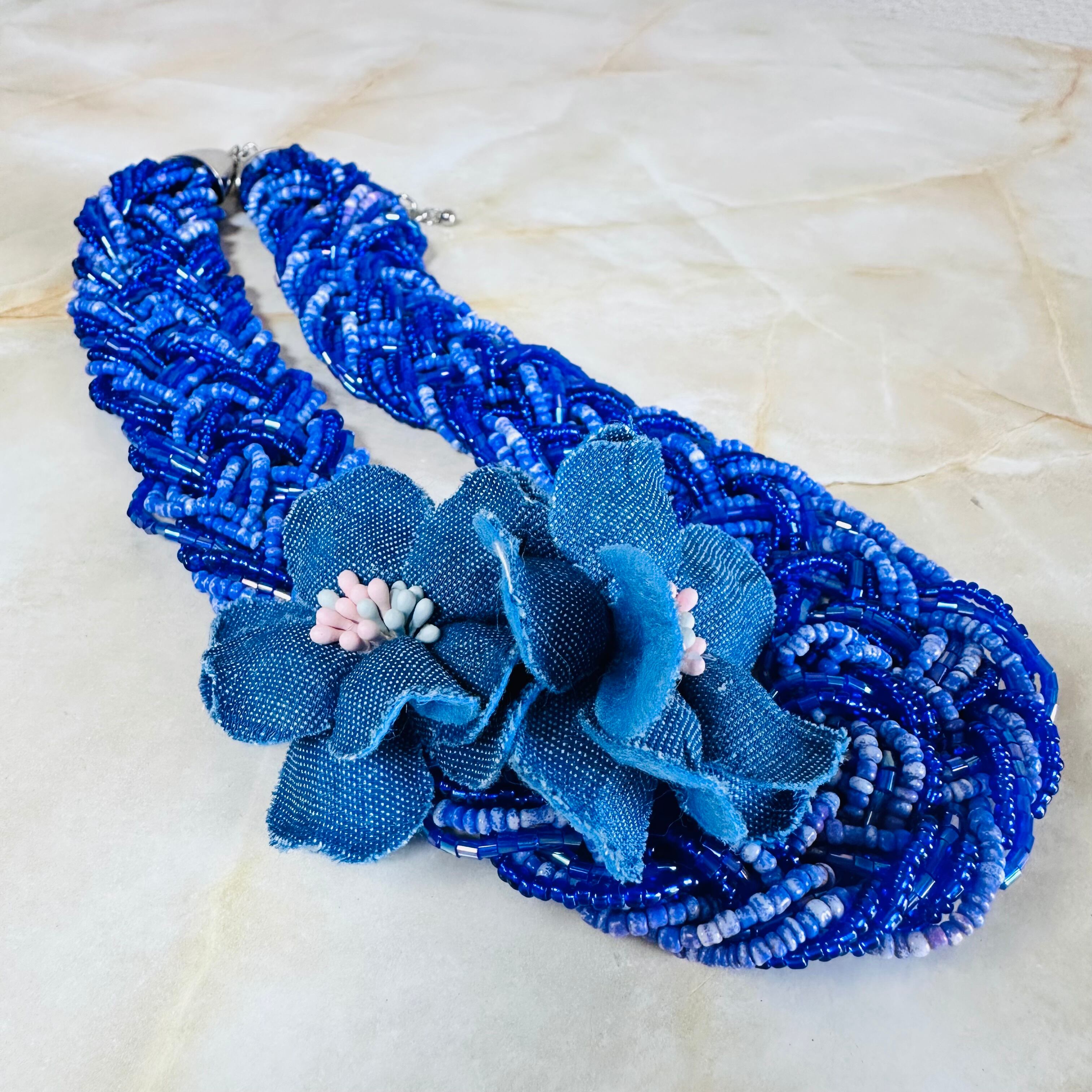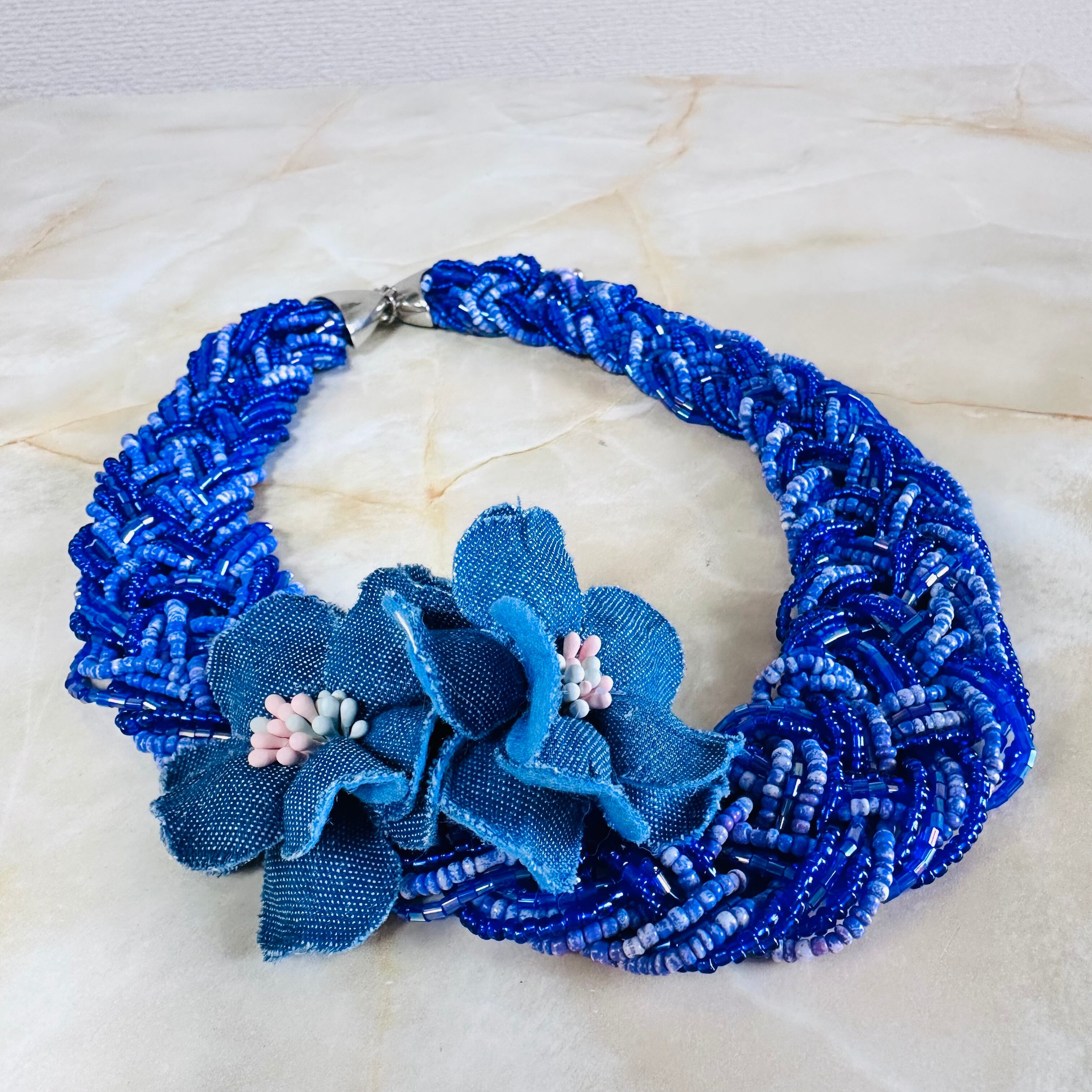 数種類の異なるビーズを編み上げ、デニムのフラワーモチーフを2つ取り付けたデザインです。