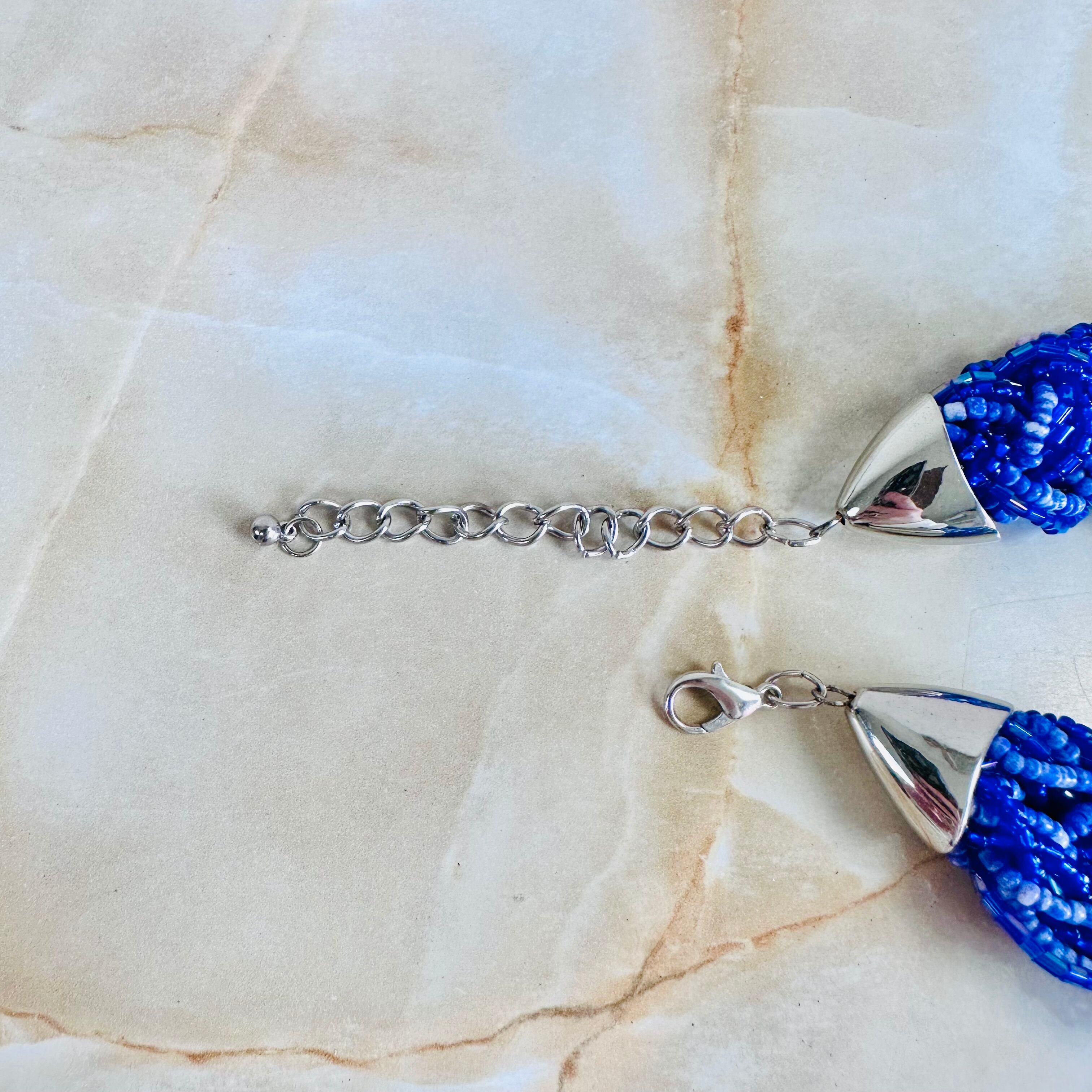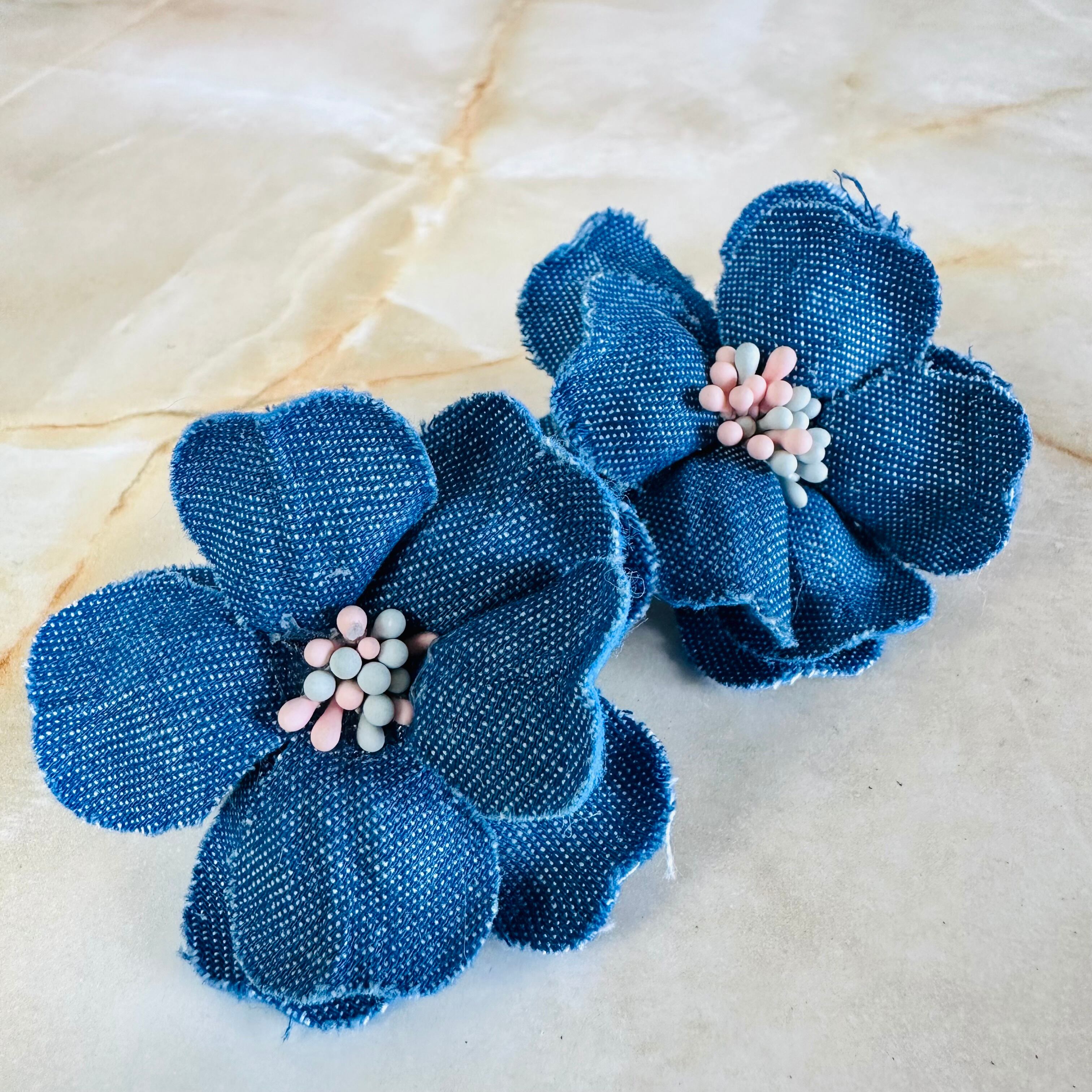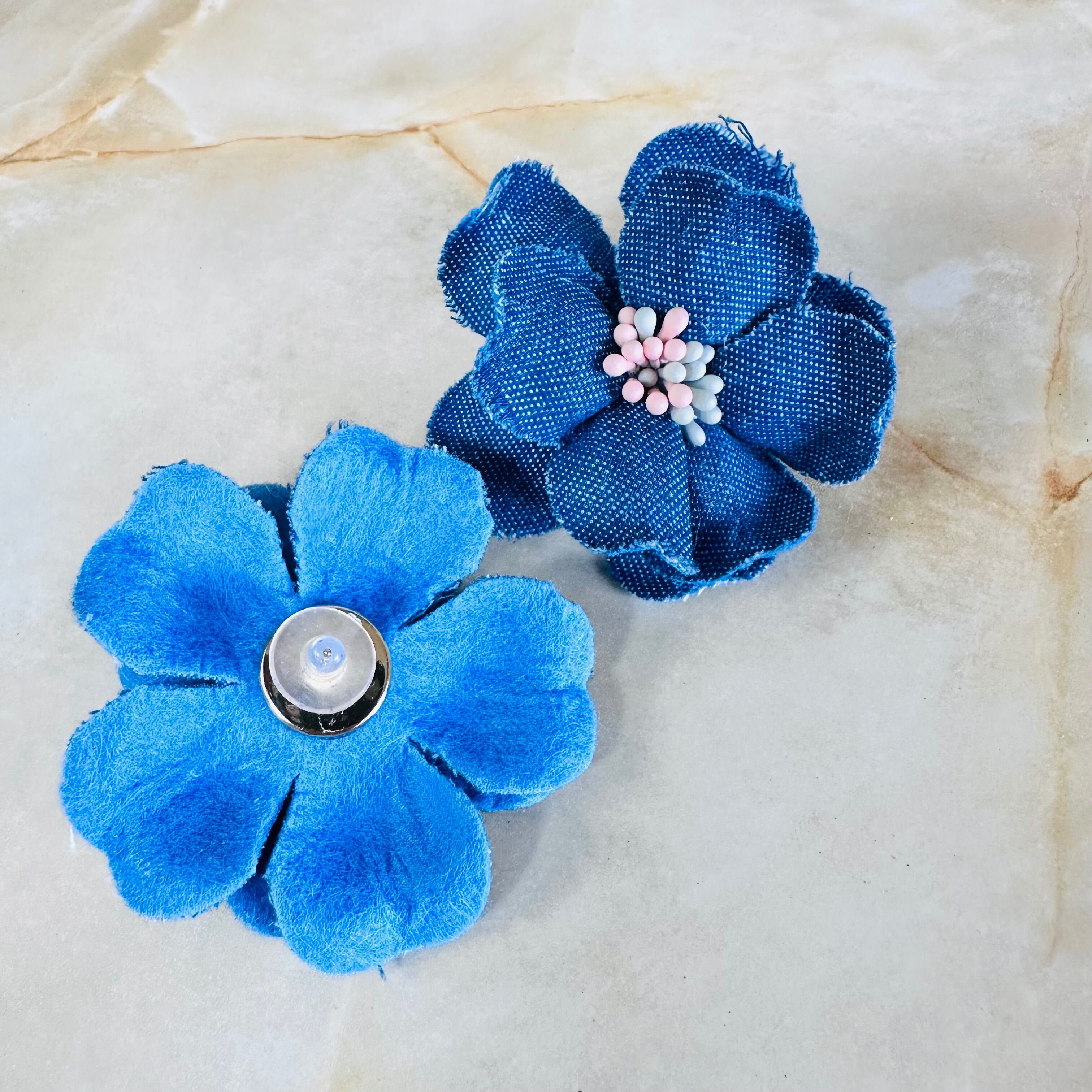 数種類の異なるビーズを編み上げ、デニムのフラワーモチーフを2つ取り付けたデザインです。