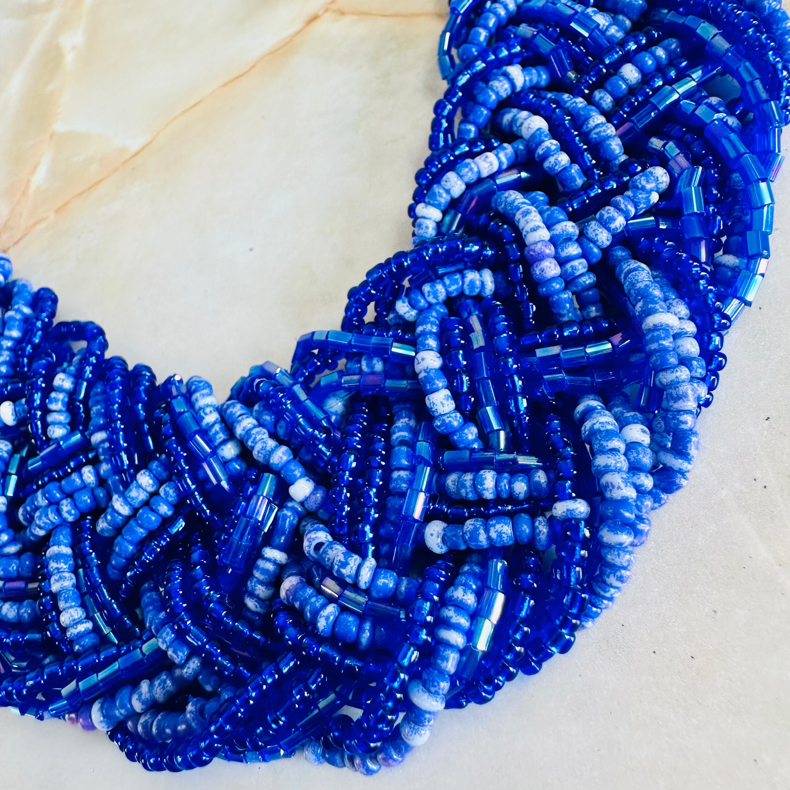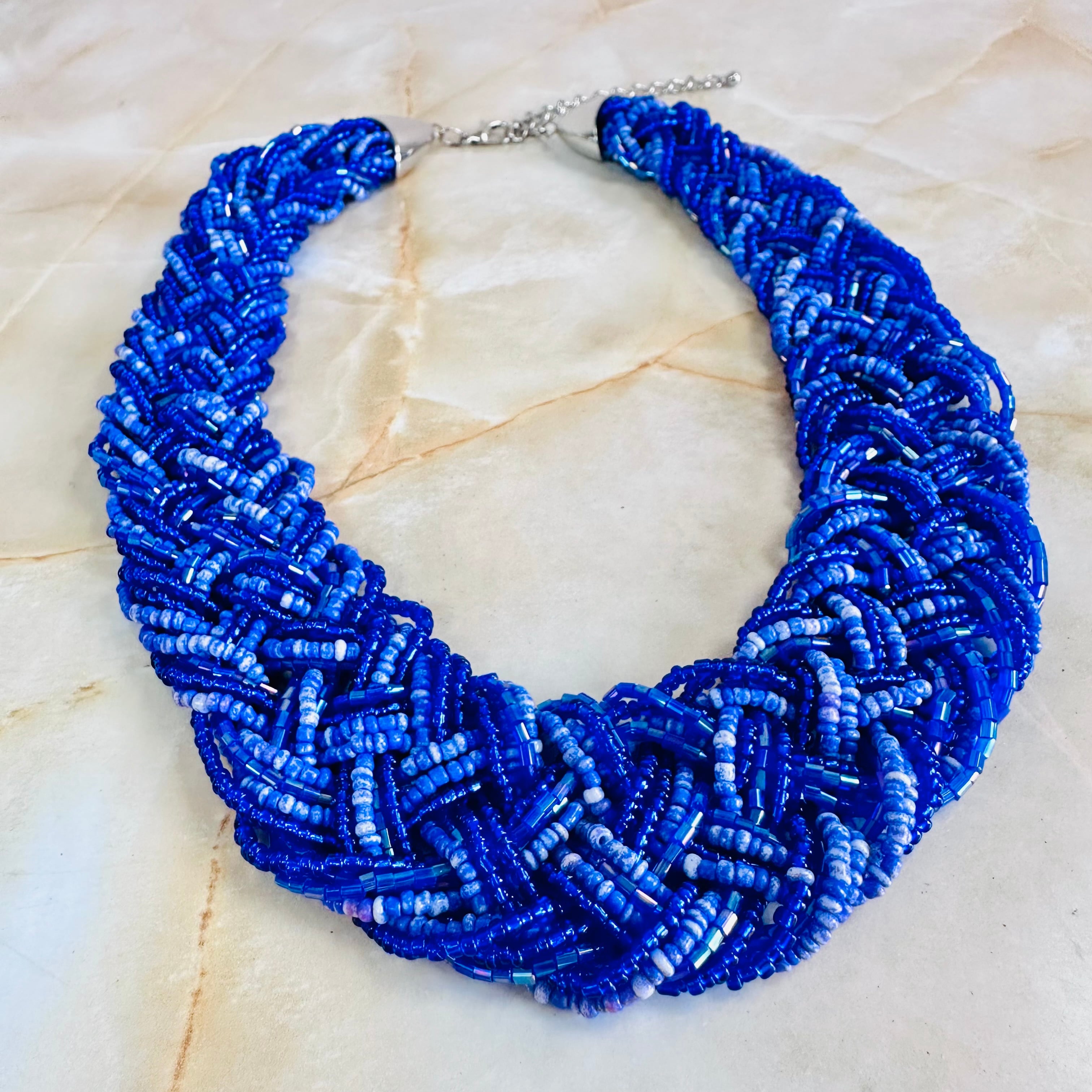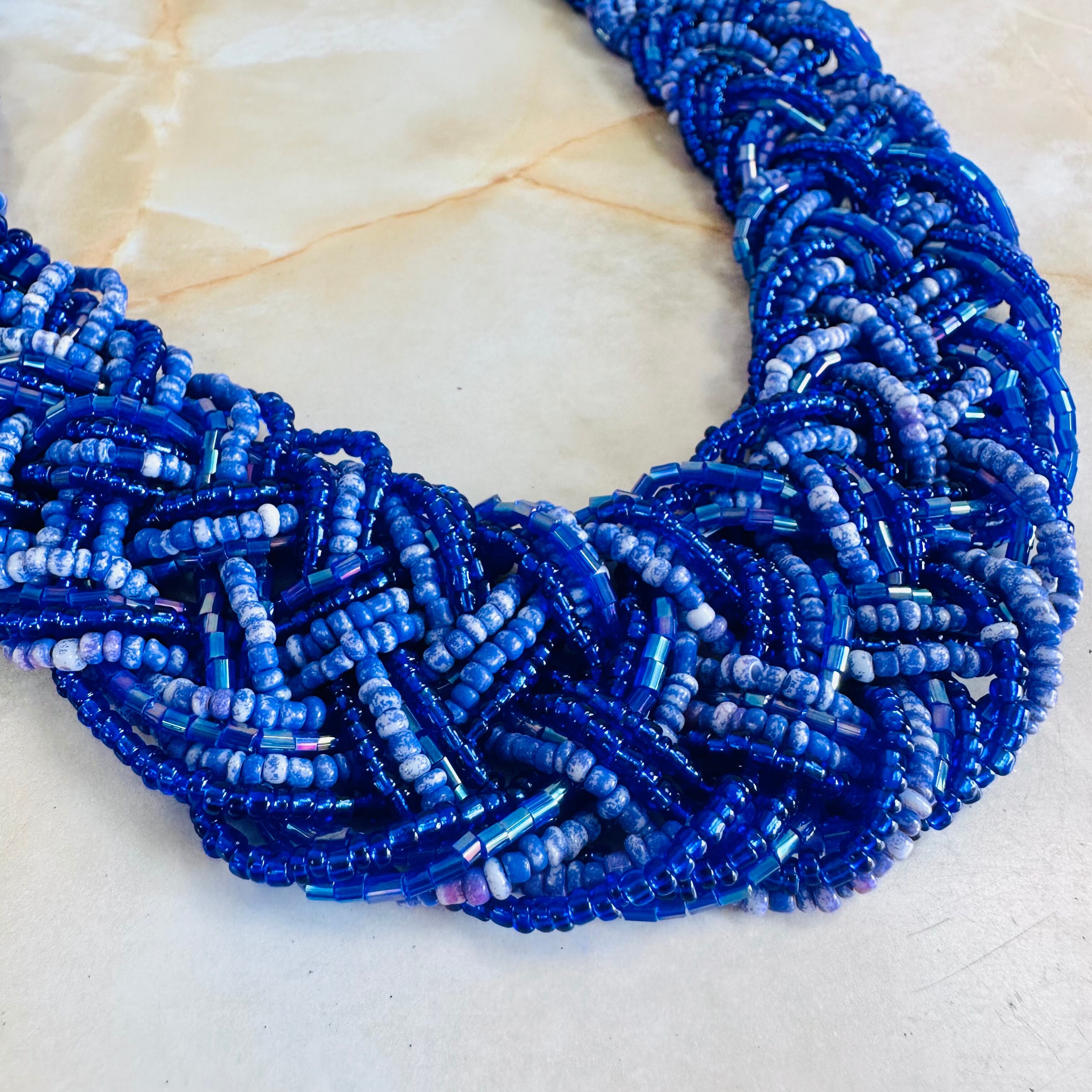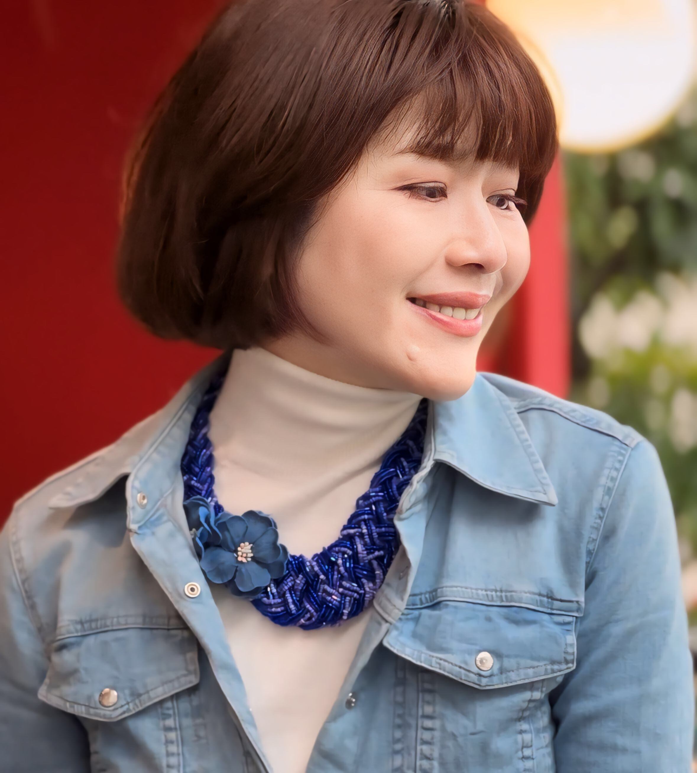 数種類の異なるビーズを編み上げ、デニムのフラワーモチーフを2つ取り付けたデザインです。