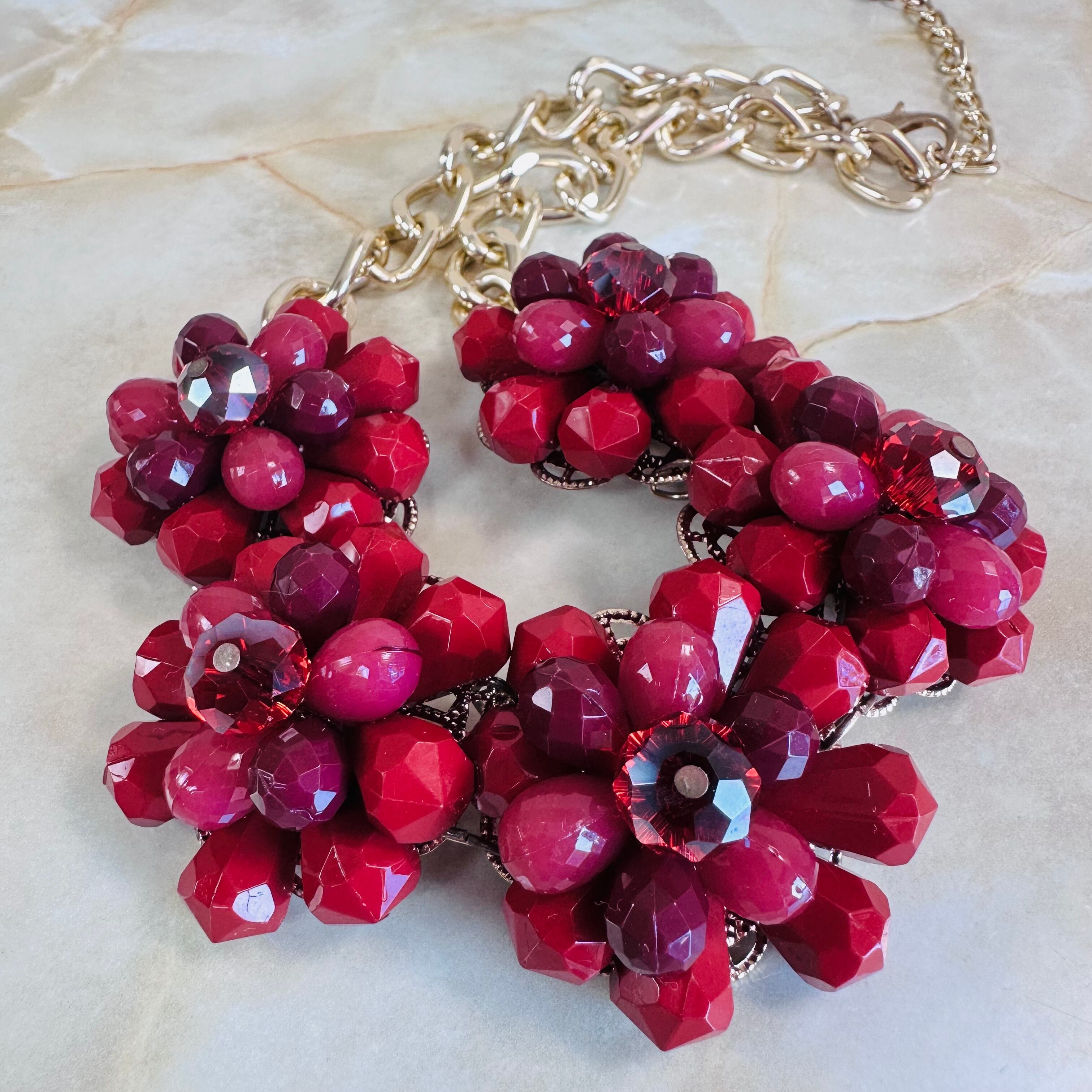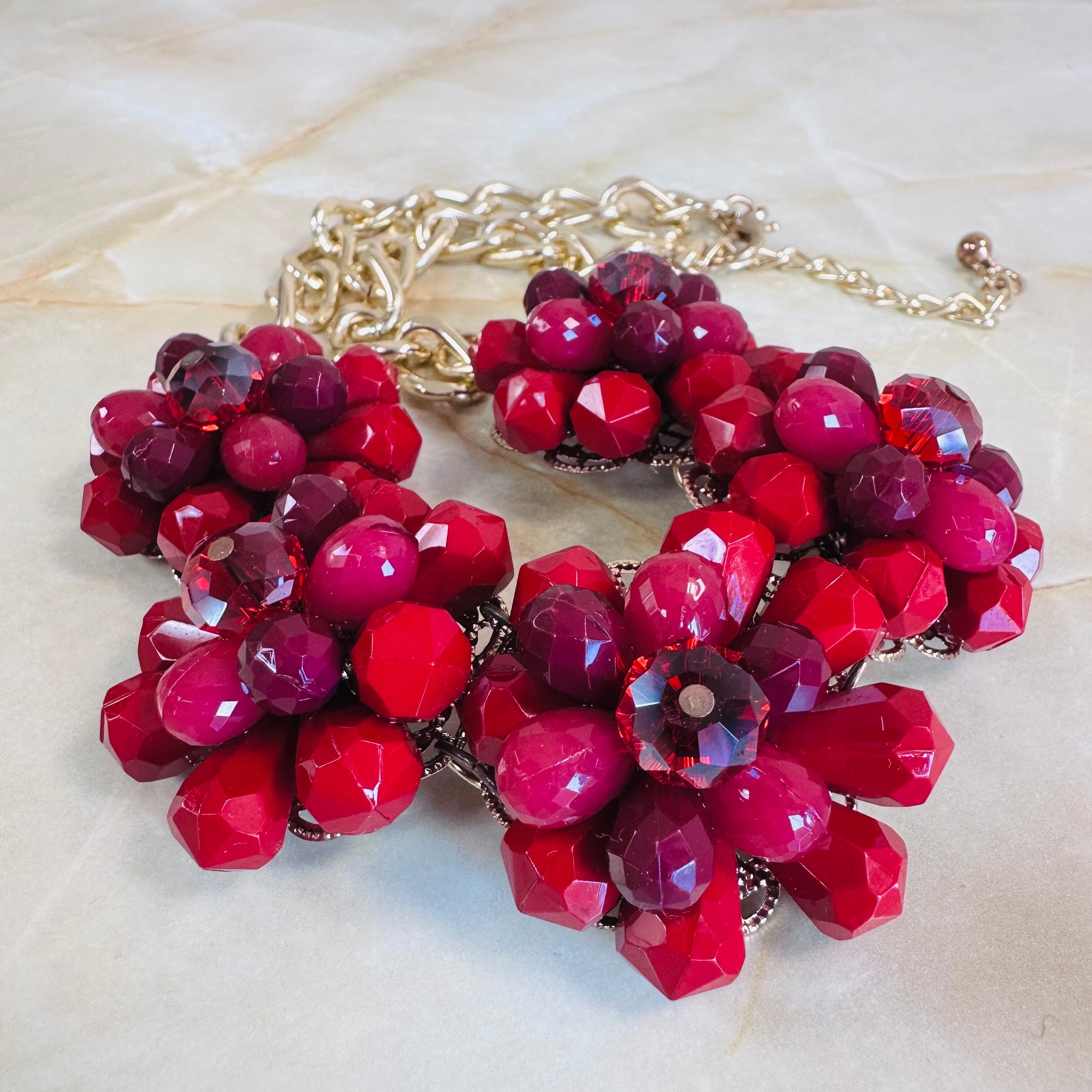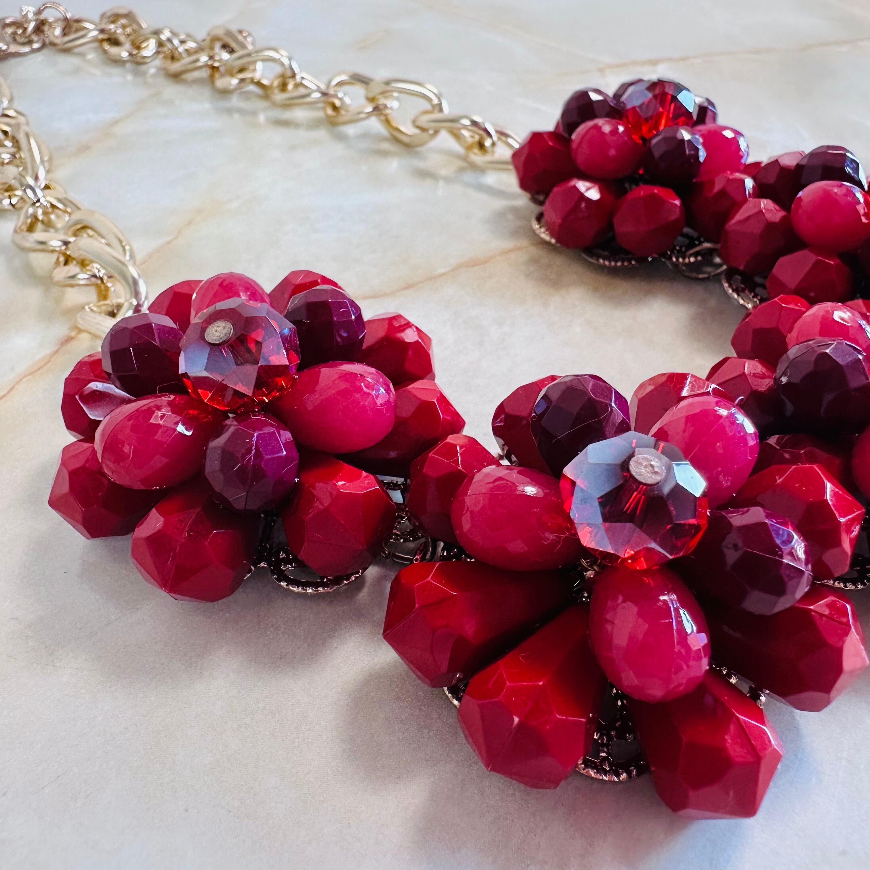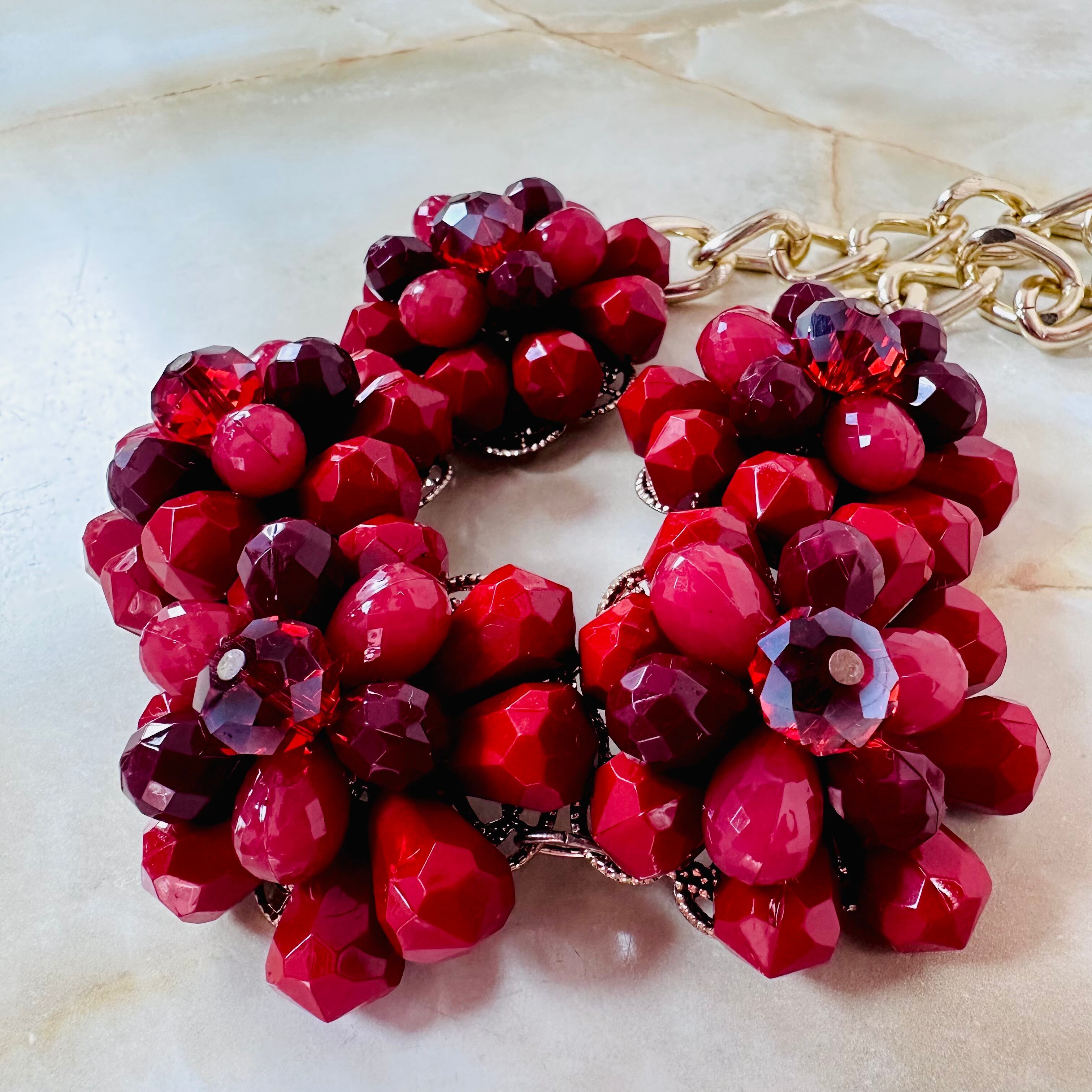 やや深いレッド、プラムカラーの濃淡、クリアレッドなど様々なレッドパーツを使用したフラワーモチーフが特徴です。