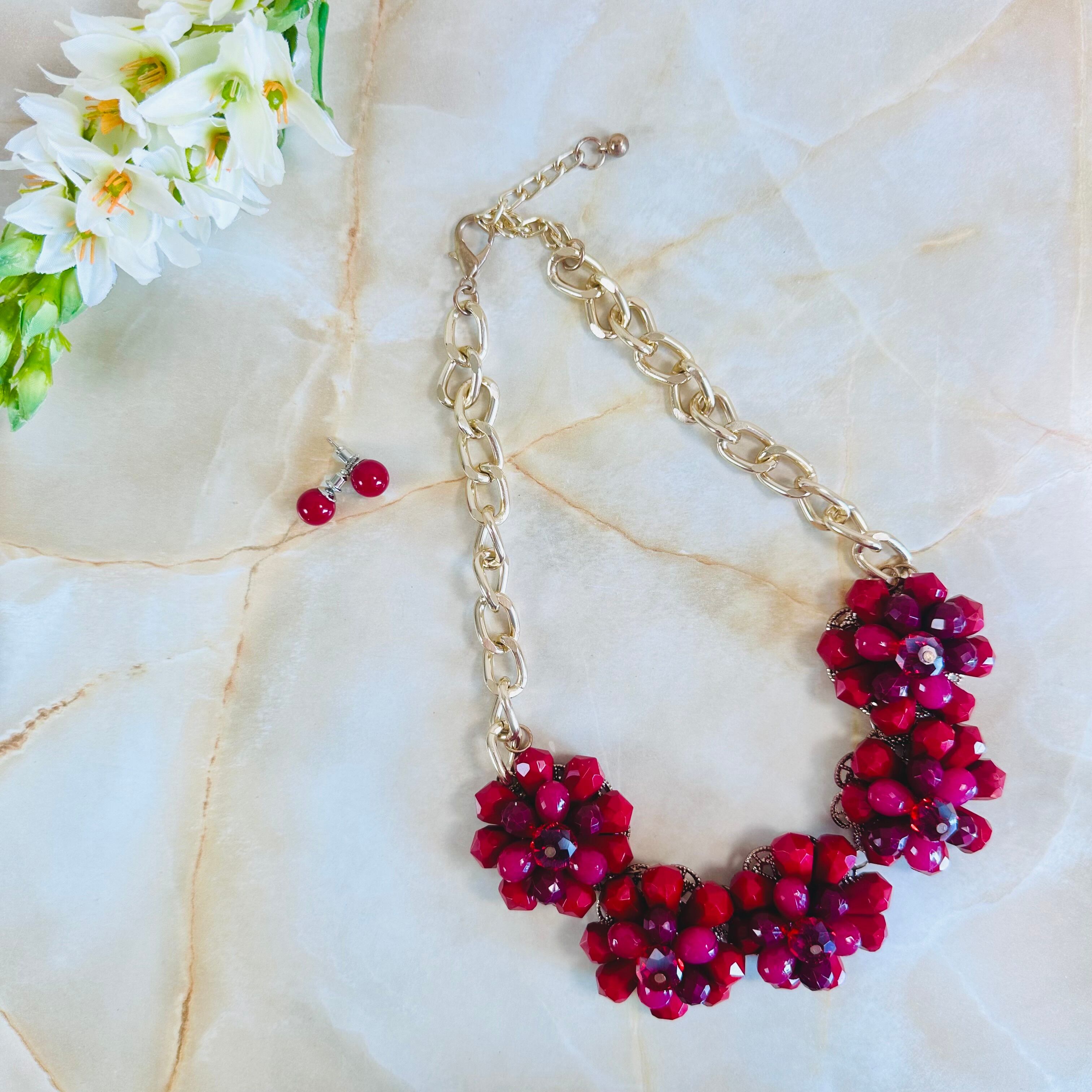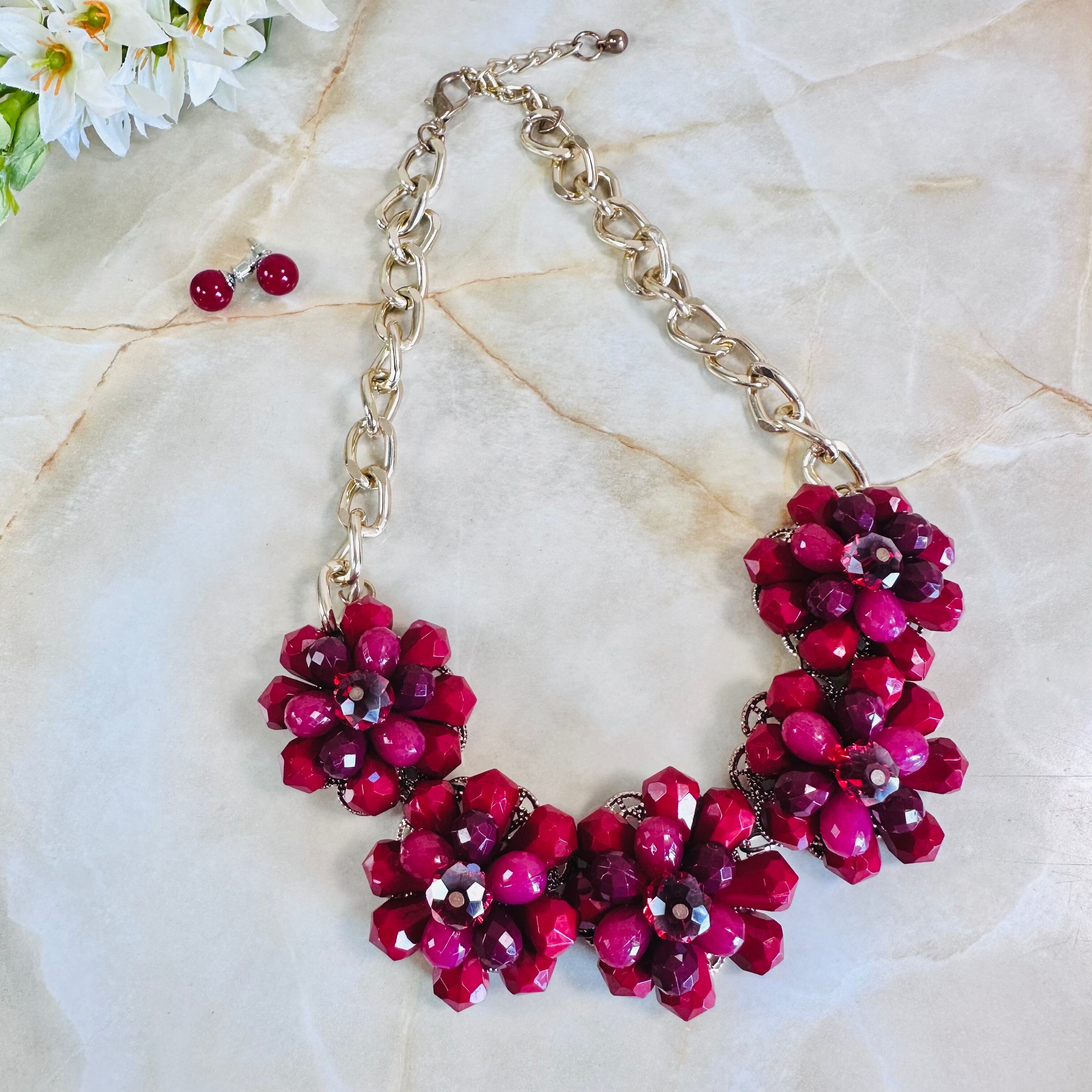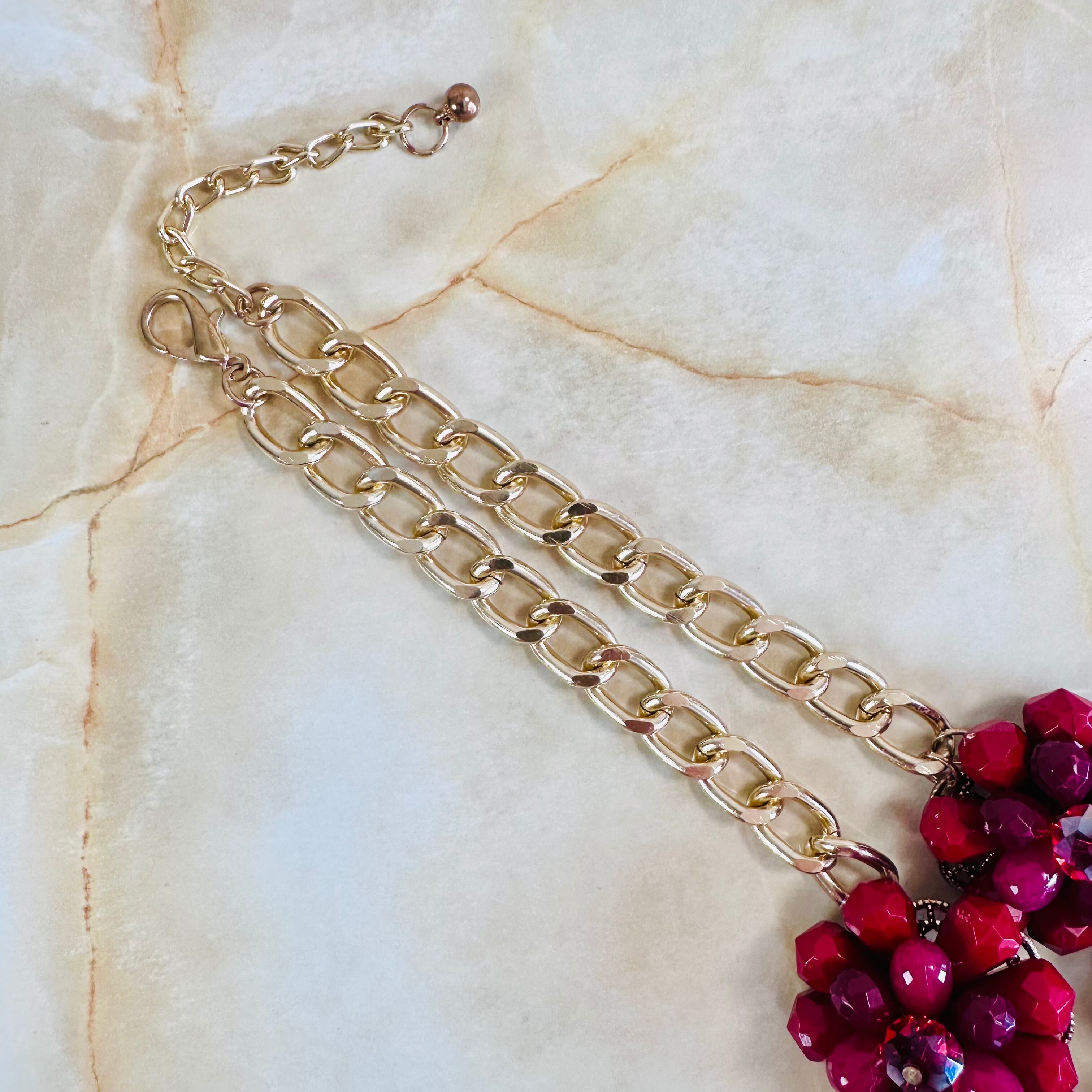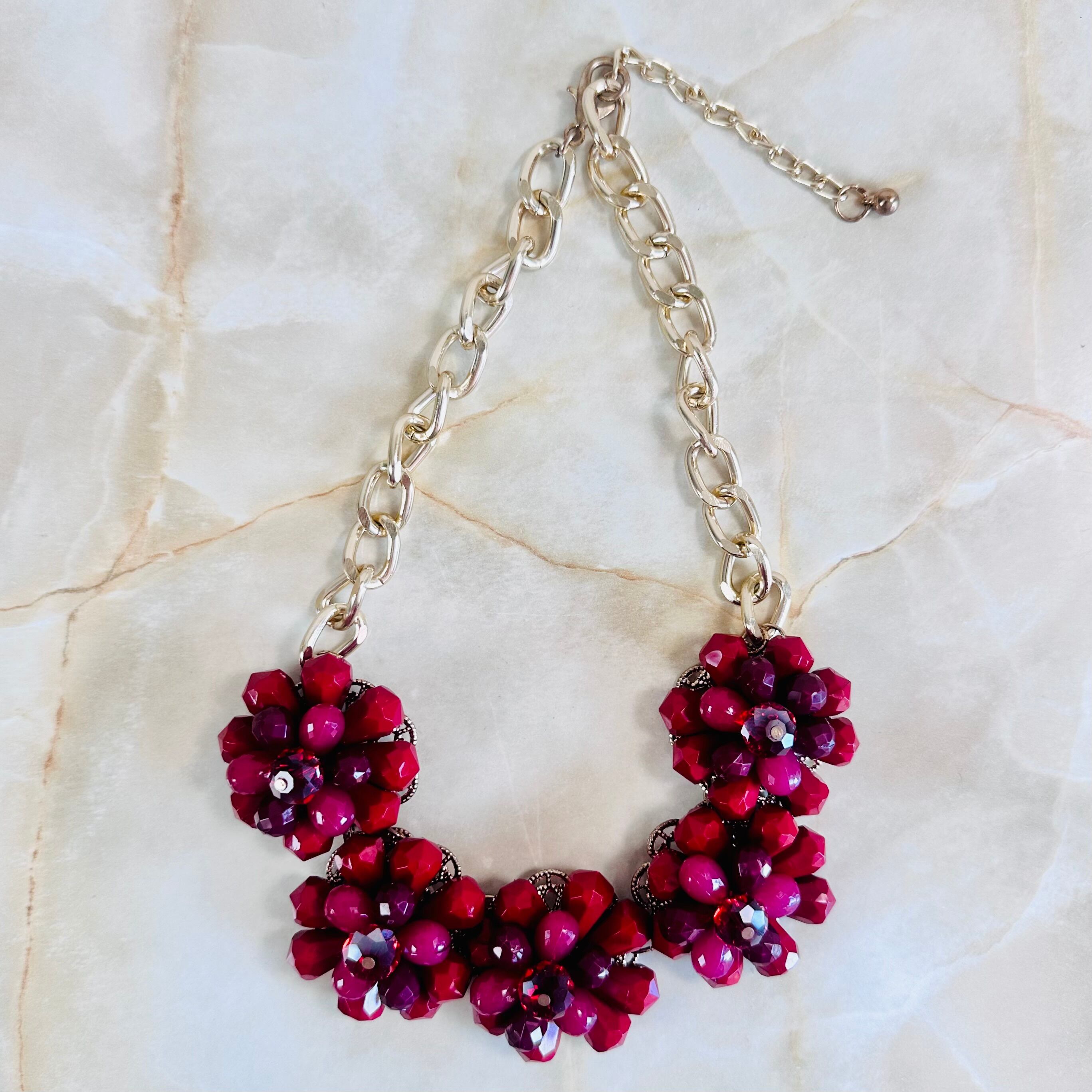やや深いレッド、プラムカラーの濃淡、クリアレッドなど様々なレッドパーツを使用したフラワーモチーフが特徴です。