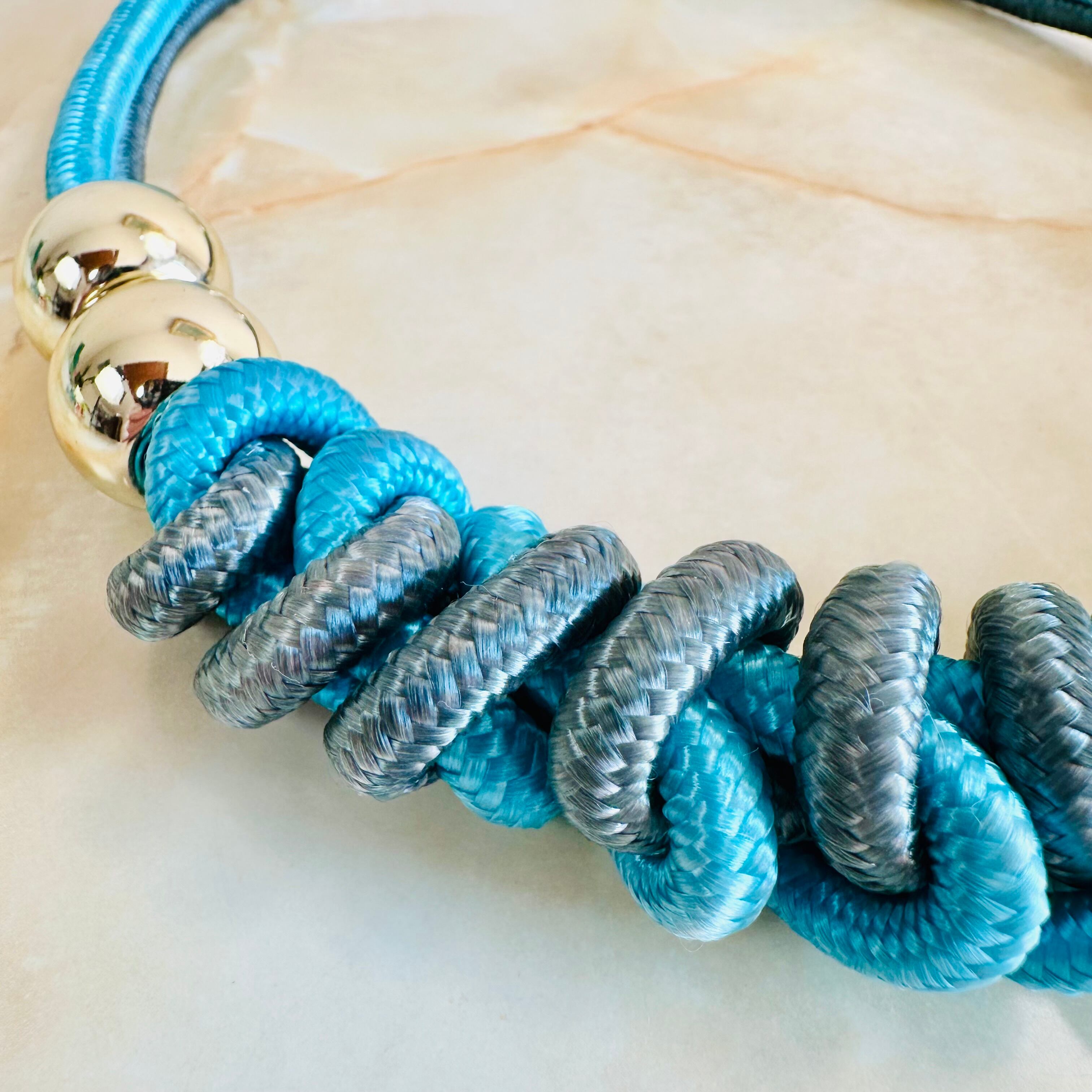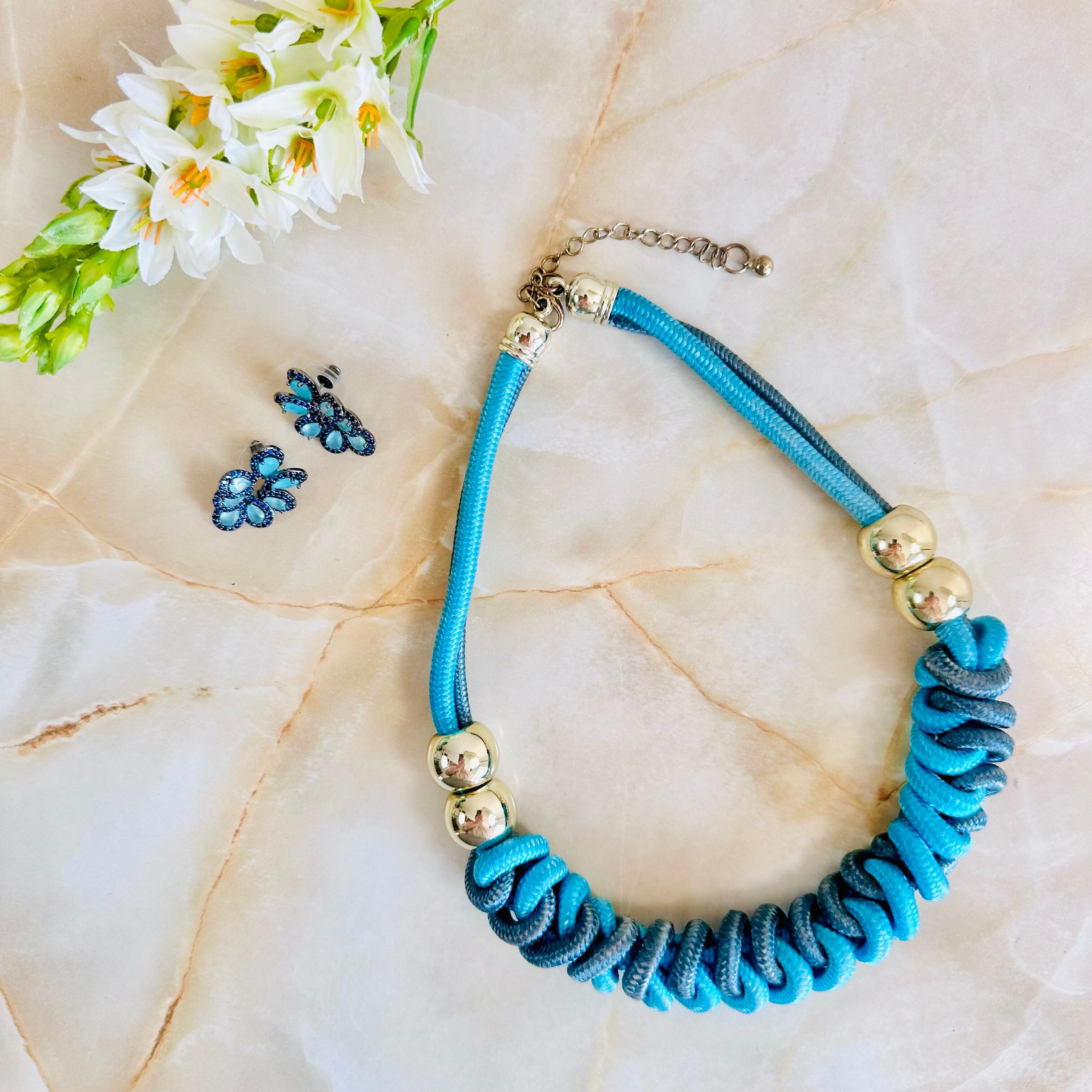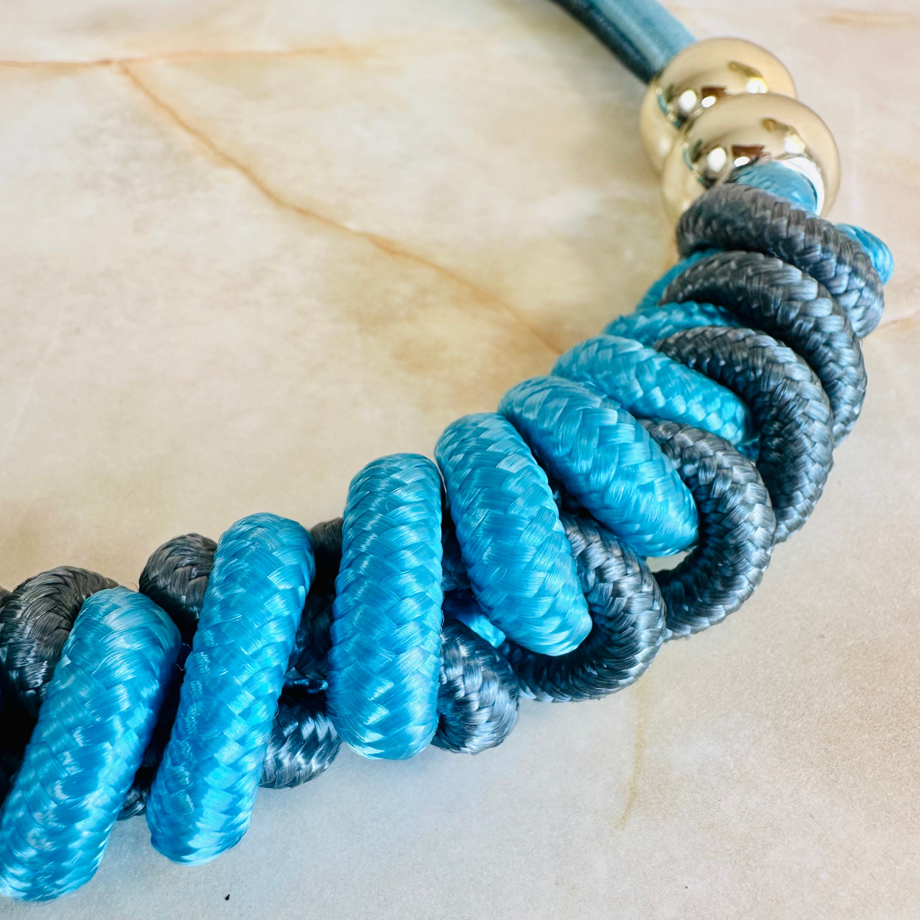 トーンの異なる2色のブルーコードを編み上げたデザインです。
