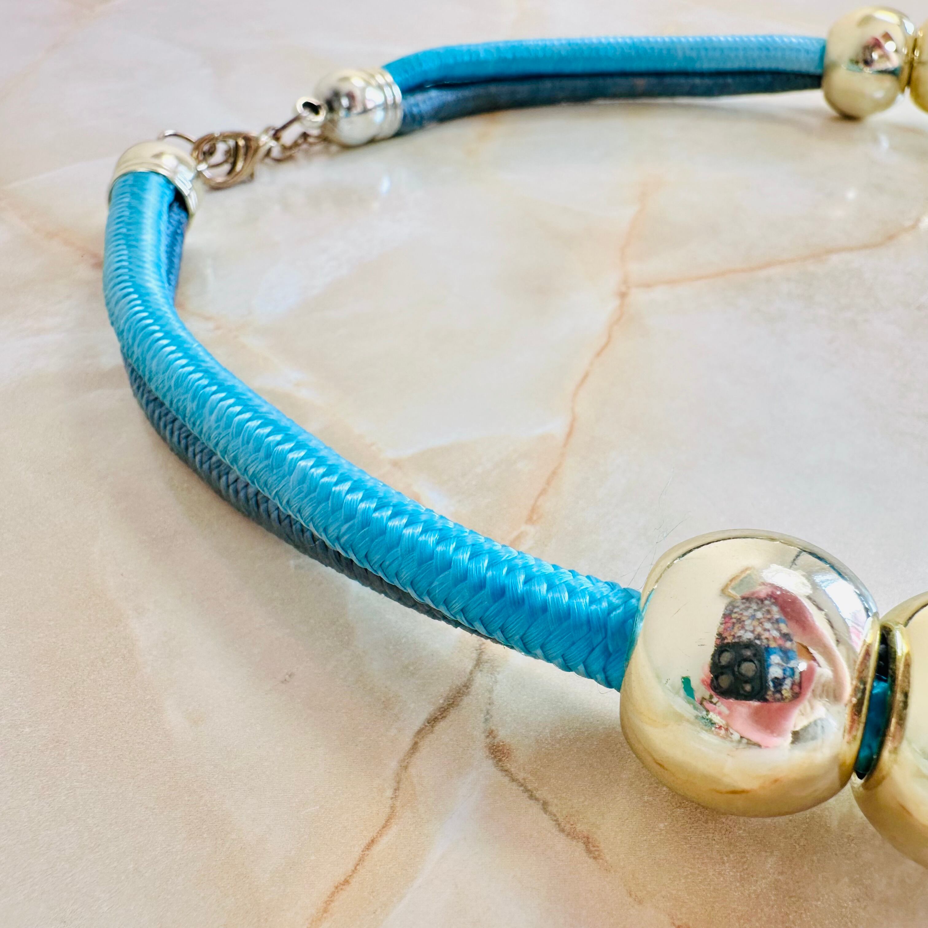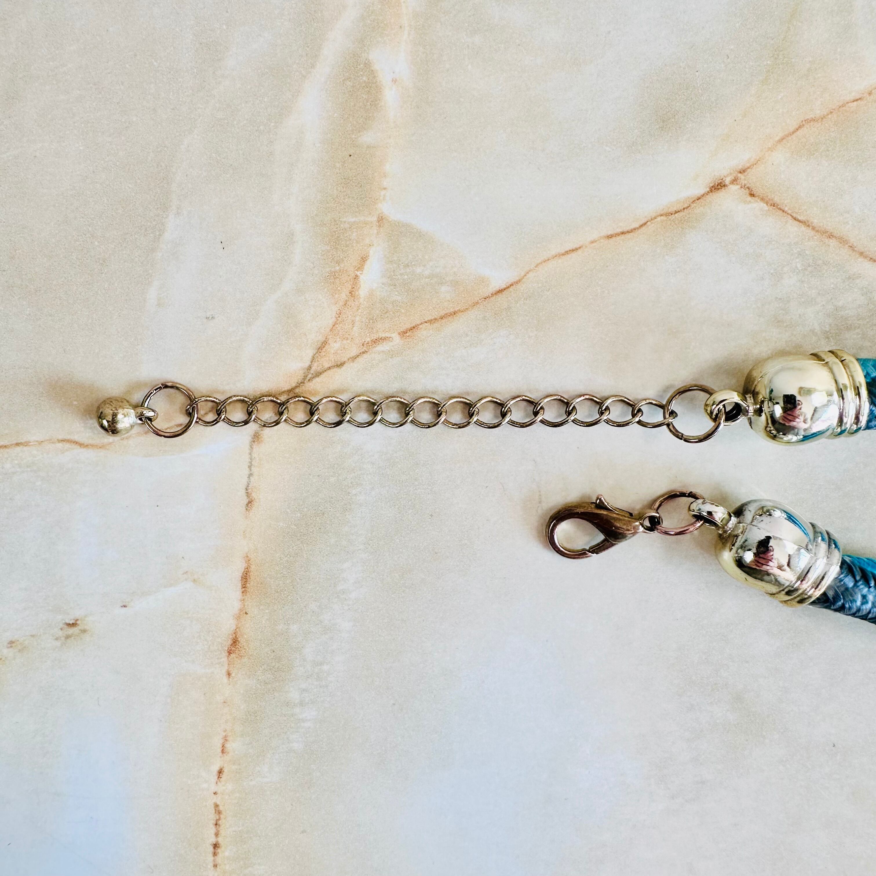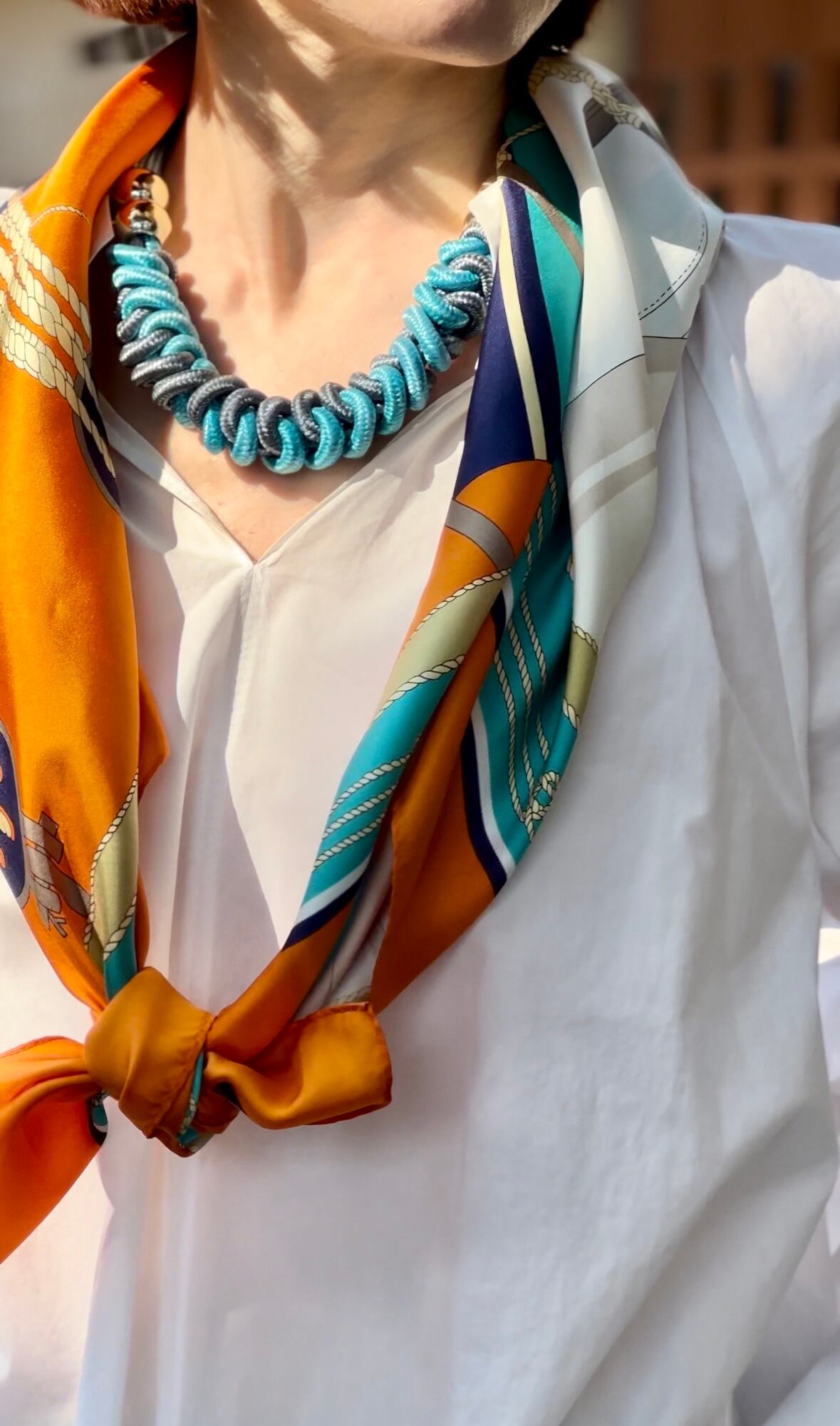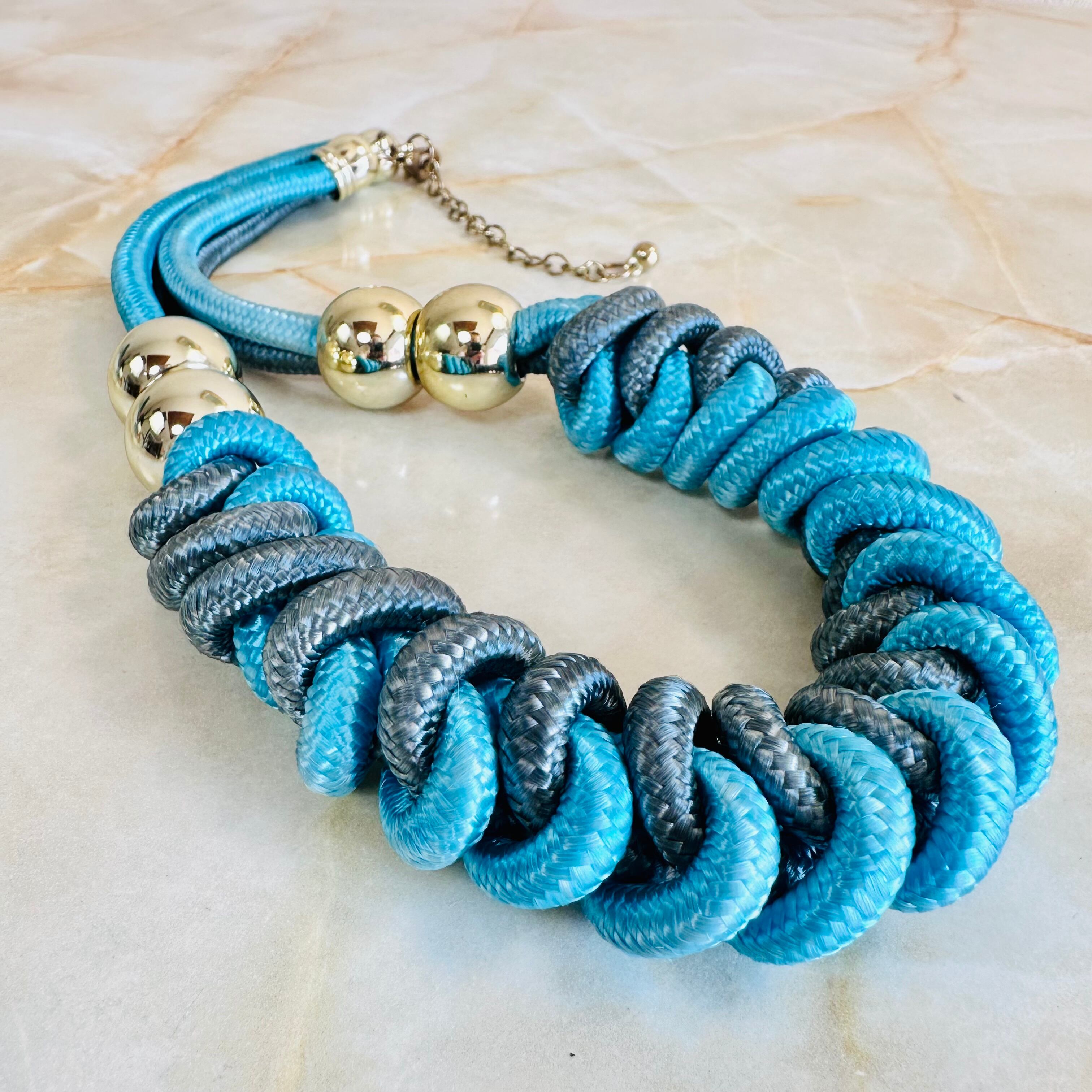 トーンの異なる2色のブルーコードを編み上げたデザインです。