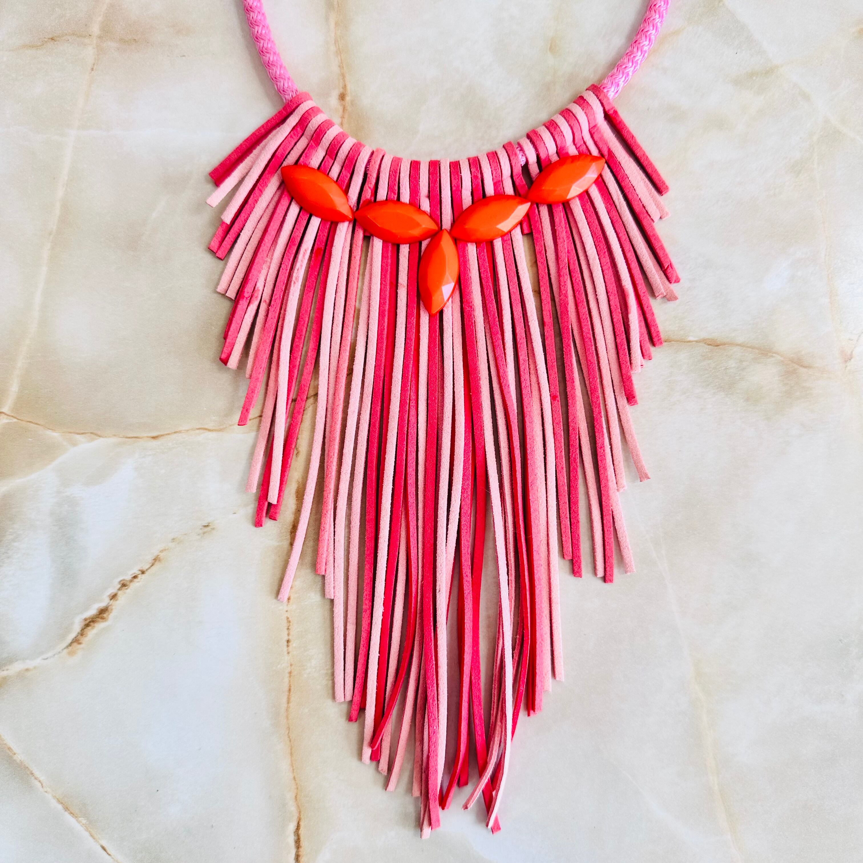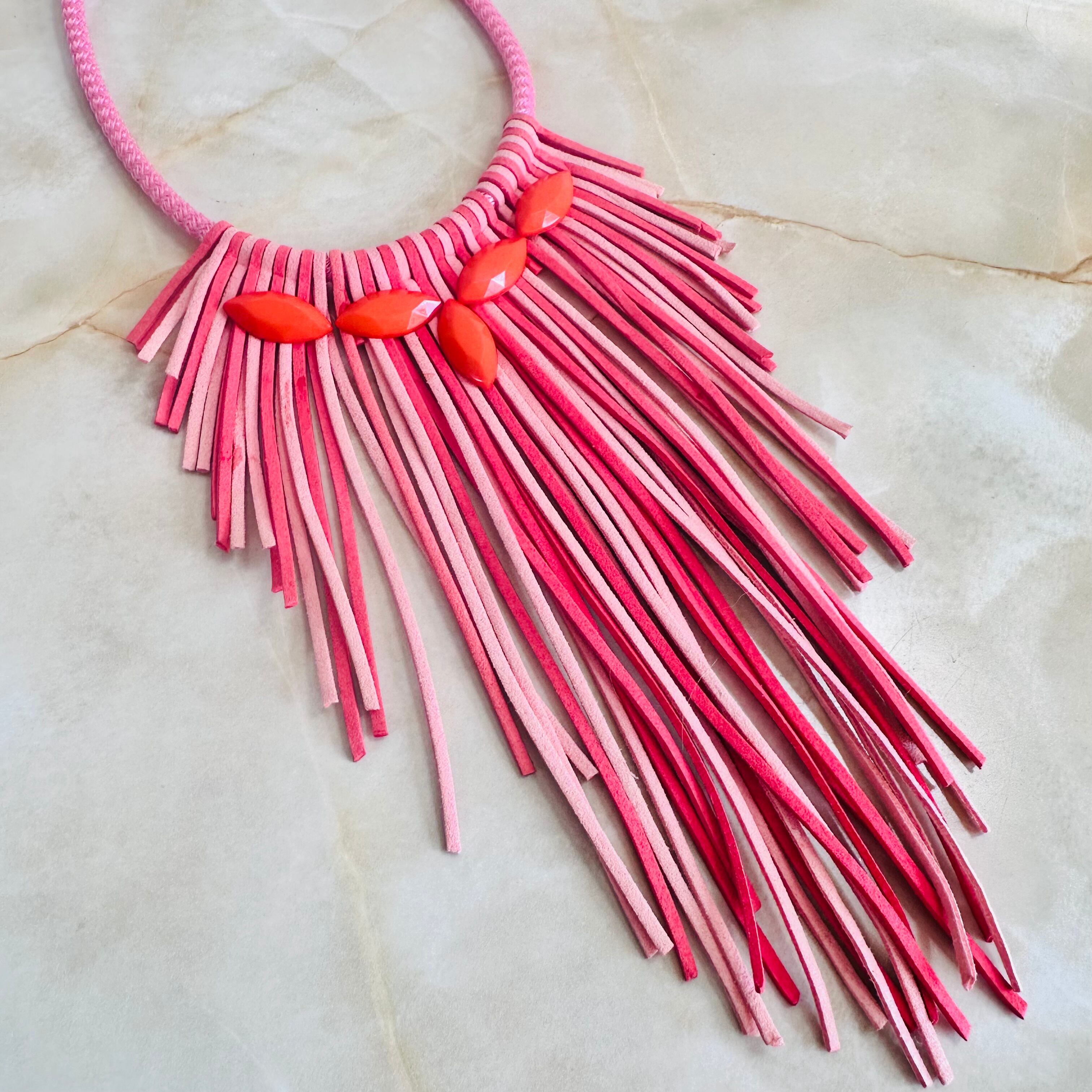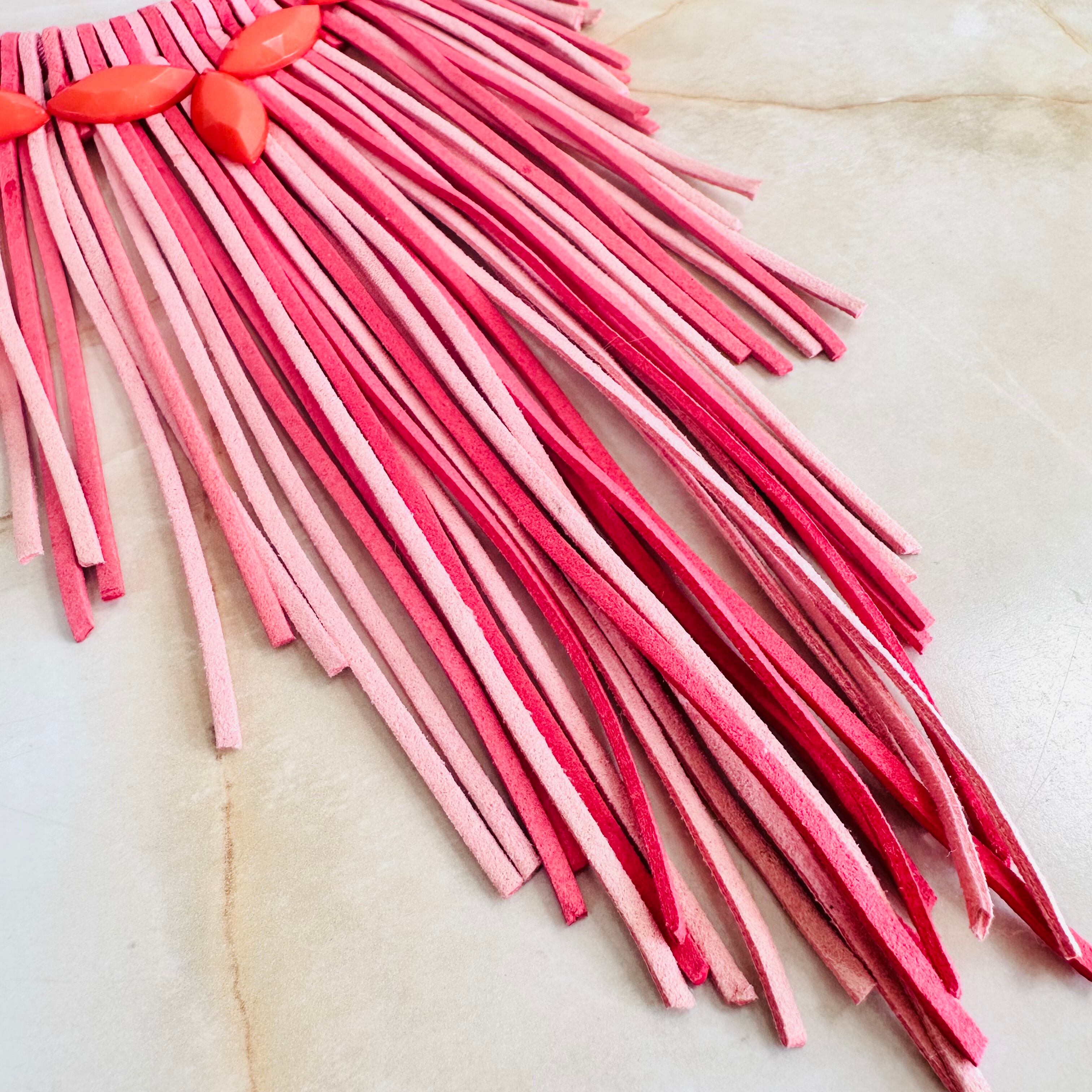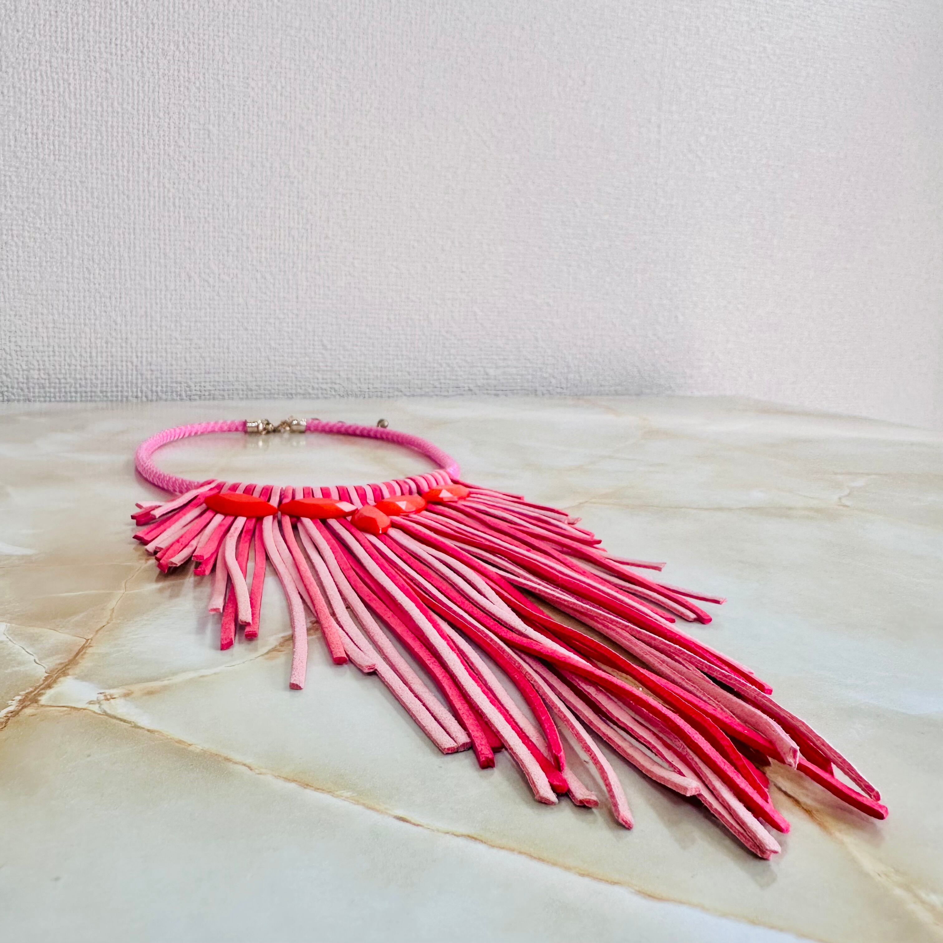 鮮やかなカラーの革紐をフリンジ状にカットし、オレンジのパーツをプラスし、元気溢れるポップなテイストに仕上げました。